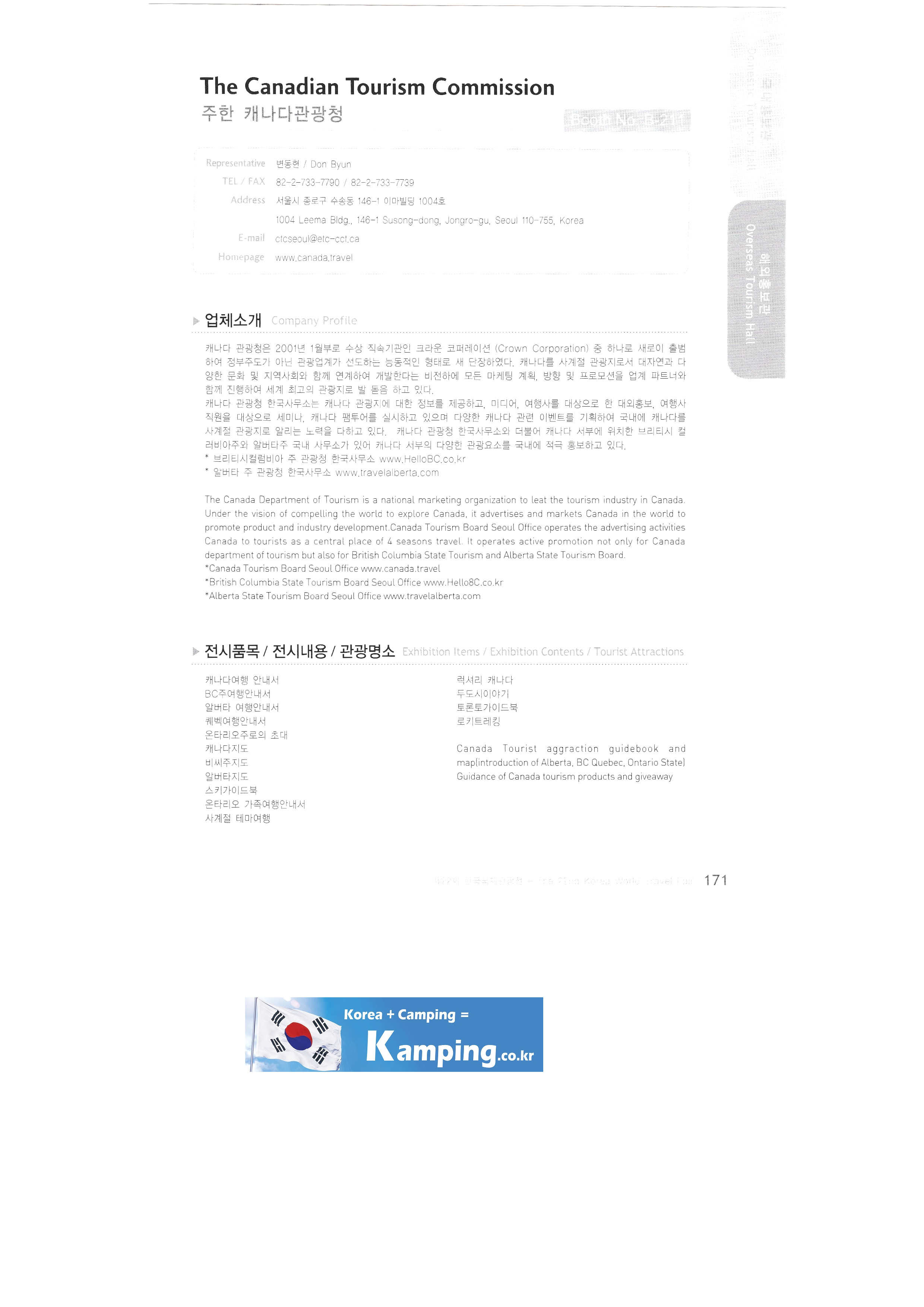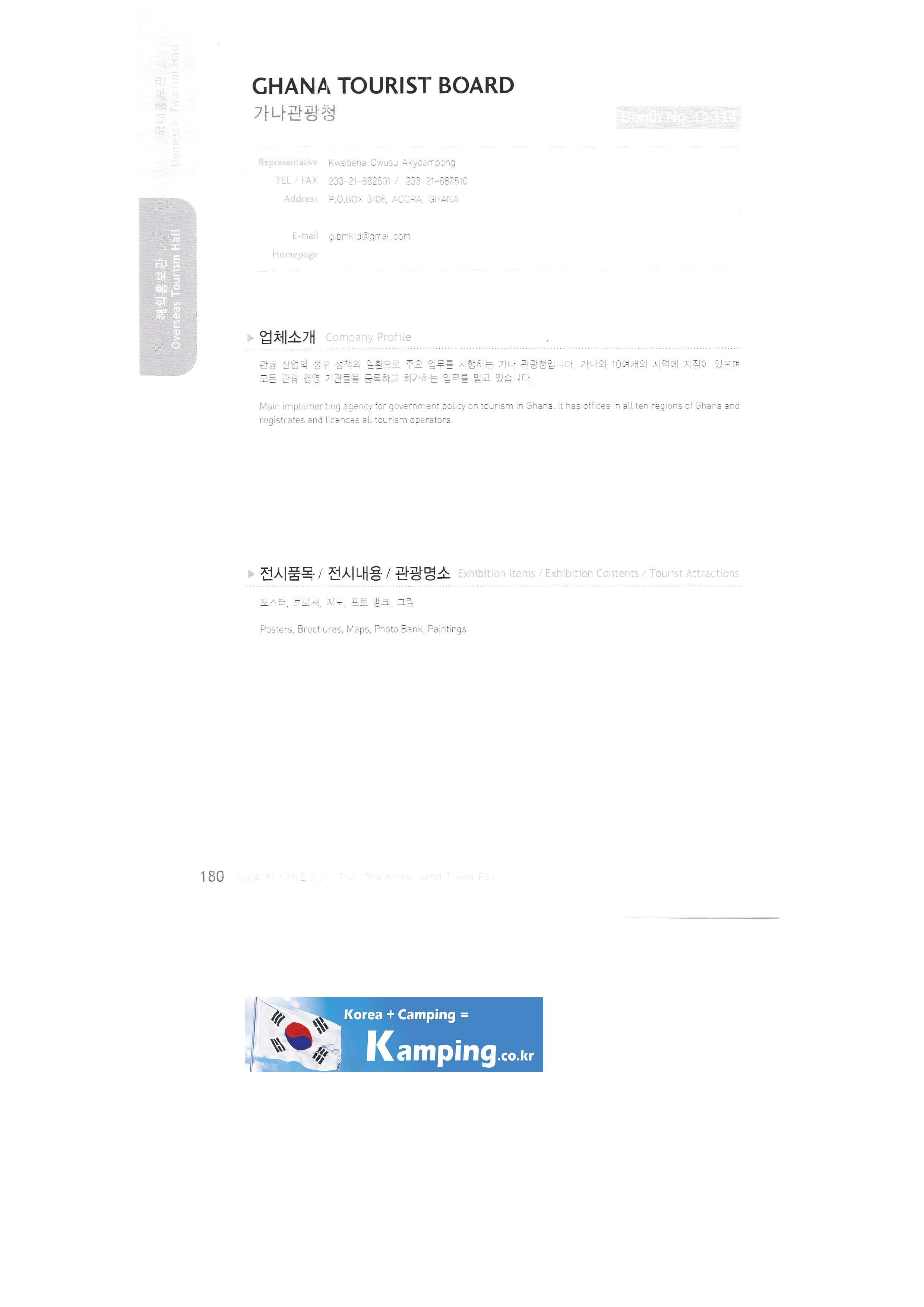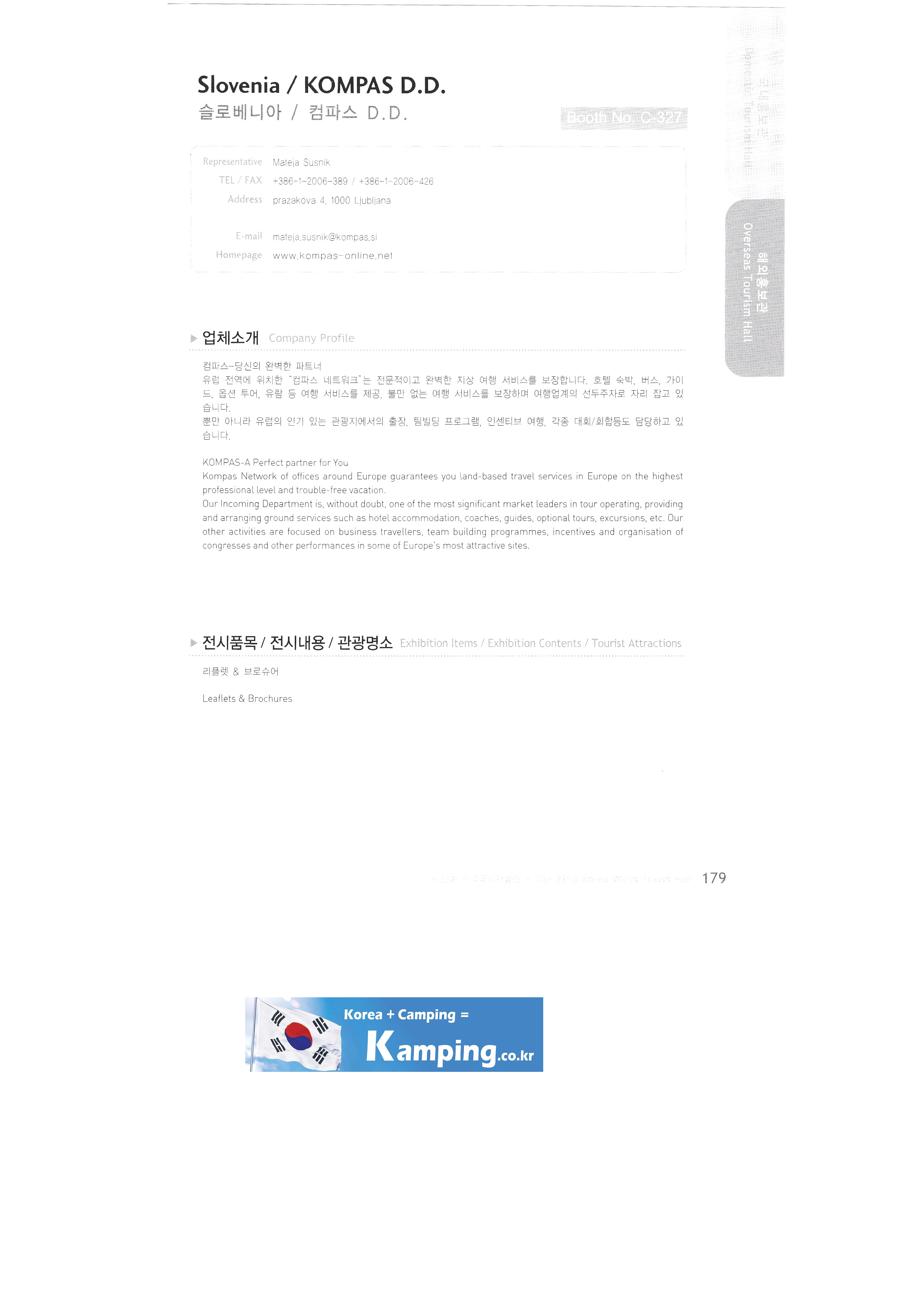 | 슬로베니아 관광청 남아공대사관 타이완관광진흥청 탄자니아 국립공원 주한 캐나다 관광청 태국정부관광청 서울사무소 미국/애플 코어 호텔스 미국/SMC Tour 베트남항공 베트남관광청 짐바브웨관광청 한일문화교류연합회 슬로베니아 /컴파스 D.D. 가나관광청 |