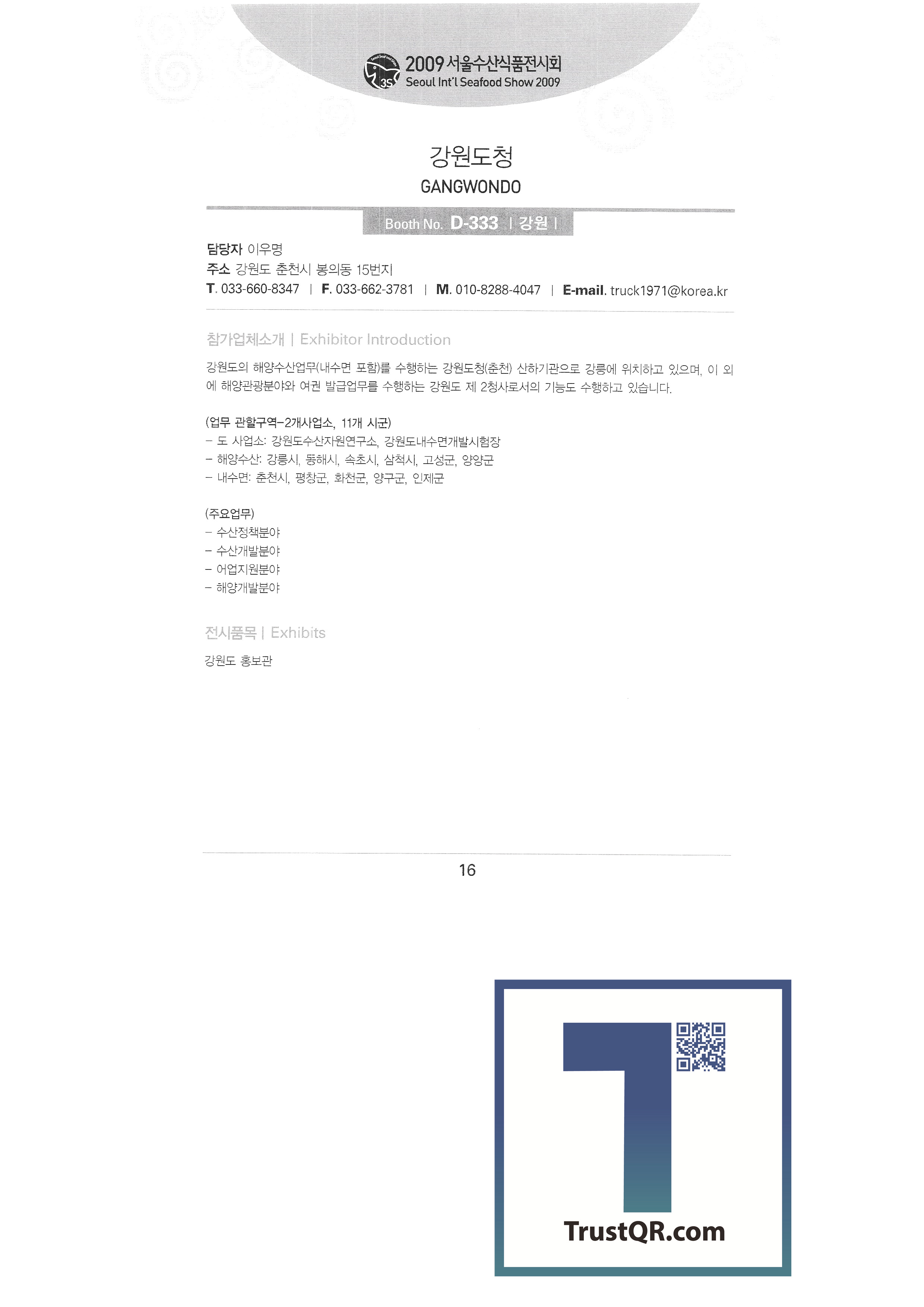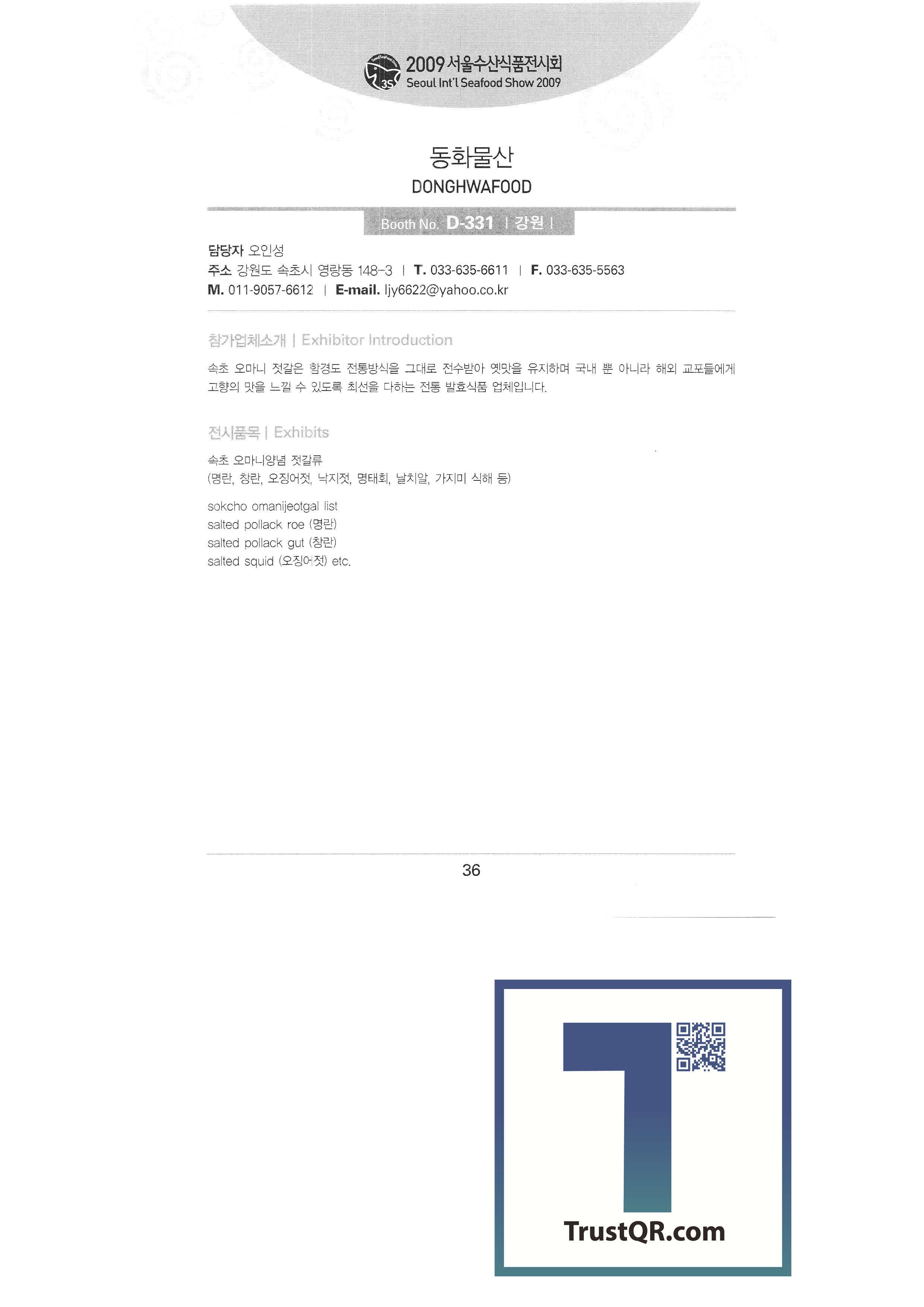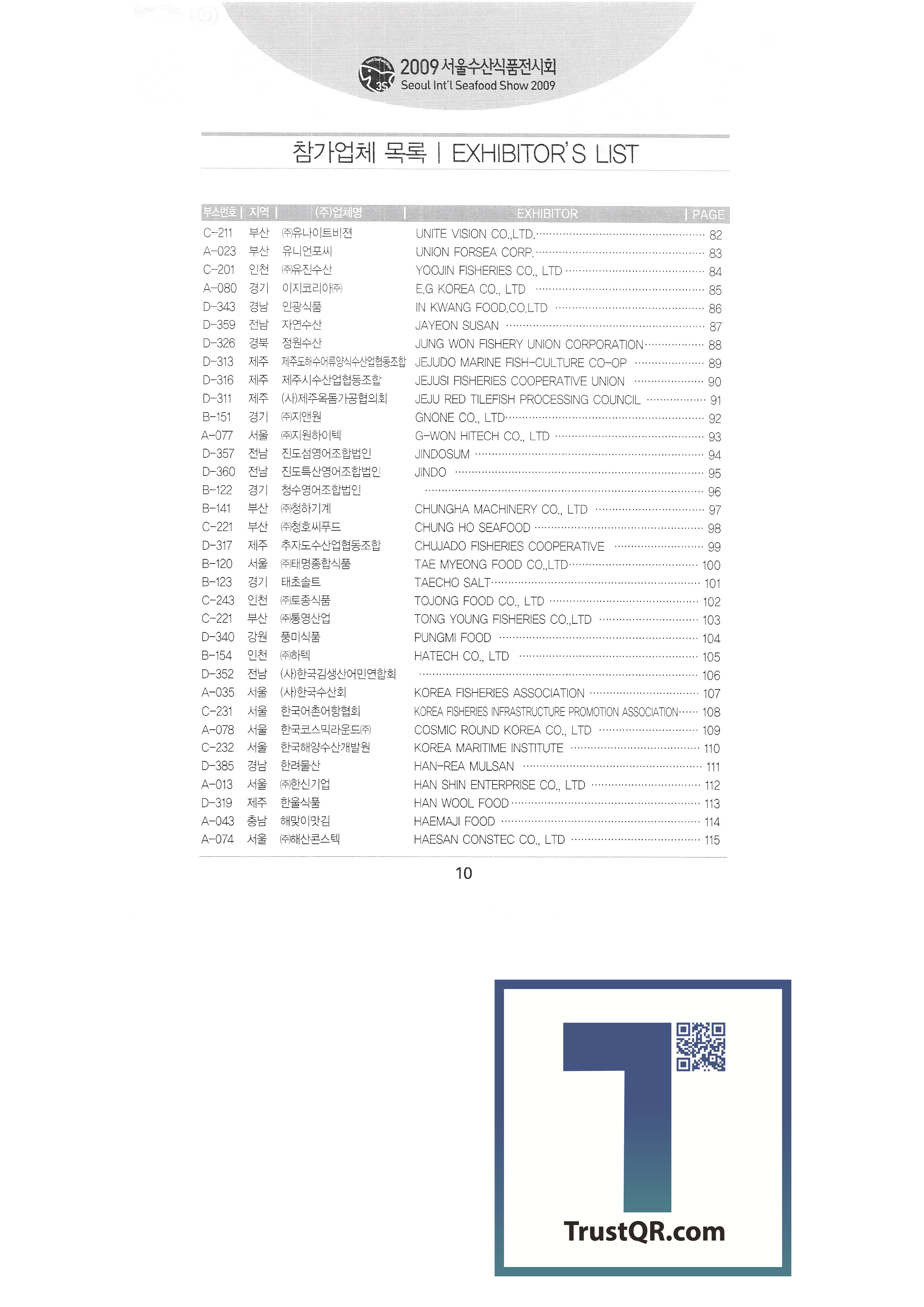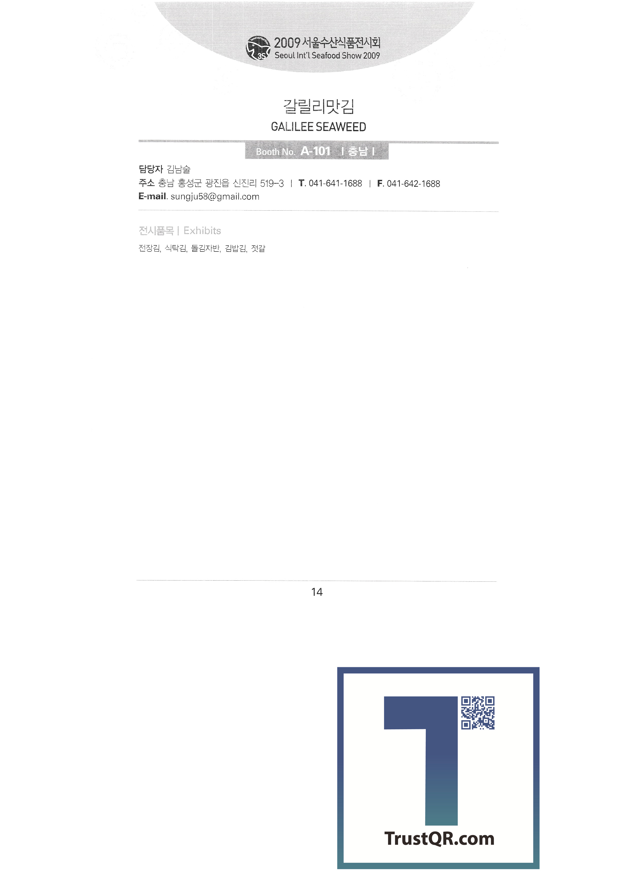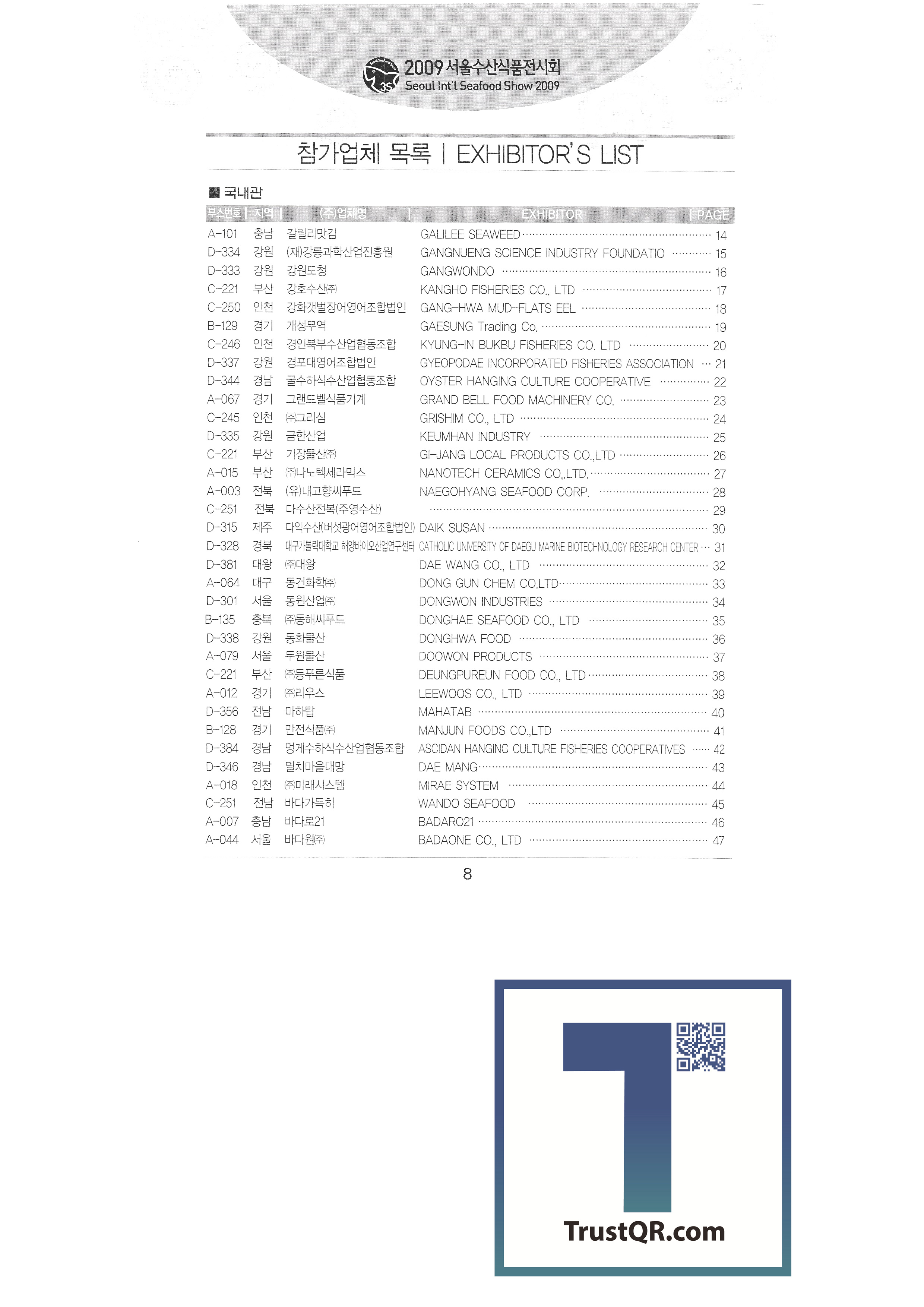 Galilee Flavored Seaweed Gangneung Science Industry Promotion Agency Gangwon Provincial Office Kangho Fisheries Co., Ltd. Ganghwa Tidal Flat Eel English Association Corporation Kaesong Trade North Gyeongin Fisheries Industry Cooperative Gyeongpo University English Association Corporation Oyster Subservation Industry Cooperative Grand Bell Food Machine Grishim Geumhan Industries Gijang Trading Co., Ltd. Nanotech Ceramics Co., Ltd. My Hometown Seafood Majority Mountain Abalone (Jooyoung Fisheries) Daik Fisheries (Mushroom Flounder English Association Corporation) Daegu Catholic University Marine Bio Industry Research Center Daewang Co., Ltd. Donggeon Chemical Co., Ltd. Dongwon Industry Co., Ltd. Donghae Seafood Co., Ltd. Donghwasan Doowon Corporation Deungpurun Food Co., Ltd. Reus Co., Ltd. Mach Tower |