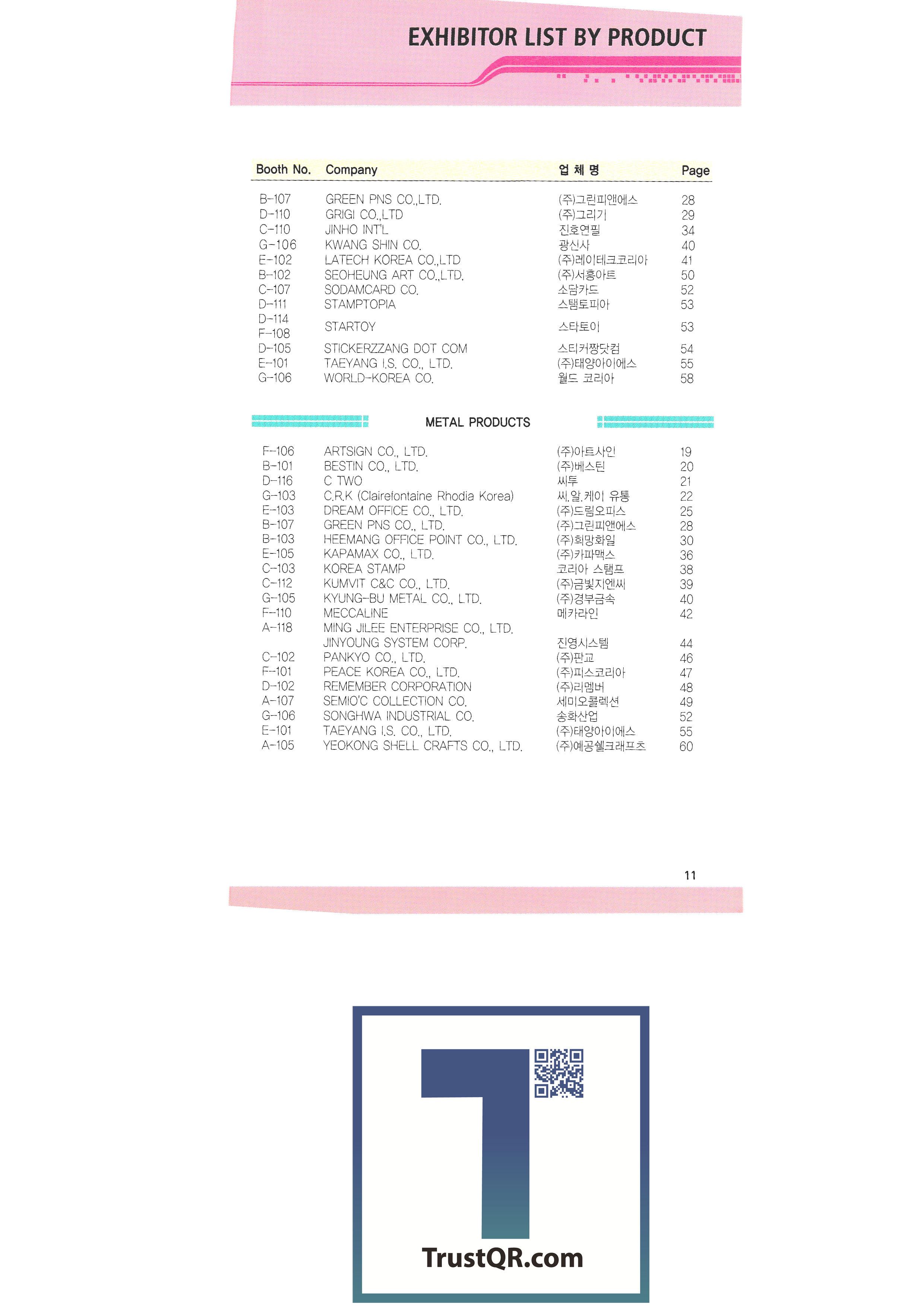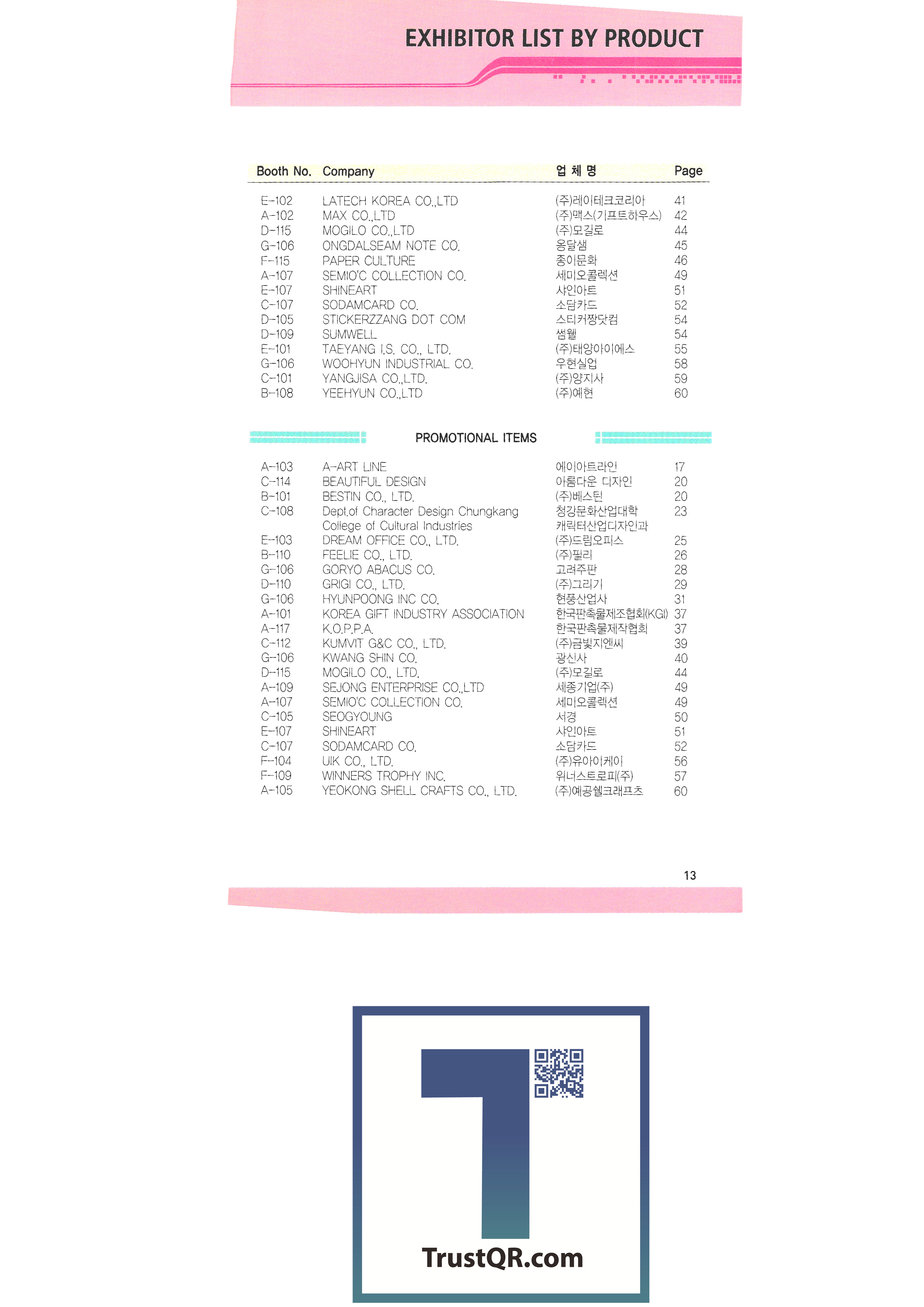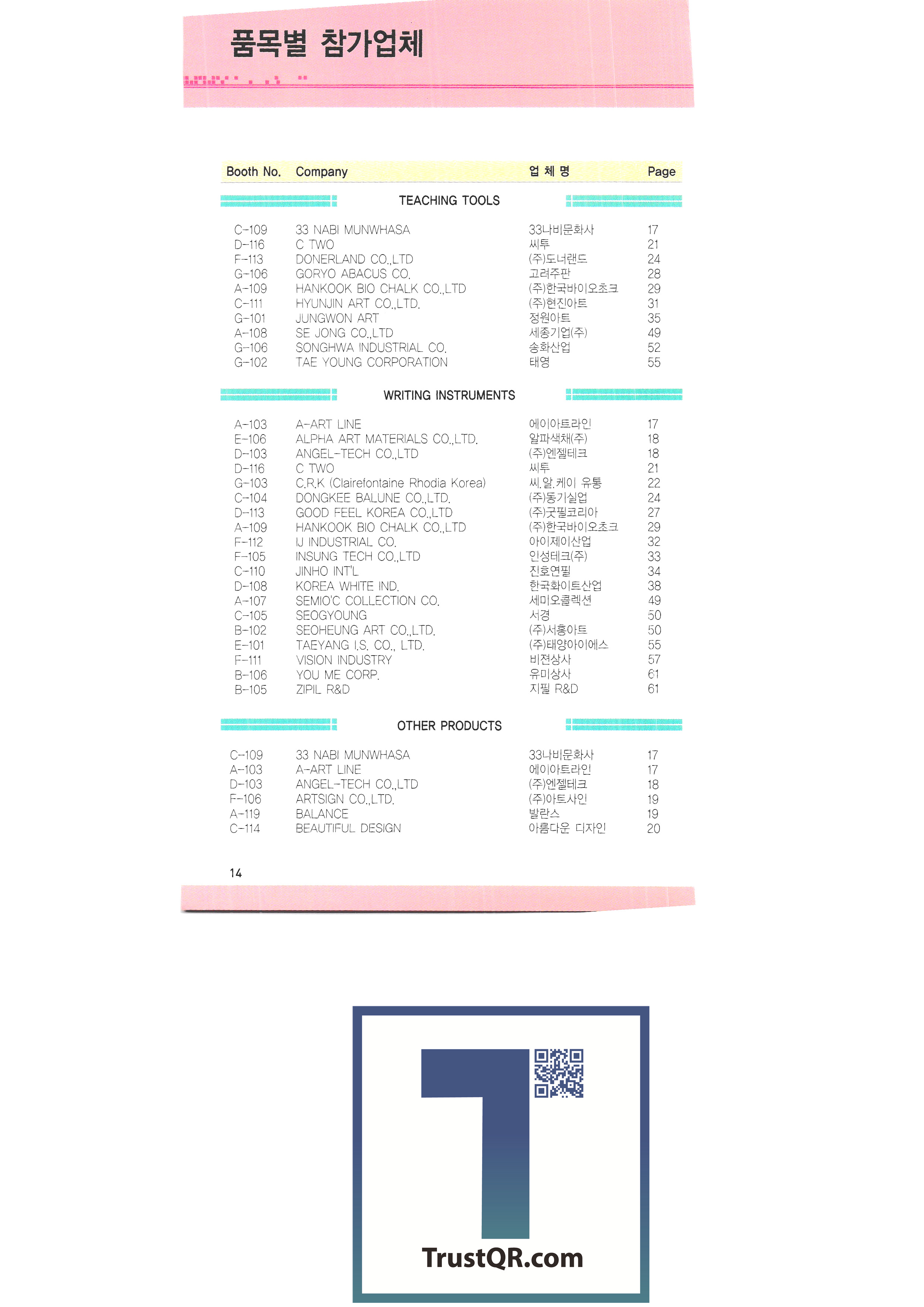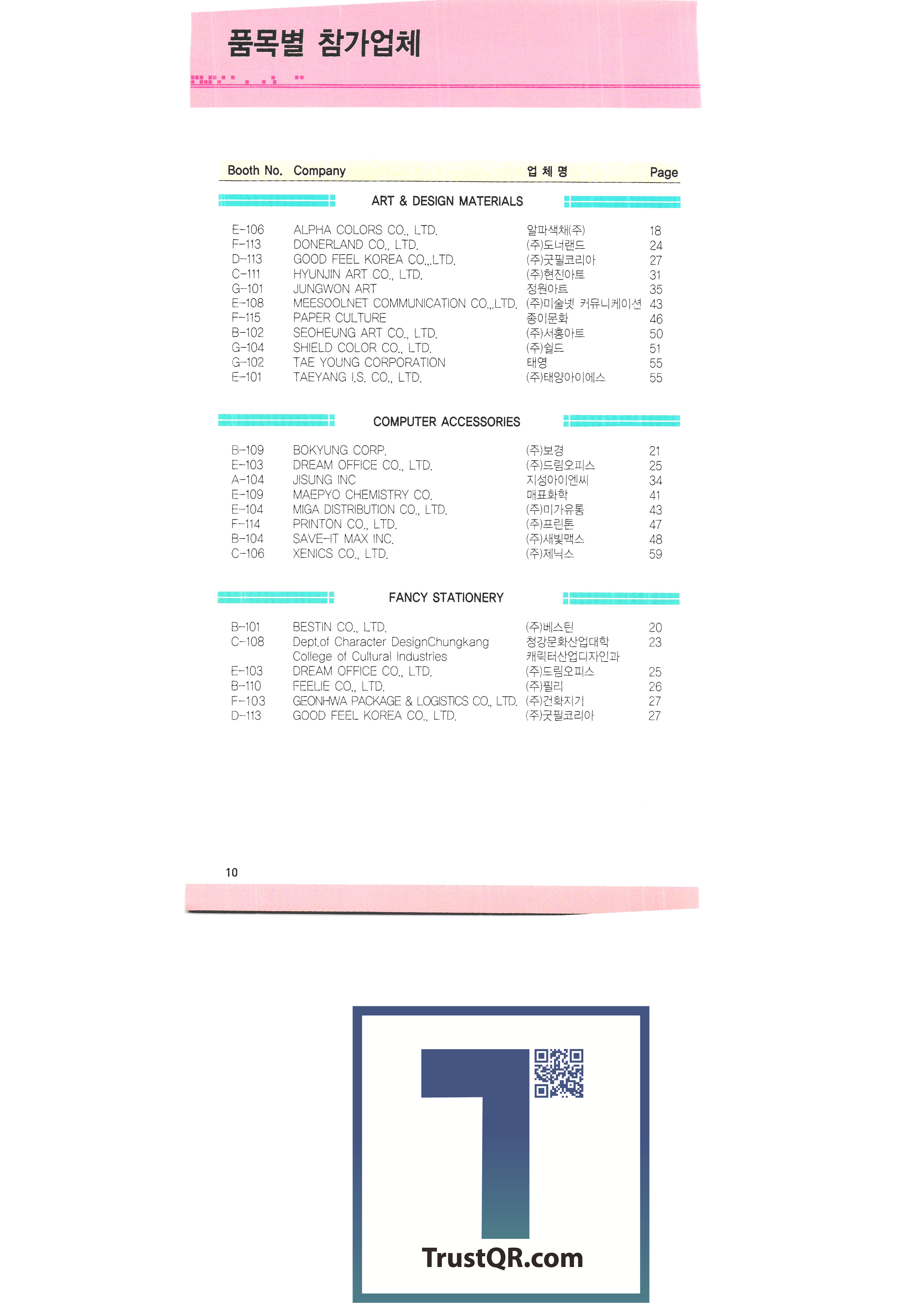 | 33나비문화사 에이아트라인 알파색채㈜ ㈜엔젤테크 ㈜아트사인 발란스 아름다운 디자인 ㈜베스틴 ㈜보경 씨투 씨.알.케이 유통 창신정밀공업사 ㈜코엑스 청강문화산업대학 캐릭터산업디자인과 ㈜도너랜드 ㈜동기실업 ㈜드림오피스 ㈜이랄라 인터내셔날 문방불패 에버윈 ㈜필리 ㈜건화지기 ㈜굿필코리아 고려주판 ㈜그린피앤에스 ㈜그리기 ㈜한국바이오초크 한국제지㈜ ㈜희망화일 ㈜현진아트 현풍산업사 아이제이산업 인드림텍 인성테크㈜ 장군사 진호연필 지성아이엔씨 정연개발㈜ 정원아트 ㈜카파맥스 한국코디 한국판촉물제조협회(KGI) 한국판촉물제작협회 코리아스탬프 한국화이트 케이피티㈜[메모뱅크] ㈜금빛지엔씨 광신사 ㈜경부금속 ㈜레이테크 코리아 매표화학 |