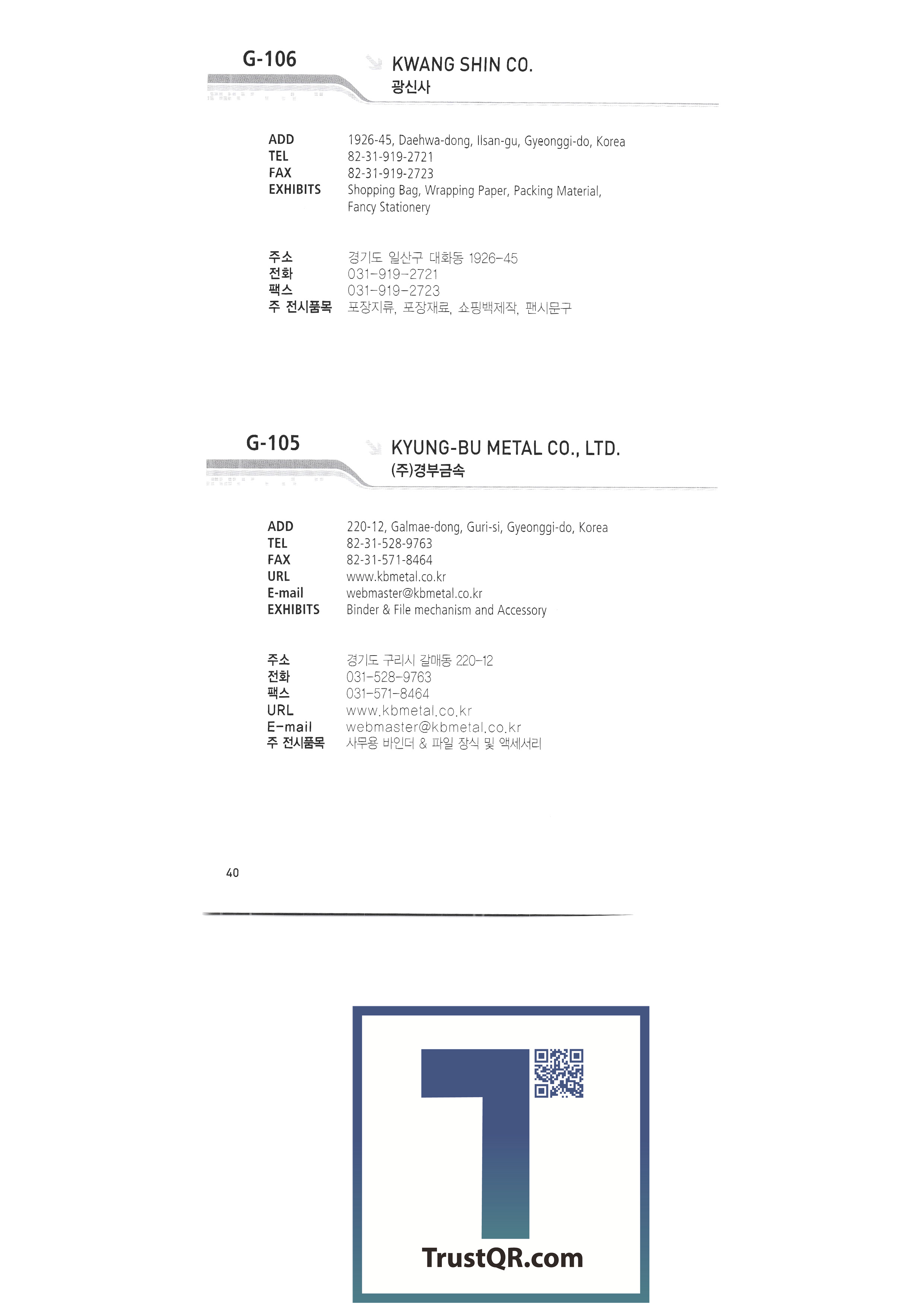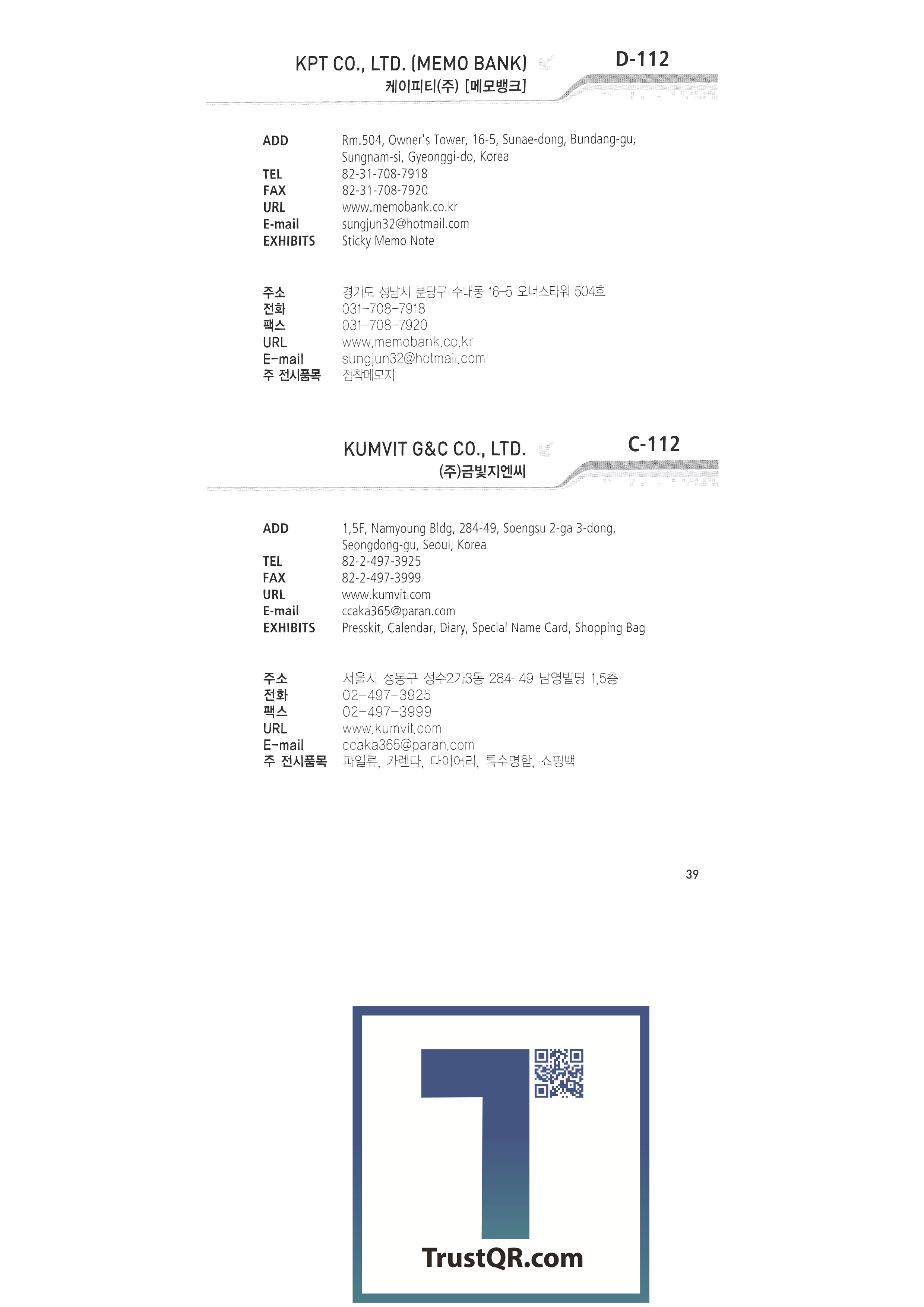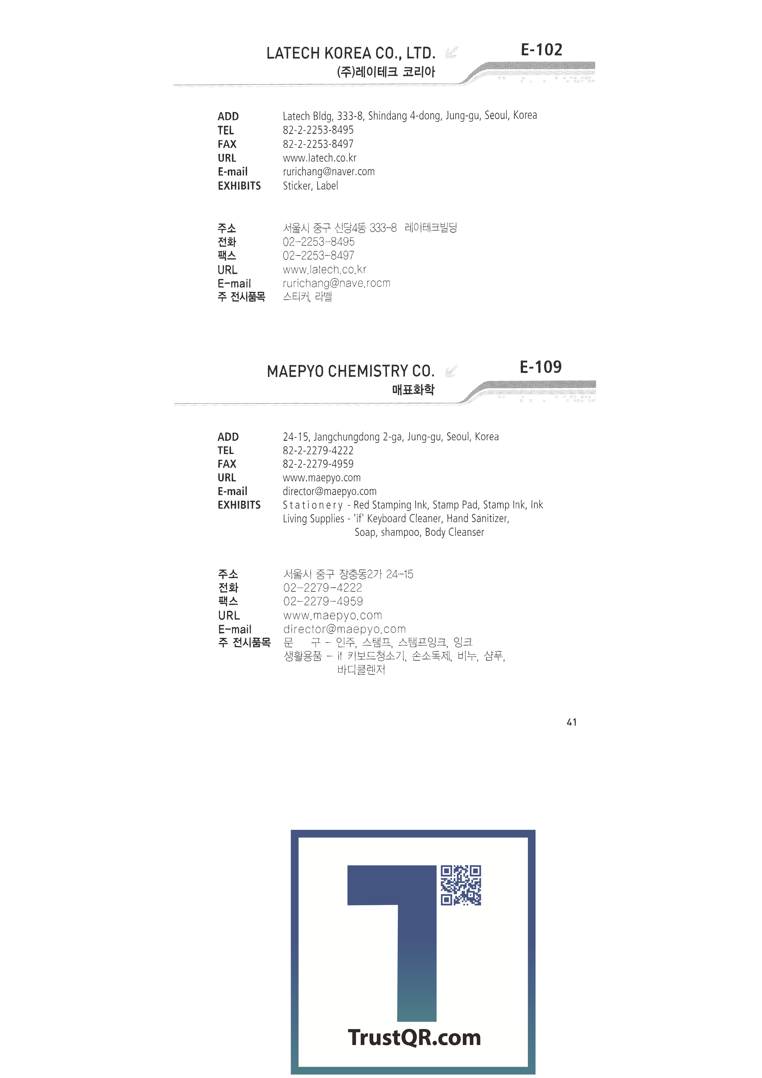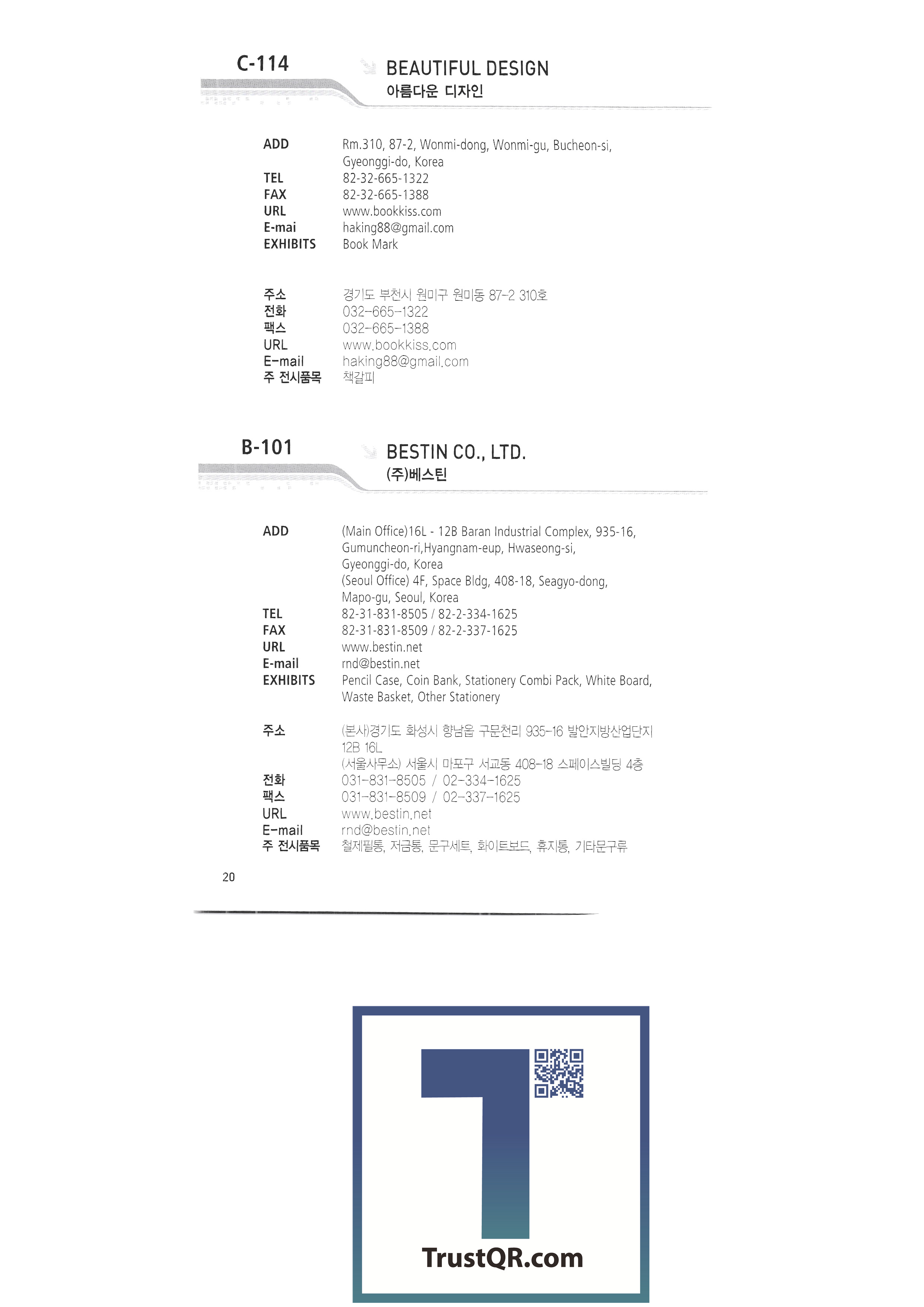 | 33나비문화사 에이아트라인 알파색채㈜ ㈜엔젤테크 ㈜아트사인 발란스 아름다운 디자인 ㈜베스틴 ㈜보경 씨투 씨.알.케이 유통 창신정밀공업사 ㈜코엑스 청강문화산업대학 캐릭터산업디자인과 ㈜도너랜드 ㈜동기실업 ㈜드림오피스 ㈜이랄라 인터내셔날 문방불패 에버윈 ㈜필리 ㈜건화지기 ㈜굿필코리아 고려주판 ㈜그린피앤에스 ㈜그리기 ㈜한국바이오초크 한국제지㈜ ㈜희망화일 ㈜현진아트 현풍산업사 아이제이산업 인드림텍 인성테크㈜ 장군사 진호연필 지성아이엔씨 정연개발㈜ 정원아트 ㈜카파맥스 한국코디 한국판촉물제조협회(KGI) 한국판촉물제작협회 코리아스탬프 한국화이트 케이피티㈜[메모뱅크] ㈜금빛지엔씨 광신사 ㈜경부금속 ㈜레이테크 코리아 매표화학 |