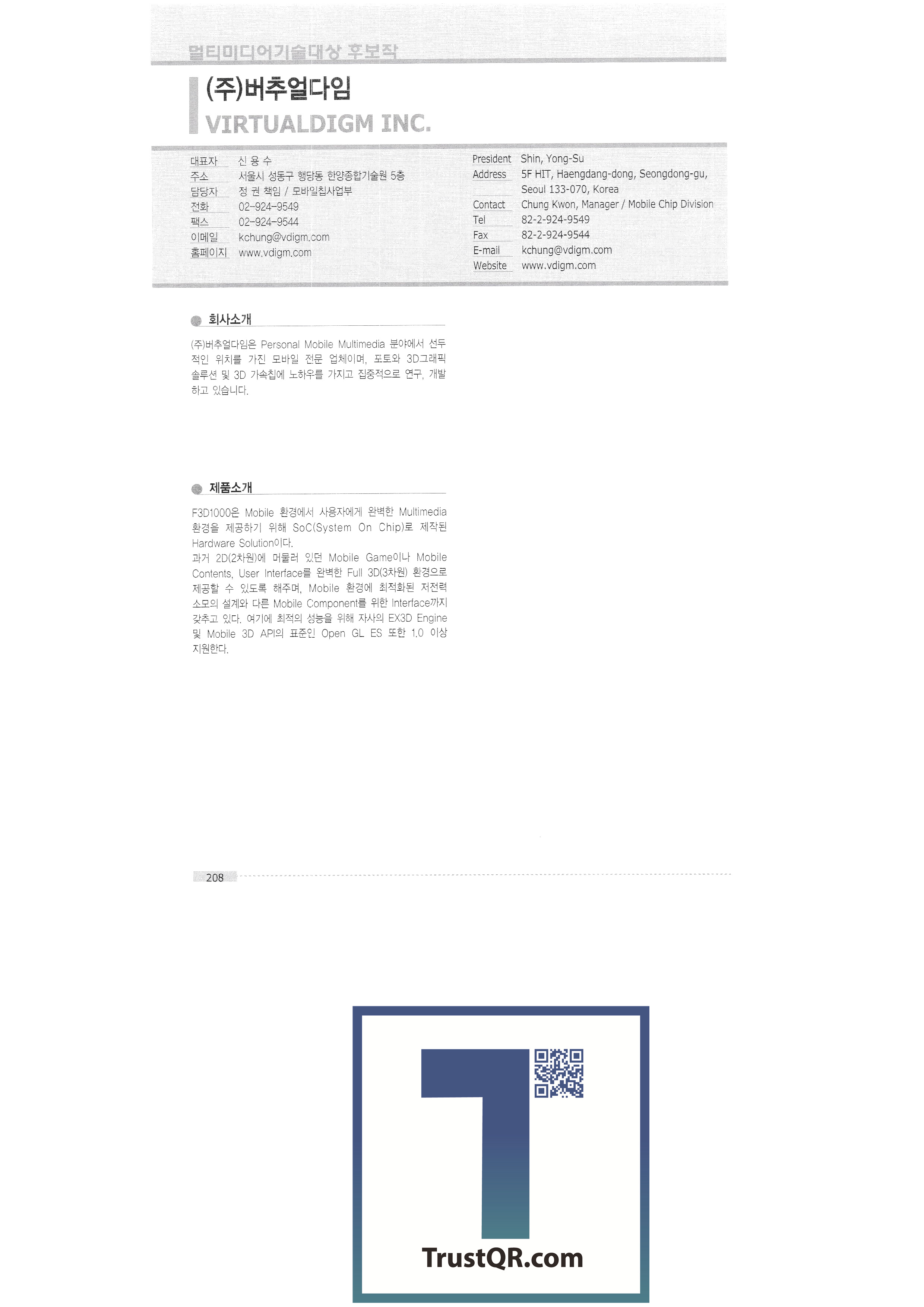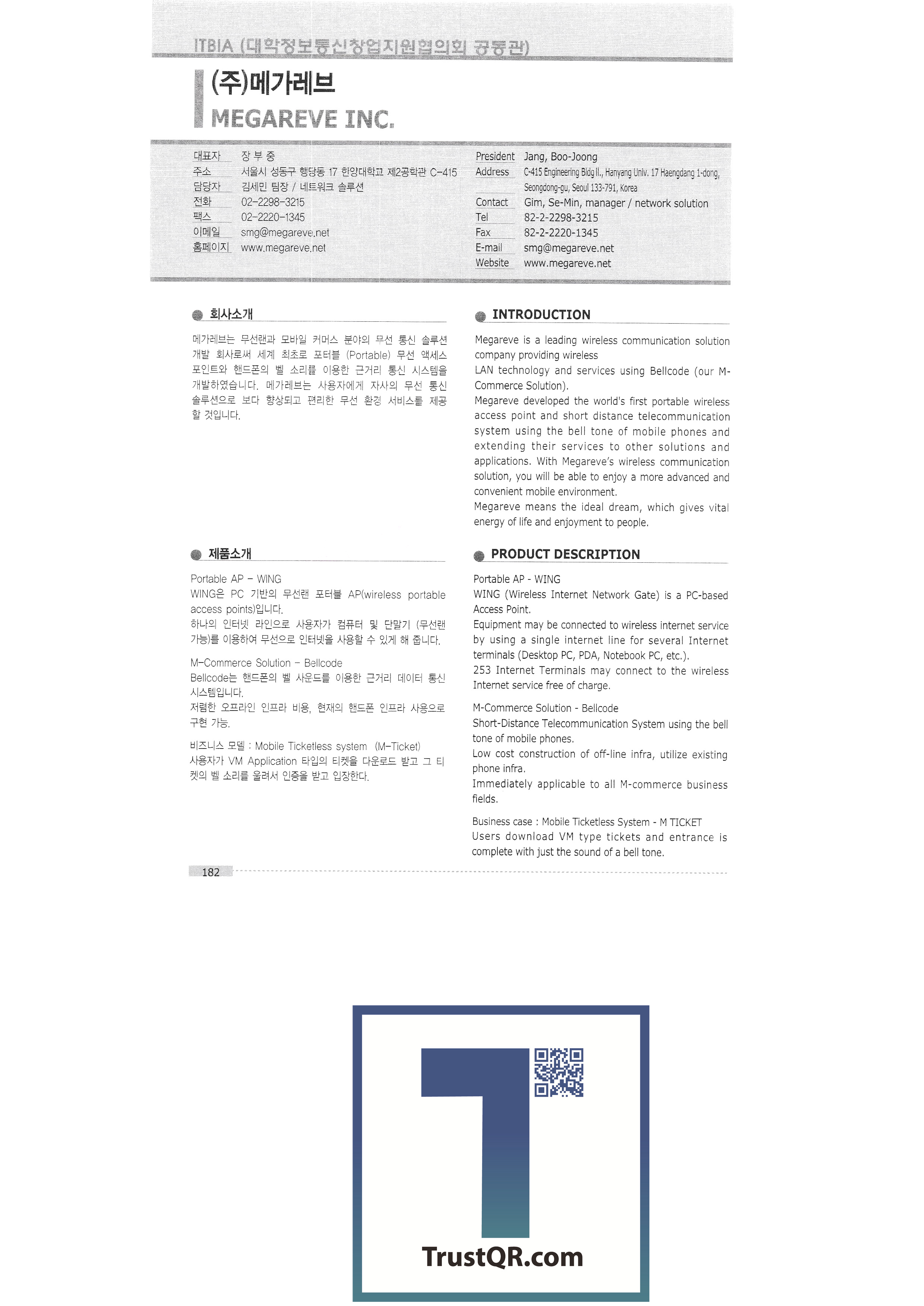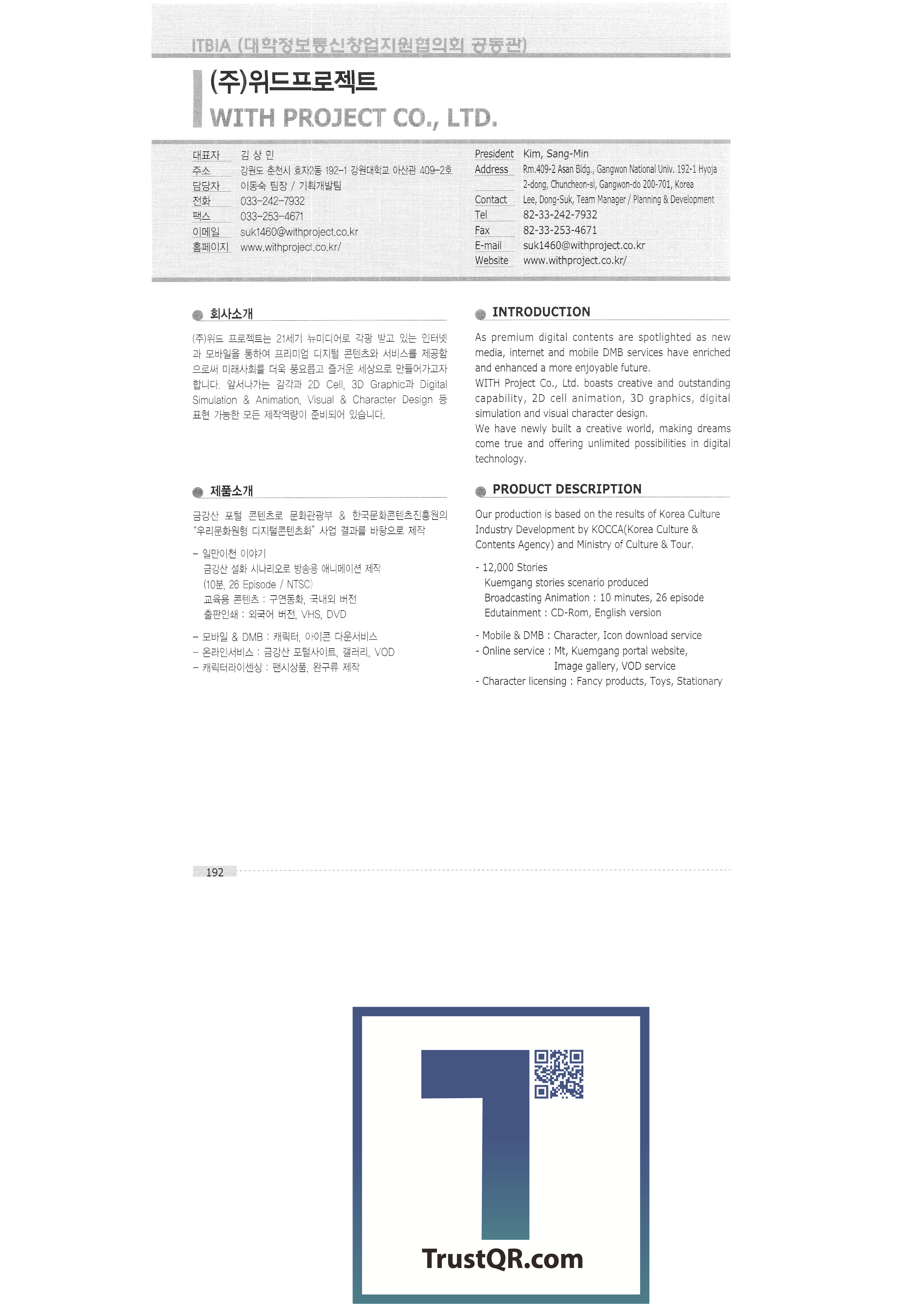 | ㈜넥스트로닉스 ㈜세솔 ㈜에이비아이시스템 오닉스 시스템㈜ ㈜지온소프트 진영정보통신㈜ 첨단공학연구소 ㈜코나인정보 ㈜코리아퍼스텍 대학정보통신창업지원협의회 ㈜리버스 ㈜머스트 ㈜메가레브 비비티 ㈜스카이유엠에스 ㈜에스티비 엔트로피시스템 주식회사 엔트올 엠아이티(MIT) ㈜온누리시스템즈 우리집 ㈜웰라이프 ㈜위드프로젝트 ㈜위트 ㈜이알에프시스템 ㈜인비넷 ㈜제니스테크 파이어 시스텍 ㈜프리즘테크 한누리디지탈주식회사 한울주식회사 화진하이텍주식회사 ㈜글로벌디지탈미디어 ㈜디뮤즈 멀티마인드㈜ ㈜모모웹 ㈜모바일그래프 주식회사 배리스 ㈜버추얼다임 ㈜블루버드소프트 삼성전자㈜ ㈜솔리토닉스 |
