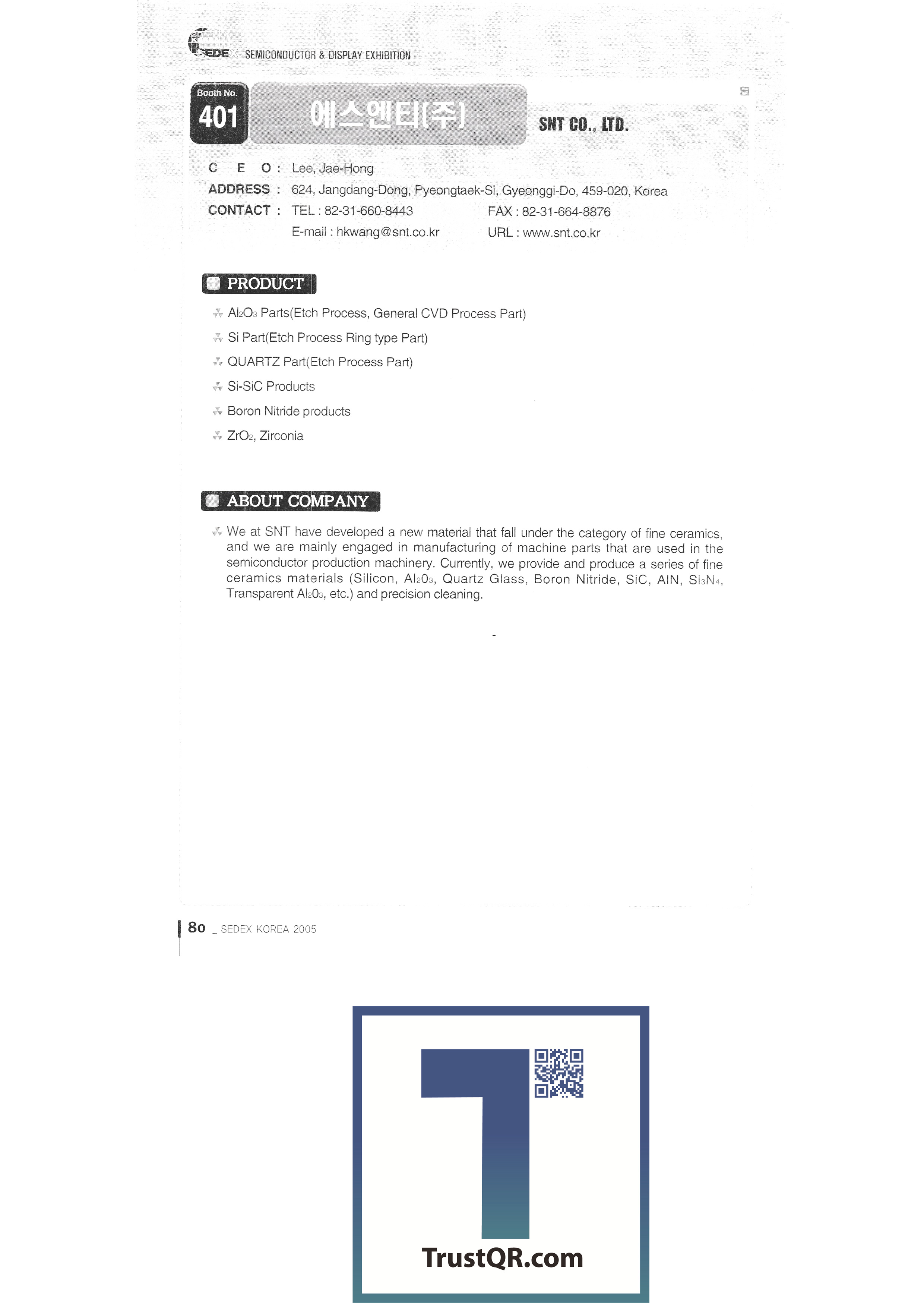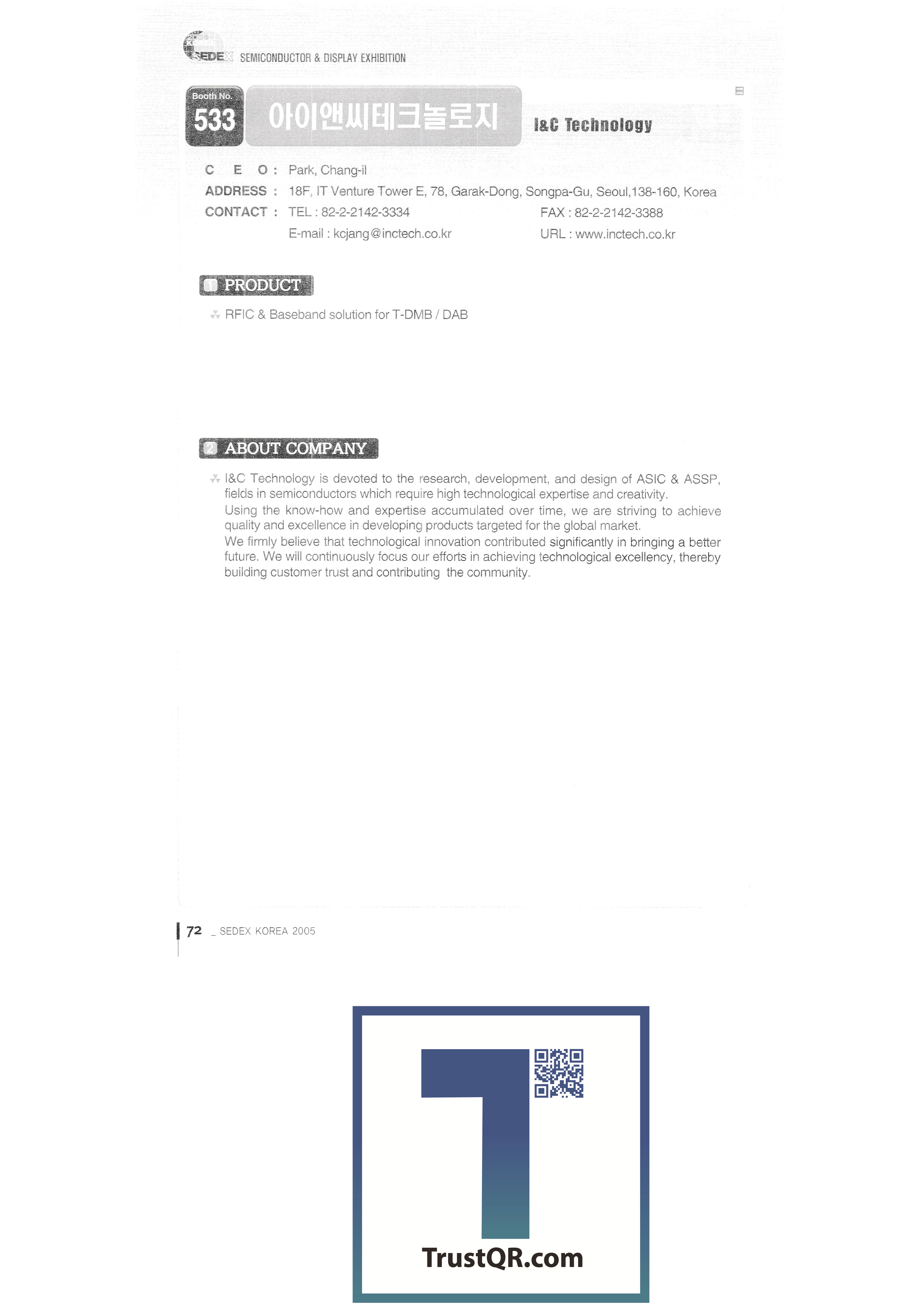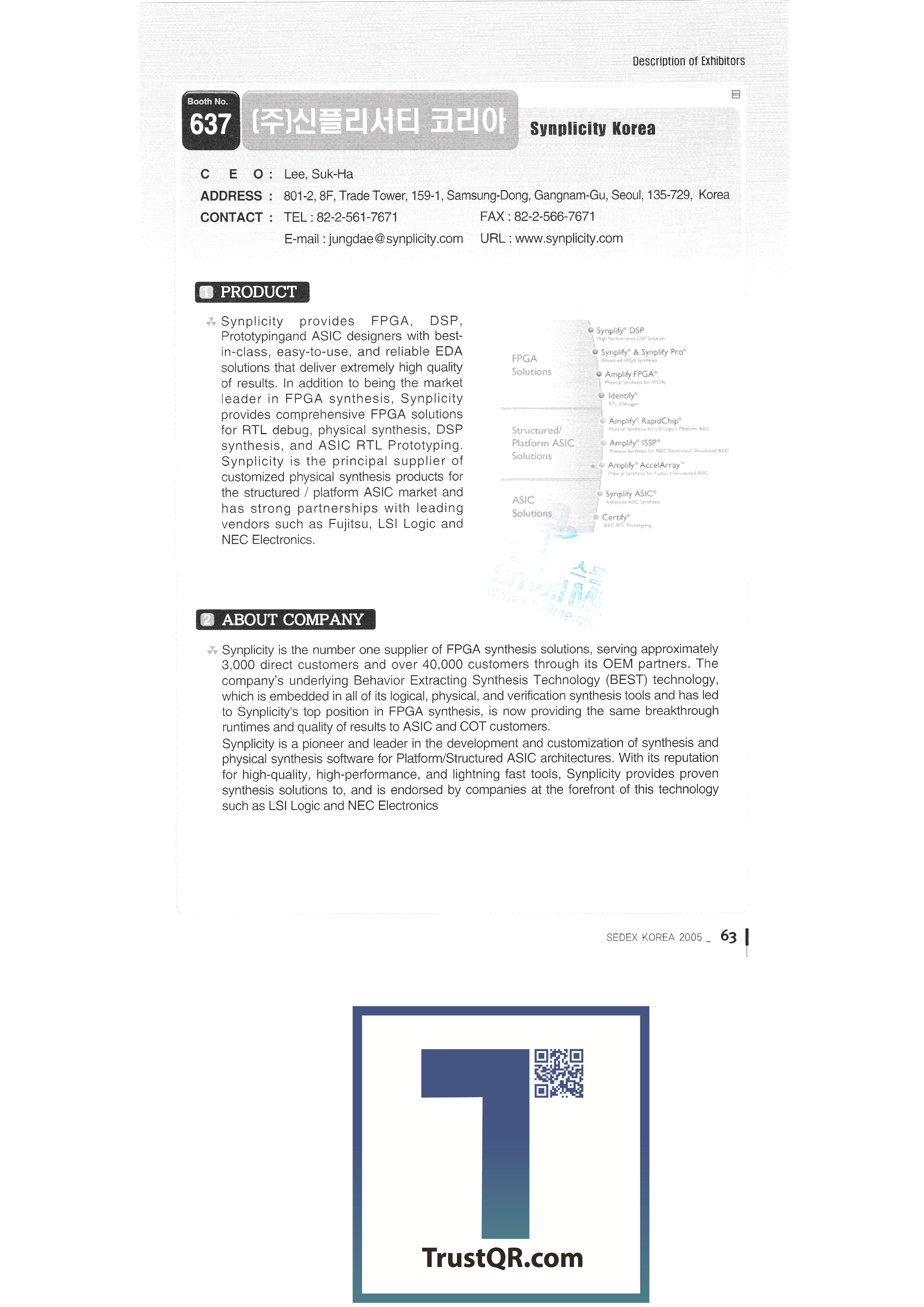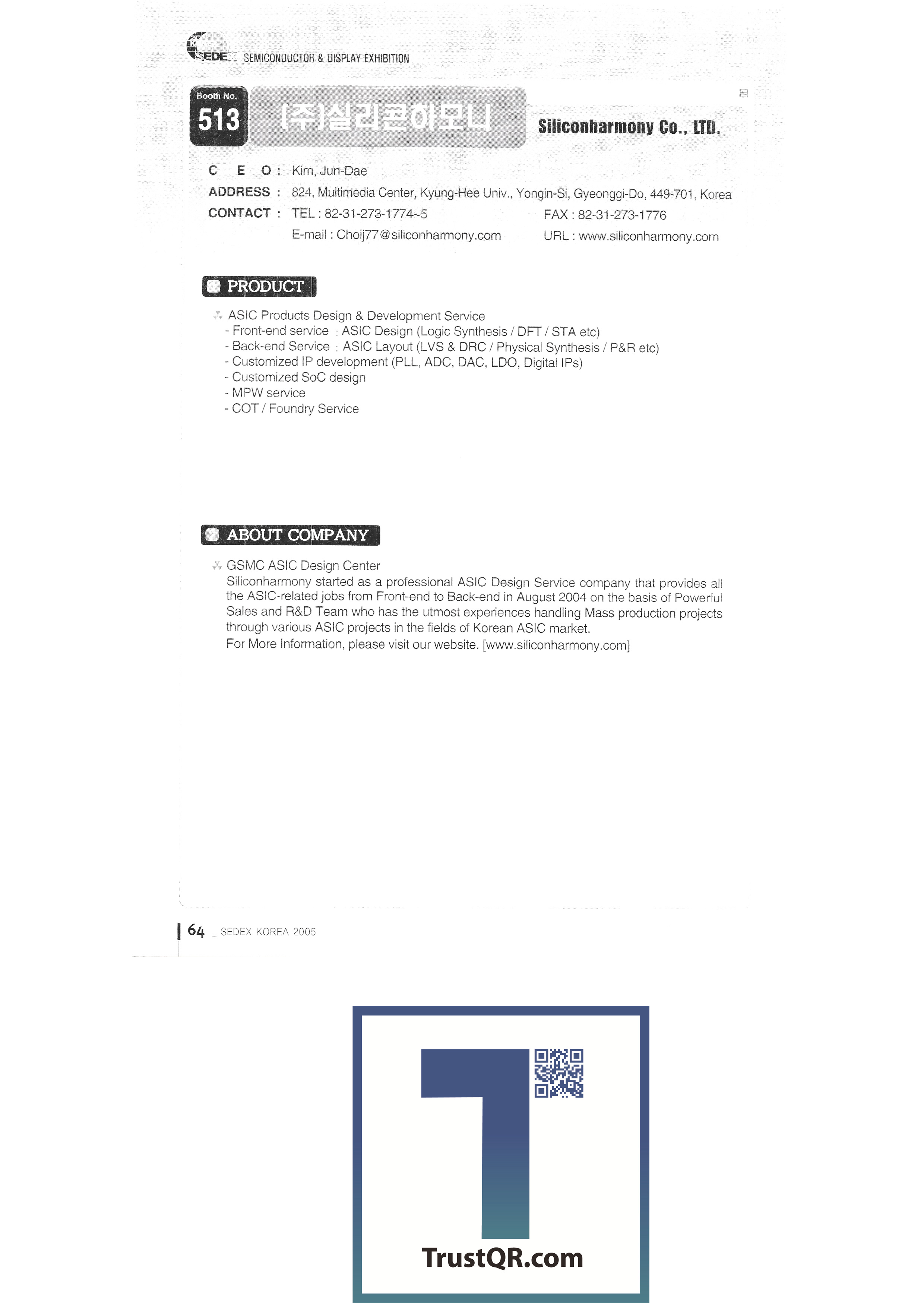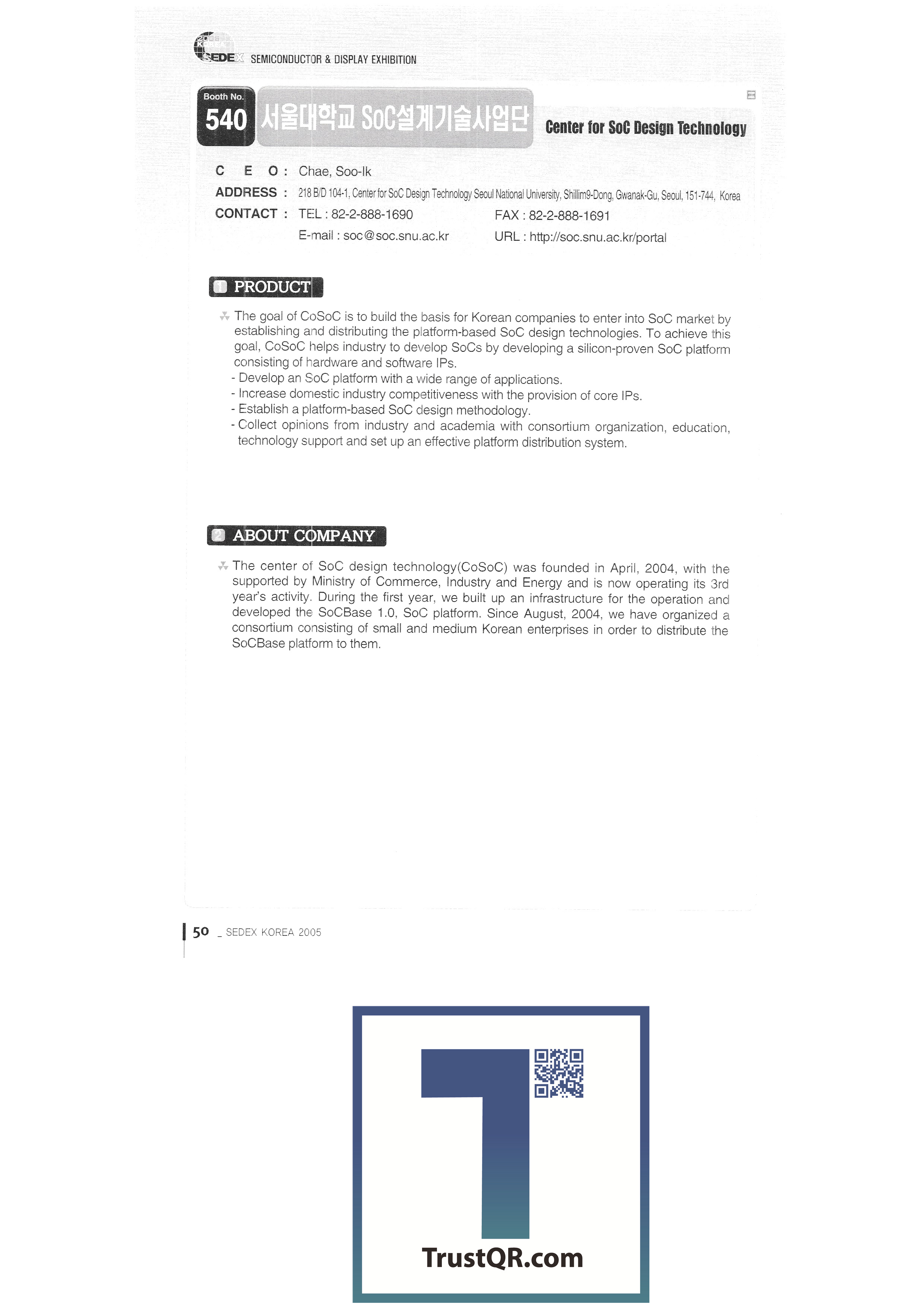 Reno Industrial Co., Ltd. Micro Image Co., Ltd. Magna Chip Semiconductor Main technique Mutel Technology Co., Ltd. Semiconductor Equipment Technology Education Center Vitzro Tech Samsung Electronics Samyoung Electronics Co., Ltd. Samwoo EMC Seoul National University SoC Design Technology Project Team Sungwon Edward Co., Ltd. Sungji Trading Co., Ltd. Seonghwa Electronics Semes Co., Ltd. Semi Solution Co., Ltd. Seva Co., Ltd. Sonics Inc. Schenker Korea System Centroid Shinsung ENG Shinyang P&P Shinwon P&F Synplicity Korea Silicon Harmony Silicon File Co., Ltd. Sometech Semi Display Semi-Cisco Seq Co., Ltd. C&S Technology Co., Ltd. CI Tech I&C Technology ISB Korea IA News Co., Ltd. IPS Co., Ltd. Alcatel Vacuum Korea Ltd. NIP Yard Metals SNS Tech Co., Ltd. S&T SML Electronics Co., Ltd. |
