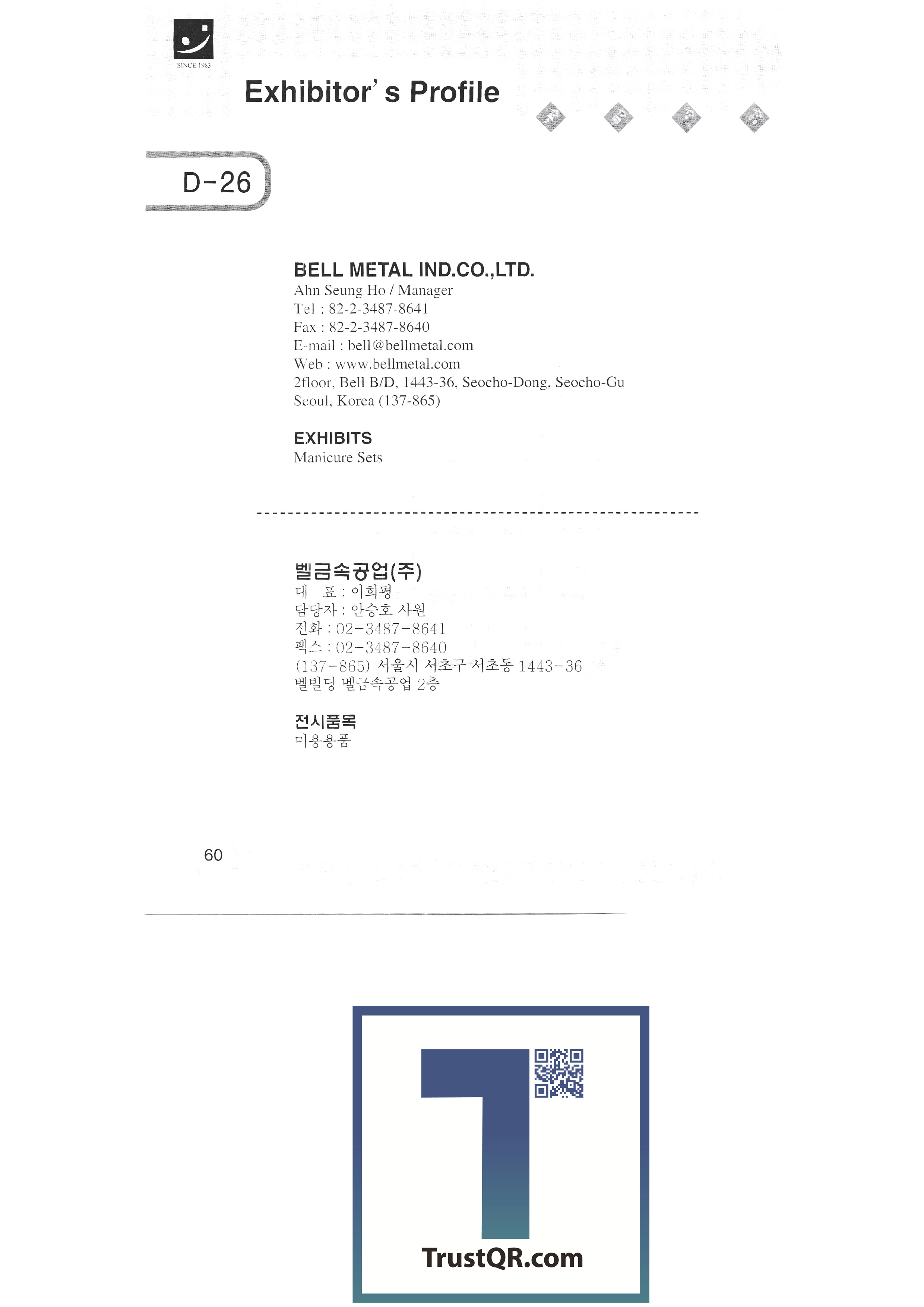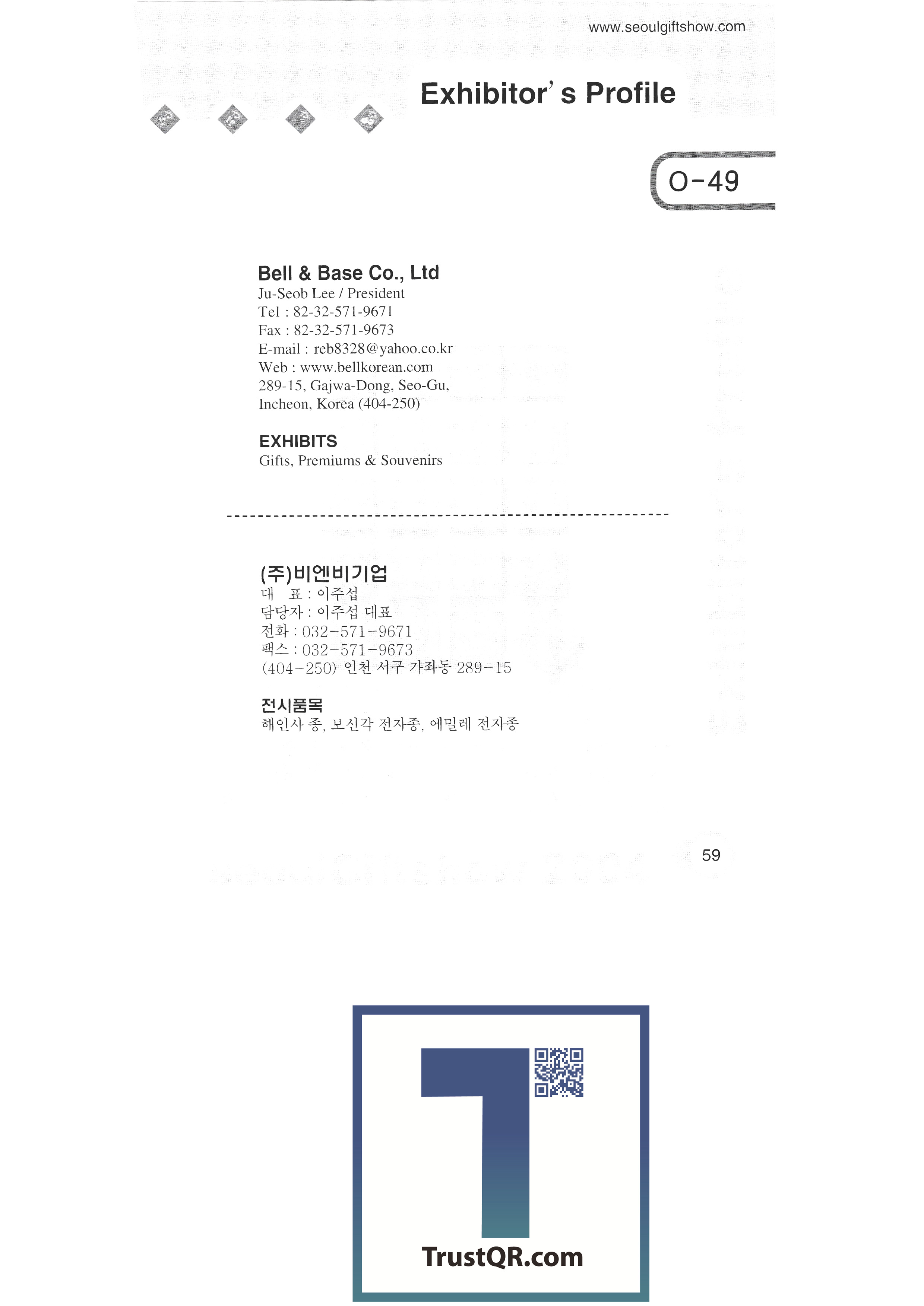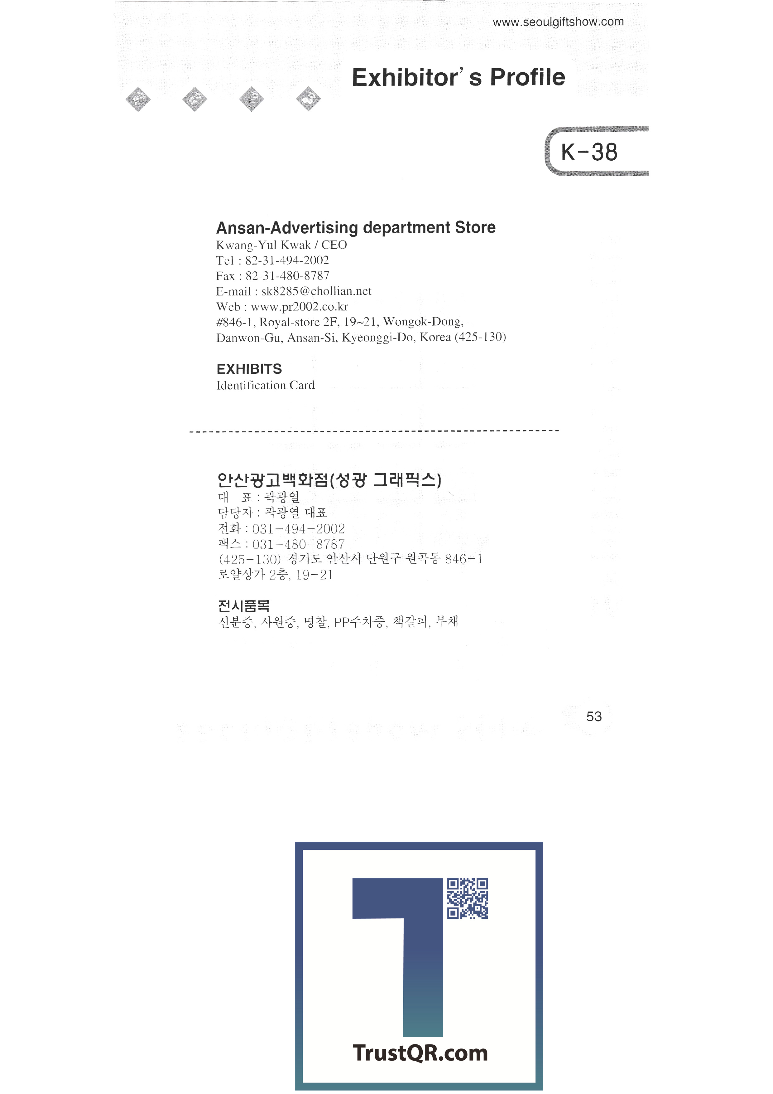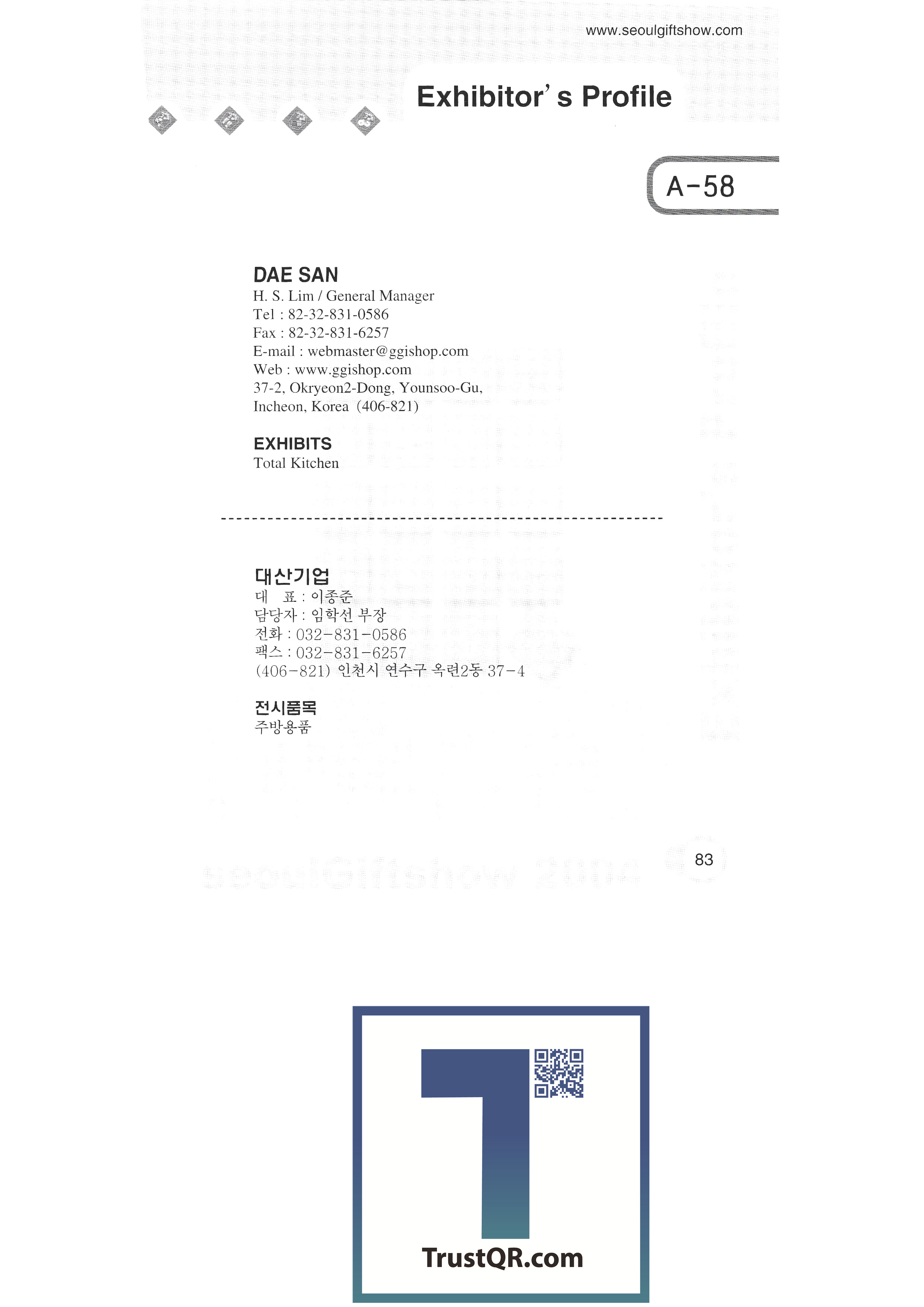 | 쓰리아이피㈜ ㈜아롱엘텍 에이엠 안산광고백화점(성광 그래픽스) ANT COMPANY (형우 폴리테크) 앤티끄라피 (자) 비.에스.리 베틀산업 ㈜비봉인터내셔널 ㈜비엔비기업 벨금속공업㈜ ㈜베스틴 ㈜보광퓨터 부흥사 아트앤리빙㈜한국브랜드밸리 비에스 코리아㈜ 부산공예협동조합 벽전도예 ㈜씨사이 셀타핸드페인팅 셀타 하우스 참코퍼레이션 천하통합㈜ 전북공예협동조합 충남공예협동조합 ㈜씨엘양행 끌레뒤뱅코리아 씨엠피미디어한국㈜ ㈜씨엔티코리아 주식회사 코엑스 공예마을(한지공예) 씨에스아이 ㈜디유티코리아 대산기업 대구광역시(쉬메릭) 대구경북공예협동조합 대전공예협동조합 대림기업사 ㈜대성하이텍 ㈜다옥인터내셔널 달우자수정 다트파워/가가산업 |
