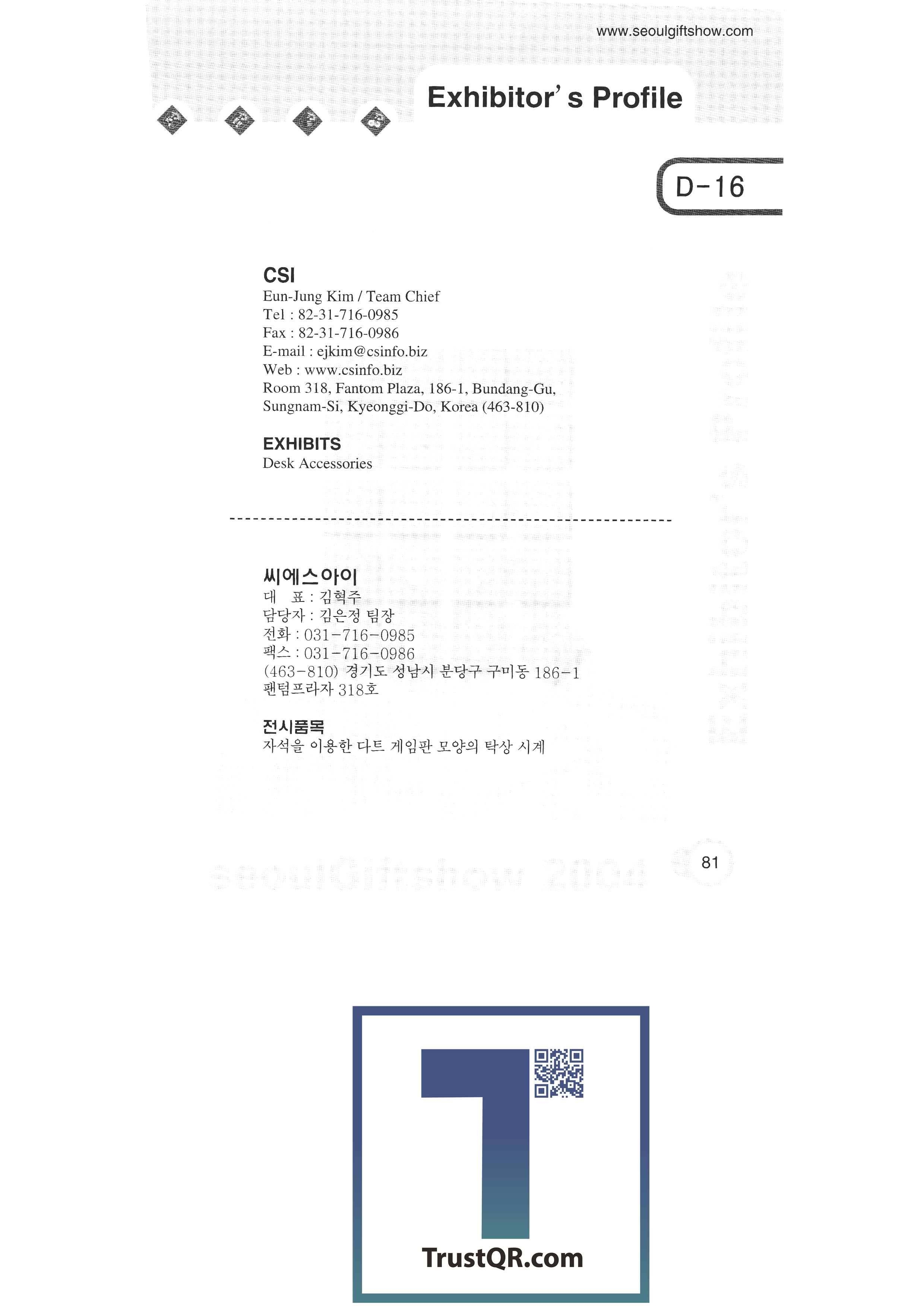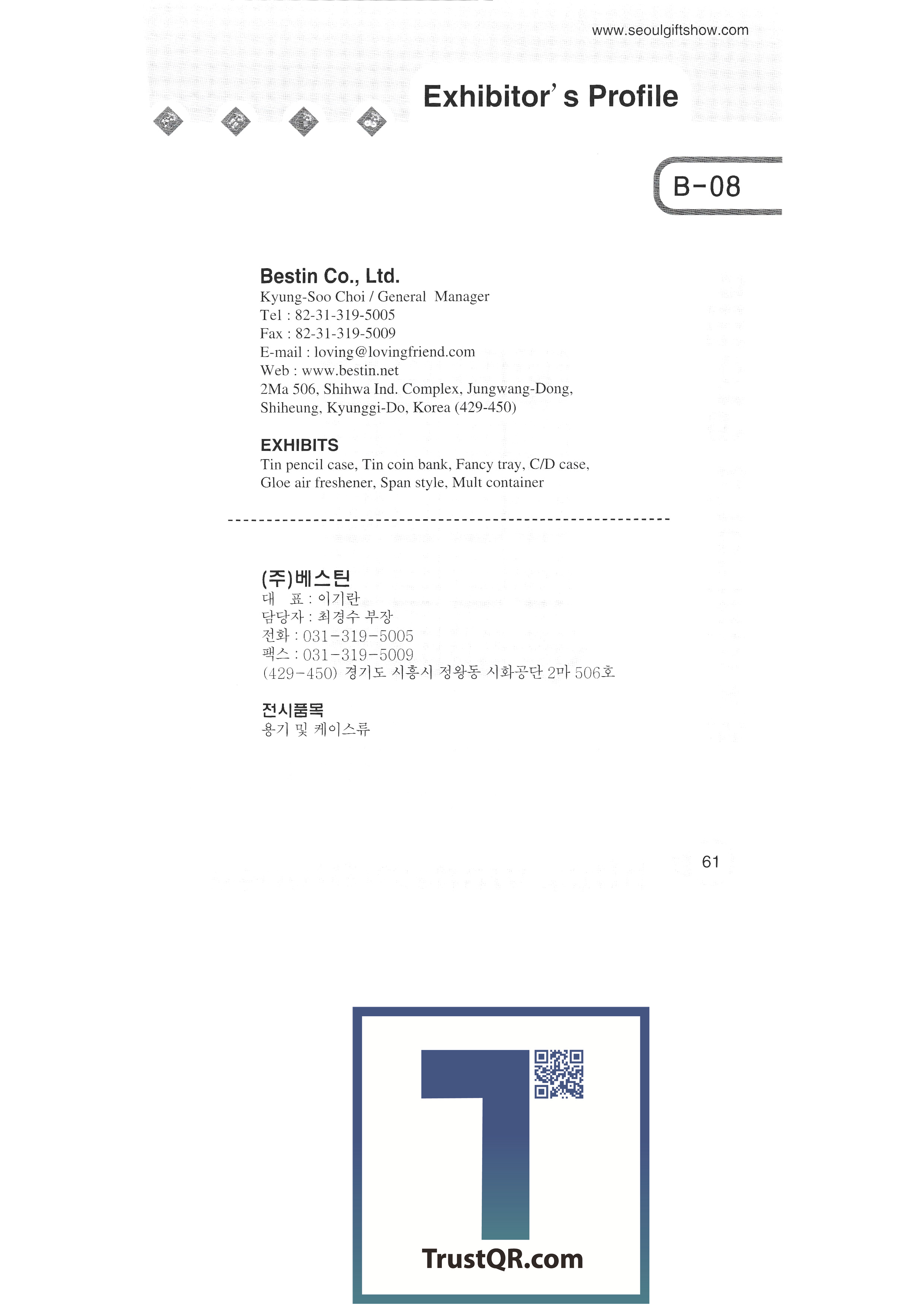 3IP Co., Ltd. Along Eltech AM Ansan Advertising Department Store (Sungkwang Graphics) ANT COMPANY (Hyungwoo Polytech) Antique (Now) B.S. Lee Loom industry Bibong International Co., Ltd. B&B Corporation Bell Metal Industry Co., Ltd. Vestin Bokwang Computer Co., Ltd. Revival temple Art & Living Korea Brand Valley BS Korea Co., Ltd. Busan Craft Cooperative Wall conduction example Csai Co., Ltd. Celta Hand Paint Celta House Charm Corporation Chunha Integration Co., Ltd. Jeonbuk Crafts Cooperative Chungnam Craft Cooperative CL Corporation Clé Du-Bin Korea CMP Media Korea Co., Ltd. CNT Korea COEX Co., Ltd. Craft Village (Hanji Craft) CSI DUT Korea Daesan Enterprise Daegu Metropolitan City (Shmeric) Daegu Gyeongbuk Crafts Cooperative Daejeon Craft Cooperative Daelim Enterprise Daesung Hitech Daok International Moonshine crystal Dart Power/Gaga Industry |