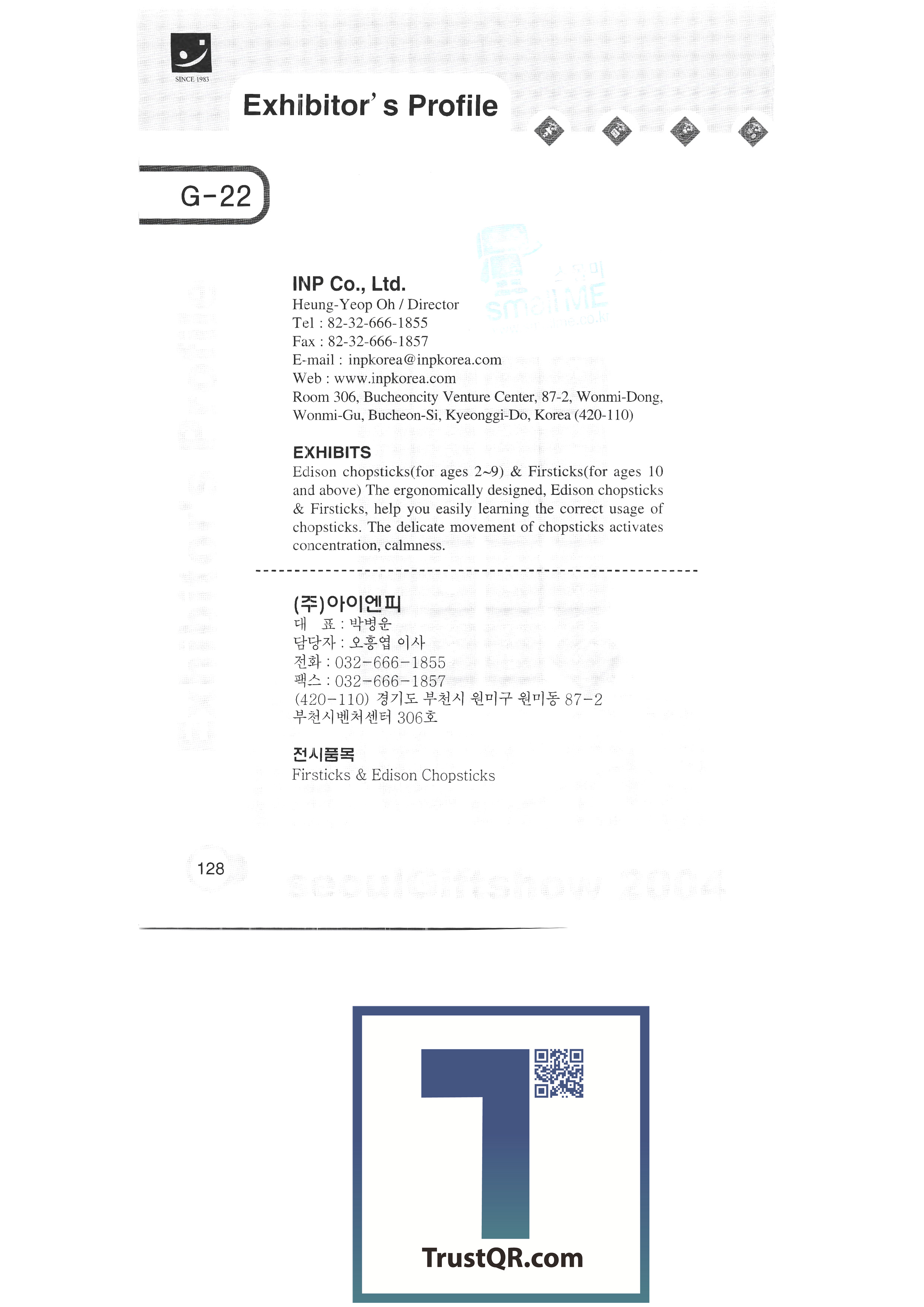 Doolim Workshop Doowon Corporation Pottery Irye Industry Co., Ltd. Good Gift World Co., Ltd. English Bank Co., Ltd. S&B Evergreen MST Easy Talk Phil Aroma Proty Co., Ltd. Gift house Gift Seoul Gift Top Ten Gil Trade Co., Ltd. Global Trade Promotion Korea Branch Gloyan Co., Ltd. GM Mart Golden Bridge Co., Ltd. Golden Tower Co., Ltd. (Green House) Haedong Industry Hamtech Korea Co., Ltd. Hansol Hana C&G Korea-China Free Trade Co., Ltd. one Hansung Industry Hanul Digitech Co., Ltd. Heesung CRM Co., Ltd. Hudus (Geumsil Trading) Hong Kong Trade Development Bureau Hotline Hwajeon Co., Ltd. Ki Moa Hwang Hyundai Hwasung Industry Co., Ltd. I love character INP Instrack Co., Ltd. International Intex Invision Artisan room Jaram Industry Jeju Island Craft Cooperative Jimin Enterprise Co., Ltd. Jirisan Special Paper Intelligence industry Warlord Jongse Trading Co., Ltd. Jungwon Enterprise JS Fashion Co., Ltd. Jeonghee Industry Jeonghwa Industrial Co., Ltd. Jungwoo Industry Gail Trading Gangwon-do Crafts Cooperative |