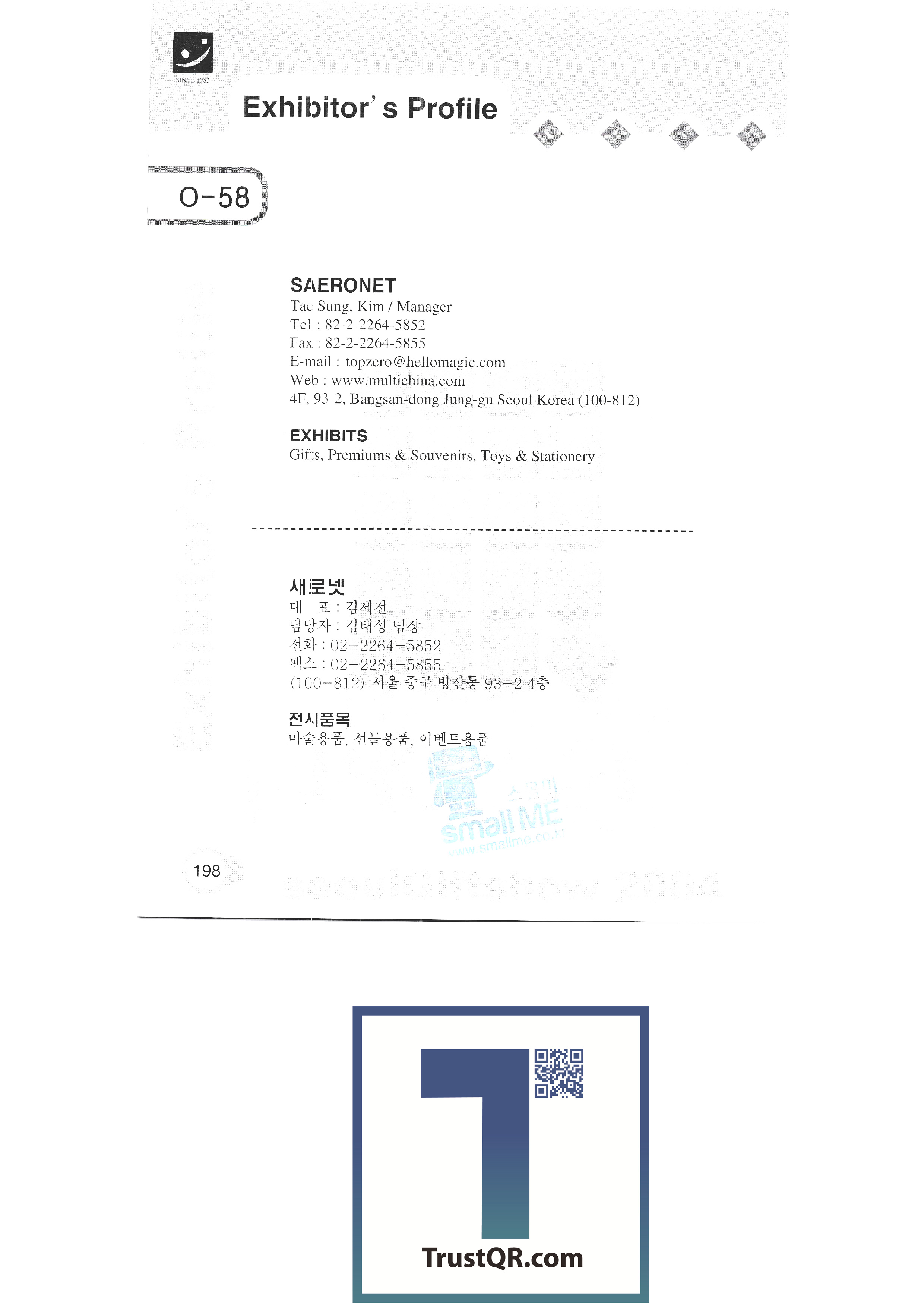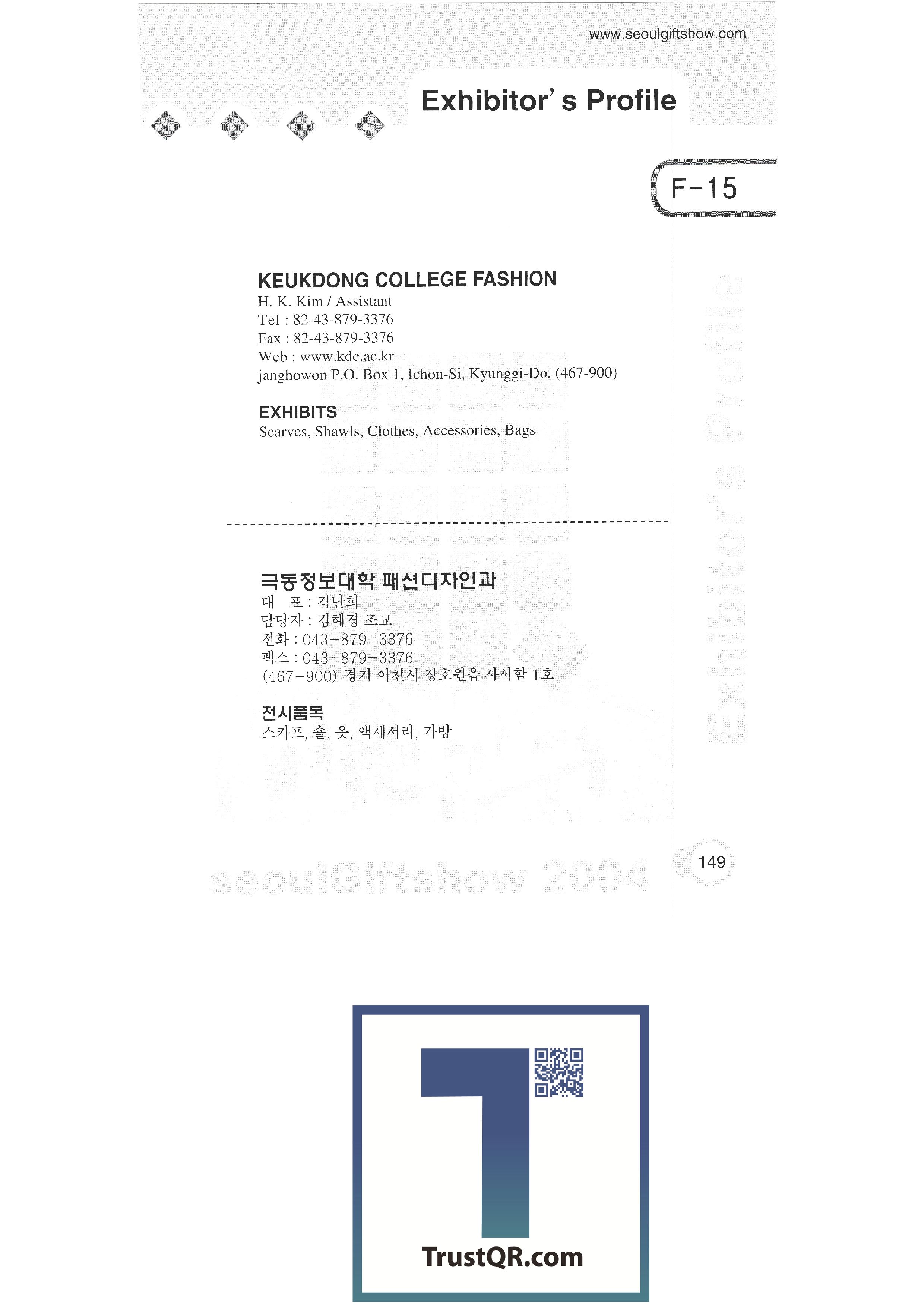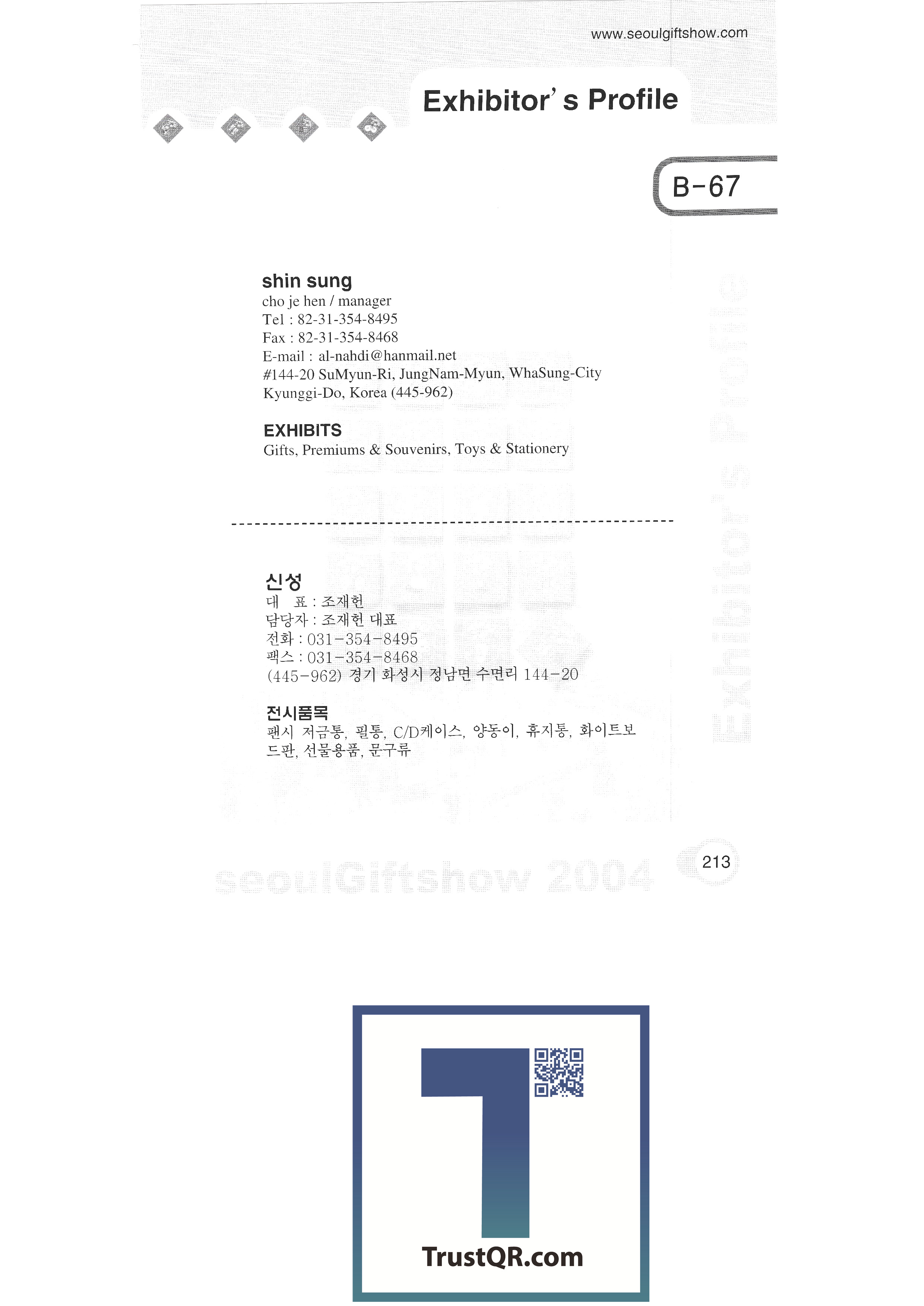 Kawa Korea Co., Ltd. Far East Information College Fashion Design Department Kim's Prime Co., Ltd. Sejong Corporation Kirin Enterprise Co., Ltd. Kisung Industrial Company Codian Korea Exhibition Newspaper COMEX INDUSTRY Conard Co., Ltd. Korea Spherical Joint Doll Association Korea Craft Promotion Agency Korea Promotional Products Manufacturing Association (Joint Hall of Association) Product Market Korean Sources Korea Soft Co., Ltd. Cowell Industry Goyang City Crafts Cooperative Gwangju Jeonnam Craft Cooperative Gyeongsangnam-do Craft Cooperative Lacasa Langco Line Lbiz Korea Co., Ltd. LCD Sign Limsco International Manu Crystal Micomic Korea Bran selenium Millennium Youngwoo Min Corporation Future Trade Mirim Industry Co., Ltd. Monami Co., Ltd. Monthly Krat Culture Industry Co., Ltd. Mirtec Naschem Nemoface Co., Ltd. Nexenpia Wickern/Next NIT NCC IND Only Oryunsa Temple Passwatch Inc. Perfect Industry Co., Ltd. Phoenix Corporation Photo Calendar/SJ International Promo International Peace Trade New Net Samyang Corporation Seyoung Industry Seed and day Three Gorges Instruments Sejin Grand Co., Ltd. Sejong Enterprises Semio Collection Seohwa Co., Ltd. Federation of Korean Craft Cooperatives Seoul Craft Industry Cooperative Seoul C&T Seoul Women's Business Entrepreneurship Center Seoul love Shinseung Industry Co., Ltd. divinity Shinhan Enterprise Holy P.R |