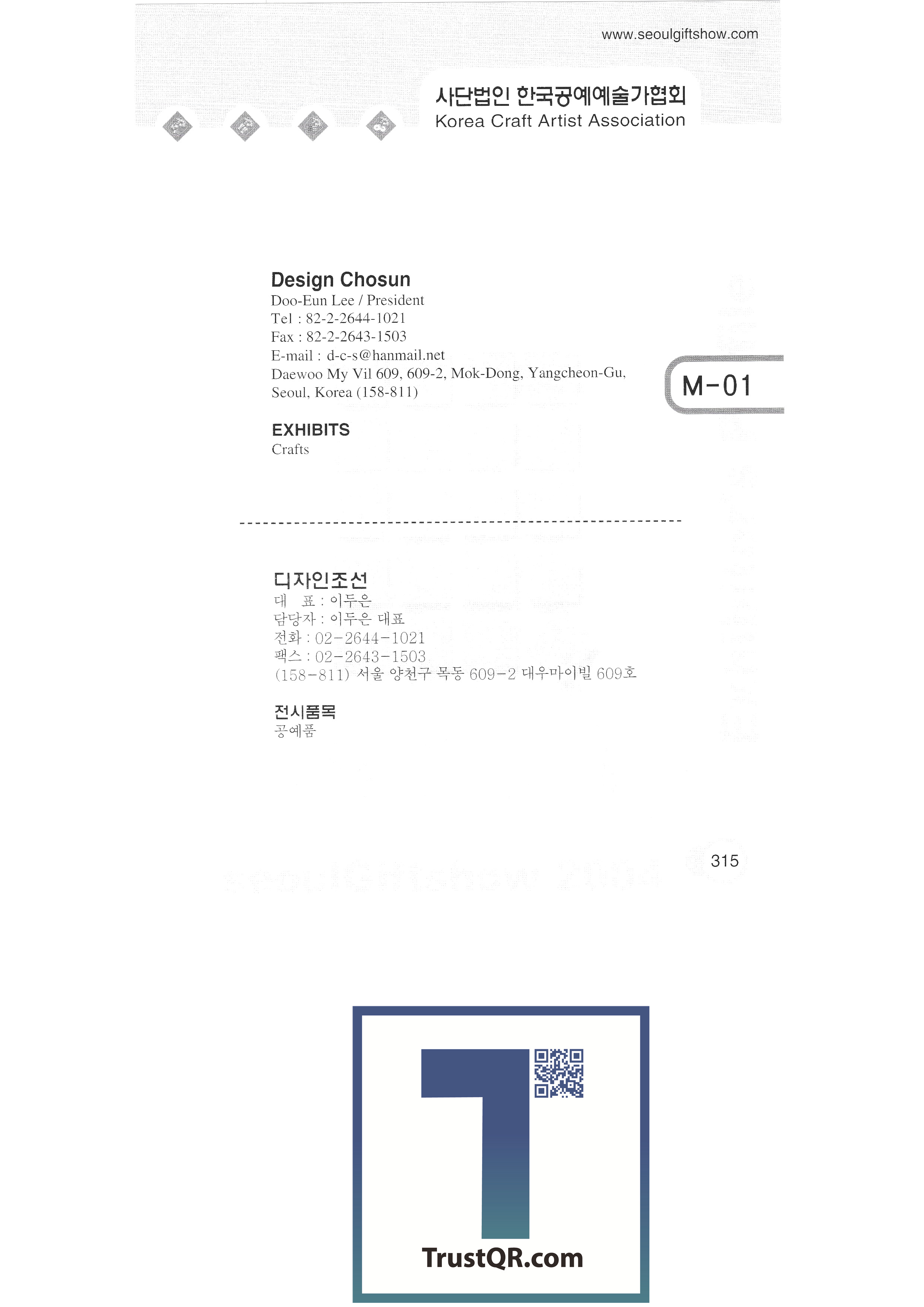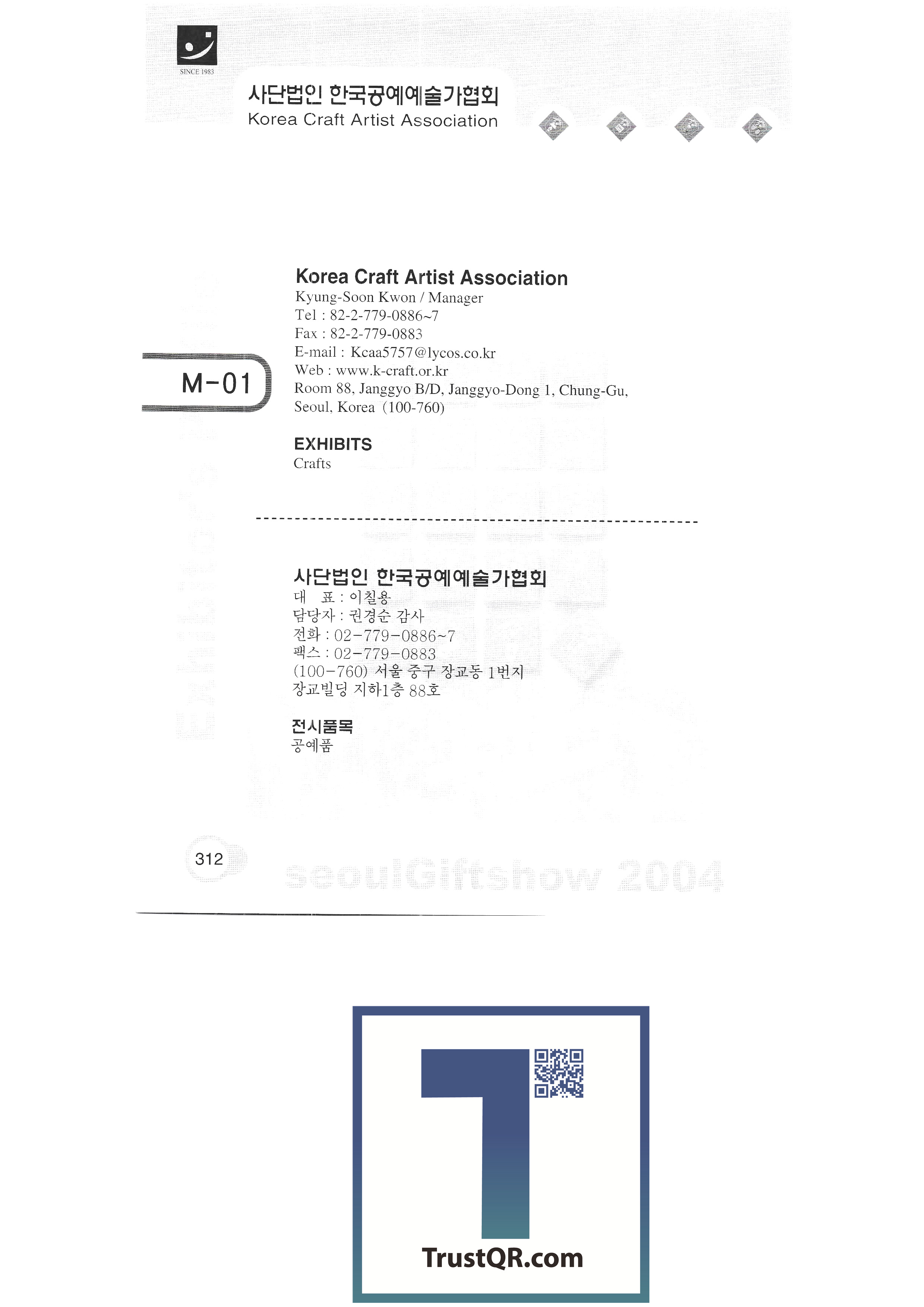 | 엑스포 디자인 연구소 훼미리 아트 ㈜젬스코리아 화인공예 효성인터내셔널 잘상사 쥬얼리 캐드캠 아카데미 진칠보공예사 진솔 카라빈카 금산공예 경인사 ㈜이거만 AnF ㈜엠비주얼리 미광공방 옹기나라 ㈜오픈에스이 퍼슨 코리아 삼우 서울사랑 실버윈 토트 디자인 토우 우리세계 와즈코리아 얀 예원아트 ㈜옛날솜씨 윤씨방 울산광역시 ㈜봉기산업 당코 기봉요 고려민예사 한우리공방 홍우도예 ㈜남정 사단법인 한국공예예술가협회 워크앤샵 아름당 디자인조선 한지세상 플라워 인 금낭 가베 에그랑 Agung Handicraft CV. JAYA Gallery & Creates America International Trading Co., Ltd. Asia- Europe Trading & Service Co.,Ltd. Bahja Export Best Track International Borobudur Silver&Furniture |