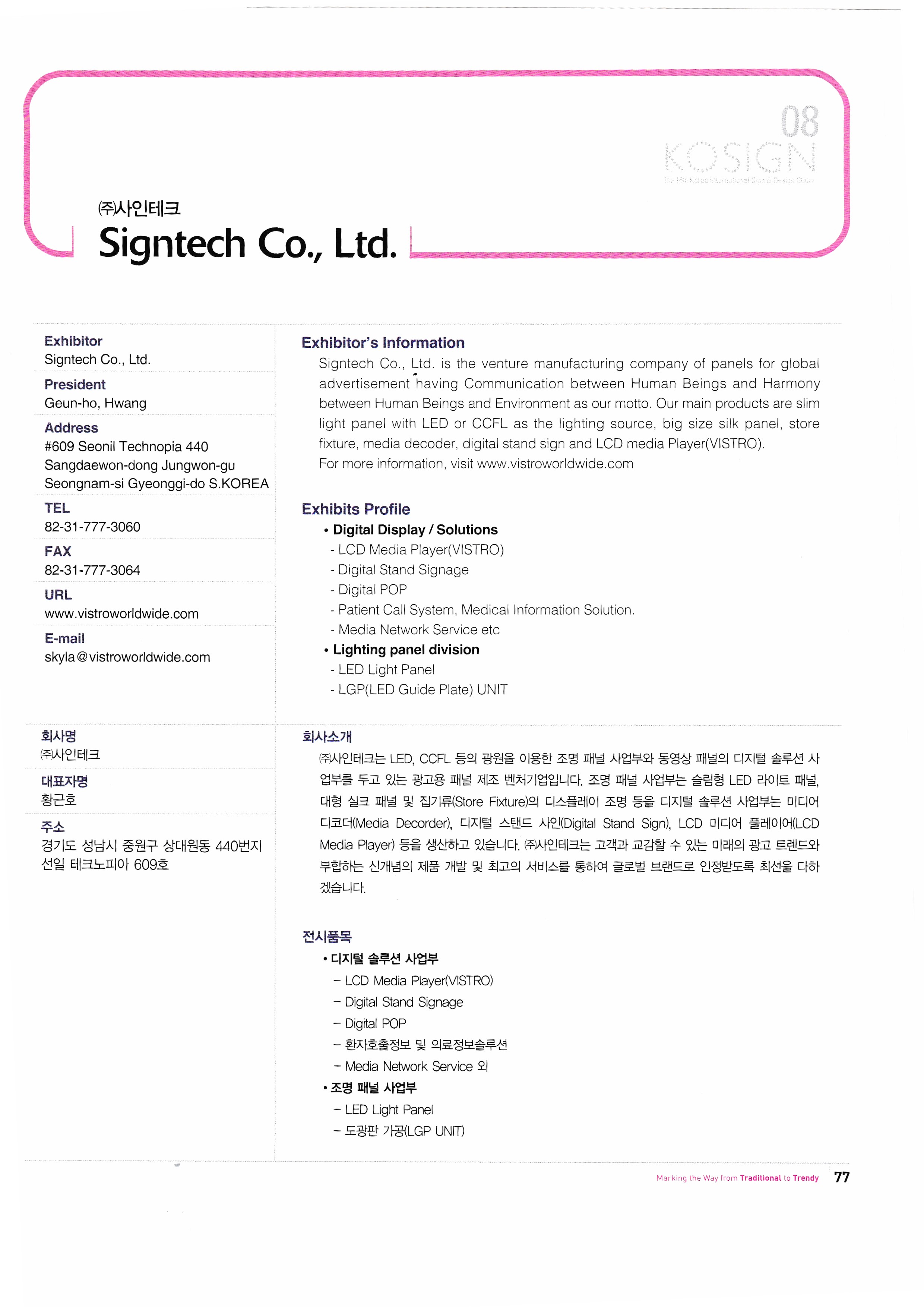 | 빛샘전자㈜ ㈜사인테크 ㈜사인파크21 삼우하이테크 생각하는 채널 ㈜서경테크 ㈜서홍알이에프 ㈜선진플러스 ㈜소입 ㈜스타플렉스 신우 NC테크 신화기획 ㈜신화테크 싸인투 ㈜씨앤피시스템 아이기획 ㈜아이닉스 ㈜아이딘 아이비전 ㈜아이피엔아이 ㈜아진엔지니어링 아프로 ㈜아트사인 ㈜알지비테크놀러지 알투알 ㈜에드알스 ㈜에스앤에이치테크놀러지 ㈜에스엠미디어그룸 ㈜에스엠시 ㈜에이치알티 에이비라이트 엔비즈상사 엔티에스 ㈜엠지아이 |
