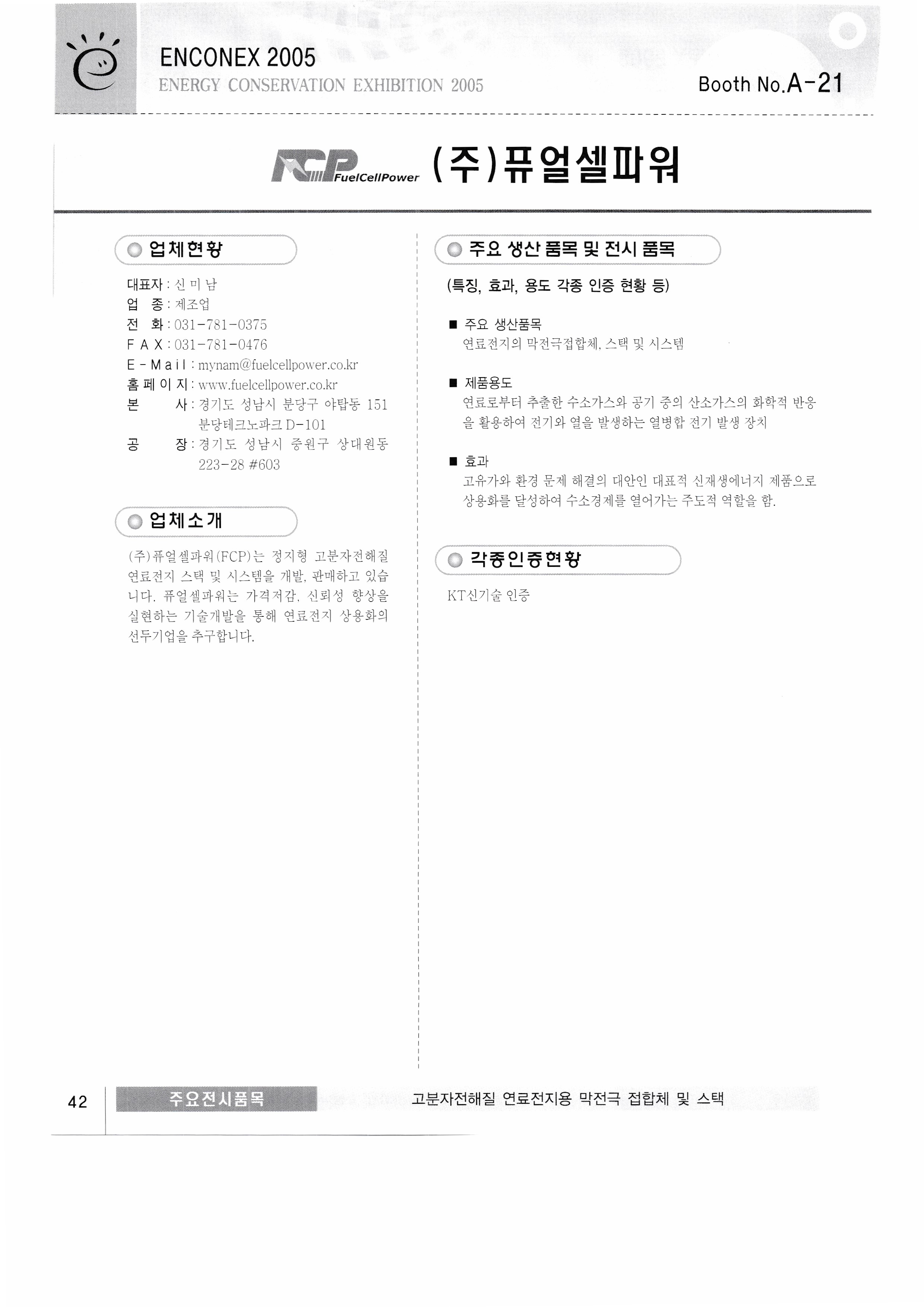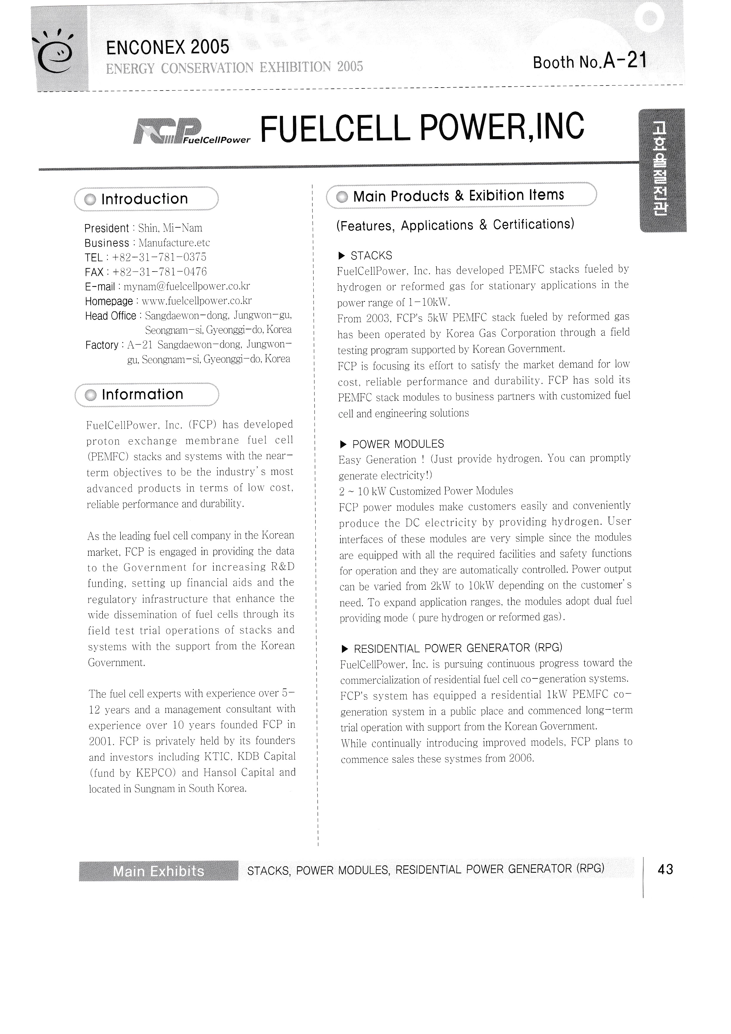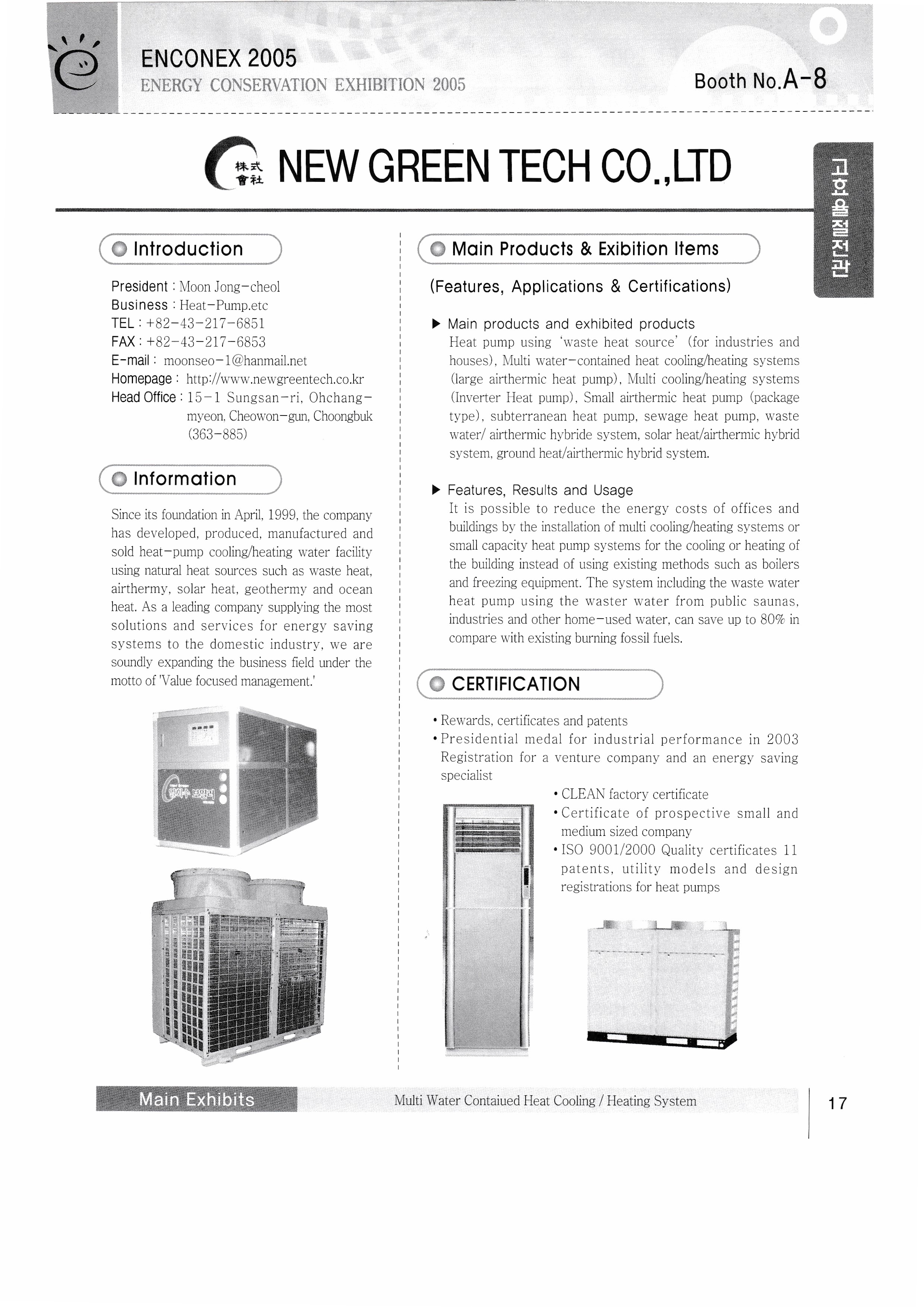 New Green Tech Co., Ltd. Samchully Co., Ltd. Dowon ENG Mansang Trading Co., Ltd. Easy Saver Sangdo Electric Industry Co., Ltd. Happy Global Co., Ltd. Hyundai Heavy Industries Sekwang Enertech Korea Grunforce Pump Co., Ltd. Douk Co., Ltd. Kumho Electric Co., Ltd. Aprus Co., Ltd. Fuel Cell Power Co., Ltd. Miim International Co., Ltd. Cochip Co., Ltd. MIT Enterprise Co., Ltd. MDE Degentrale Energy System Co., Ltd./Hana International (Sales and Technical Support Center) Kenertech LINDENBRG-ANLAGEN GMBH |