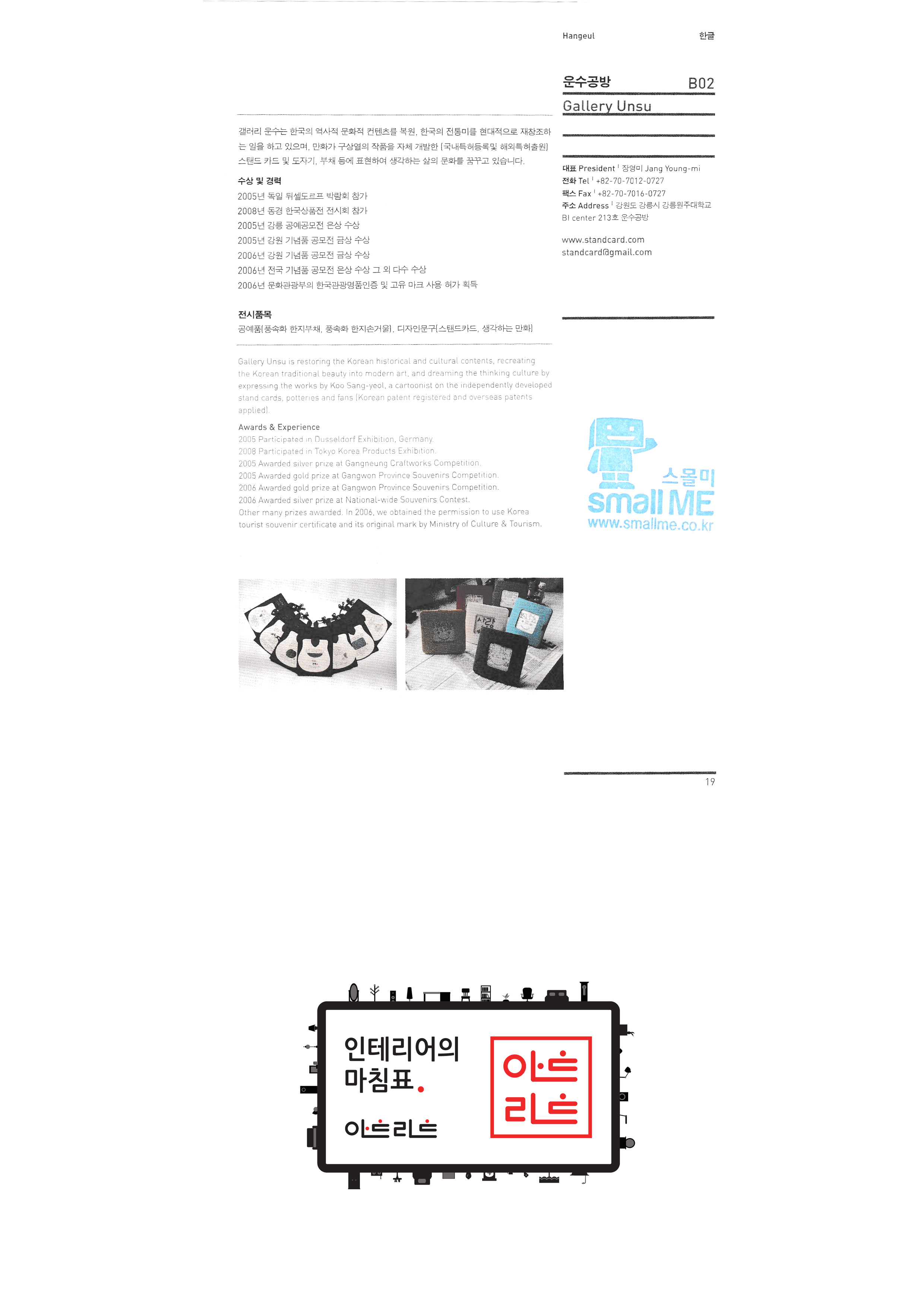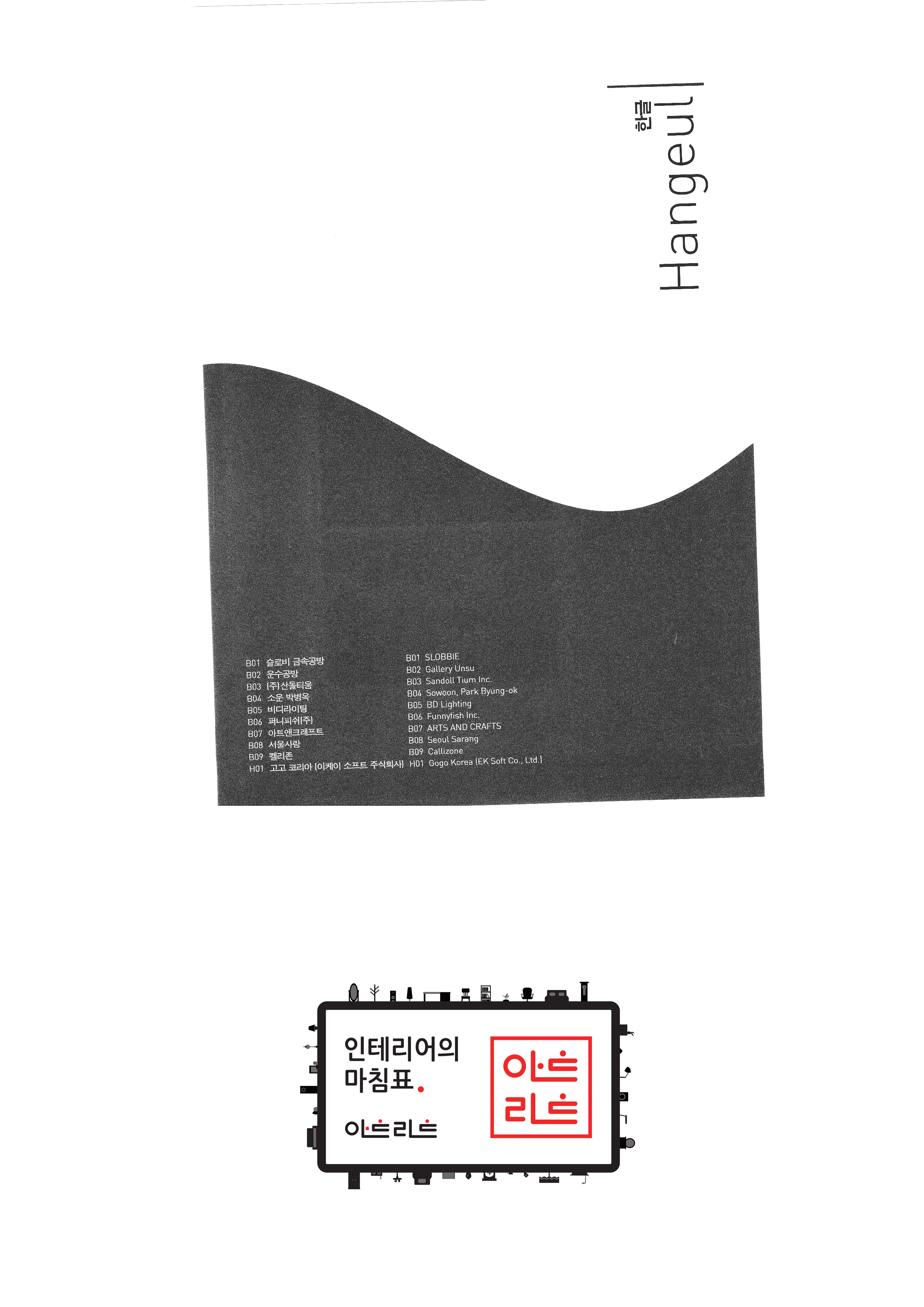 Taller de metales Slobi Taller de transporte Sandoltium Co., Ltd. Soun Park Byung-ok Iluminación de video Funny Fish Co., Ltd. Arte y artesanía Seúl amor Calizon "Gogo Corea (K Soft Co., Ltd.) " Escuela de Posgrado de Industria de la Universidad Nacional de Tecnología de Seúl Asociación de Promoción de Licores Tradicionales de Corea Gyodong CM "Salvando nuestro pueblo rural Red conjunta (inglés) " Consejo Coreano de Desarrollo de Alimentos de Jeonju Asociación Agrícola Corporación Ido Salón familiar Crecimiento provechoso para ambas partes con Farming Association Sangwoonyo Cerámica de una piedra |