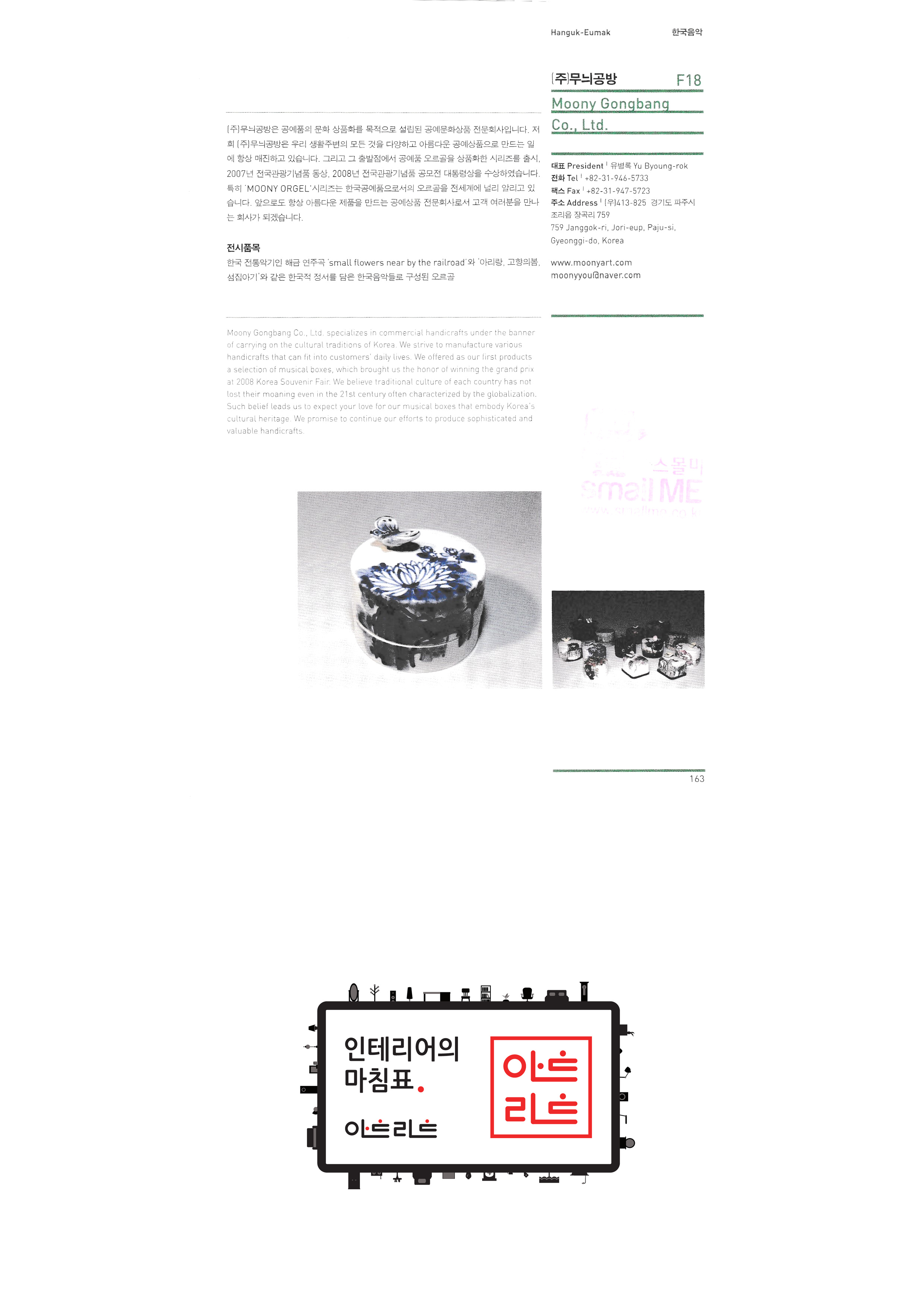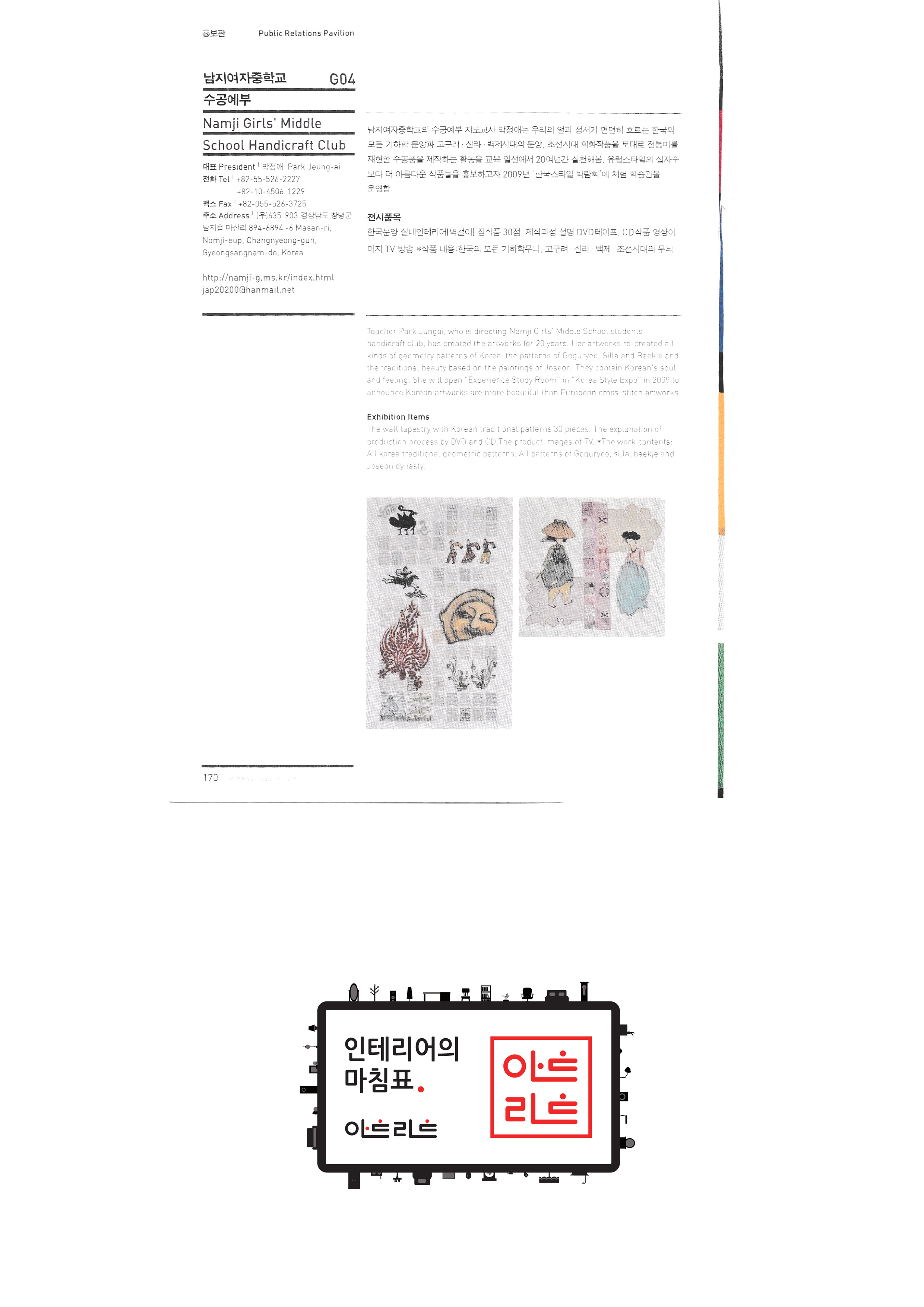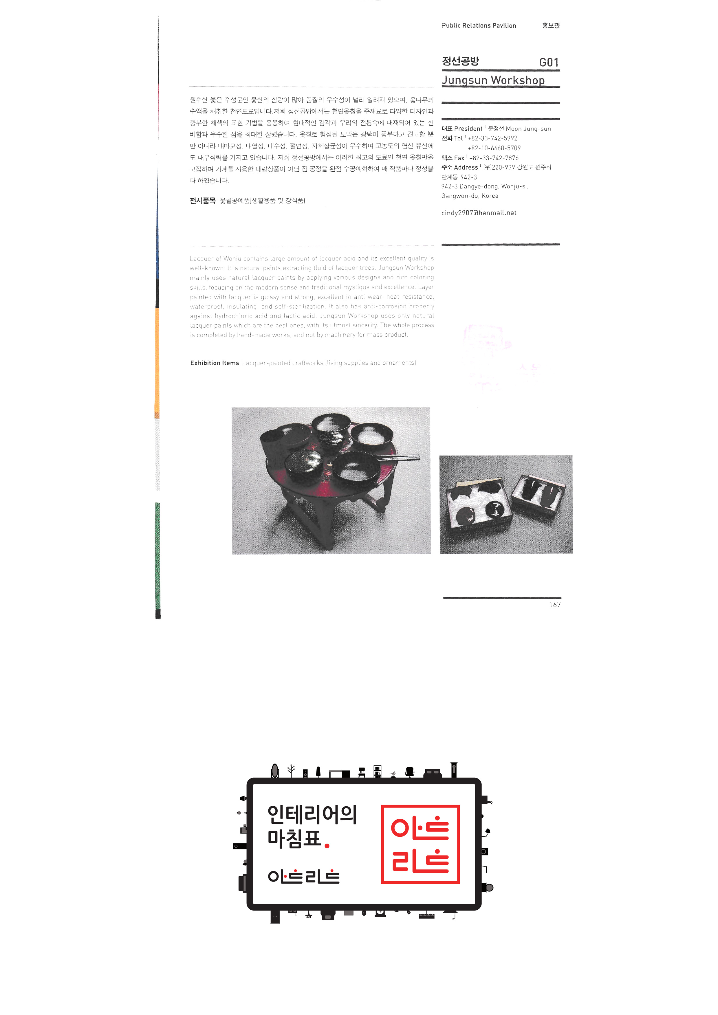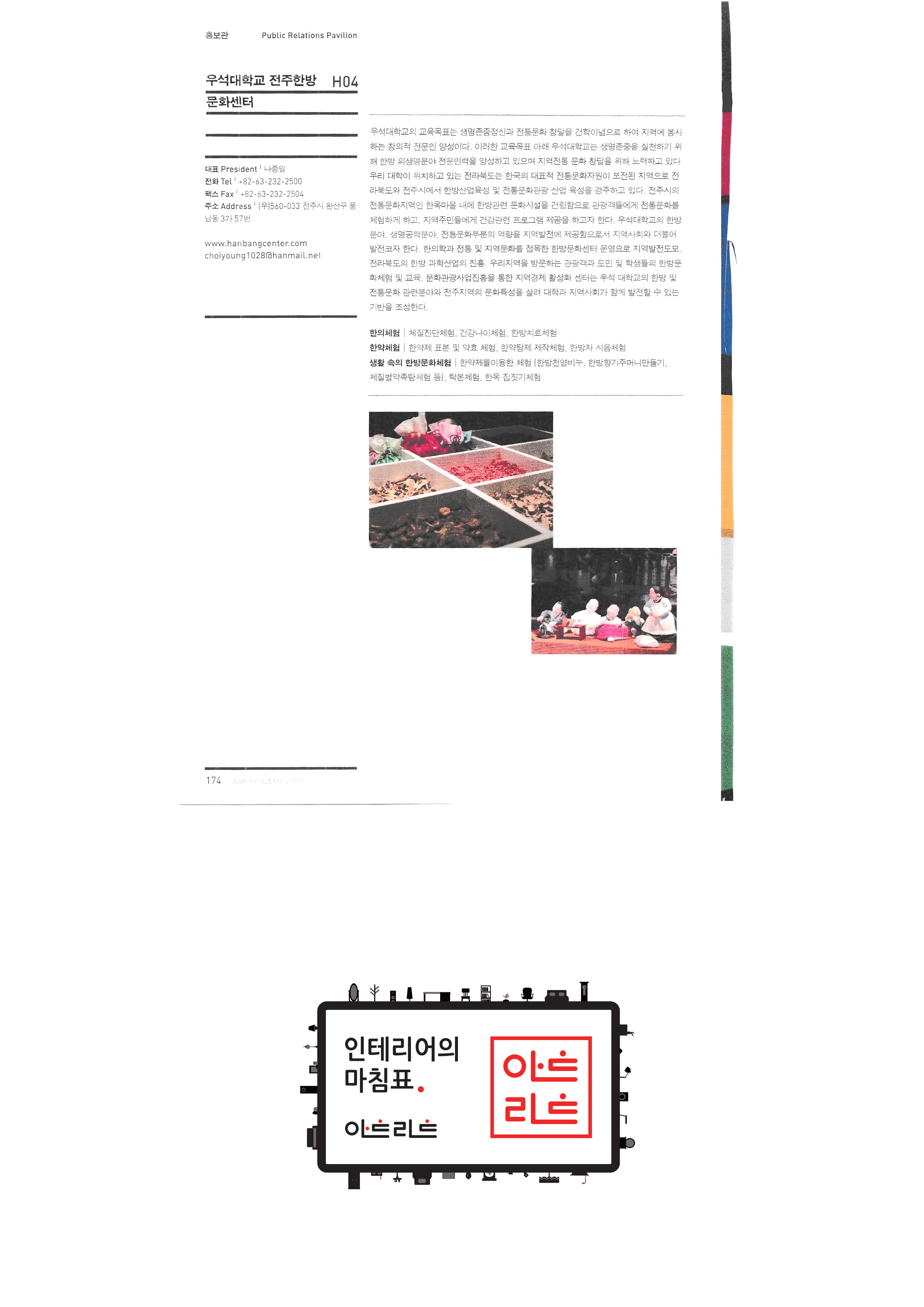 | 국악춘추사 우륵국악기연구원 김천고려농악기사 ㈜무늬공방 전주시 정선공방 얼쑤 예림공방 남지여자중학교 수공예부 (재)산청한방약초연구소 푸드미학 '월간외식경영' 전라남도 우석대학교 전주한방 문화센터 나비한의원 "동의대학교 한(韓) 패션사업단" 경상북도 안동시 |