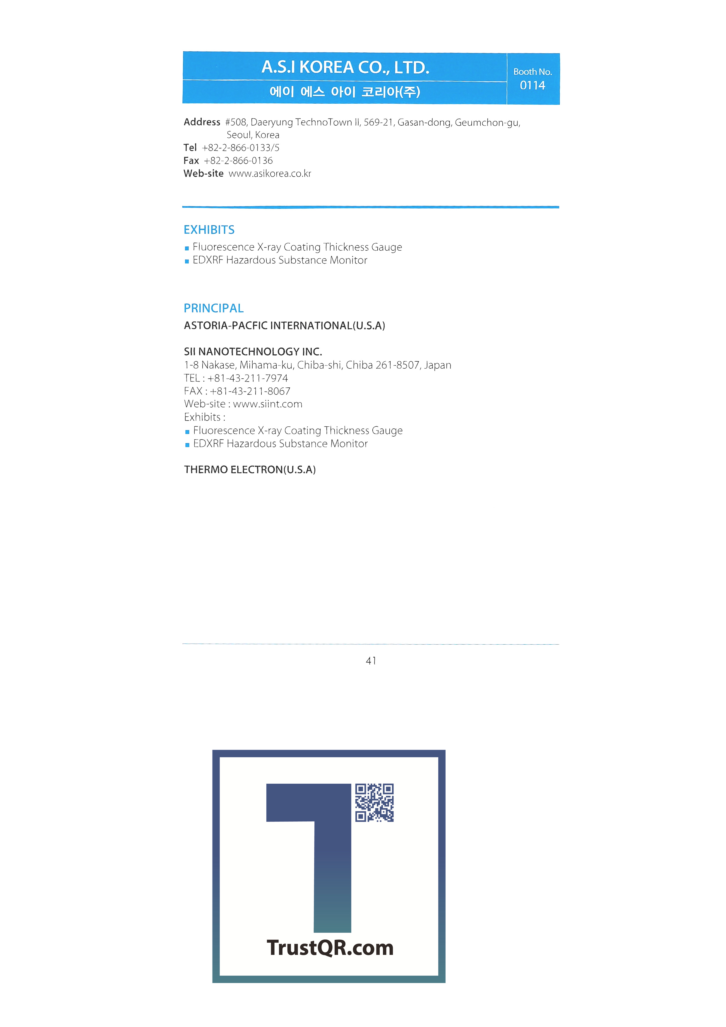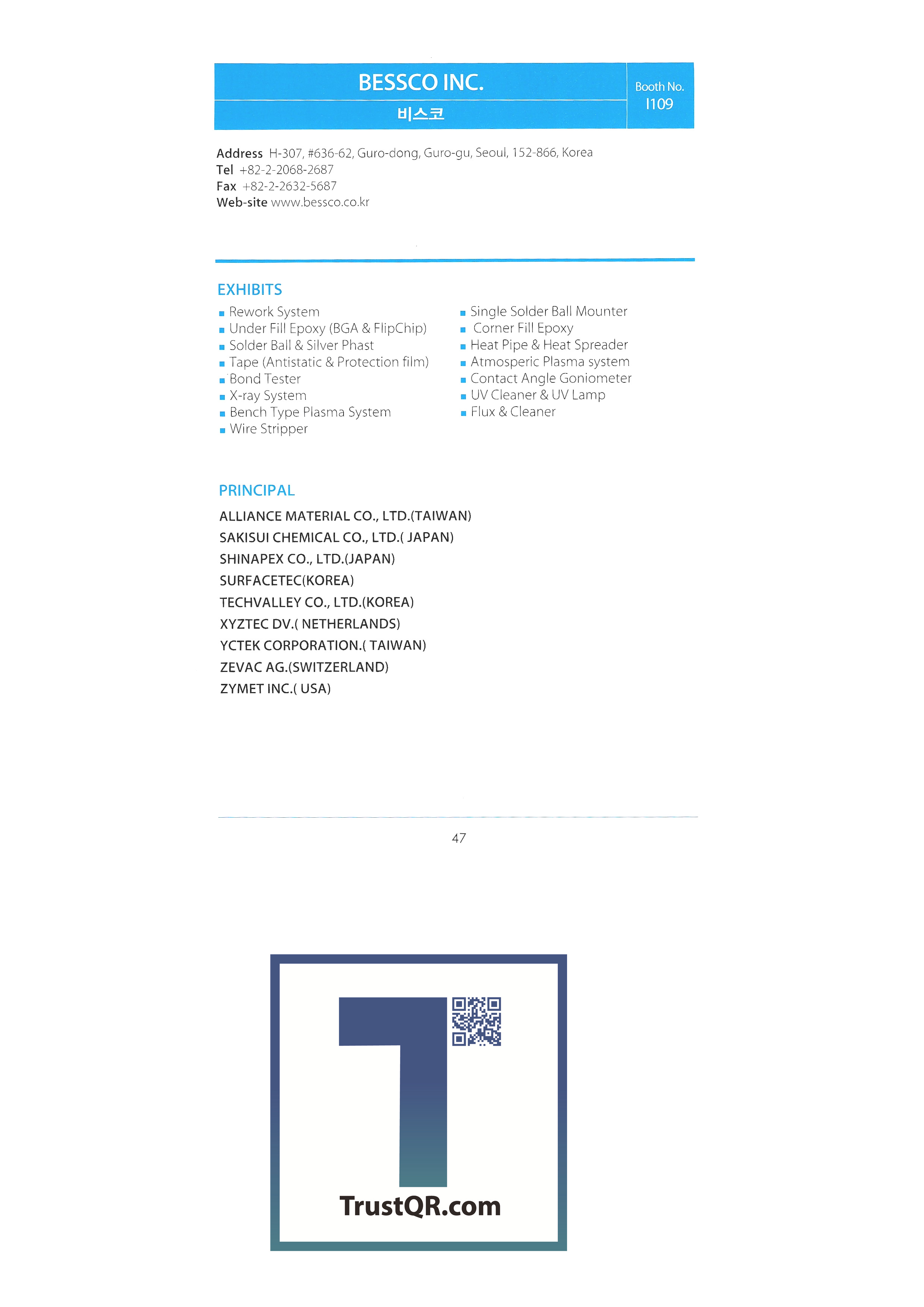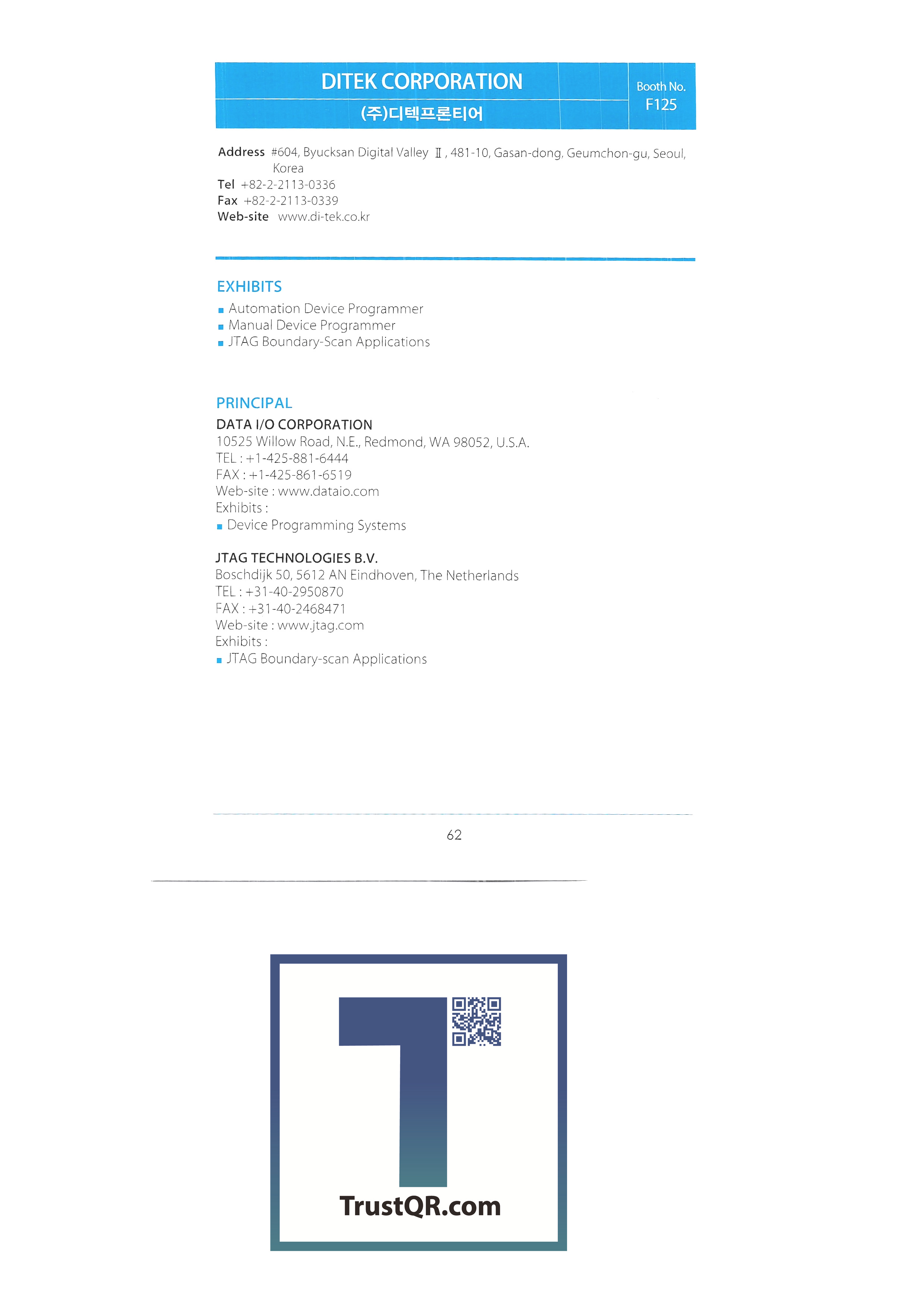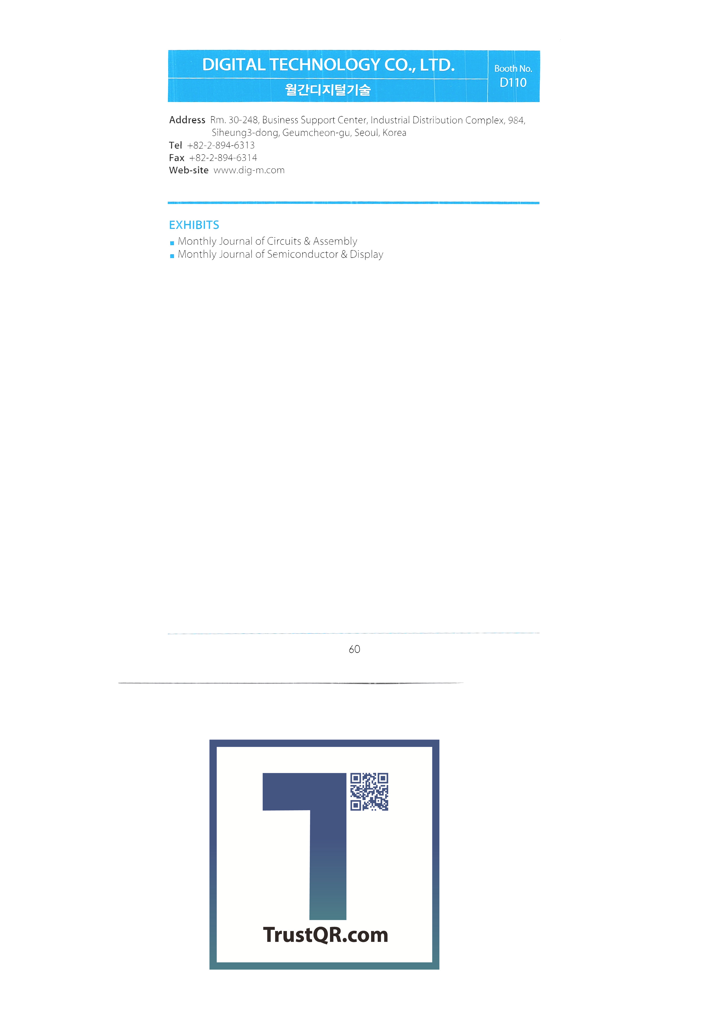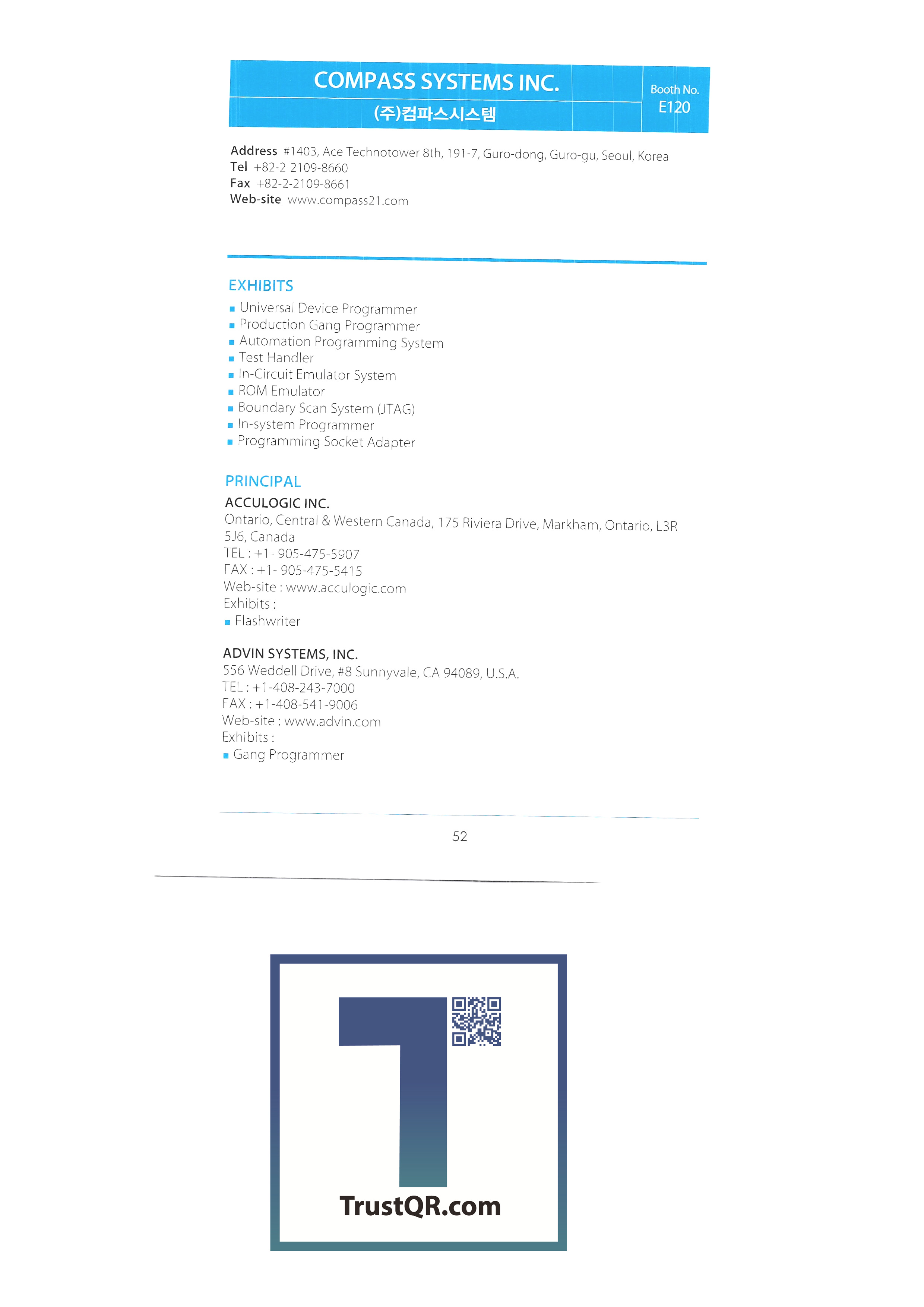 | 에이비씨 엔터프라이즈㈜ 에이블 에이아이코퍼레이션 아주휴미콘상사 ㈜알파로보틱스 AMCATRON TECHNOLOGY CO.,LTD ㈜에이엔아이 ㈜오토씨에프티 백마무역 반석정밀공업㈜ ㈜비.비.아이 비스코 한국본코트㈜ CAPTAIN INC ㈜첨단 CHYUN YIH ㈜컴파스시스템 ㈜컨버전스미디어 대한리드전자 ㈜대성미크론 대화테크 ㈜단양솔텍 월간디지털기술 대인디테크 ㈜디텍프론티어 |