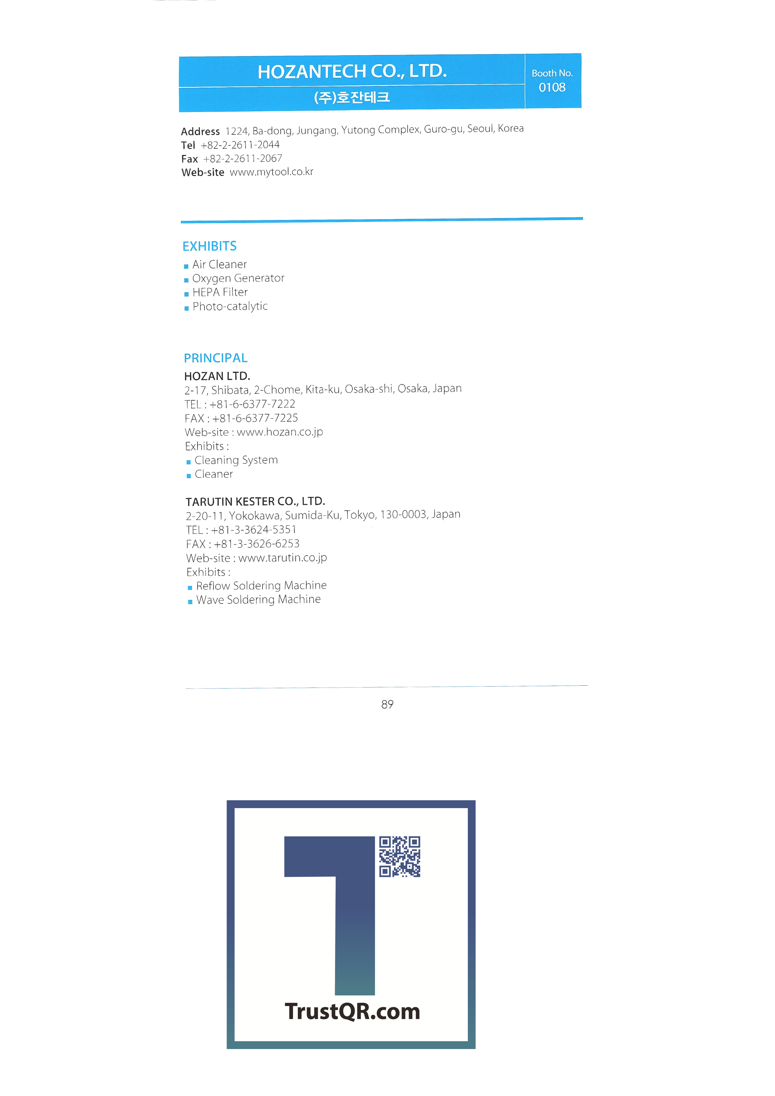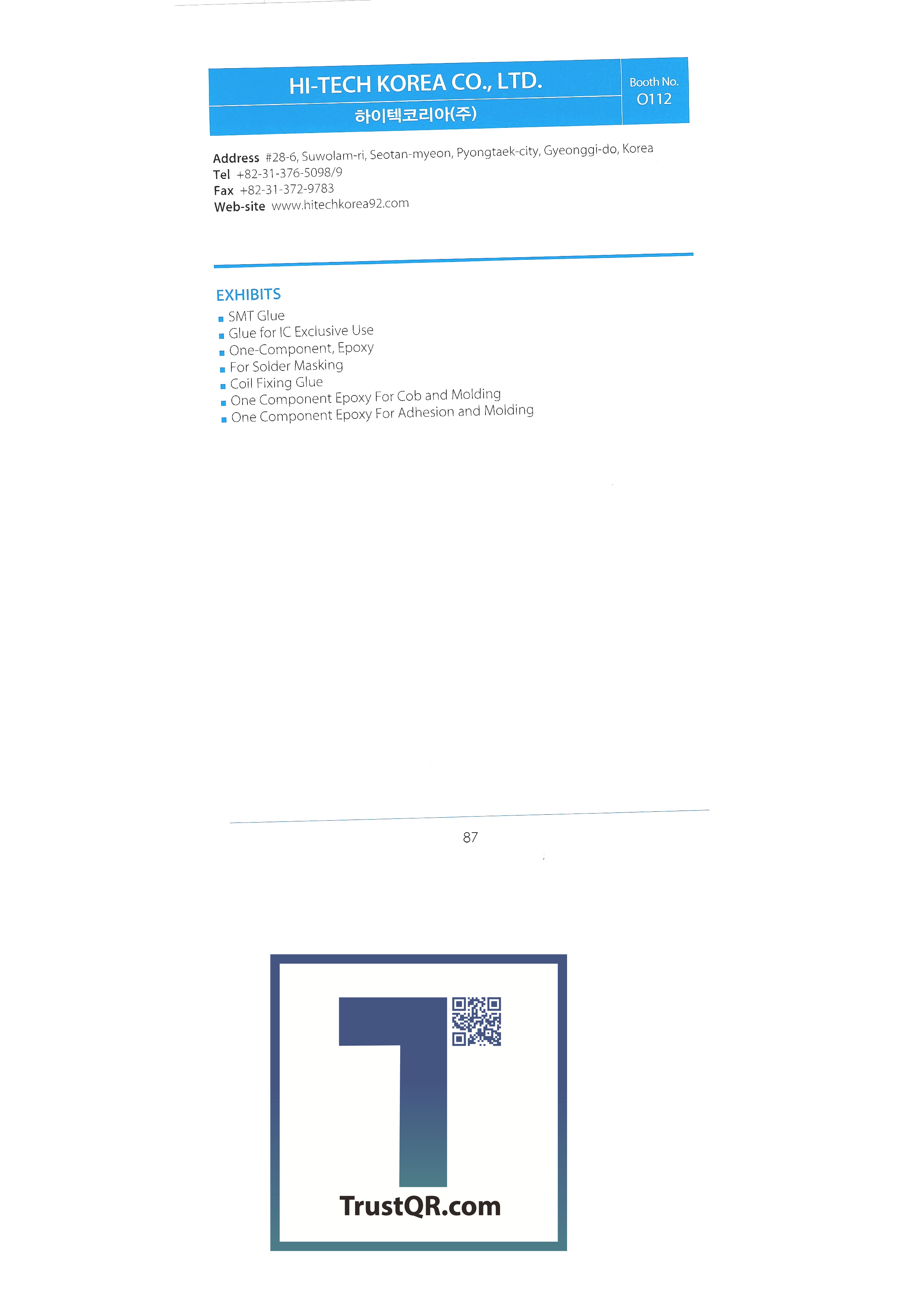 | 도미노코리아㈜ ㈜동서하이테크 ㈜에코조인 EDN/EM ASIA 이에프디㈜ ㈜엘렉시스 ㈜기술정보 이에스텍 ㈜은일 ㈜파맥스 ㈜화인솔루션 파운드포 좋은예감 경림엔지니어링㈜ 해미오토메이션 한주에스엘티㈜ ㈜한국무라가미 핼러코리아㈜ 헨켈코리아㈜ 한국헨켈록타이트 유한회사 히타치건기화인테크㈜ 히이텍코리아㈜ 하이텍교역㈜ ㈜호잔테크 휴먼텍 휴트론 ㈜현대이엔지 ㈜아이앤지플러스 ㈜임프 ㈜아이엠피이씨 ㈜인포더 인-텍 써플라이 ㈜인터켐 코리아 ㈜아이피에스 시스템 ㈜제일 UV ㈜제이오텍 |