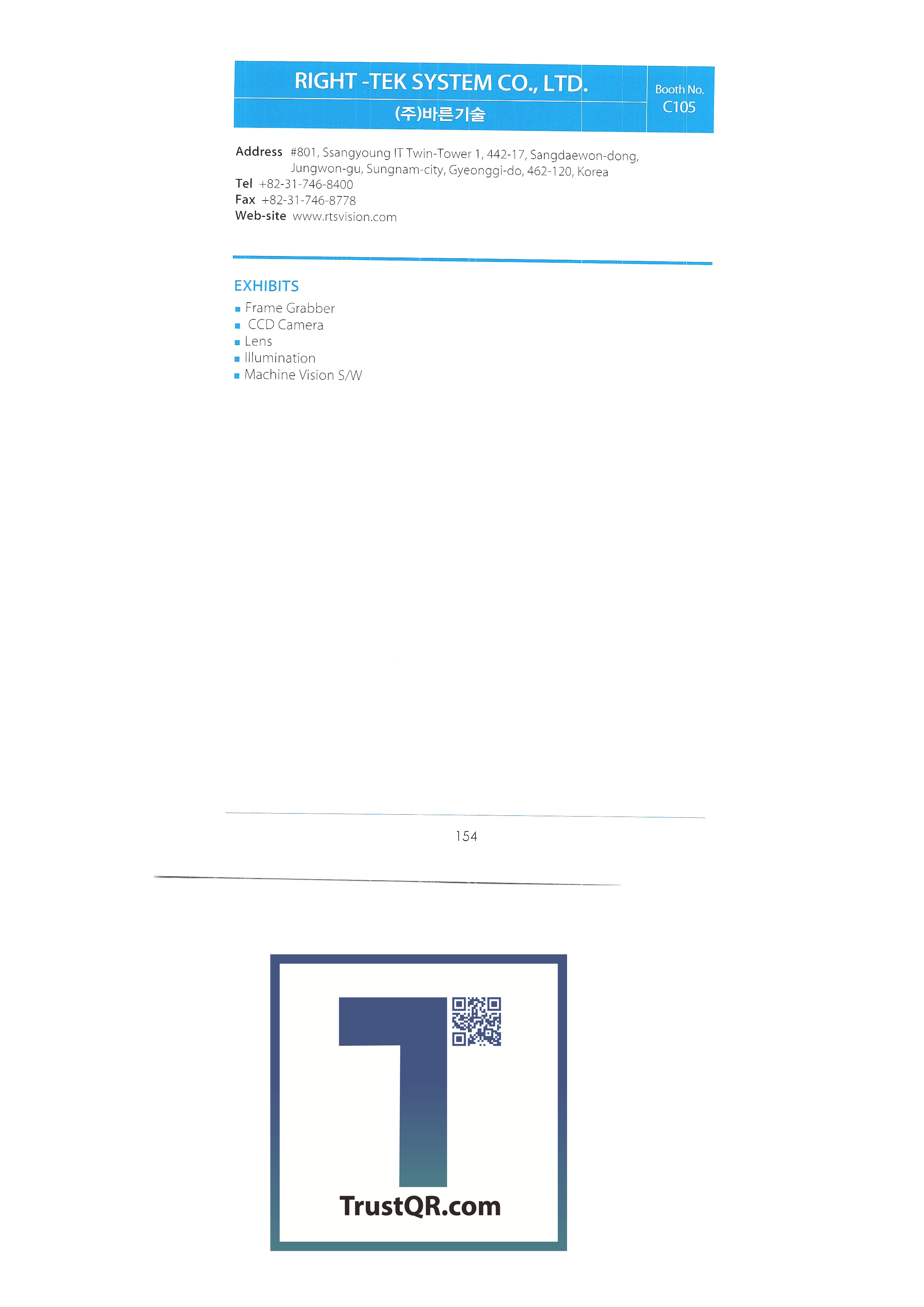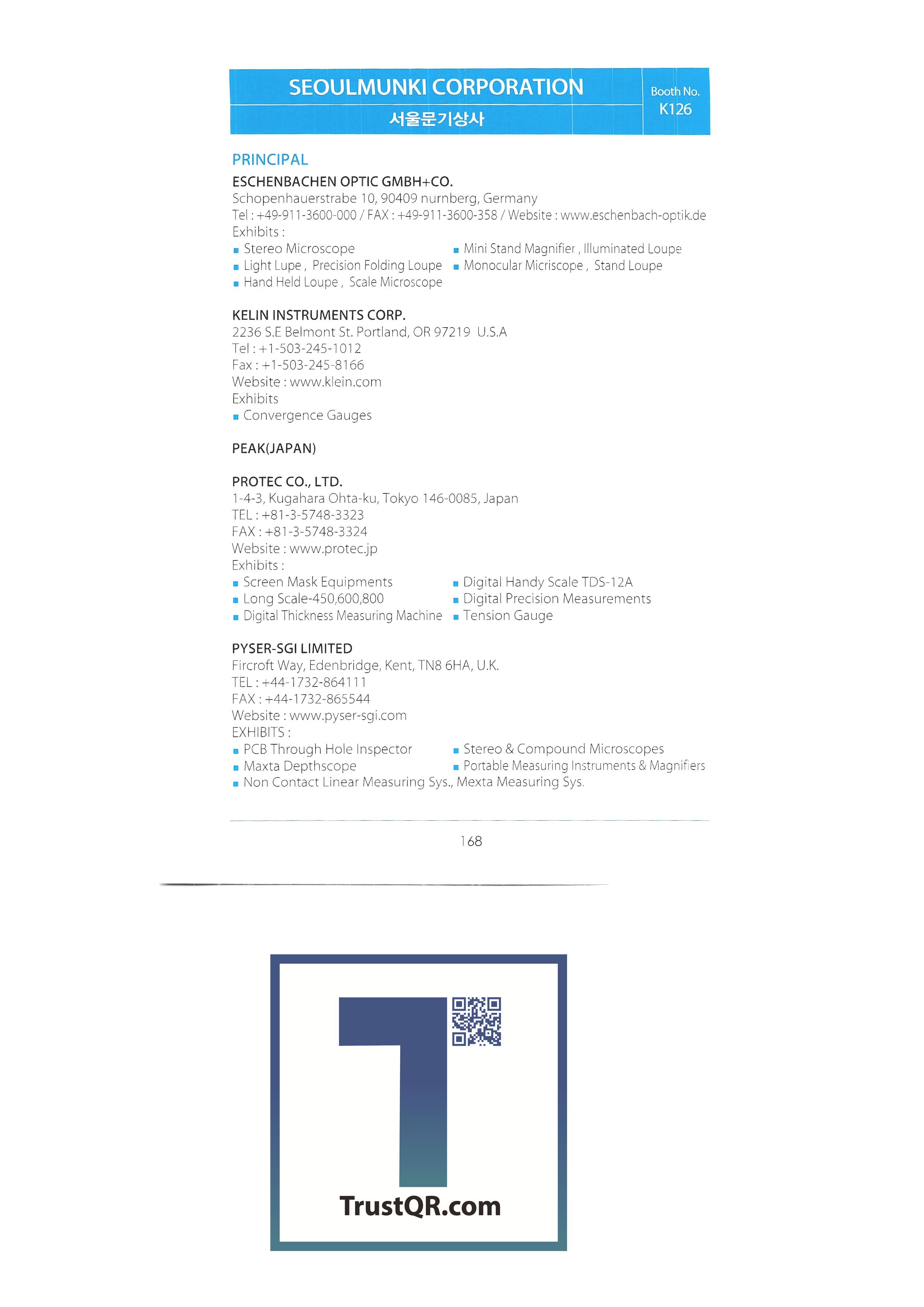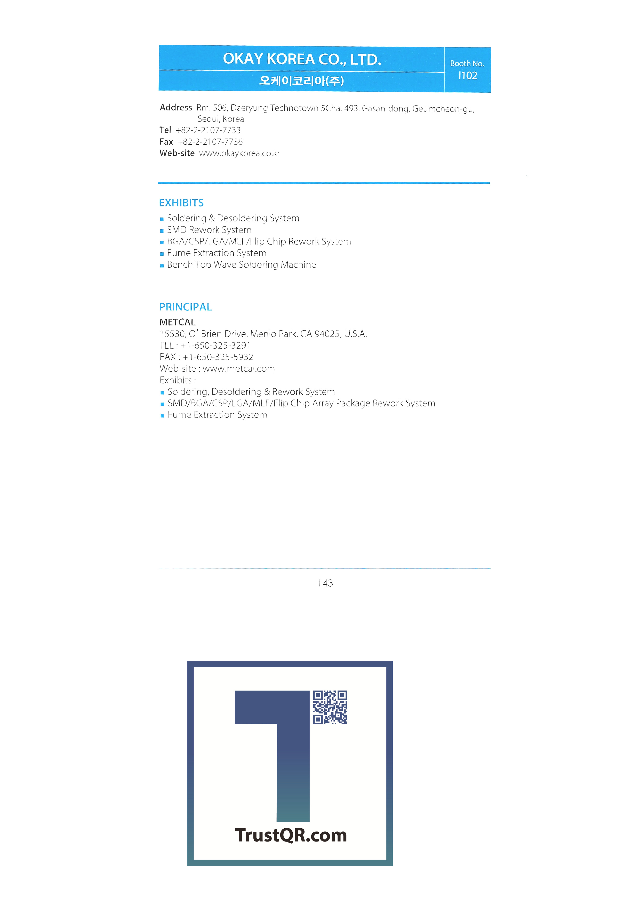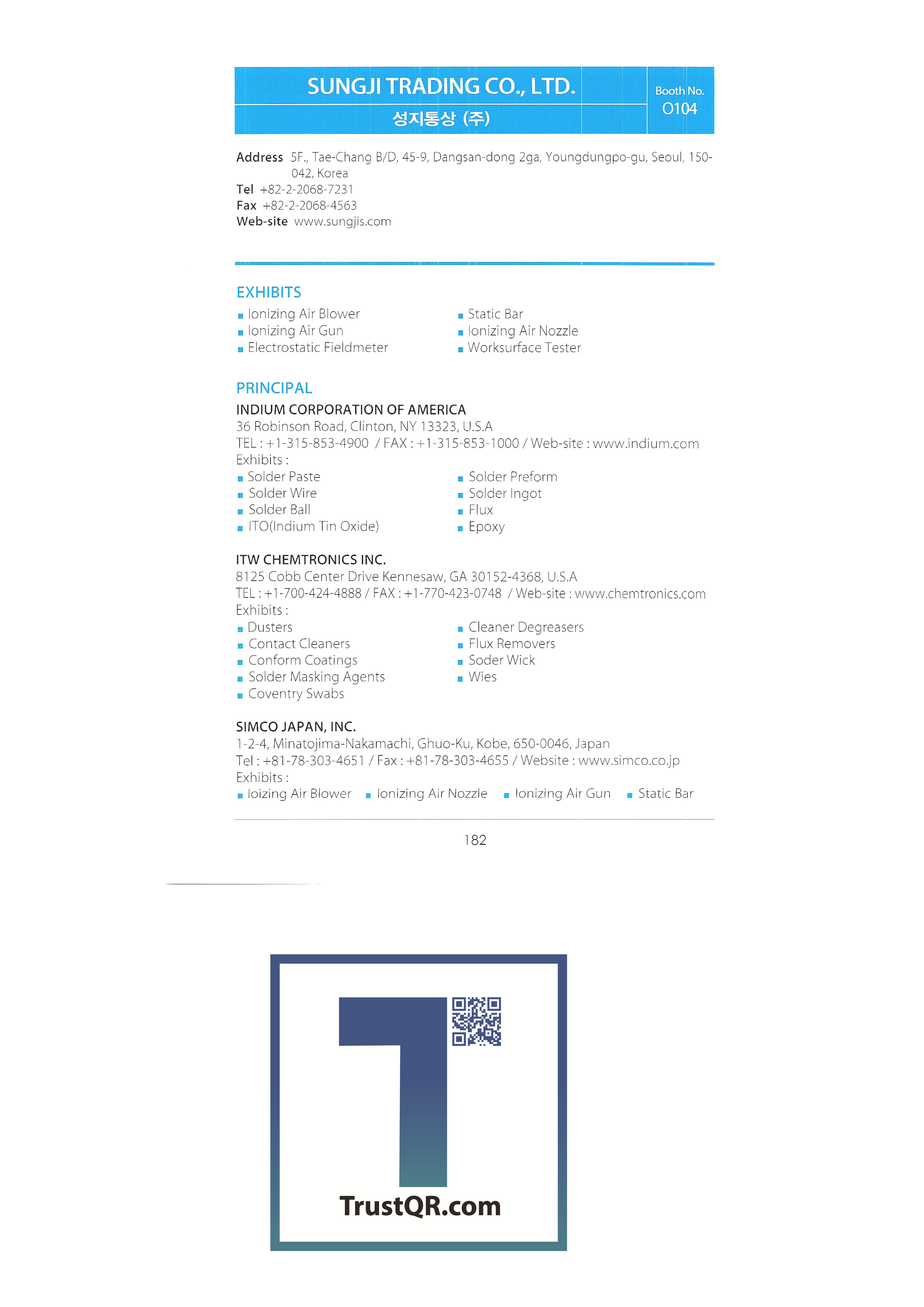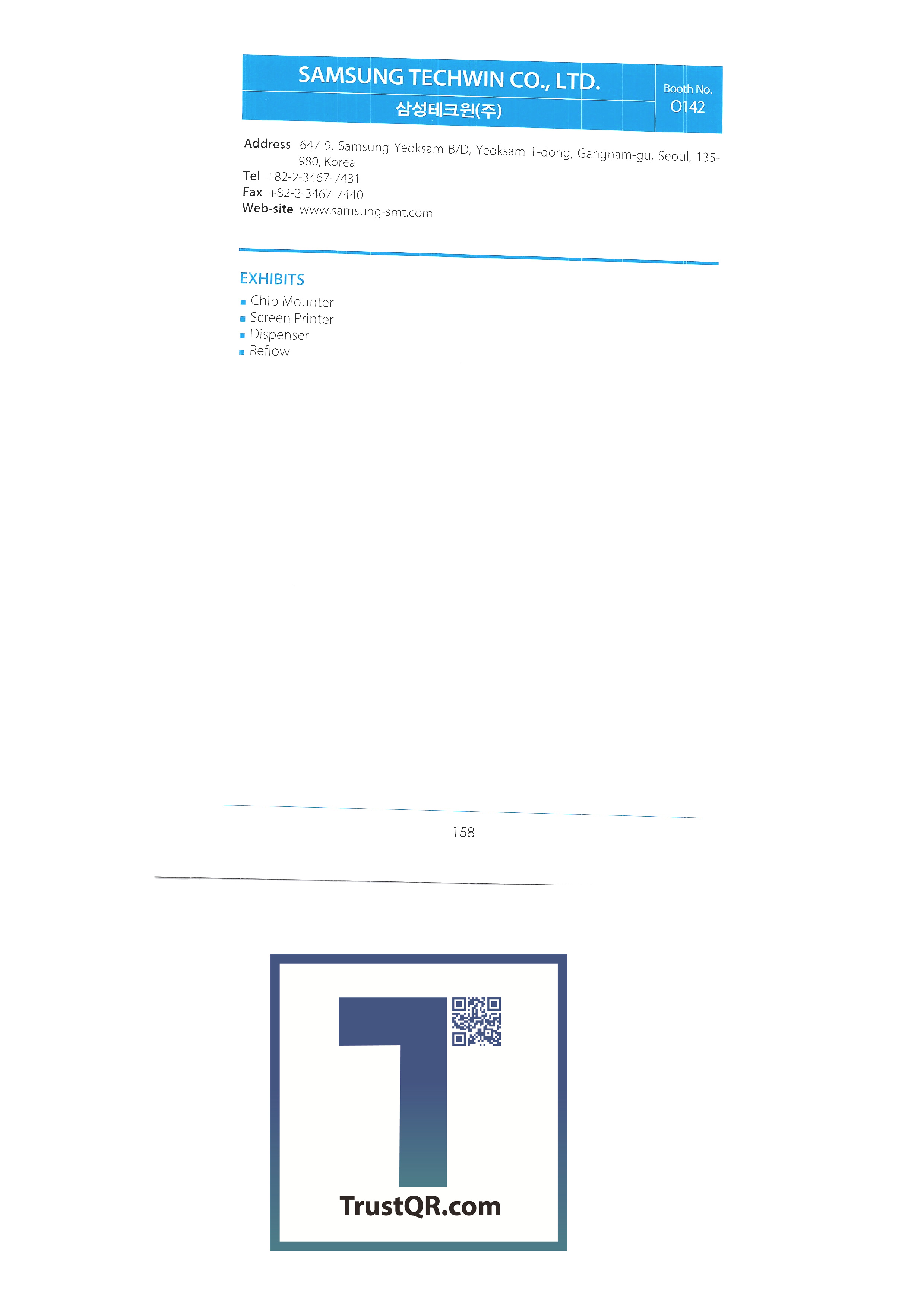 오케이코리아㈜ 오보텍한국지사 오티시㈜ ㈜파미 큰기술교역 프라임씨앤에스 ㈜프로텍 퀄맥스㈜ 퀵코리아 ㈜바른기술 세종산업㈜ SAKI CORPORATION 삼정이엔지 삼성테크윈㈜ SEAL KING IND.CO.,LTD ㈜쎄크 ㈜세일 하이텍 세일리코㈜ ㈜세명백트론 ㈜에스이오 서일이앤엠㈜ 서울문기상사 에스지 미디어 SHENMAO TECHNOLOGY INC 신명기전 에스제이 이노테크㈜ 에스엠씨 에스엠텍 ㈜에스엠티코리아 에스엔제이 코퍼레이션 ㈜솔나라 SOLAR PLUS COMPANY ㈜썸텍 성원교역㈜ 성지통상㈜ |