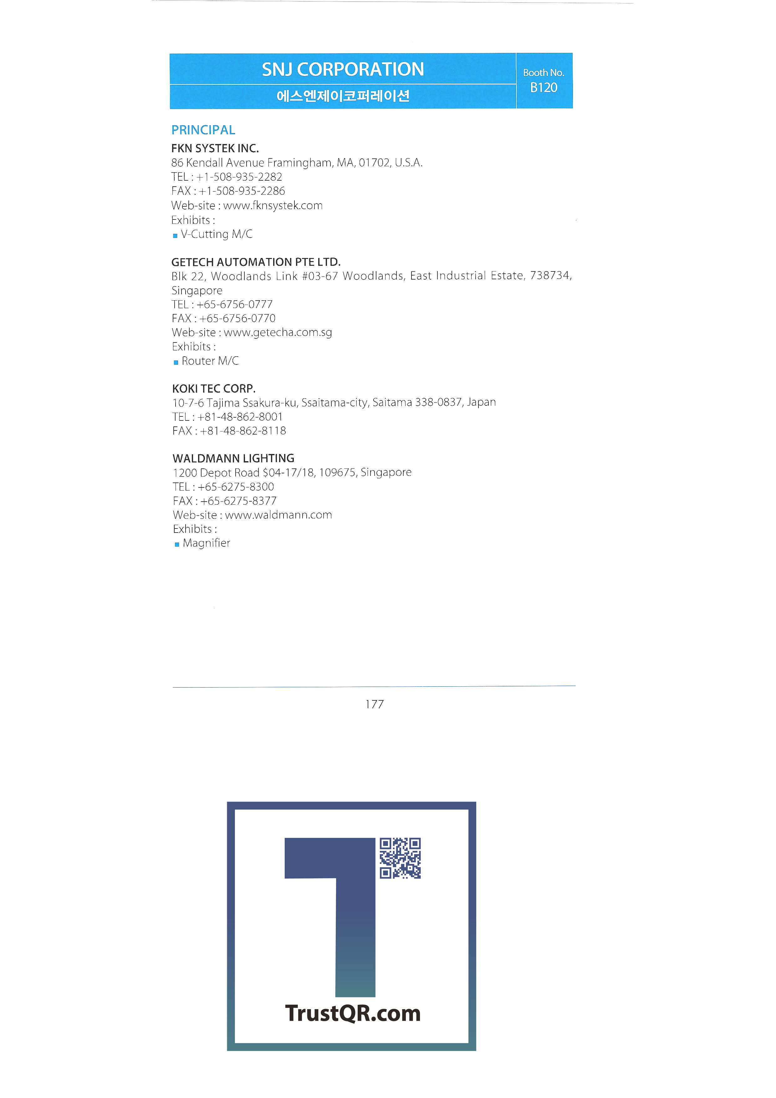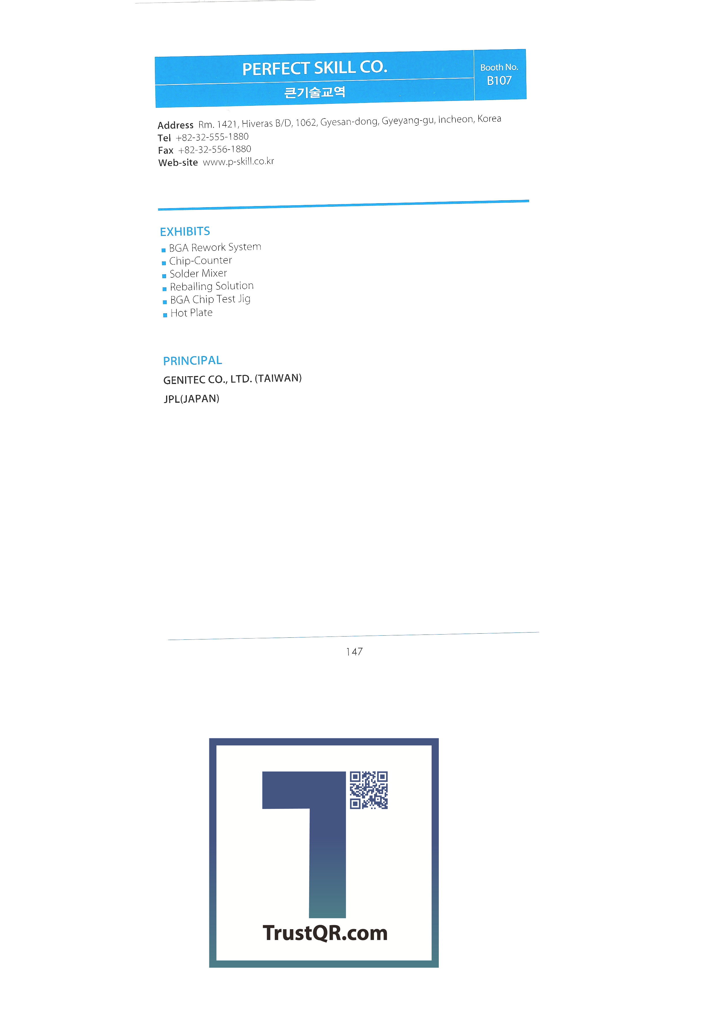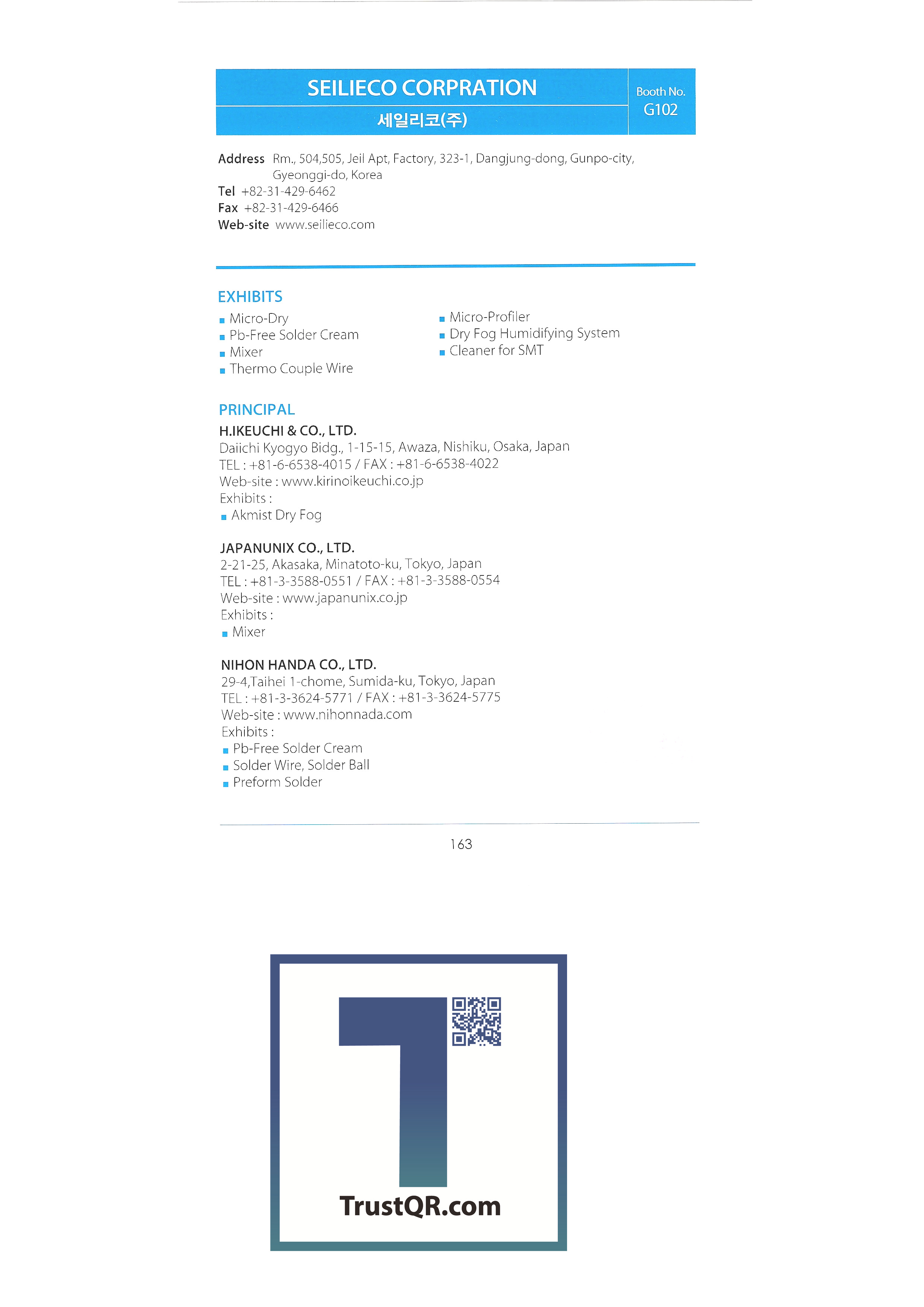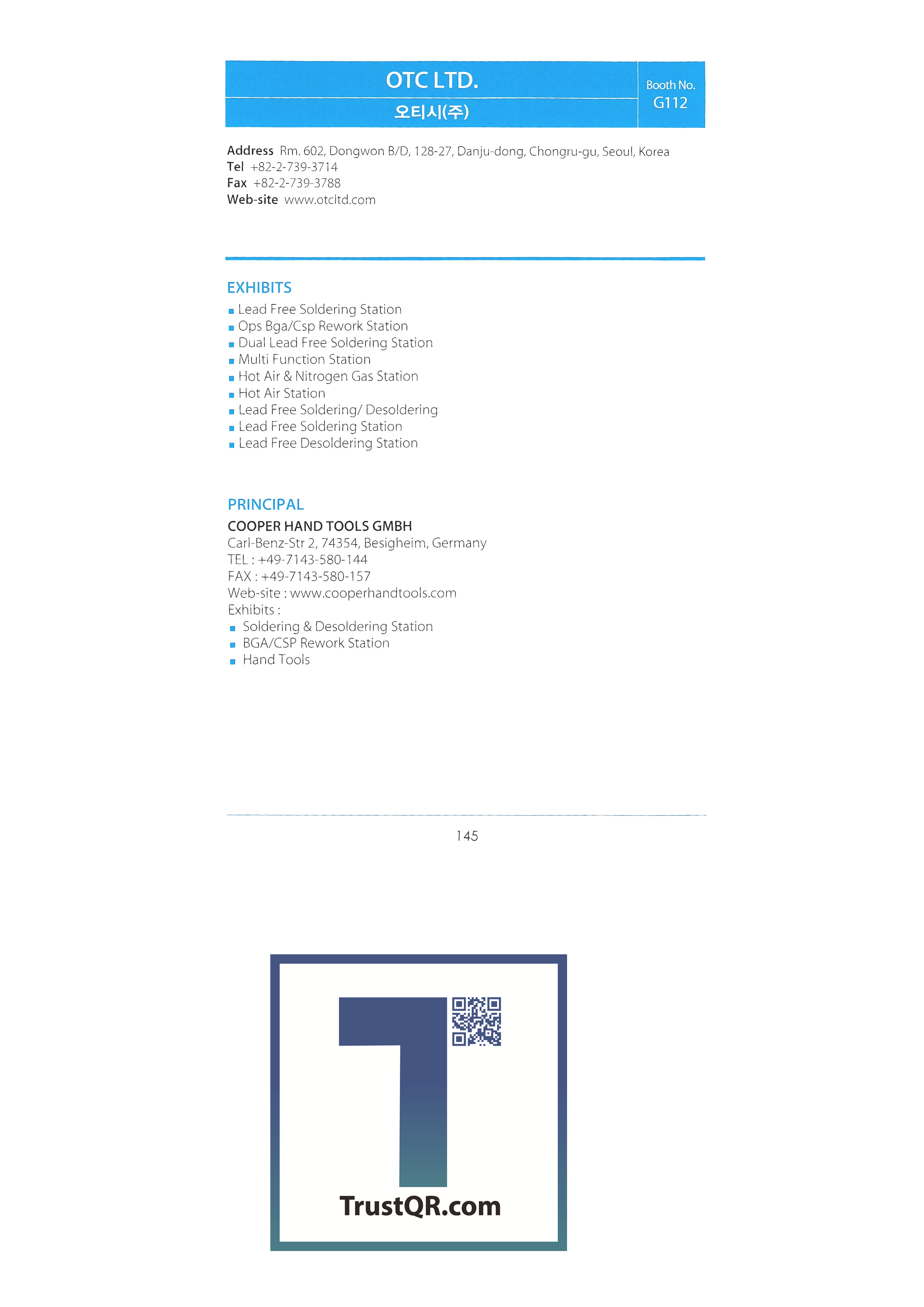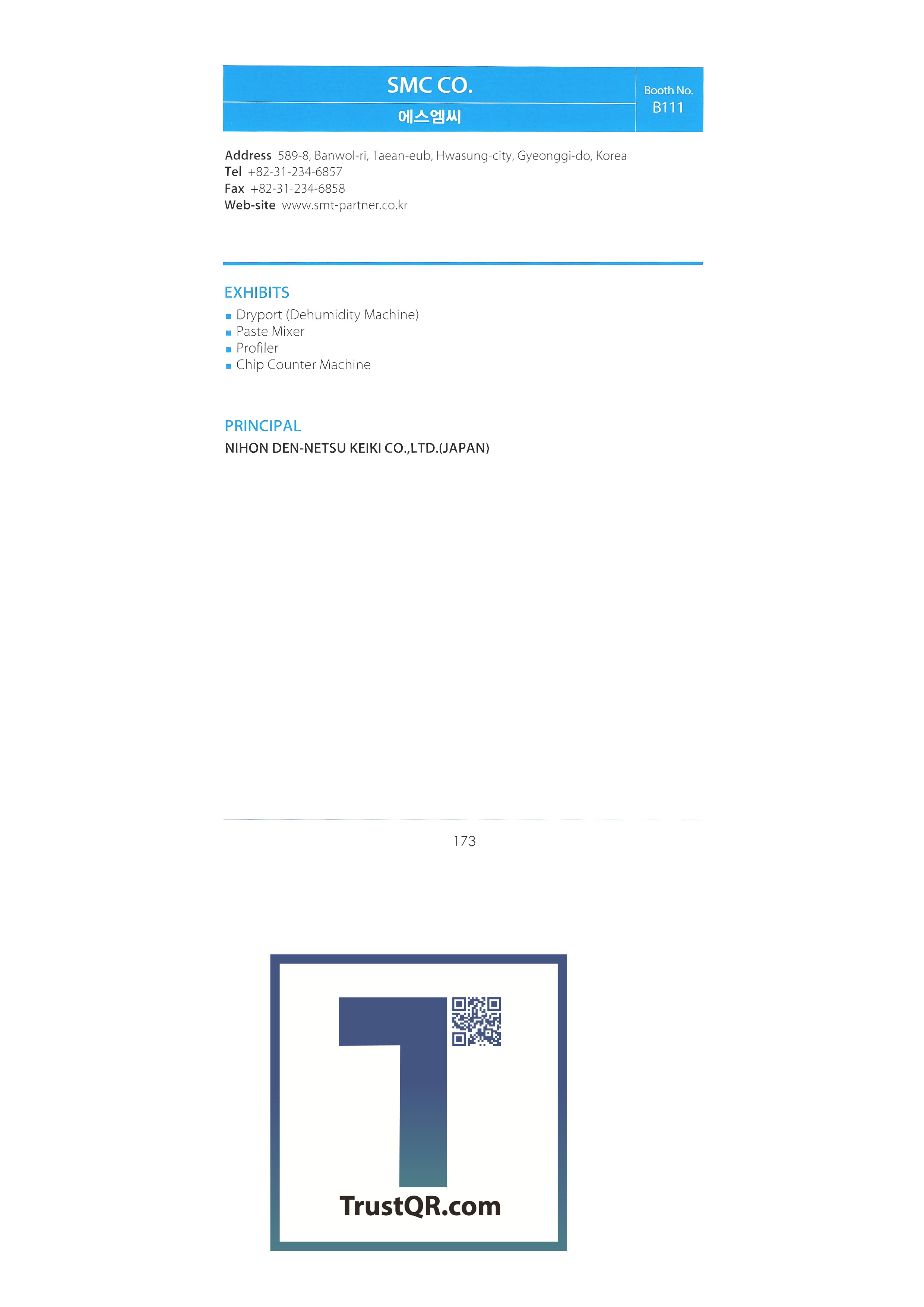 오케이코리아㈜ 오보텍한국지사 오티시㈜ ㈜파미 큰기술교역 프라임씨앤에스 ㈜프로텍 퀄맥스㈜ 퀵코리아 ㈜바른기술 세종산업㈜ SAKI CORPORATION 삼정이엔지 삼성테크윈㈜ SEAL KING IND.CO.,LTD ㈜쎄크 ㈜세일 하이텍 세일리코㈜ ㈜세명백트론 ㈜에스이오 서일이앤엠㈜ 서울문기상사 에스지 미디어 SHENMAO TECHNOLOGY INC 신명기전 에스제이 이노테크㈜ 에스엠씨 에스엠텍 ㈜에스엠티코리아 에스엔제이 코퍼레이션 ㈜솔나라 SOLAR PLUS COMPANY ㈜썸텍 성원교역㈜ 성지통상㈜ |