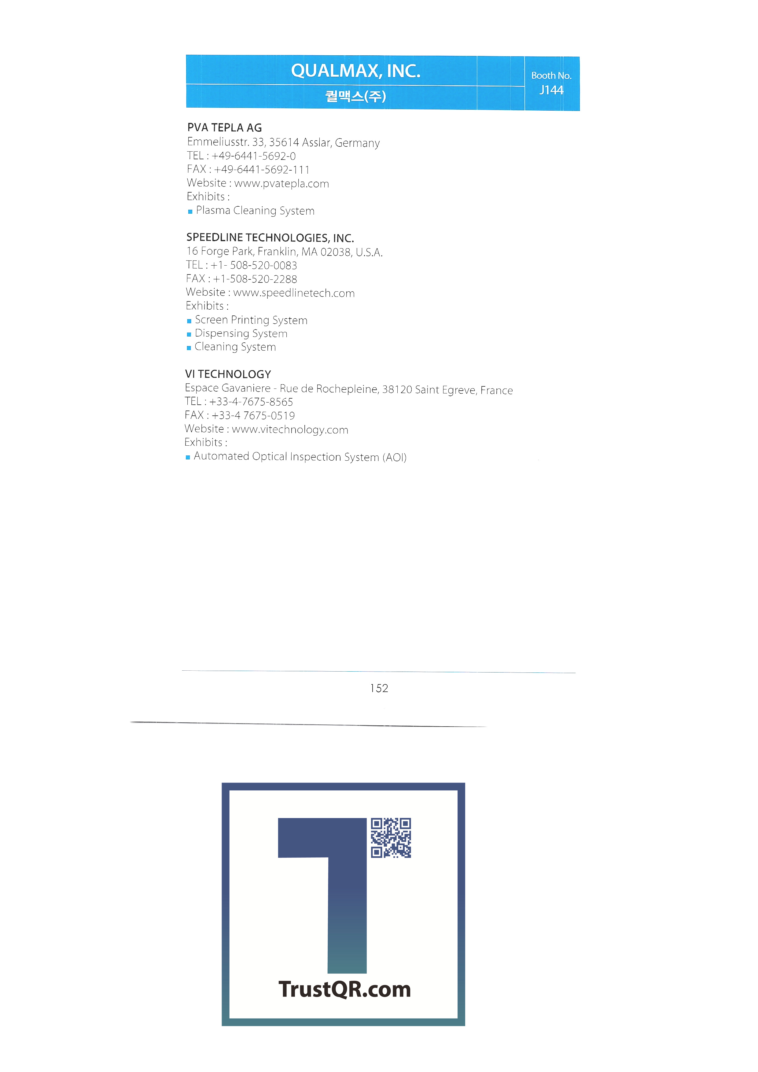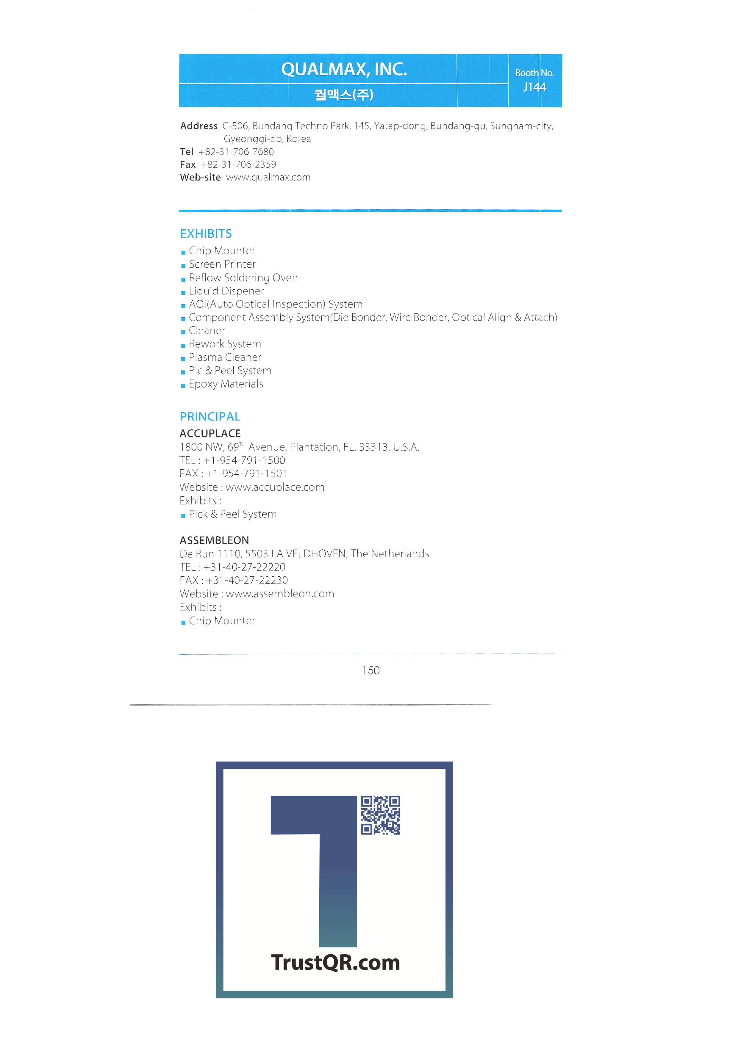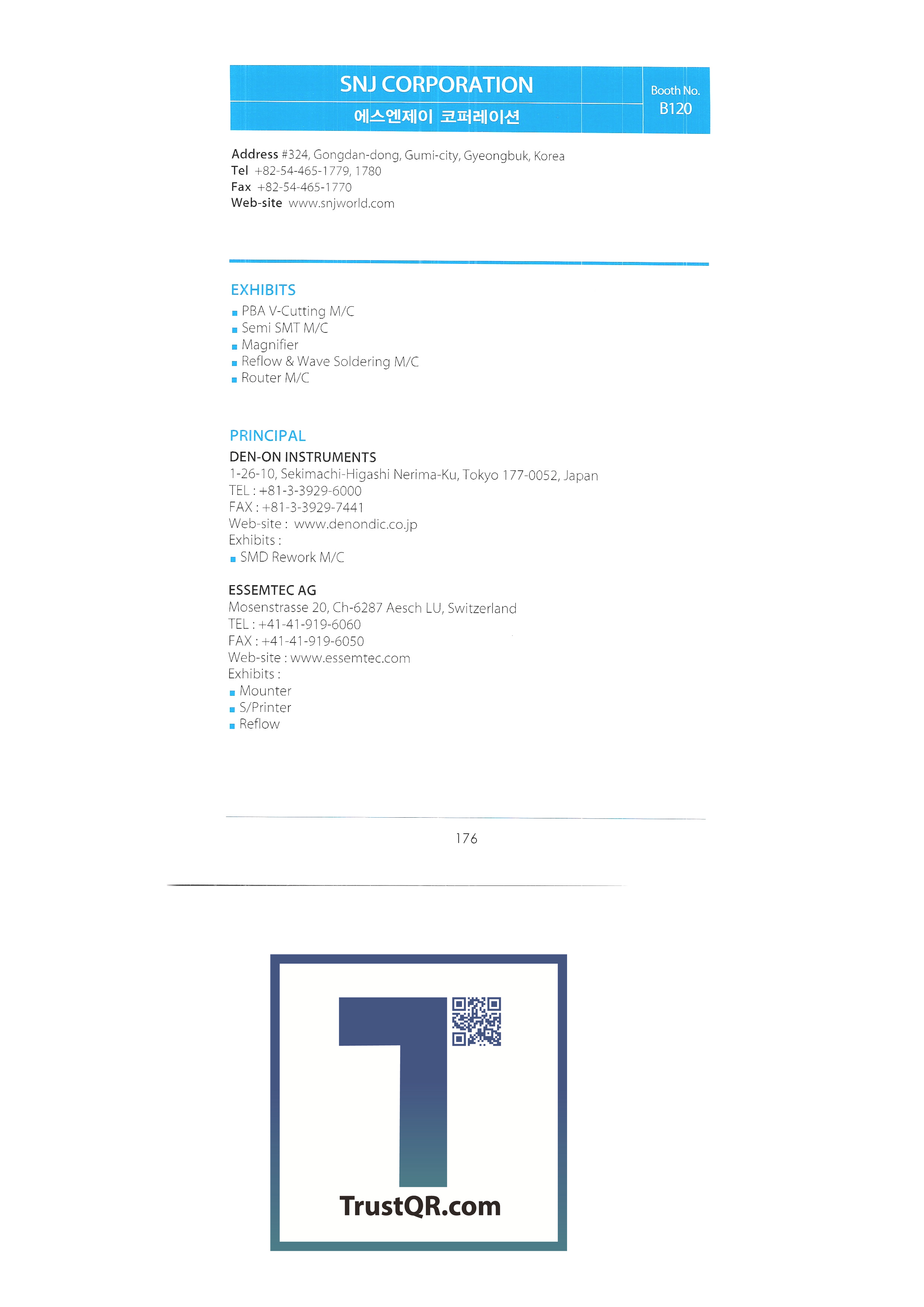 OK Korea Co., Ltd. Orbotech Korea Branch Otissi Co., Ltd. PAMI Co., Ltd. Big technology trade Prime C&S PROTEC Co., Ltd. Qualmax Co., Ltd. Quick Korea Barun Technology Sejong Industry Co., Ltd. SAKI CORPORATION Samjung ENG Samsung Techwin Co., Ltd. SEAL KING IND.CO.,LTD Seq Co., Ltd. Sail Hitech Co., Ltd. Selico Co., Ltd. Semyung Baektron Co., Ltd. SIO Co., Ltd. Seoil E&M Seoul Munki Corporation SG Media SHENMAO TECHNOLOGY INC Deuteronomy SJ Innotech SMC SM Tech SMT Korea S&J Corporation Solnara Co., Ltd. SOLAR PLUS COMPANY Sometech Sungwon Trading Co., Ltd. Sungji Trading Co., Ltd. |