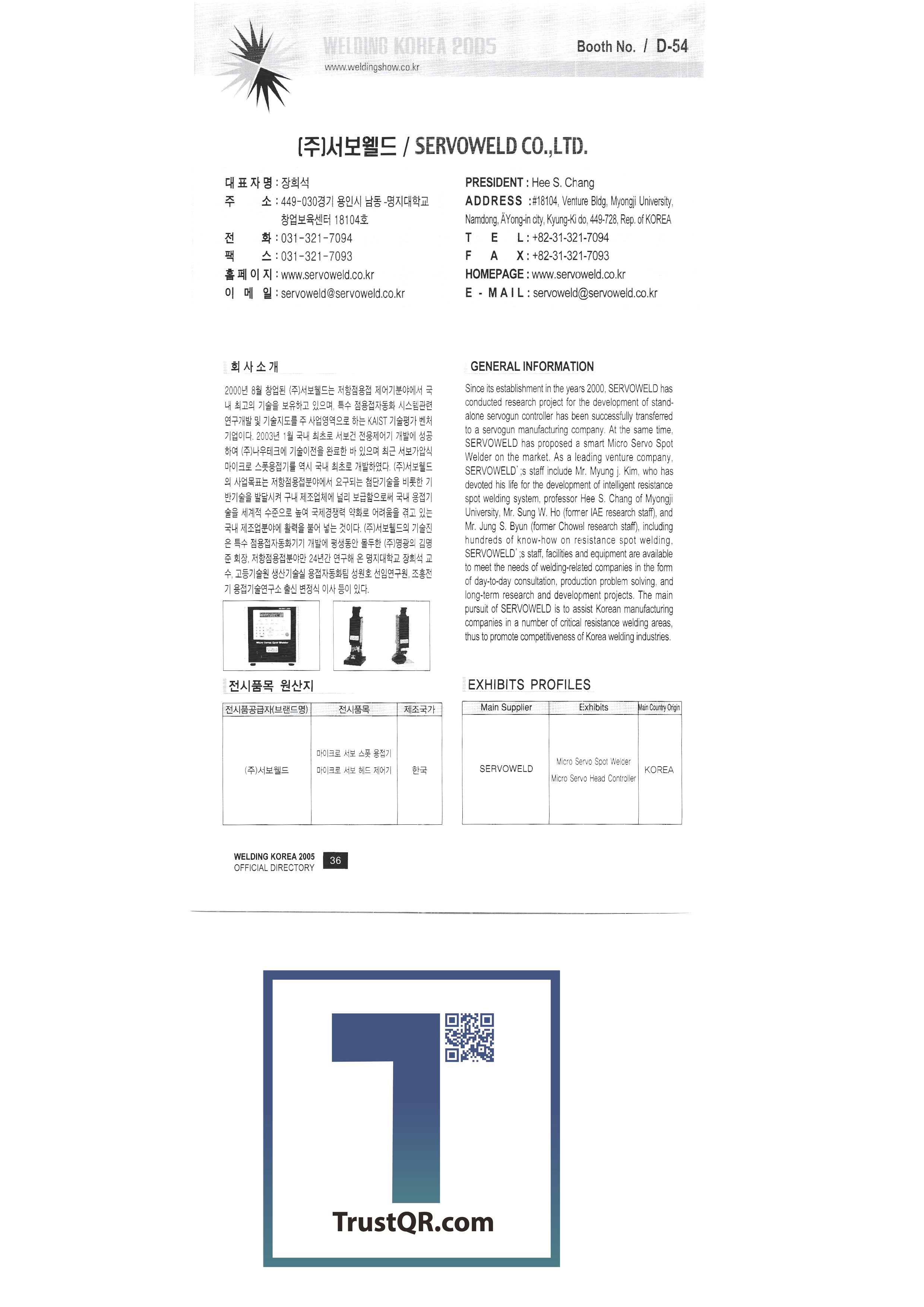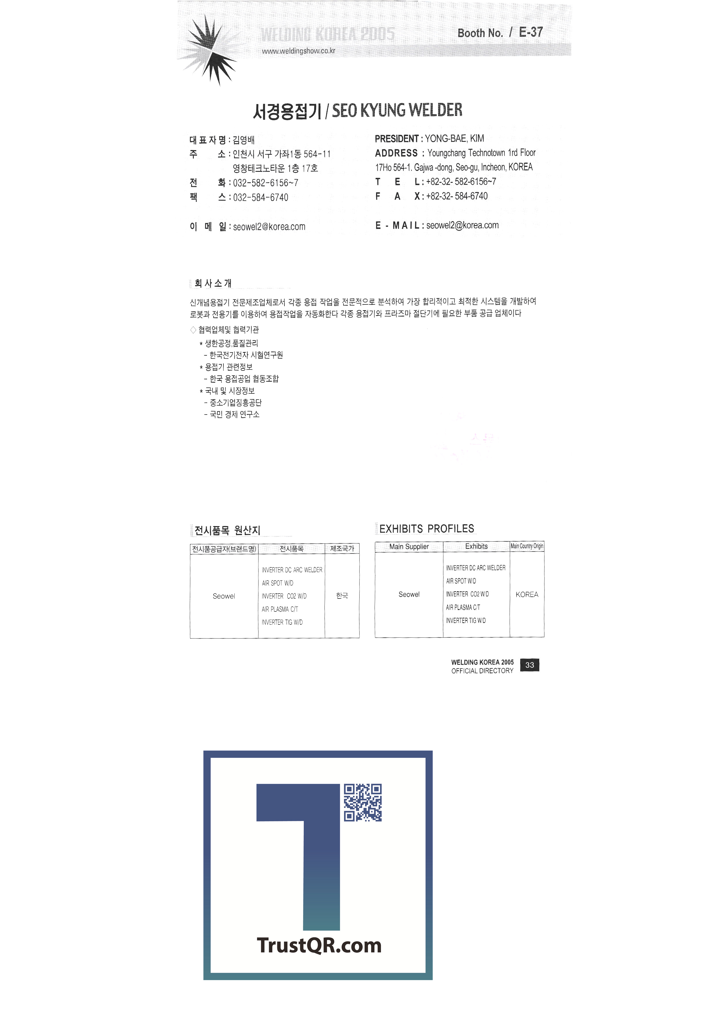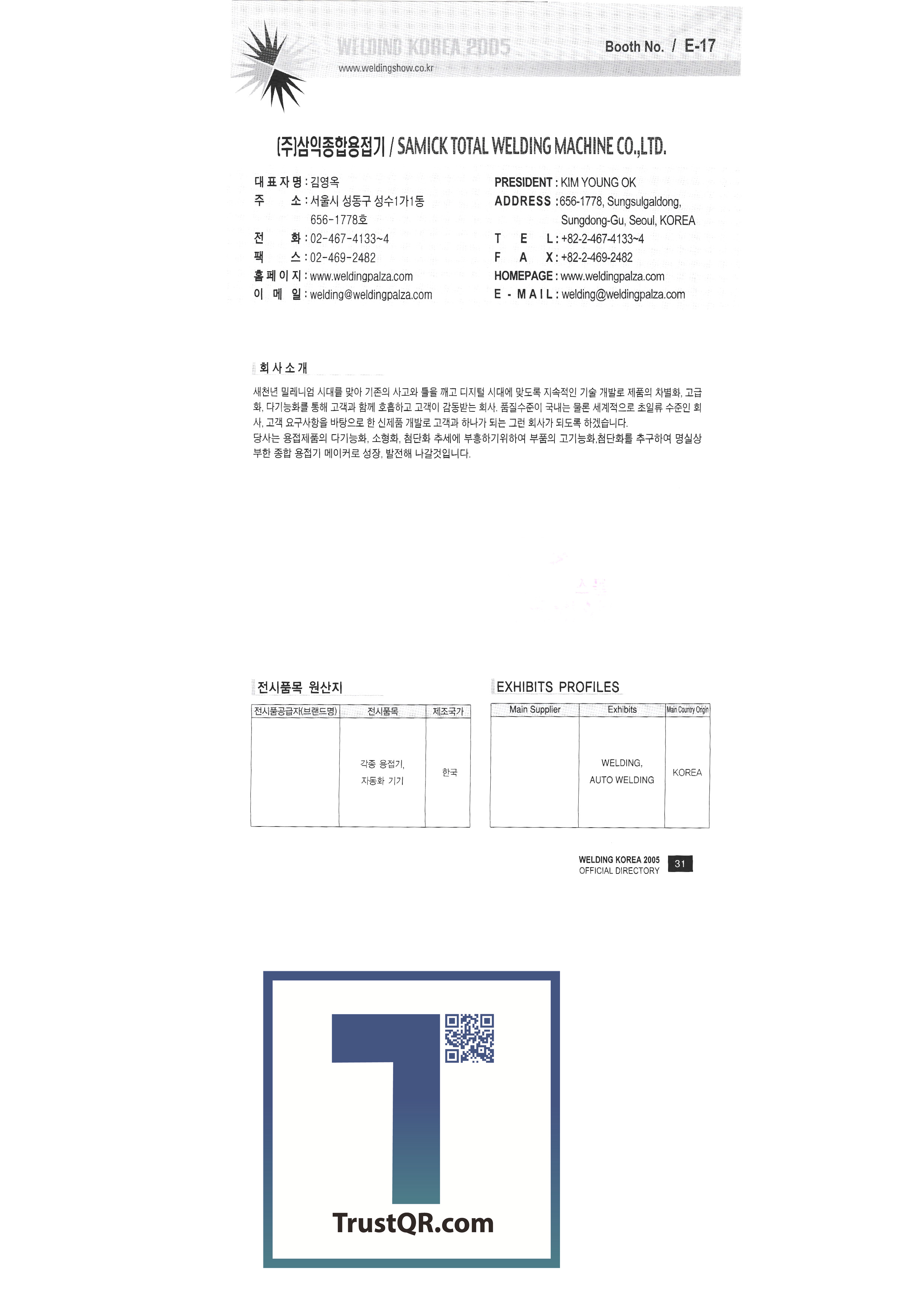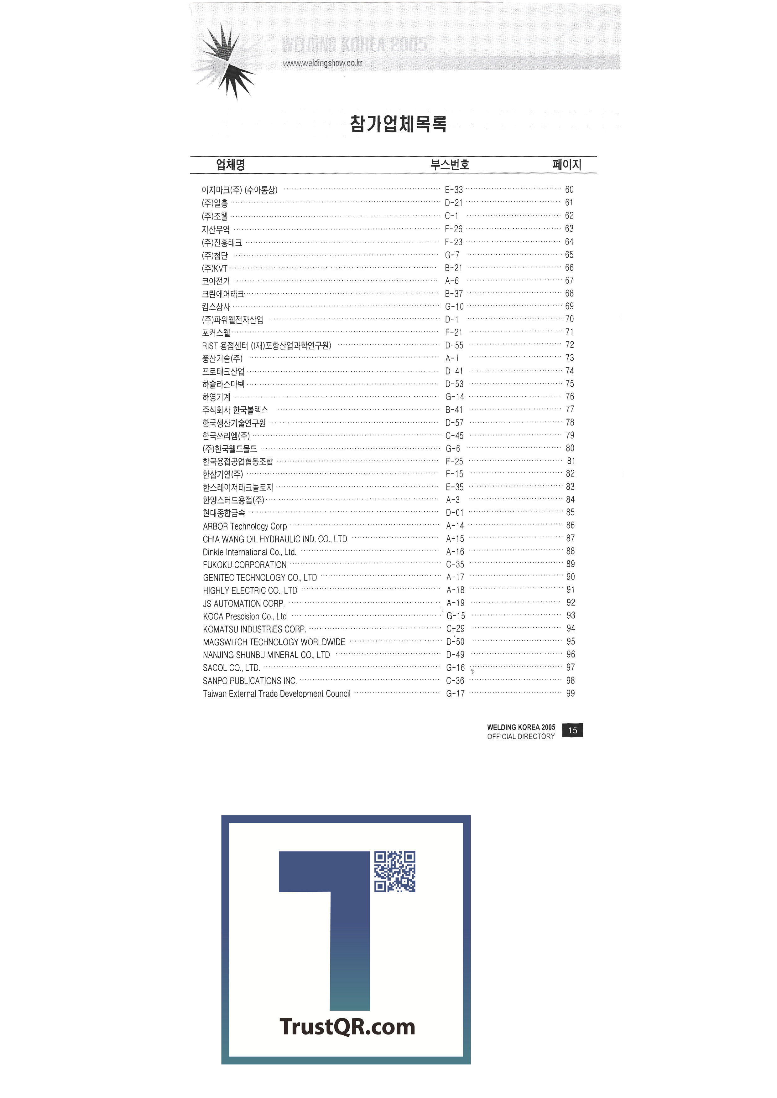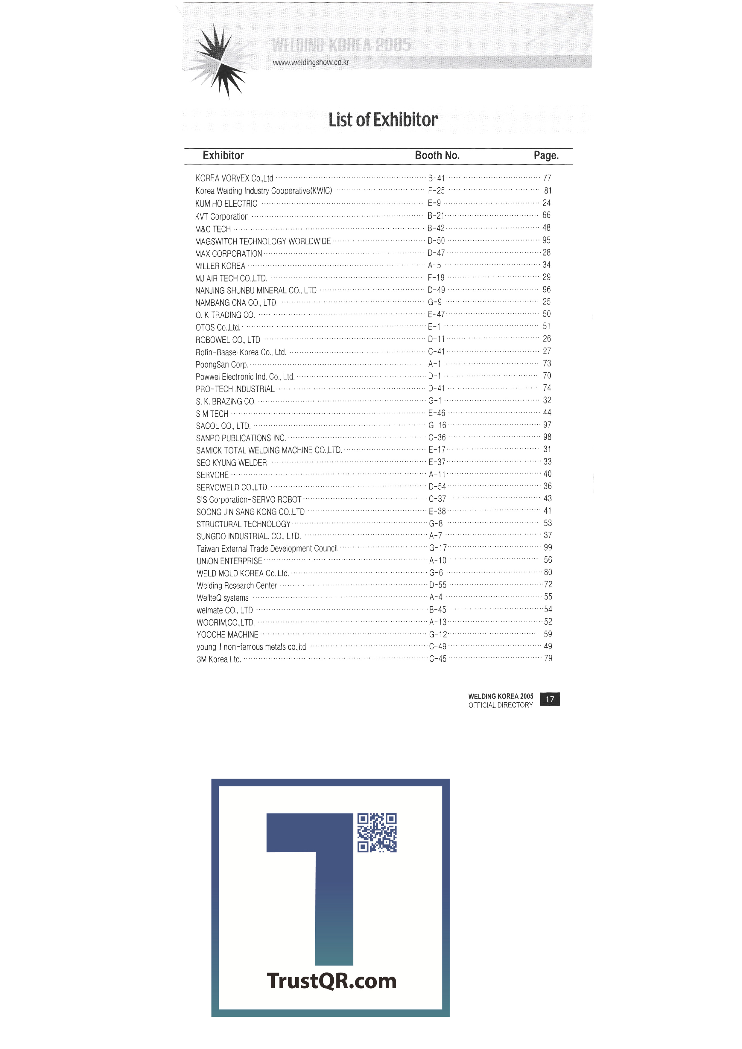 International Automotive Exhibition International Wells Co., Ltd. Green Hill Net Co., Ltd. Geumgam EDM Kumho Electric Nambang C.N.A. Robowell Co., Ltd. Lopin-Basel Korea Co., Ltd. Max Electrician Myeongjin Airtech Co., Ltd. Bakuudarose Korea Co., Ltd. Samik General Welding Machine Seokyeong Brazing Seokyung Welding Machine Seokwang (Miller Korea Agency) Jaekwang TF (Seokwang Relay) Servo Weld Sungdo Industry |