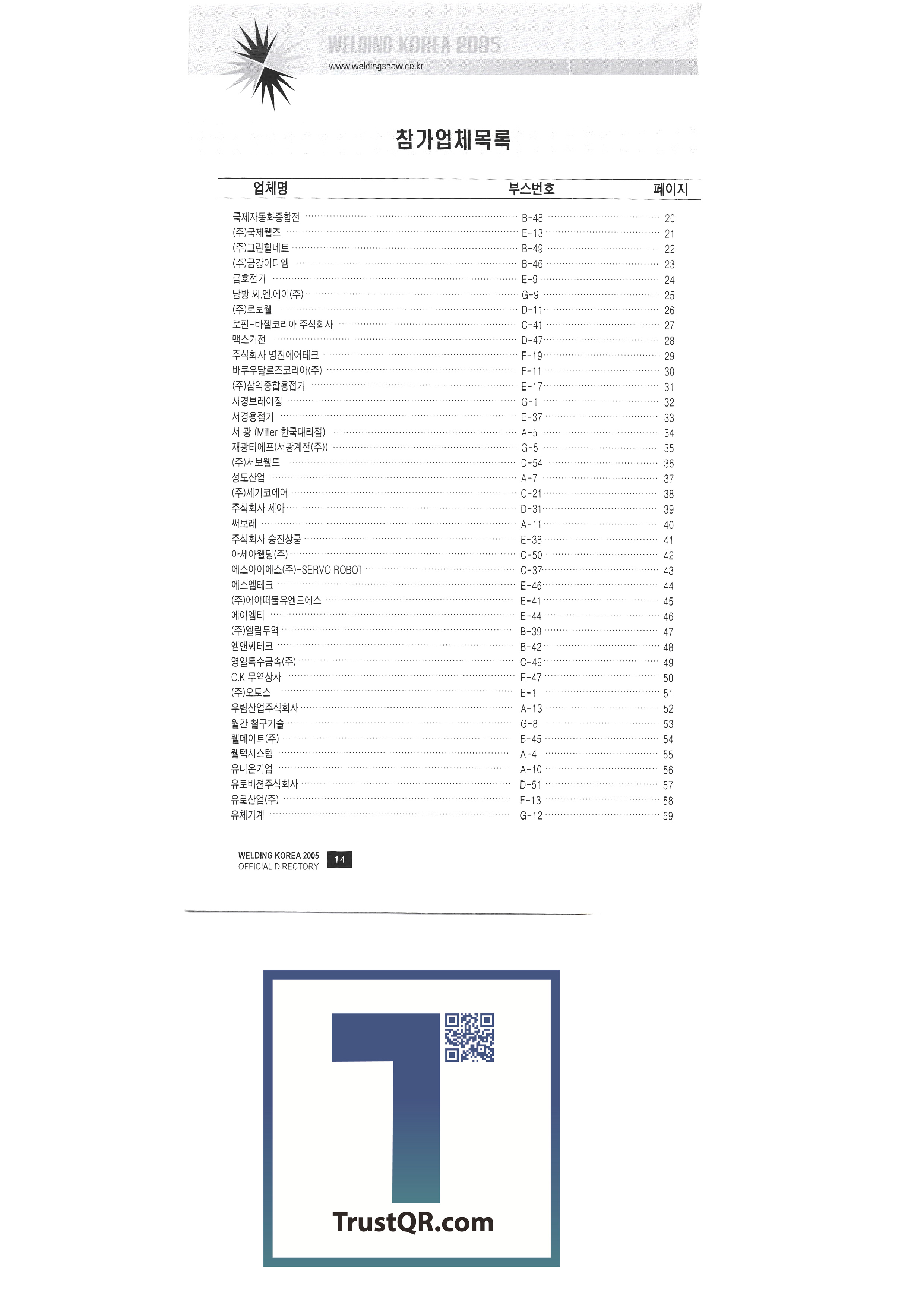 | 국제자동차종합전 ㈜국제웰즈 ㈜그린힐네트 ㈜금감이디엠 금호전기 남방 씨.엔.에이㈜ ㈜로보웰 로핀-바젤코리아 주식회사 맥스기전 주식회사 명진에어테크 바쿠우달로즈코리아㈜ ㈜삼익종합용접기 서경브레이징 서경용접기 서광(Miller한국대리점) 재광티에프(서광계전㈜) ㈜서보웰드 성도산업 |