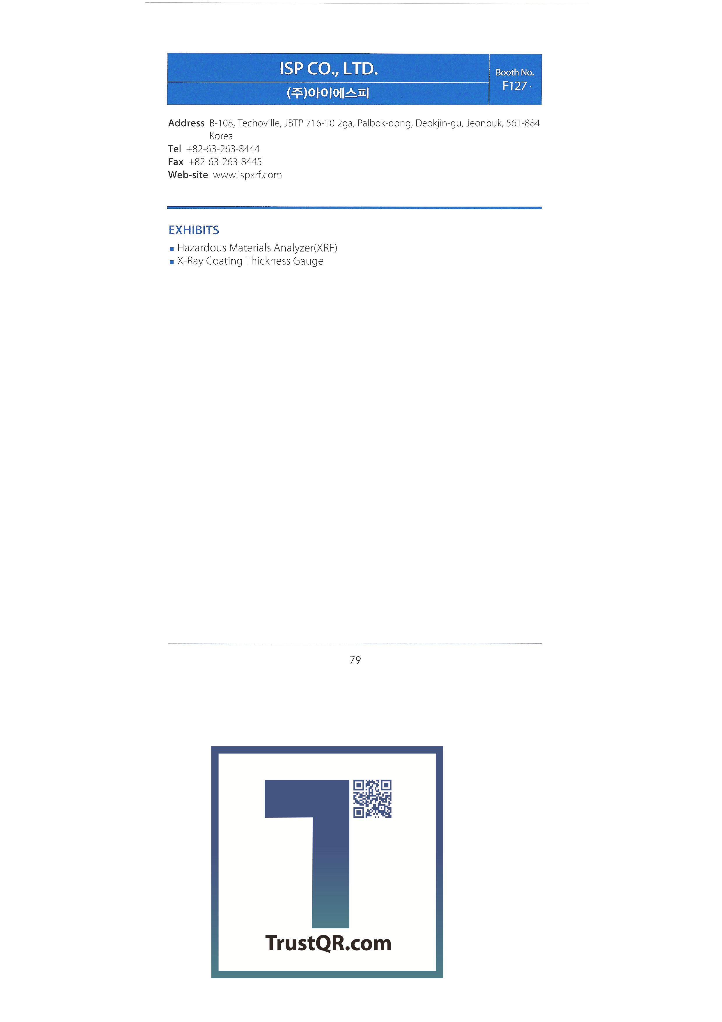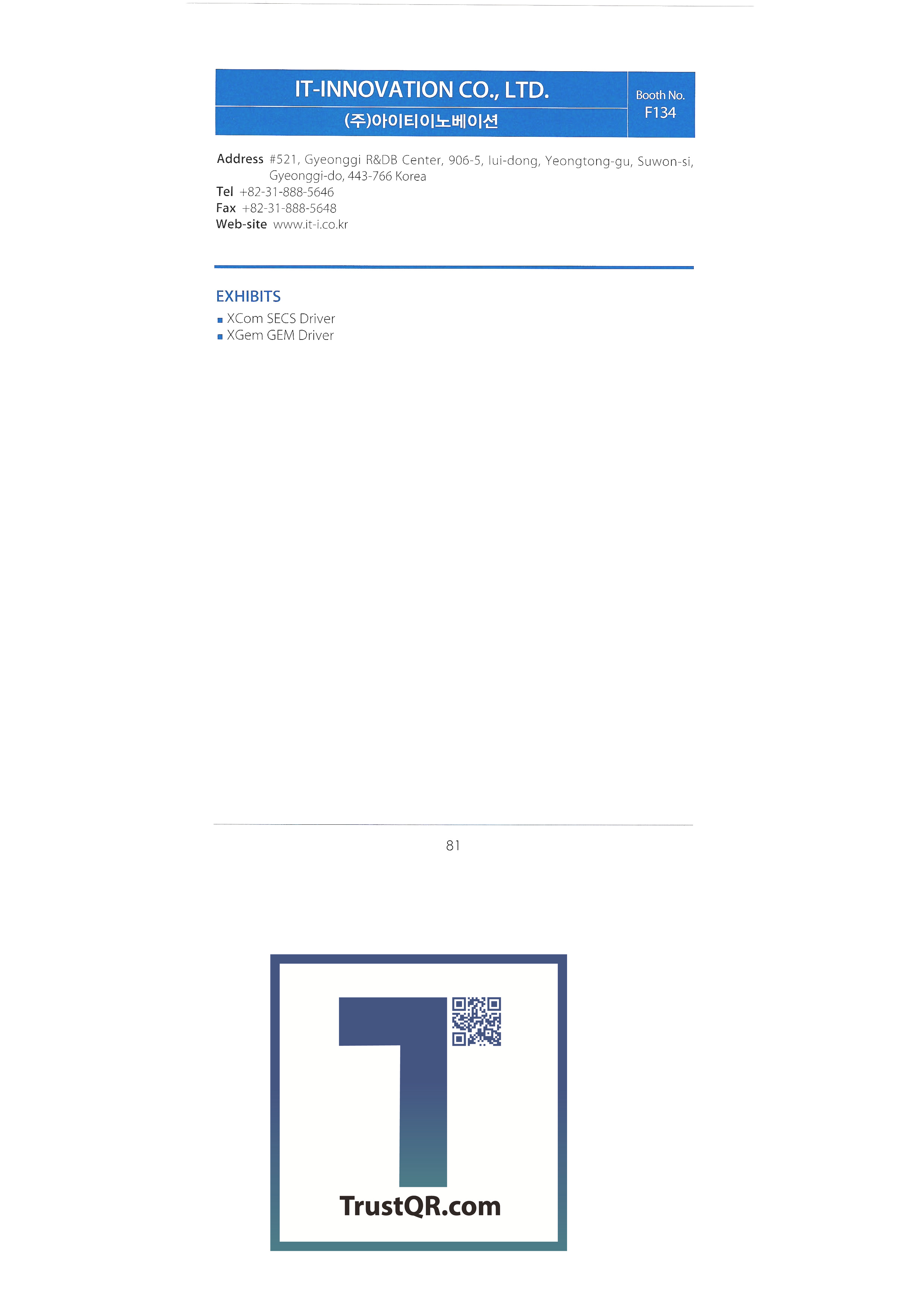 Hutron IMPC Co., Ltd. Indis Air Co., Ltd. Infoder-FA Journal Interchem Korea Co., Ltd. ISP Co., Ltd. THE HUNGARIAN INVESTMENT AND TRADE DEVELOPMENT AGENCY IT Innovation Co., Ltd. Yagin Corporation Jeio Tech JS Tech Semi-vision KCT Tech Keyence Korea Co., Ltd. Korea Institute of Industrial Technology Goyoung Technology Korea ITS Korea Comprehensive Technology Korea Magnesium KT Co., Ltd. International Trade Co., Ltd. Leica Korea Litgen Co., Ltd. Mint Technology Korea Mirae Industry Co., Ltd. Mir Technology Co., Ltd. Monthly motion control MS Tech M-SYS Nano Protech Co., Ltd. National Pro-Rack NEXTA Technology Co., Ltd. NK NY Tech OK Korea PAMI Co., Ltd. Femtron Phoenix Digital Tech Co., Ltd. QTS Co., Ltd. |