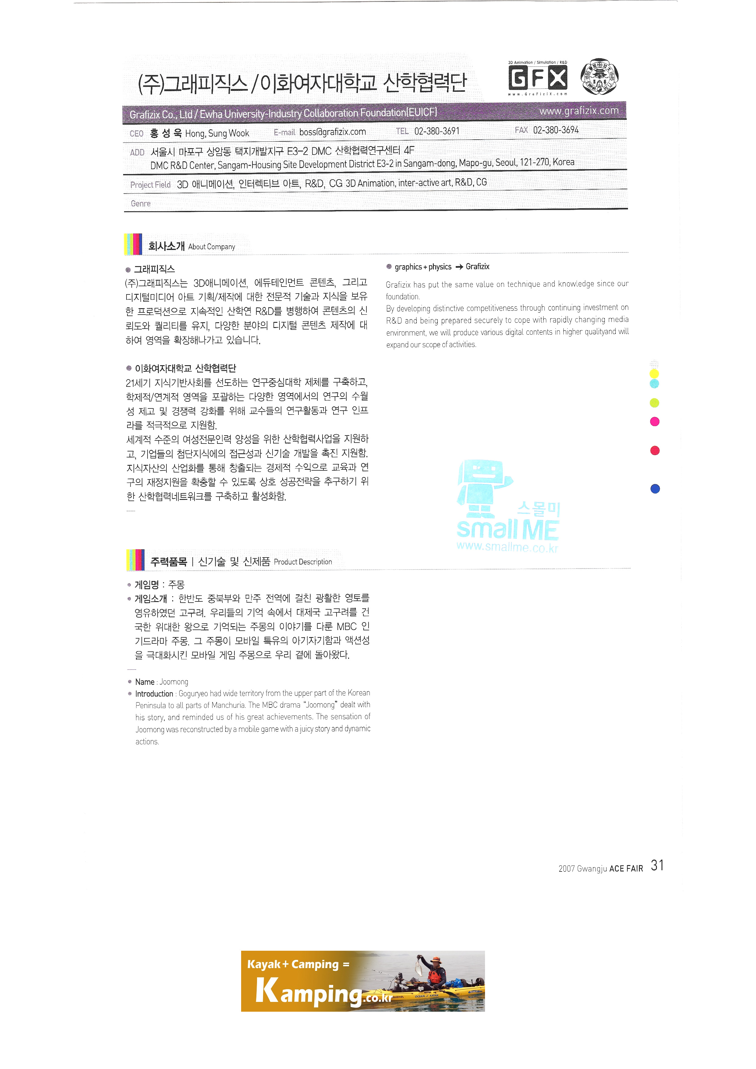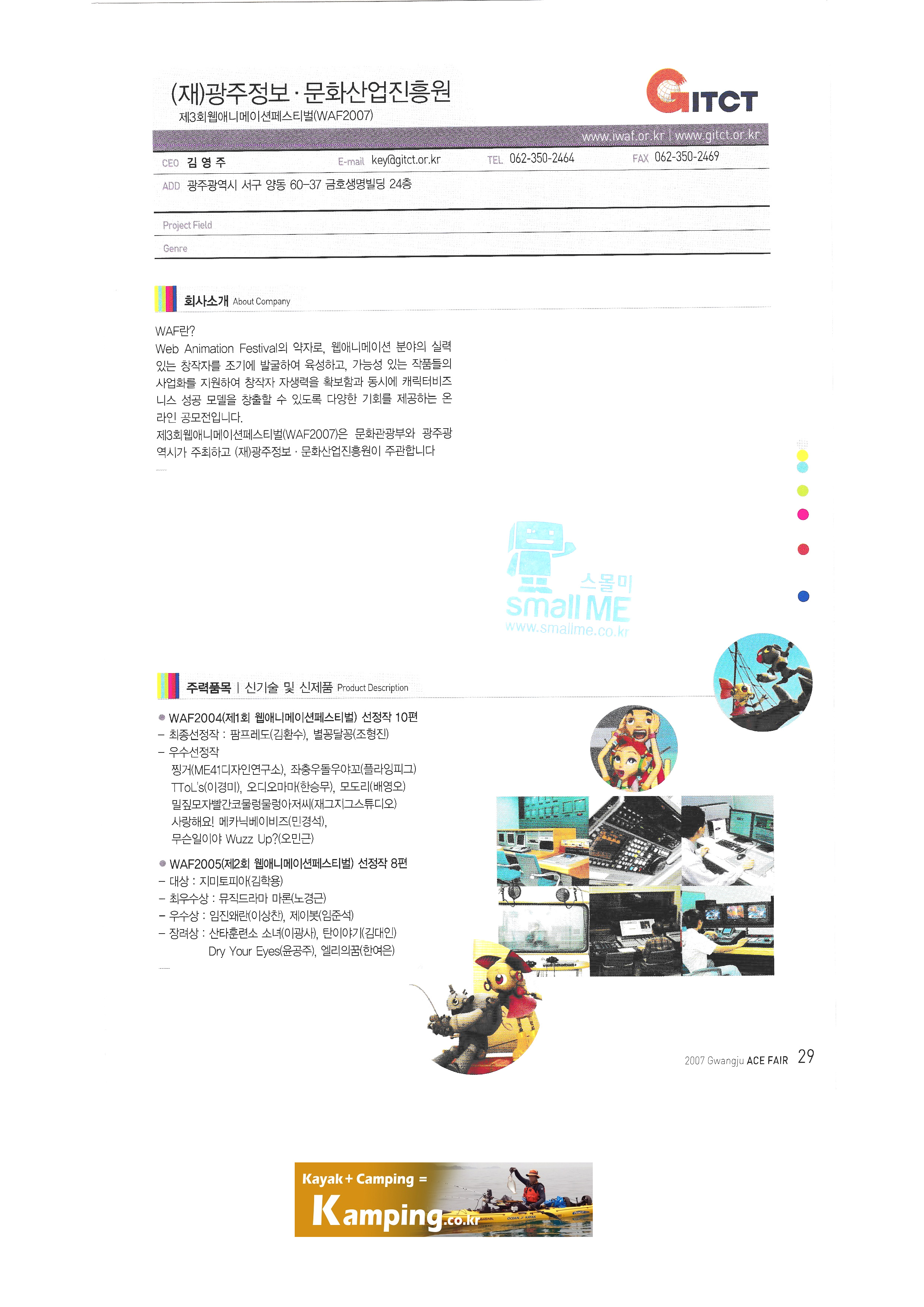 | ㈜가화 경기디지털콘텐츠진흥원 고양지식정보산업진흥원 부천만화정보센터 부천산업진흥재단 성남산업진흥재단 안양지식산업진흥원 광주과학기술원 문화콘텐츠기술연구소 (재)광주디자인센터 (재)광주비엔날레 광주시 떡산업 육성사업단 '예담은' (재)광주정보문화산업진흥원 ㈜그래피직스/이화여자대학교 산학협력단 CTS기독교TV ㈜기획시대 ㈜나루커뮤니케이션 ㈜넥스트이지 ㈜넥스팝 |