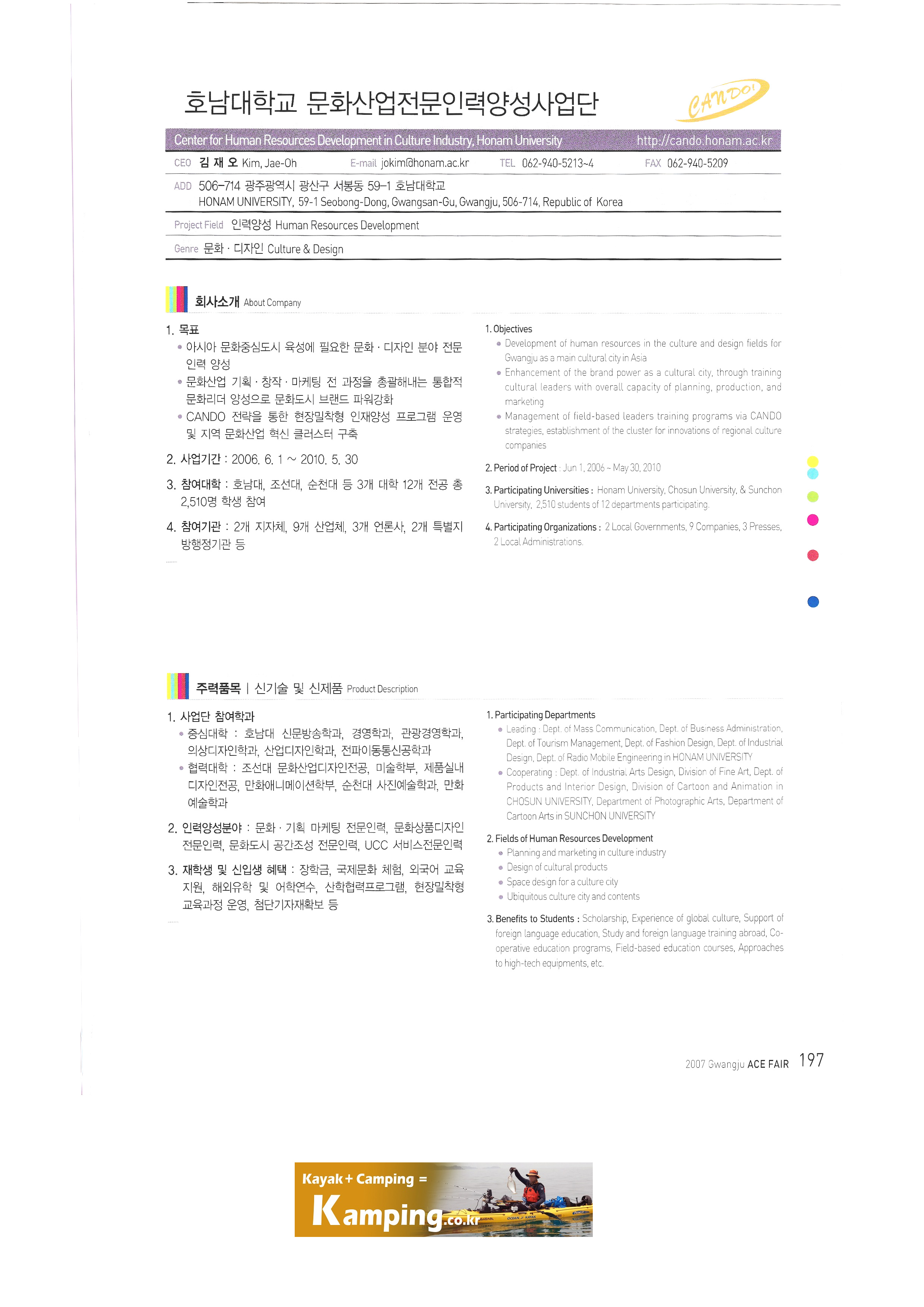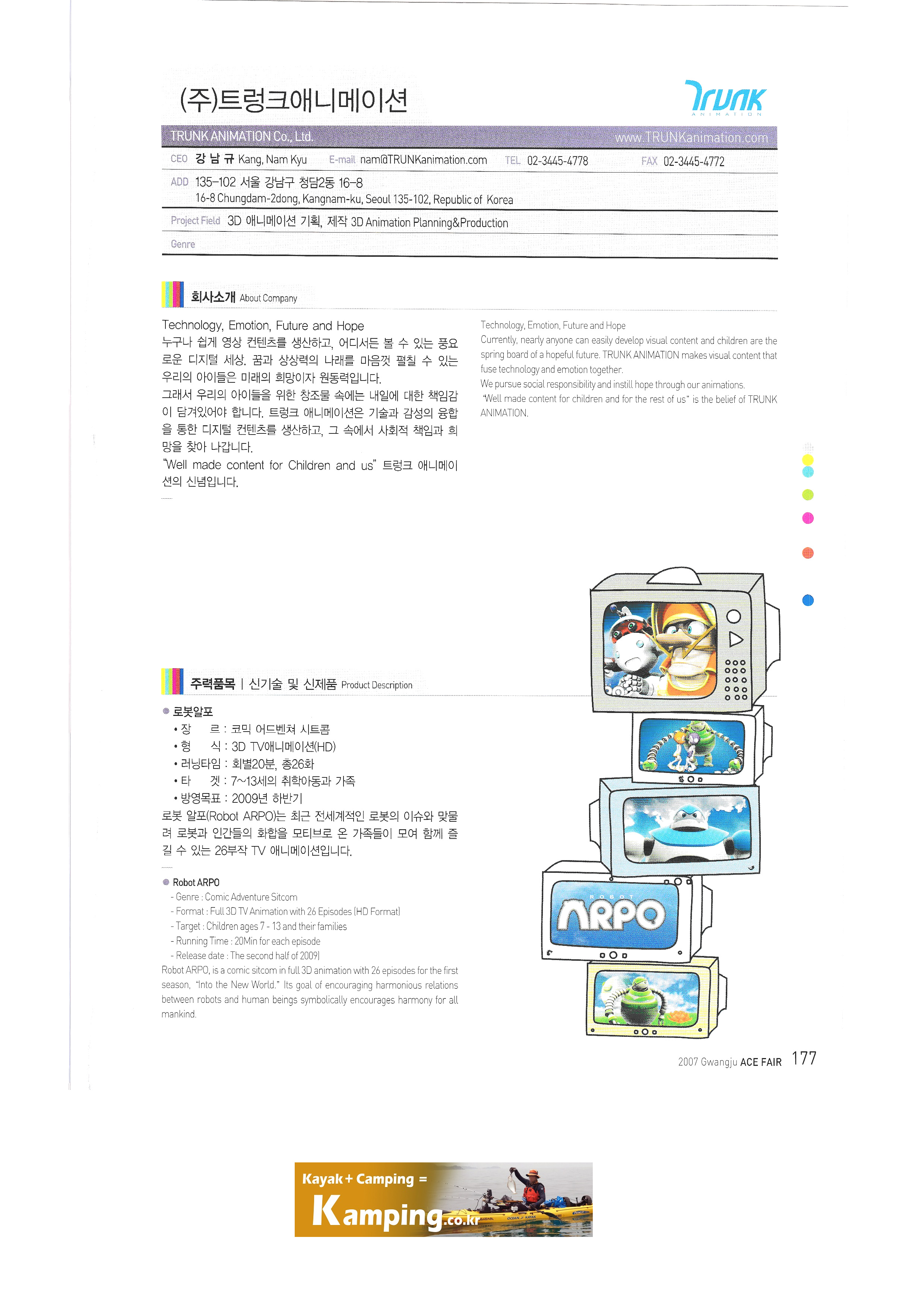 | 제2회 국제문화창의산업전 - 5 ㈜채널원커뮤니케이션 캐릭터굿스 싹 미디어 ㈜캐릭터라인 캐비닛 커뮤시티 ㈜케이티이에스 태성엔지니어링 ㈜트렁크애니메이션 ㈜푸드TV ㈜픽셀즈 ㈜픽셀플래넷 ㈜한국경제TV ㈜한국공간정보통신 9주)한국낚시채널FTV 한국아이넷 사단법인 한국캐릭터협회 현대홈쇼핑 호남대학교 문화산업전문인력양성사업단 환경재생조형박물관 Base Camp Productions Pty Ltd |