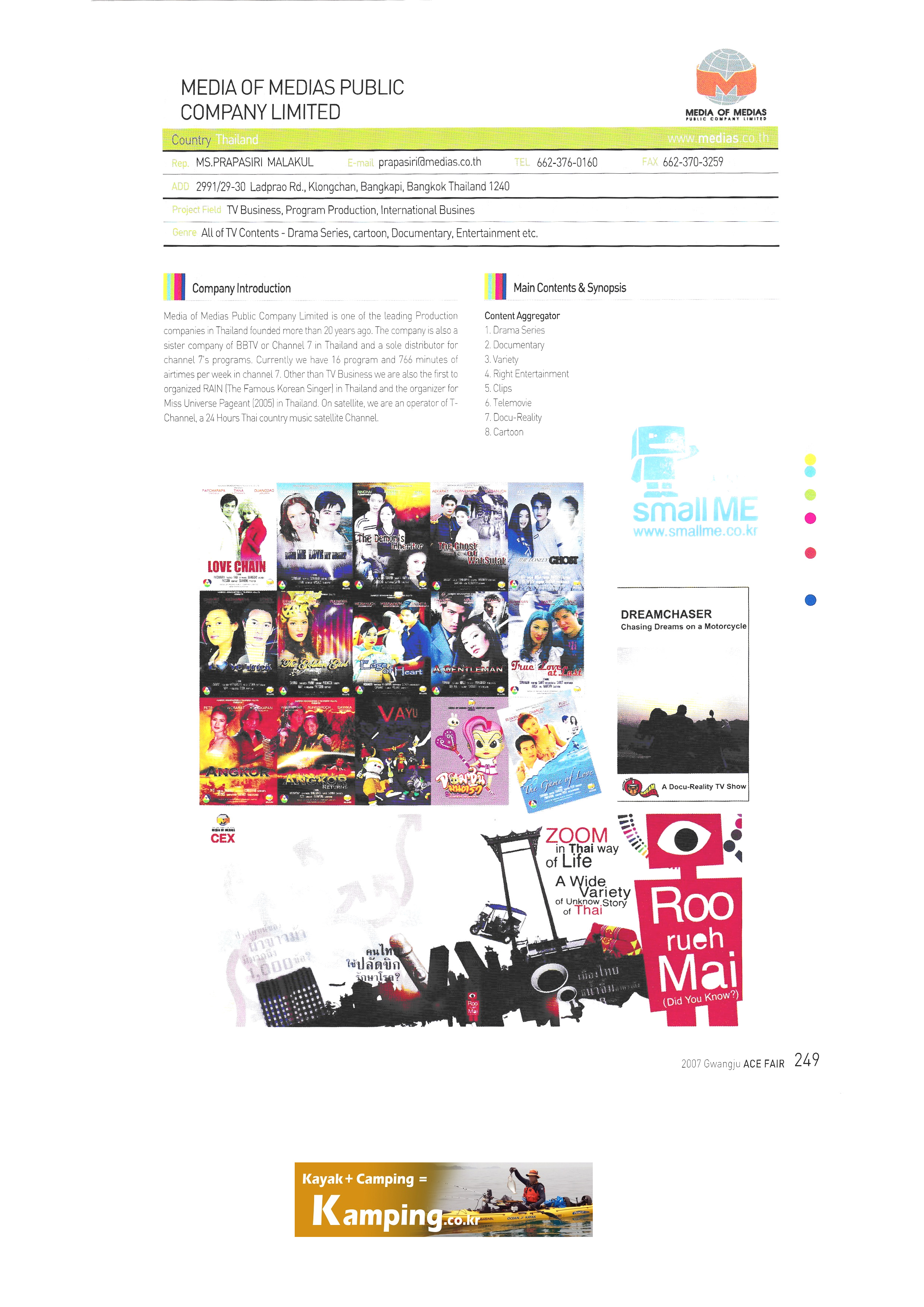 | นิทรรศการอุตสาหกรรมสร้างสรรค์ทางวัฒนธรรมนานาชาติครั้งที่ 2 -7 ต้าอ้ายโทรทัศน์ Easyfun Entertainment ePhoenix Networks Co. จำกัด Tzuchi Communications and Culture Foudation ตัวแทน VFX Co. LTD. Bright Beacon Animation บ. ไชโยโปรดักชั่น จำกัด สื่อของ บริษัท มีเดีย จำกัด (มหาชน) บริษัท Right Beyond Co. จำกัด สำนักงานส่งเสริมอุตสาหกรรมซอฟต์แวร์ TRT-TURKISH RADIO & TELEVISION CORPORATION Academy of Art University โปรดักชั่น Barstormer Cine Excel Entertainment, Inc. Eleven Arts, Inc. Hollywood Classics USA / อินเฟรม สัตว์เลี้ยงนกบันเทิง MULTIMEDIA JOINSTOCK COMPANY สมาคมการออกอากาศเคเบิลทีวีเกาหลี Korea Cable TV Gwangju Broadcasting Corporation CMB Gwangju, Jeonnam Broadcasting Honam Broadcasting ออกอากาศทางตะวันตกเฉียงใต้ เคเบิลทีวีเกาหลี Jeonnam East Broadcasting Co. , Ltd. TV Road Jeonju Broadcasting Corporation Geumgang Broadcasting Corporation Korea Cable TV Jeonbuk Broadcasting Corporation ซีแอนด์เอ็ม |