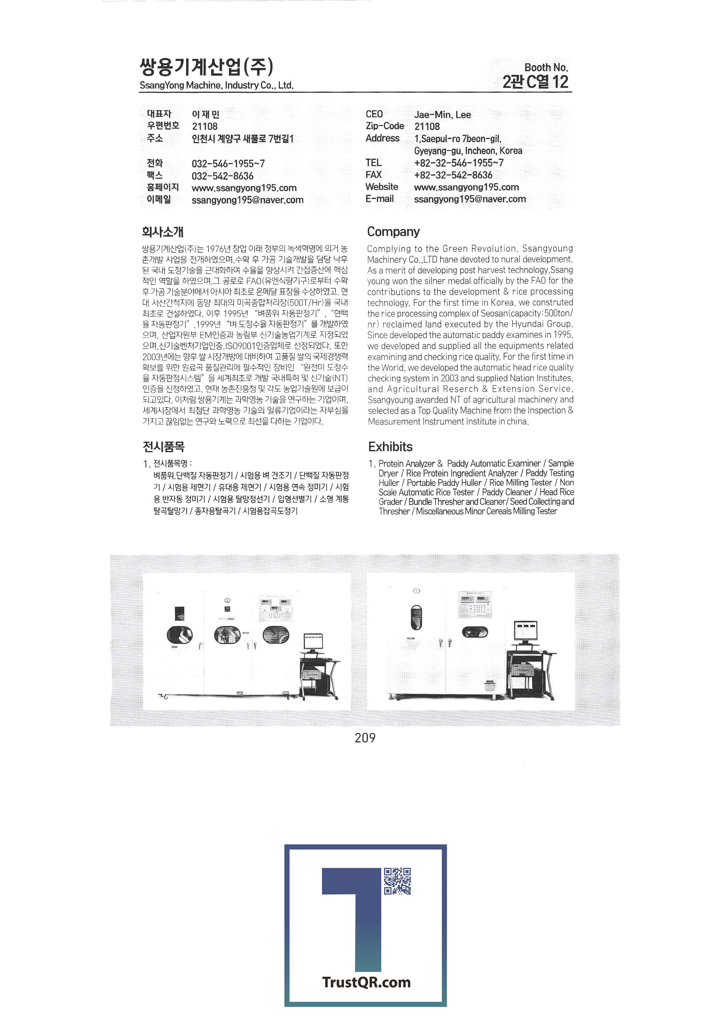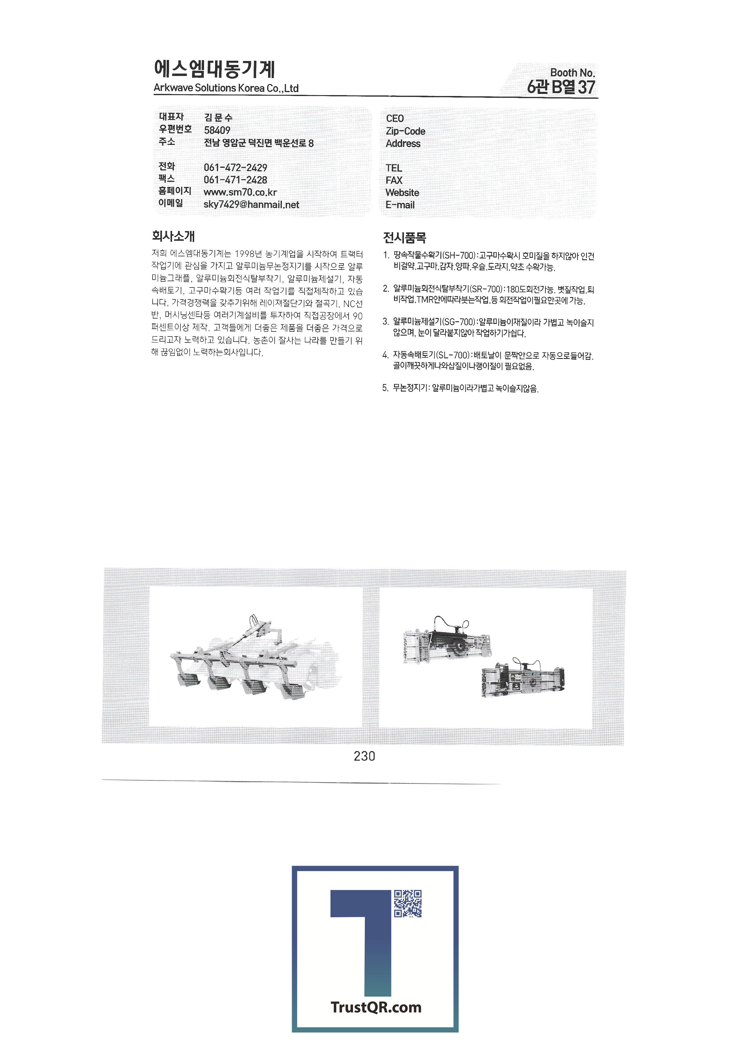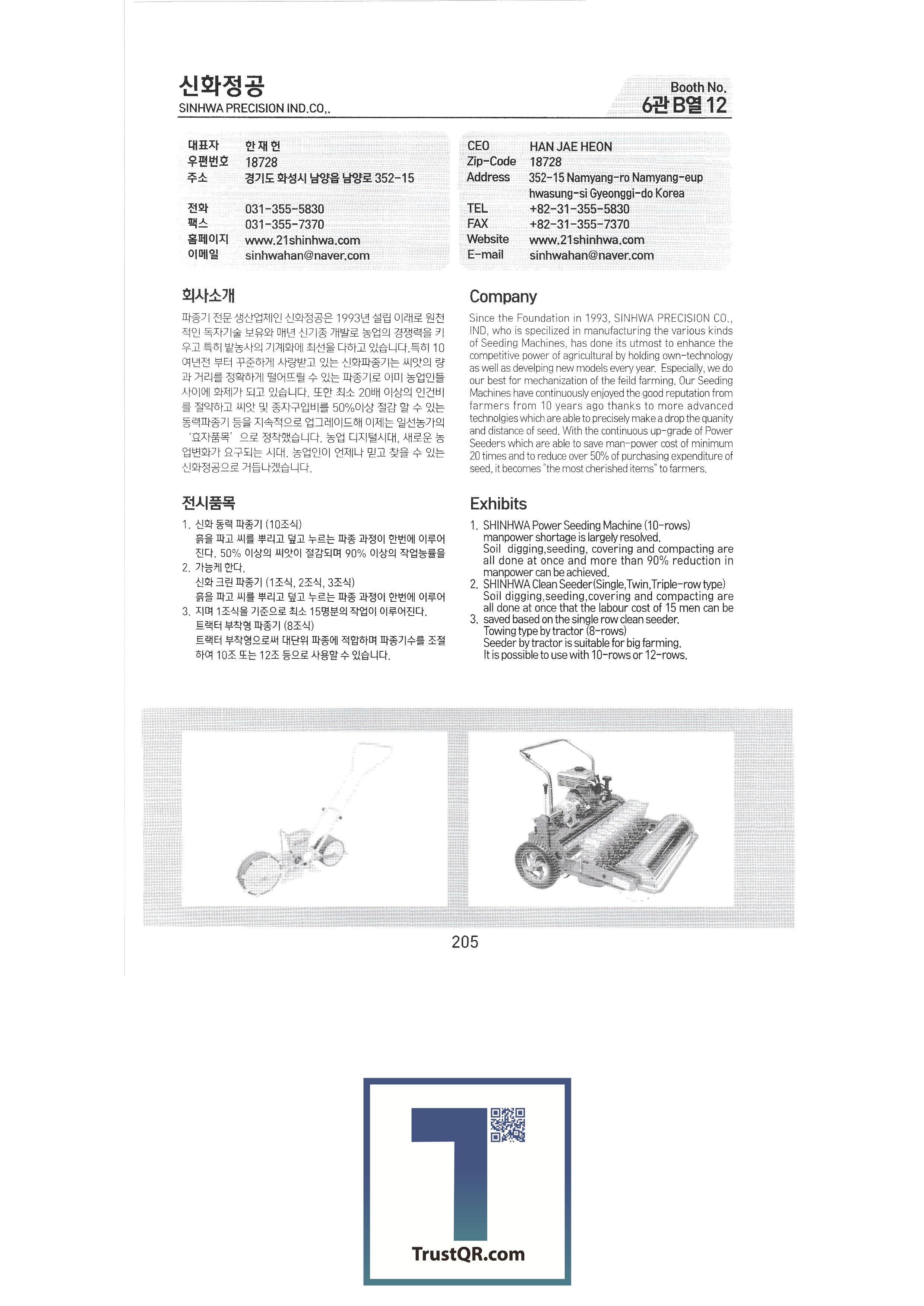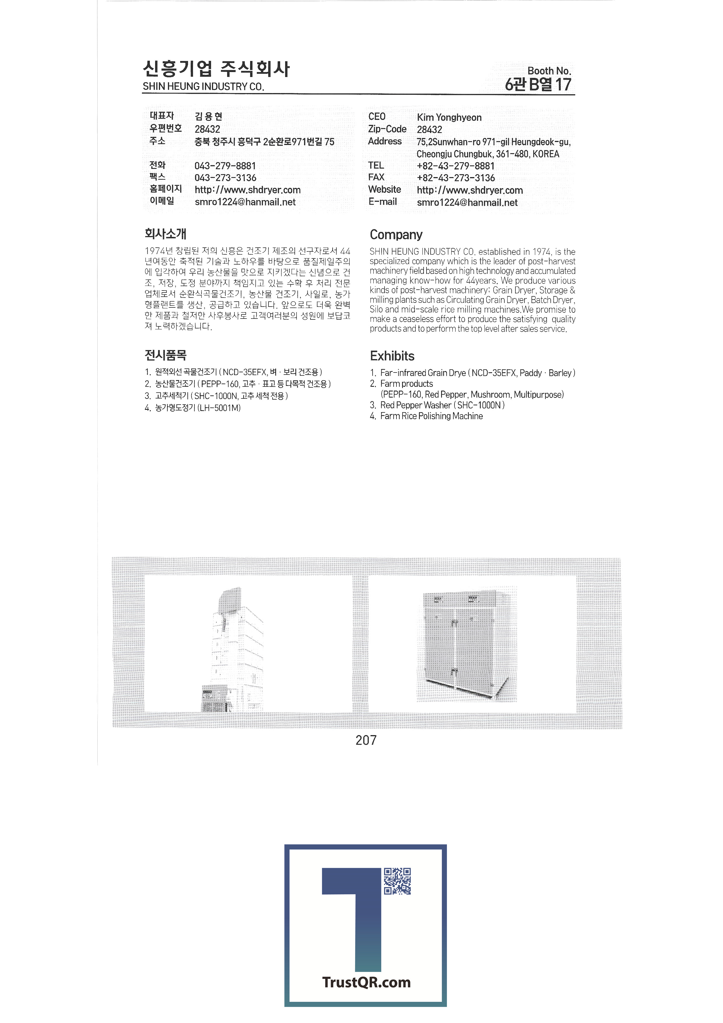 | Shinil Industries Co. , Ltd. บจก. ชินิลเทค ชินจินไฮดรอลิก บริษัท ชินฮันเอเทค จำกัด ความแม่นยำของชินฮวา บริษัท Shinheung Industrial Shinheung Enterprise Co. , Ltd. ซิลตี้บจก. บริษัท ซันยองแมชชีนเนอรี่อินดัสตรี จำกัด ซีแอนด์ซีเทค เครื่องเจาะเมล็ดพันธุ์ C.H.S สถาบันวิจัย C & Tech อากัง จำกัด บจก. เกียรติยศฟาร์ม Abant Korea Co. , Ltd. บจก. อาซาบะแทฮวา อาซุงแม่นยำ อุตสาหกรรมเครื่องจักรกลเอเชีย บจก. เอเชียเทค บจก. เอเชียต้นกล้า Ideaon บจก. ไอจีเอสพี อพอลโล บจก. อันซองอินดัสเตรียล / อโกรส์บจก. ยันม่าร์เครื่องจักรกลการเกษตรเกาหลี เอสบีอุตสาหกรรม SH บจก. บจก. เอส. เอ็น. พี. ซิสเต็ม เครื่องจักร SM Daedong บจก. เอสเอ็มเพียว เอสจีทีคอร์ปอเรชั่น HSM บจก. เอชเจ 9 อินน์ เอแพคบจก. ยืนยัน บจก. อีโคโซลาร์เทค บจก. อีโคพาส L&S LSMtron |