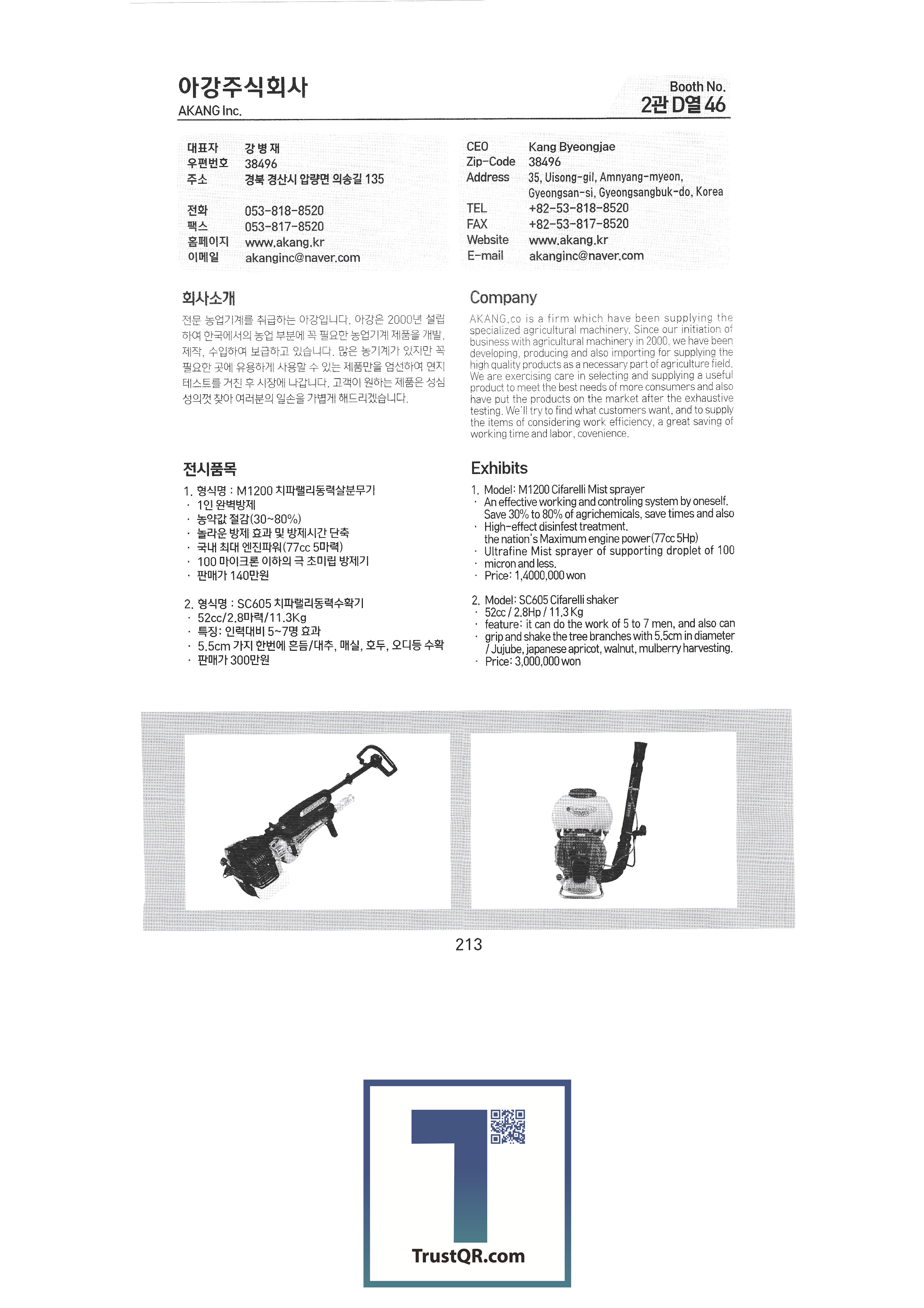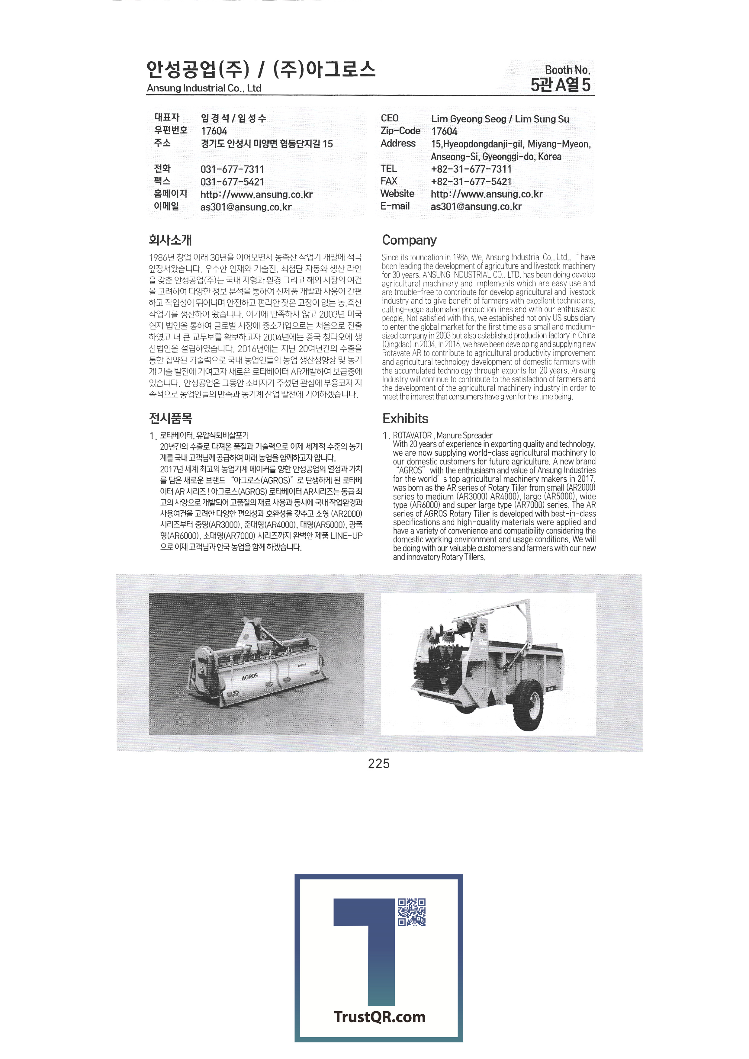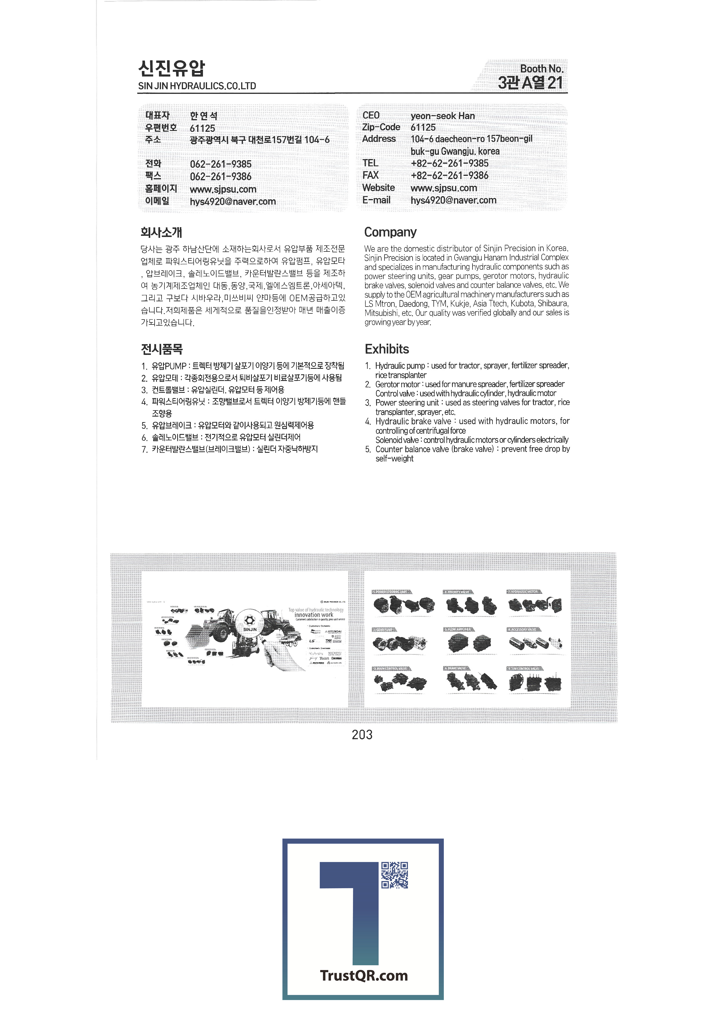 | Shinil Industries Co. , Ltd. บจก. ชินิลเทค ชินจินไฮดรอลิก บริษัท ชินฮันเอเทค จำกัด ความแม่นยำของชินฮวา บริษัท Shinheung Industrial Shinheung Enterprise Co. , Ltd. ซิลตี้บจก. บริษัท ซันยองแมชชีนเนอรี่อินดัสตรี จำกัด ซีแอนด์ซีเทค เครื่องเจาะเมล็ดพันธุ์ C.H.S สถาบันวิจัย C & Tech อากัง จำกัด บจก. เกียรติยศฟาร์ม Abant Korea Co. , Ltd. บจก. อาซาบะแทฮวา อาซุงแม่นยำ อุตสาหกรรมเครื่องจักรกลเอเชีย บจก. เอเชียเทค บจก. เอเชียต้นกล้า Ideaon บจก. ไอจีเอสพี อพอลโล บจก. อันซองอินดัสเตรียล / อโกรส์บจก. ยันม่าร์เครื่องจักรกลการเกษตรเกาหลี เอสบีอุตสาหกรรม SH บจก. บจก. เอส. เอ็น. พี. ซิสเต็ม เครื่องจักร SM Daedong บจก. เอสเอ็มเพียว เอสจีทีคอร์ปอเรชั่น HSM บจก. เอชเจ 9 อินน์ เอแพคบจก. ยืนยัน บจก. อีโคโซลาร์เทค บจก. อีโคพาส L&S LSMtron |