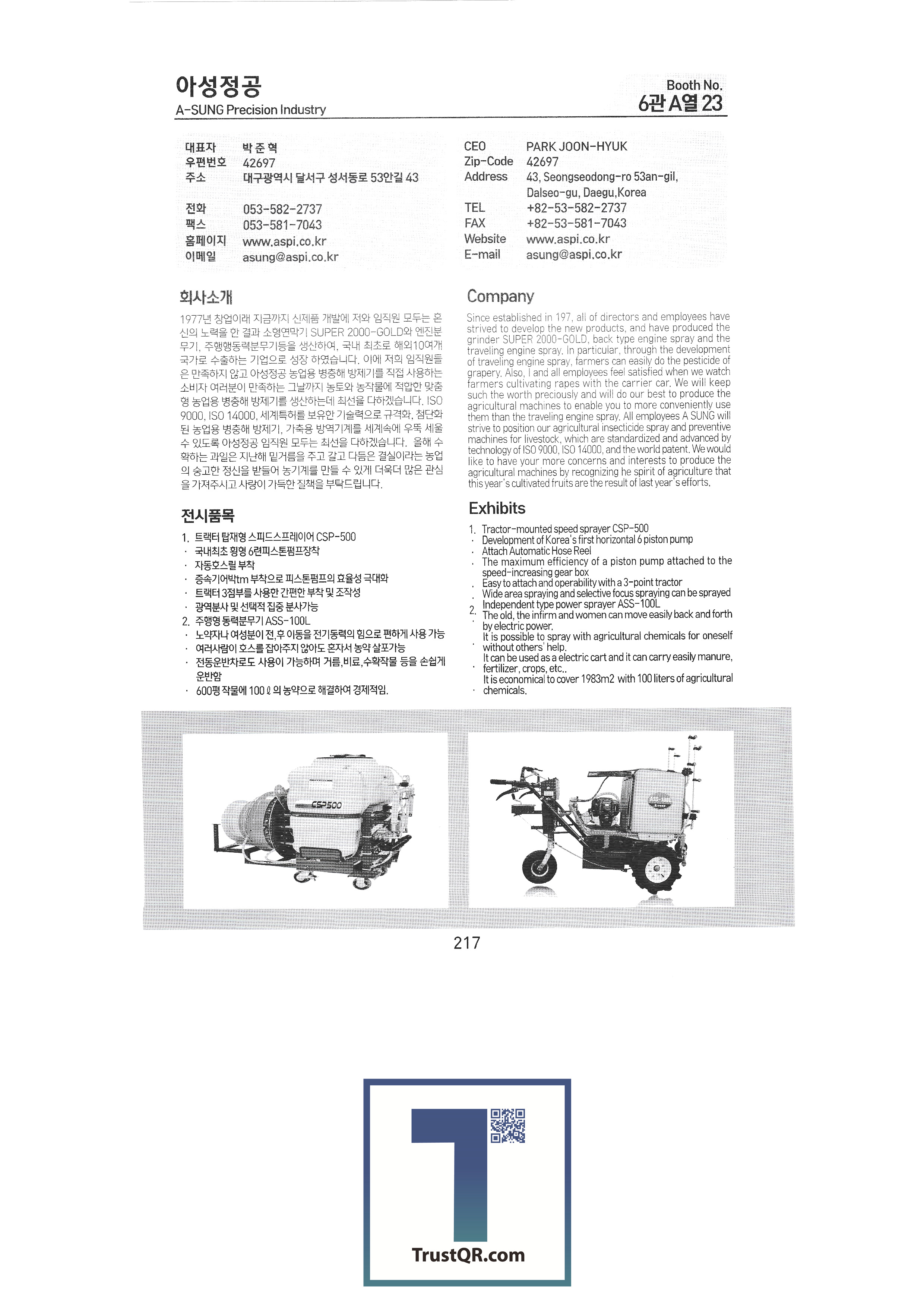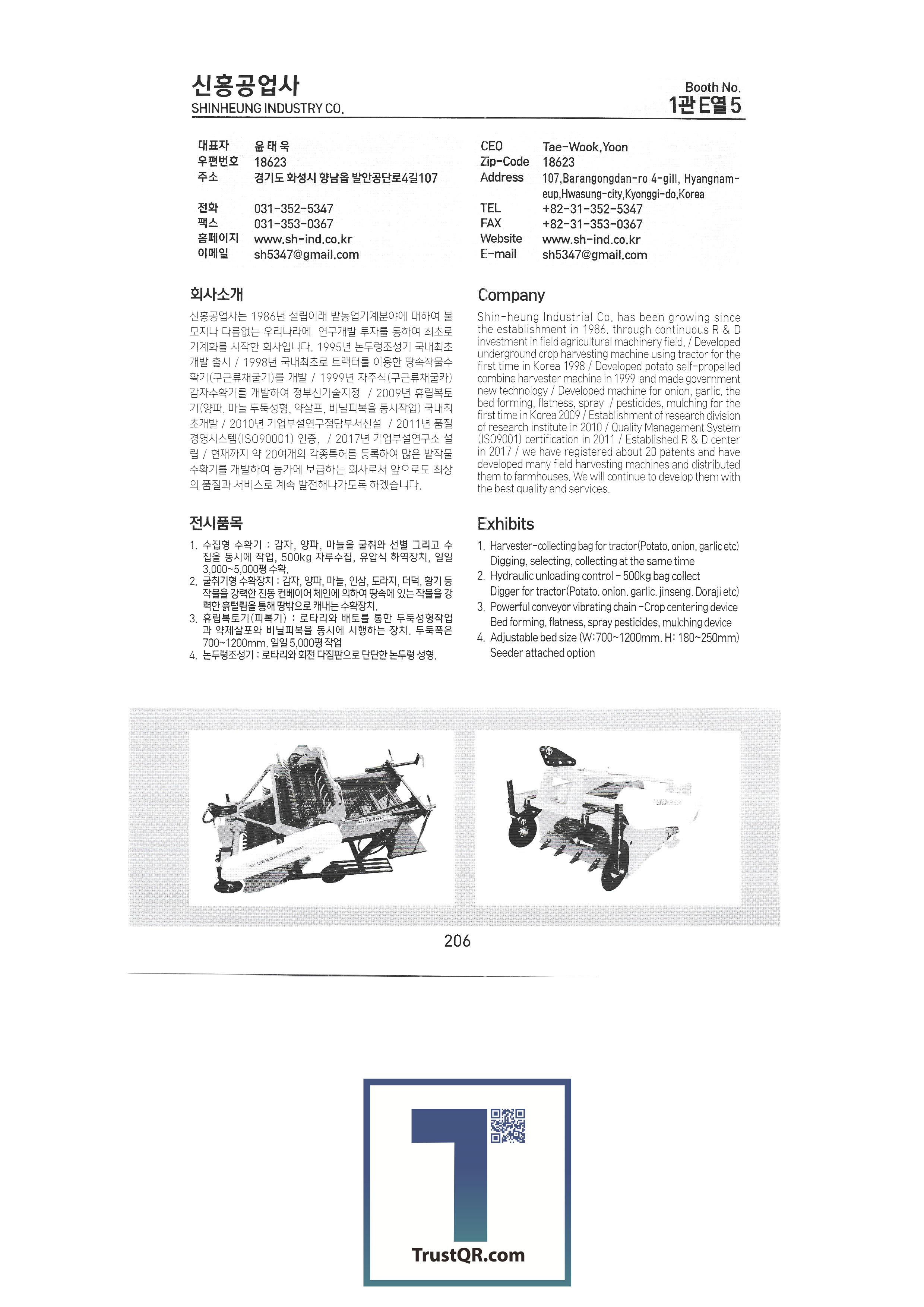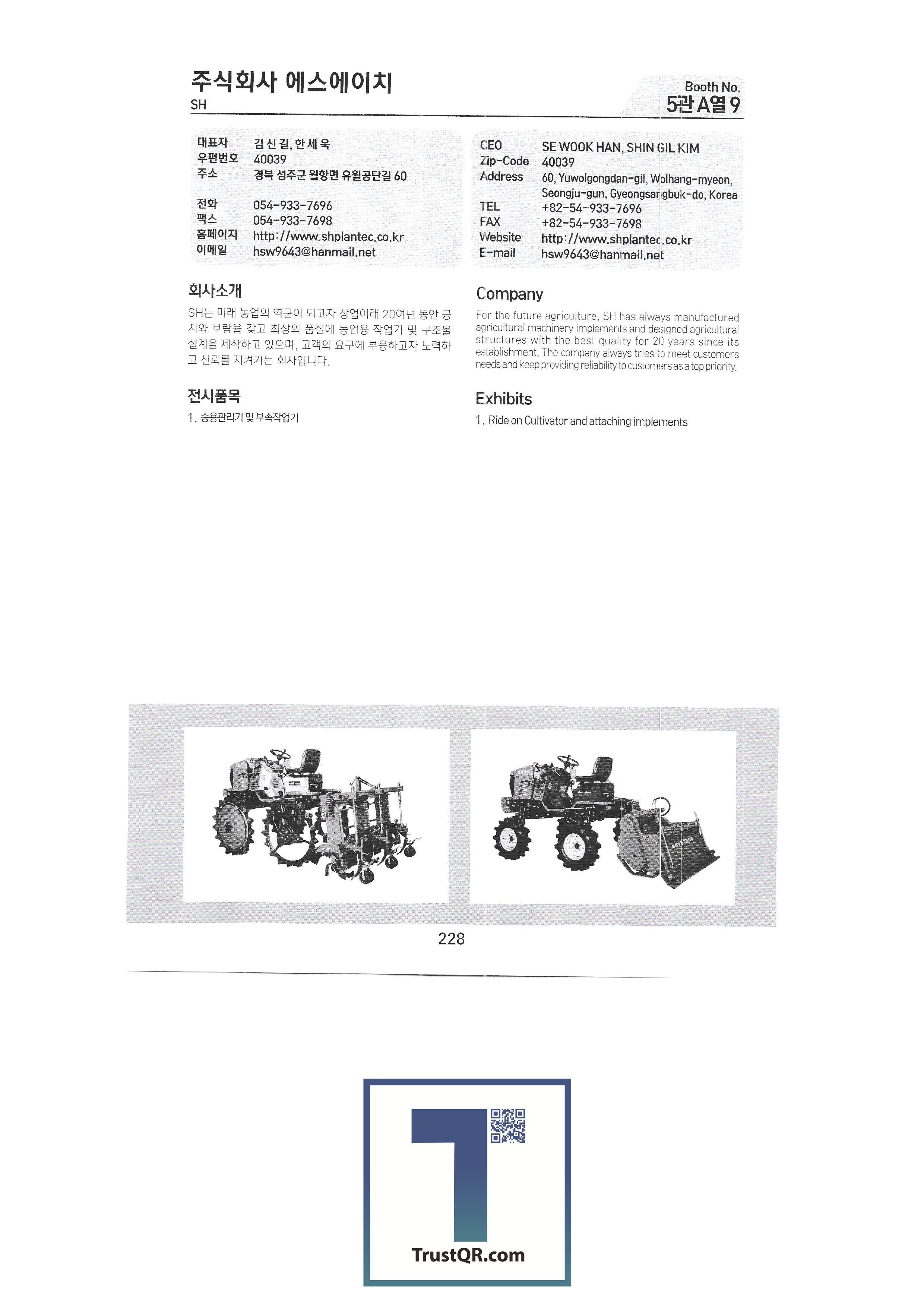 Shinil Industries Co., Ltd. Shinil Tech Co., Ltd. Shinjin Hydraulic Shinhan Atech Co., Ltd. Shinhwa Precision Shinheung Industrial Company Shinheung Enterprise Co., Ltd. Silty Co., Ltd. Ssangyong Machinery Industry Co., Ltd. C&C Tech C.H.S branching seed drill C&Tech Research Institute Agang Co., Ltd. Honor Farm Co., Ltd. Abant Korea Co., Ltd. Asaba Taehwa Co., Ltd. Asung Precision Asia Machinery Industry Asia Tech Co., Ltd. Asia Seedling Co., Ltd. Ideaon IGSP Co., Ltd. Apollo Anseong Industrial Co., Ltd./Agros Co., Ltd. Yanmar Agricultural Machinery Korea SB Industry SH Co., Ltd. SNP System Co., Ltd. SM Daedong Machinery SM Pure Co., Ltd. SGT Corporation HSM HJ9 Inn Co., Ltd. Apack Co., Ltd. Aperm Eco Solar Tech Co., Ltd. Eco Pass Co., Ltd. L&S LSMtron |