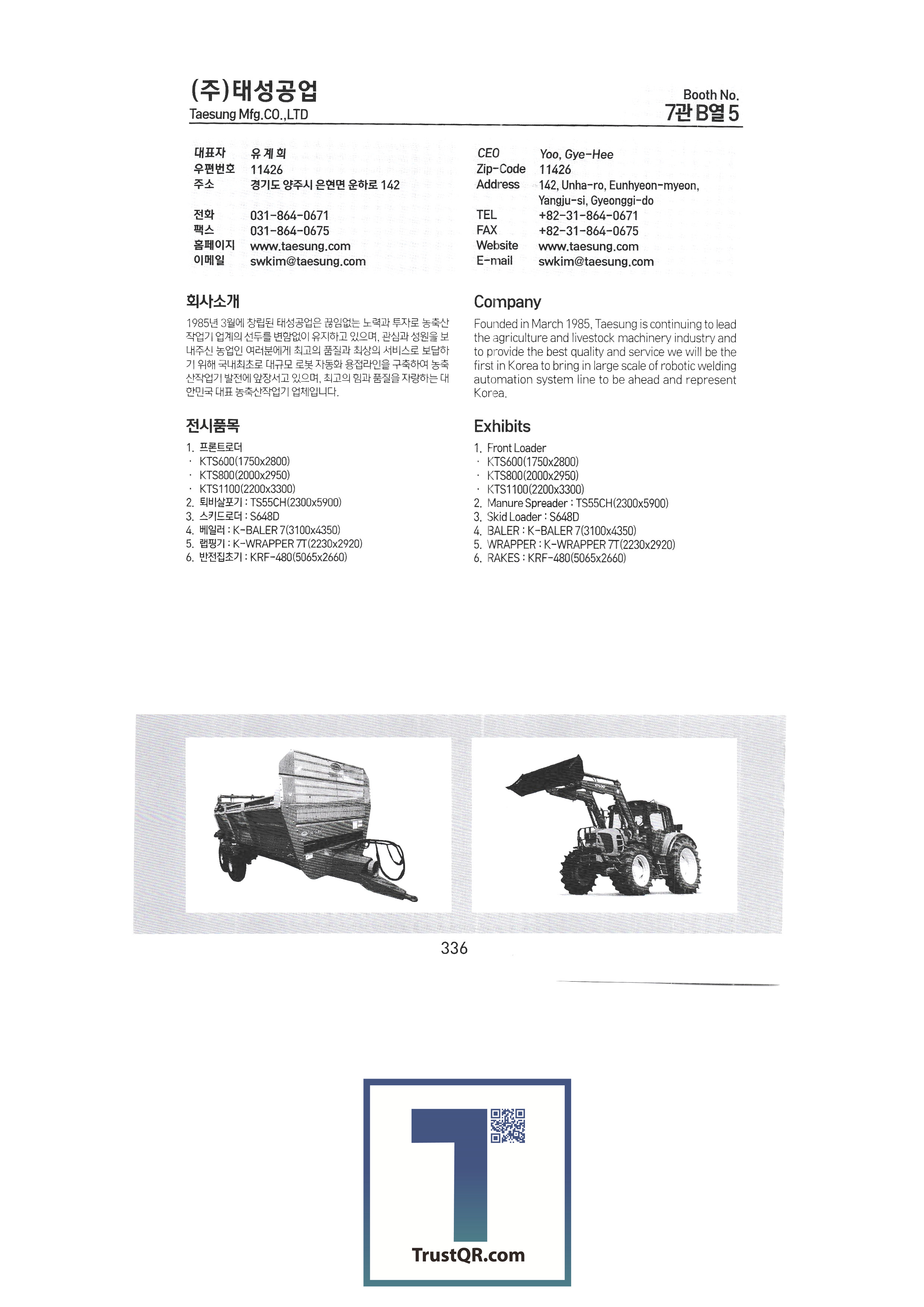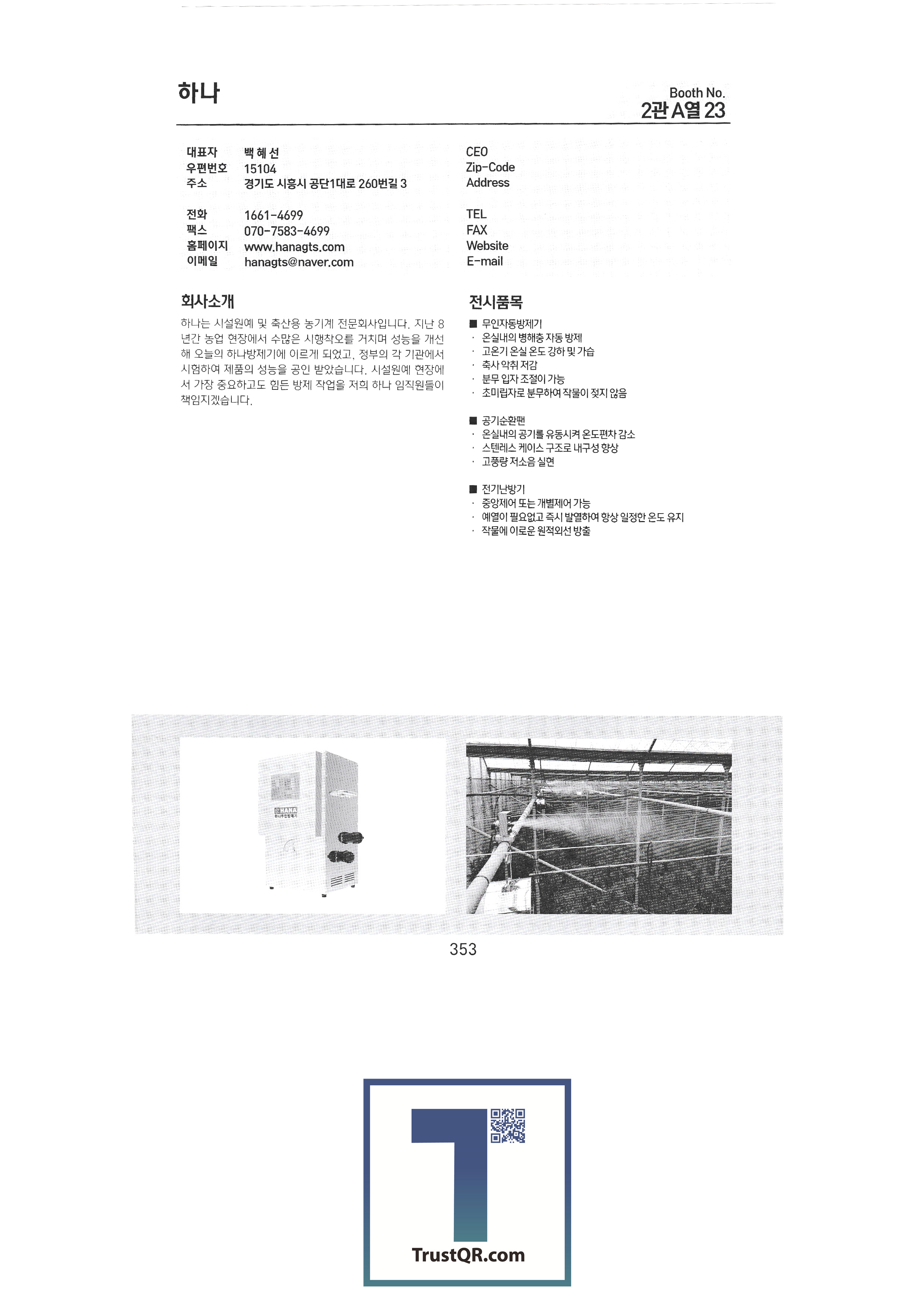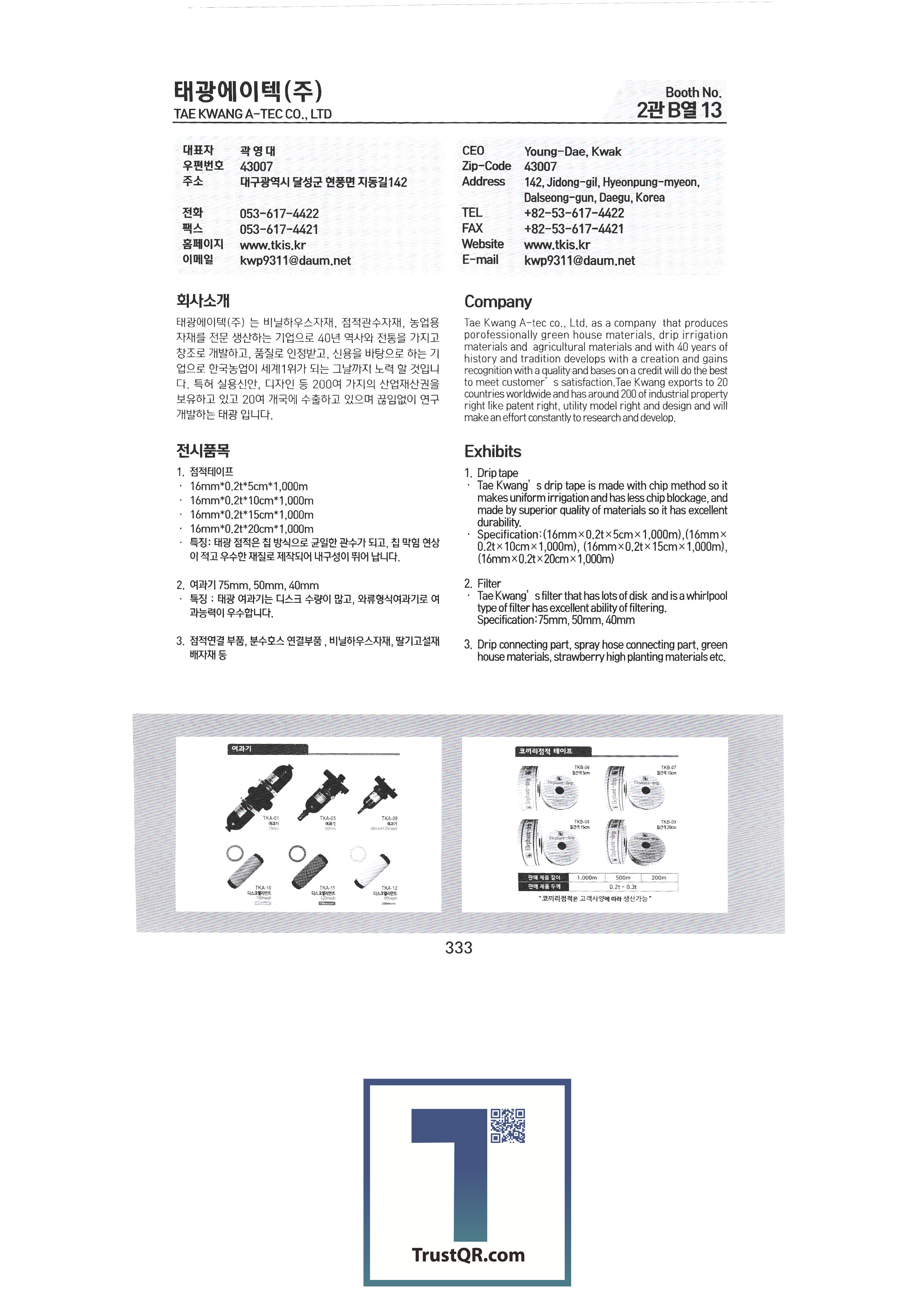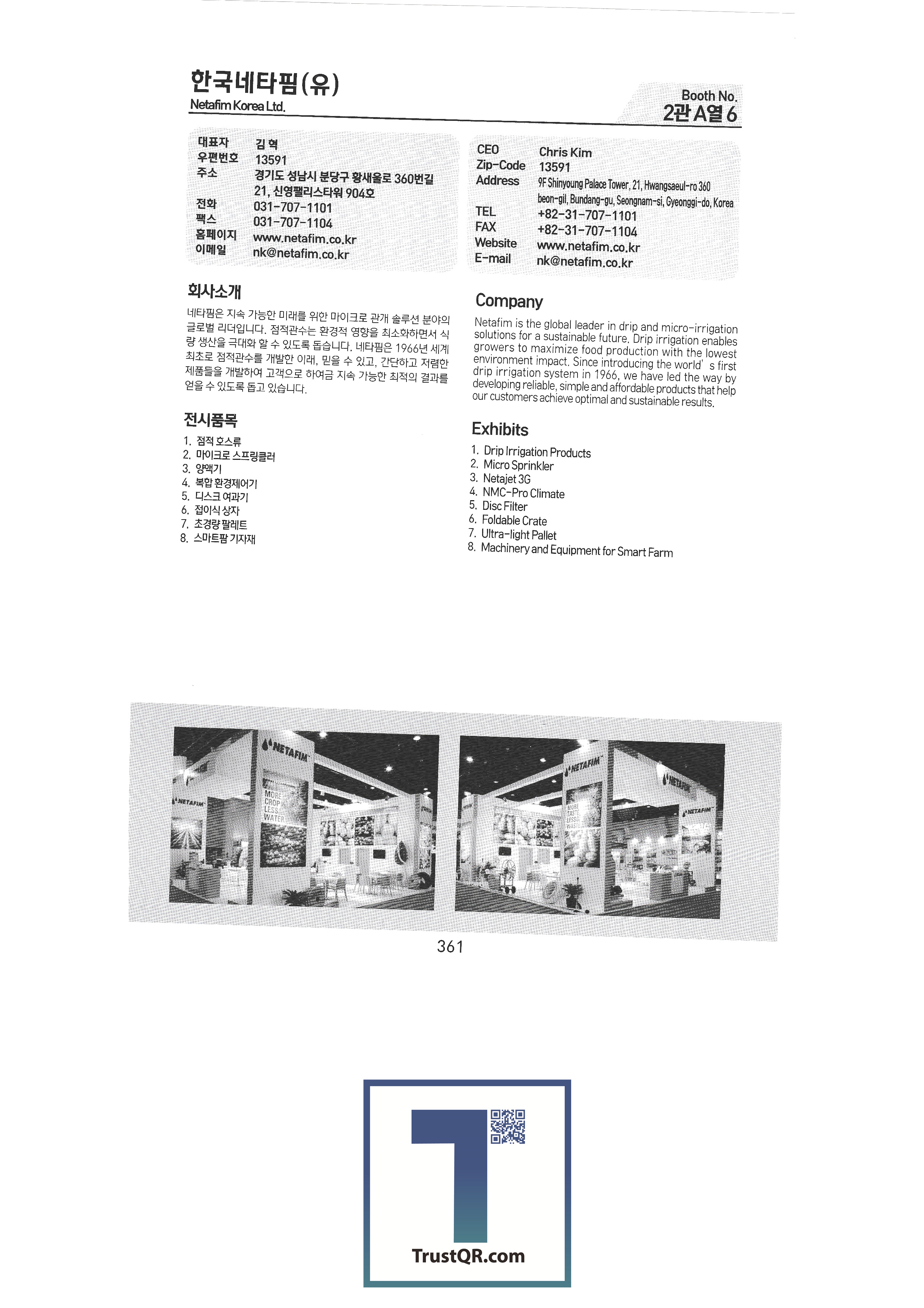 | (유)코리아농업개발/스벤손코리아 ㈜코리아아그로 코리아하이팜 ㈜코리아화스너 코메론 농업회사법인㈜코코스토리 ㈜쿨테이너 ㈜타이아스 탄젠트 코퍼레이션 주식회사 태광공업 태광에이텍㈜ ㈜태광이앤비 태광종합기계 ㈜태성공업 태영산업 태웅농기계 태창농기계 태흥이가공업사 투와이 주식회사 트윈 ㈜특수정밀 티에마 ㈜파워레인 주식회사 파이랜드 ㈜팜한농 풍조농기계 프라임코리아 주식회사 피스 필수기계 ㈜필텍산업 하나 ㈜하나 ㈜하다 하이드로텍㈜ 주식회사 하이롬 ㈜하이온 ㈜하이온코리아 한가람농업개발 한국네타핌(유) 한국농림시스템㈜ |