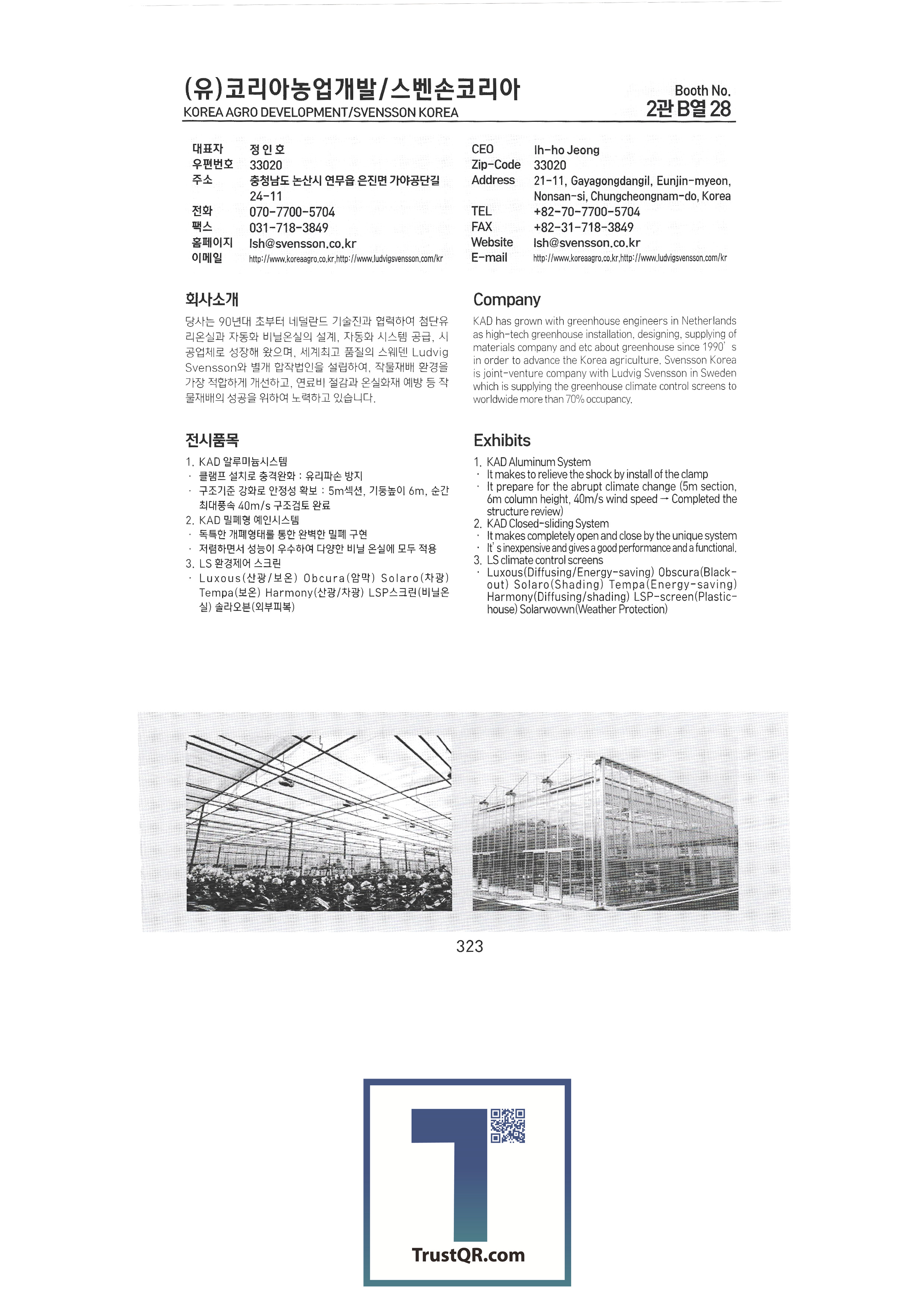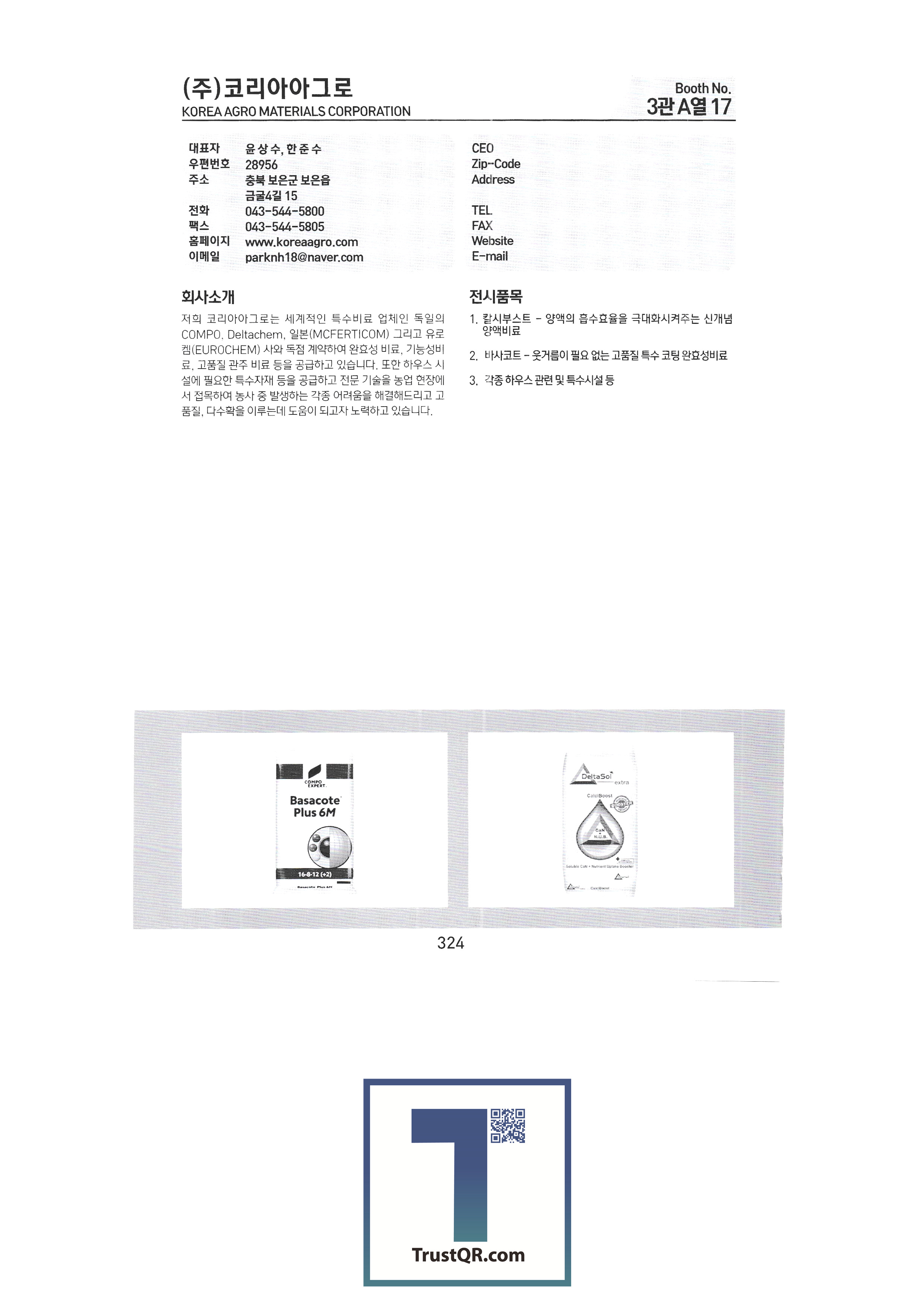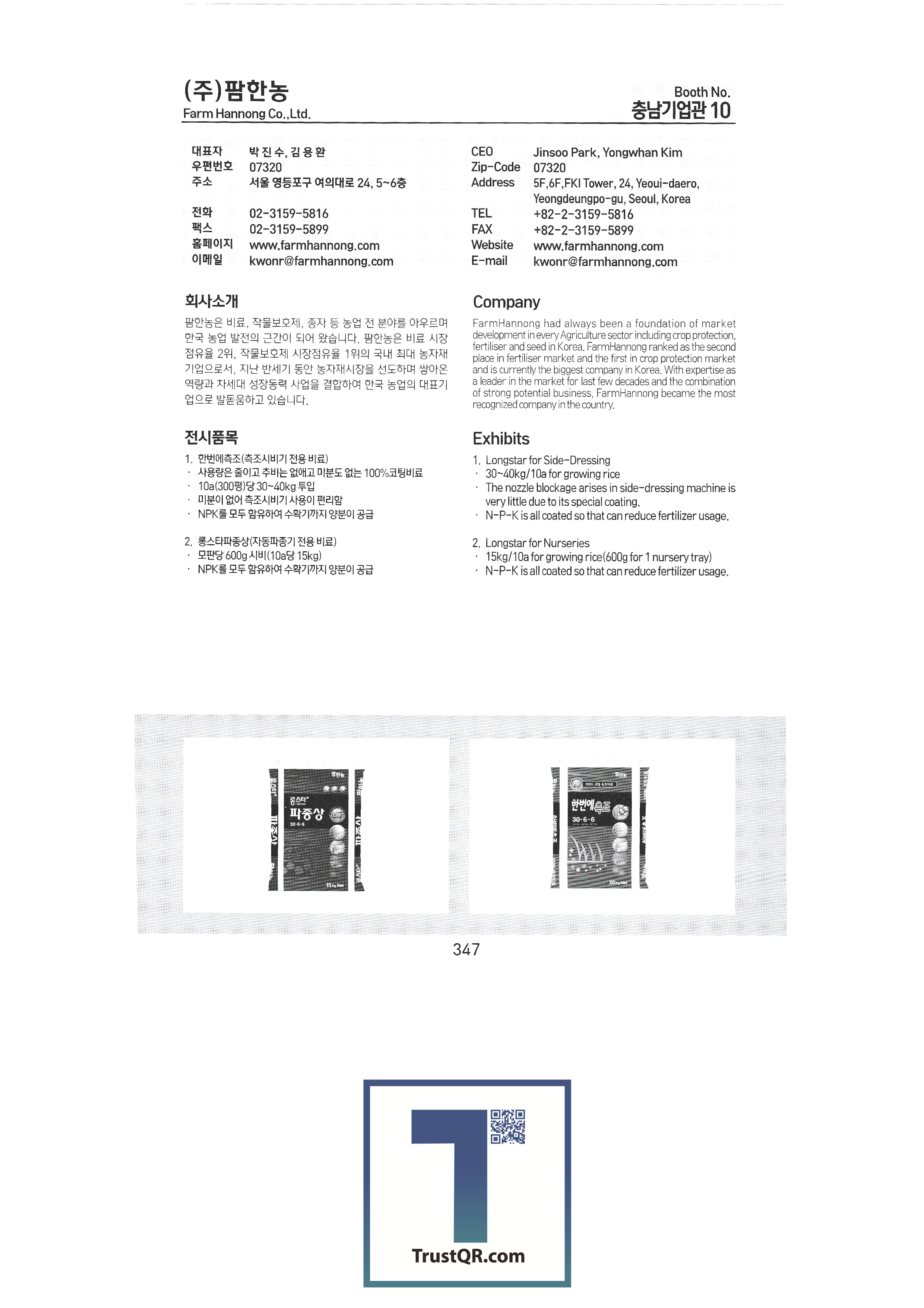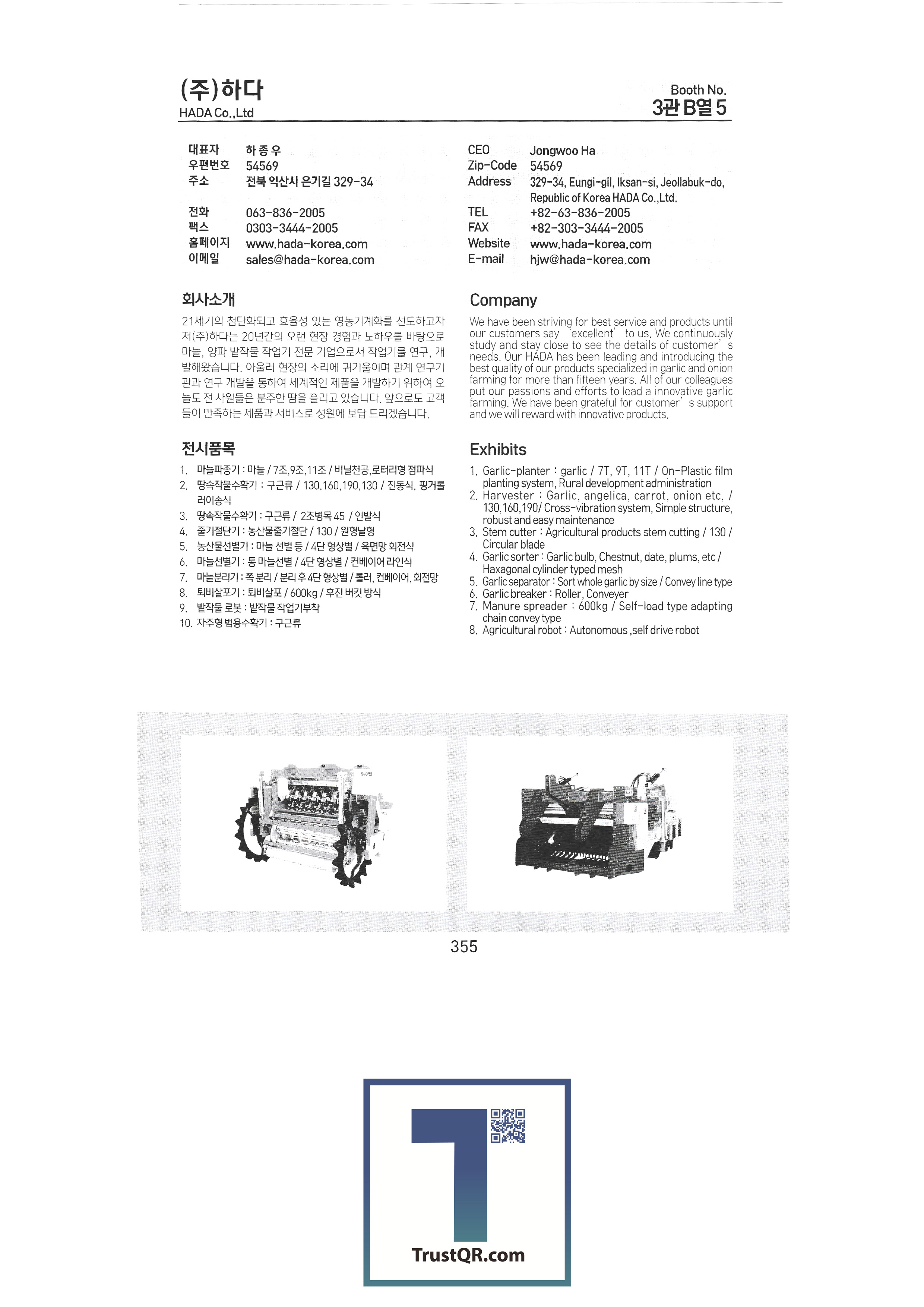 | (유)코리아농업개발/스벤손코리아 ㈜코리아아그로 코리아하이팜 ㈜코리아화스너 코메론 농업회사법인㈜코코스토리 ㈜쿨테이너 ㈜타이아스 탄젠트 코퍼레이션 주식회사 태광공업 태광에이텍㈜ ㈜태광이앤비 태광종합기계 ㈜태성공업 태영산업 태웅농기계 태창농기계 태흥이가공업사 투와이 주식회사 트윈 ㈜특수정밀 티에마 ㈜파워레인 주식회사 파이랜드 ㈜팜한농 풍조농기계 프라임코리아 주식회사 피스 필수기계 ㈜필텍산업 하나 ㈜하나 ㈜하다 하이드로텍㈜ 주식회사 하이롬 ㈜하이온 ㈜하이온코리아 한가람농업개발 한국네타핌(유) 한국농림시스템㈜ |