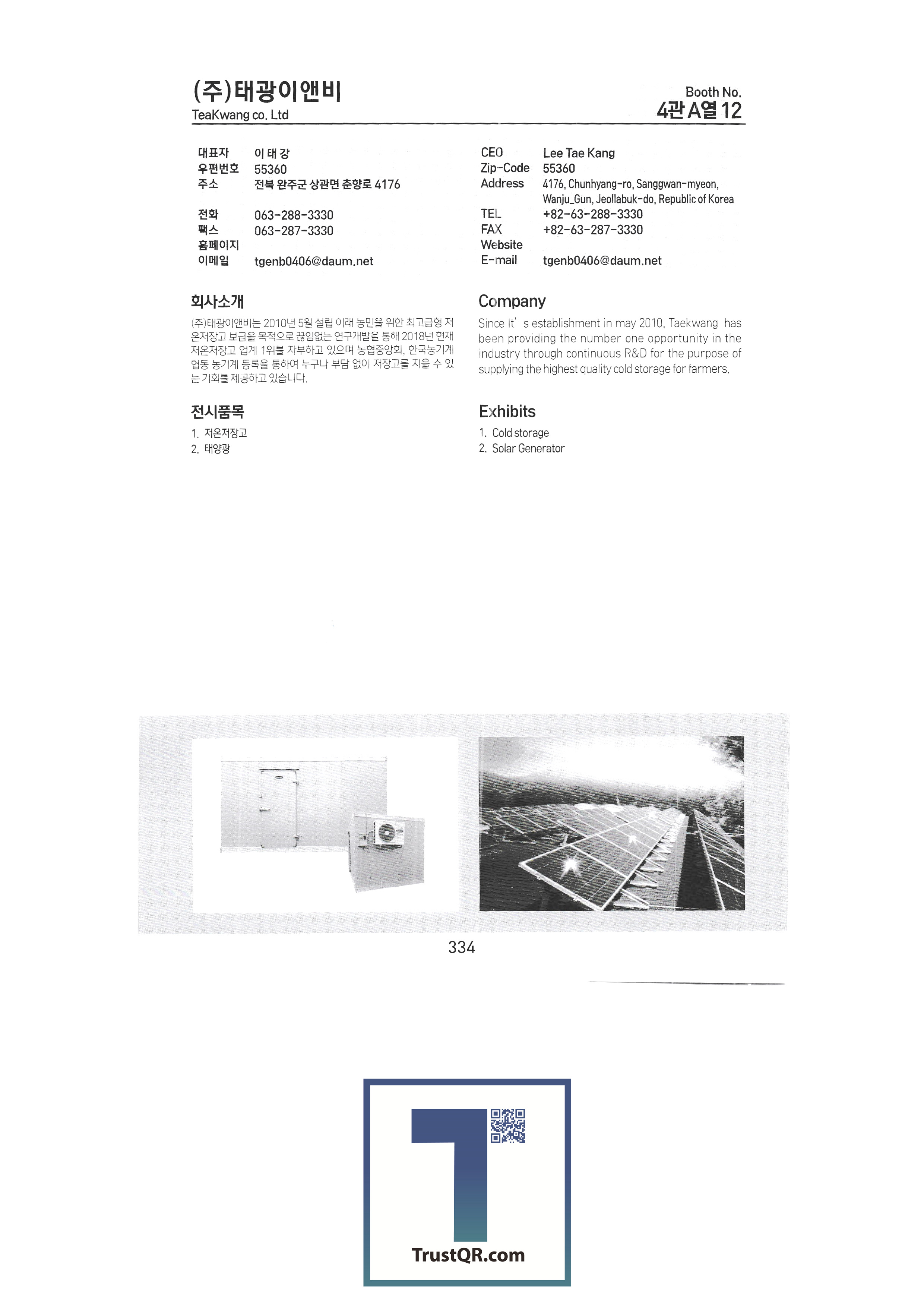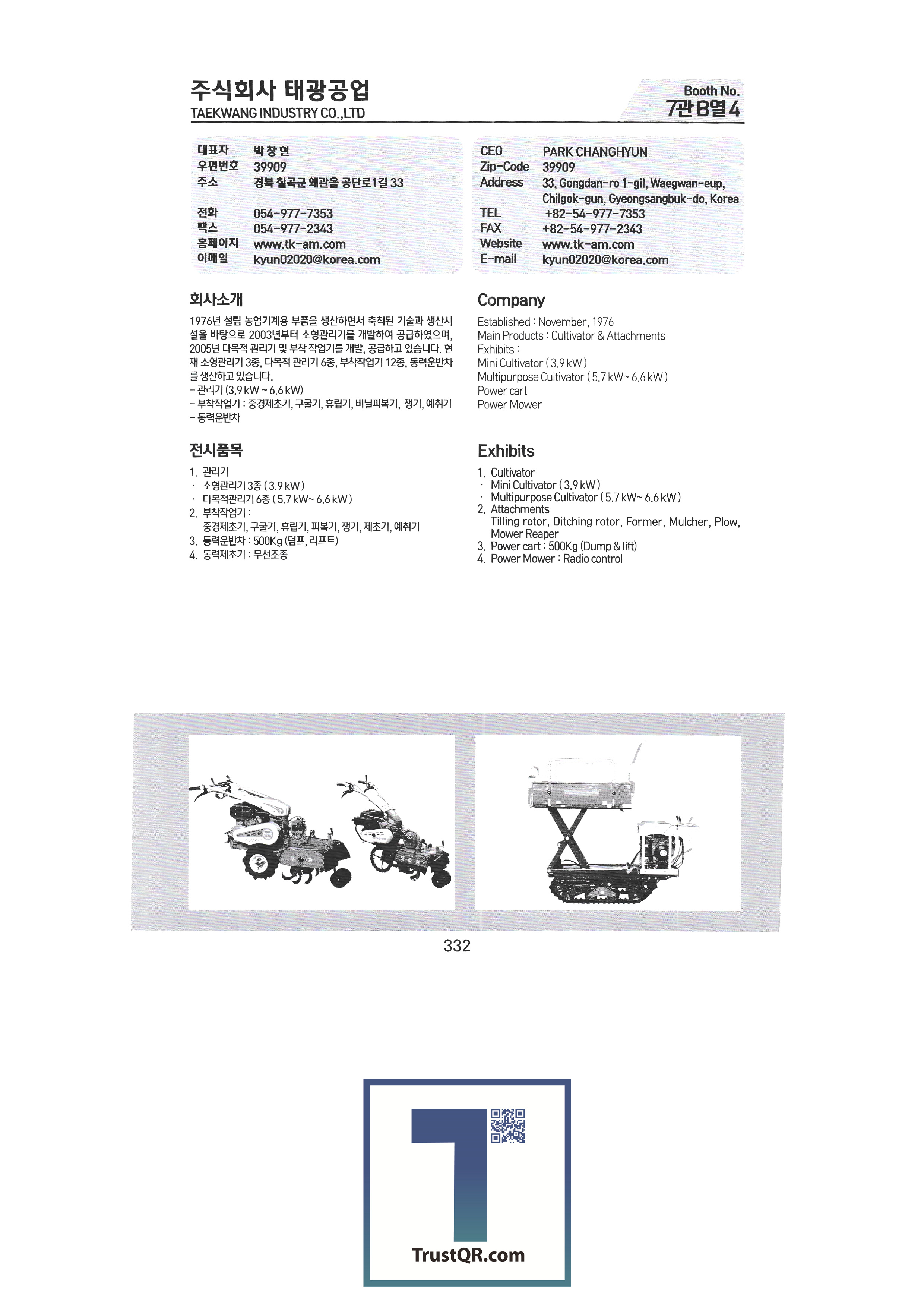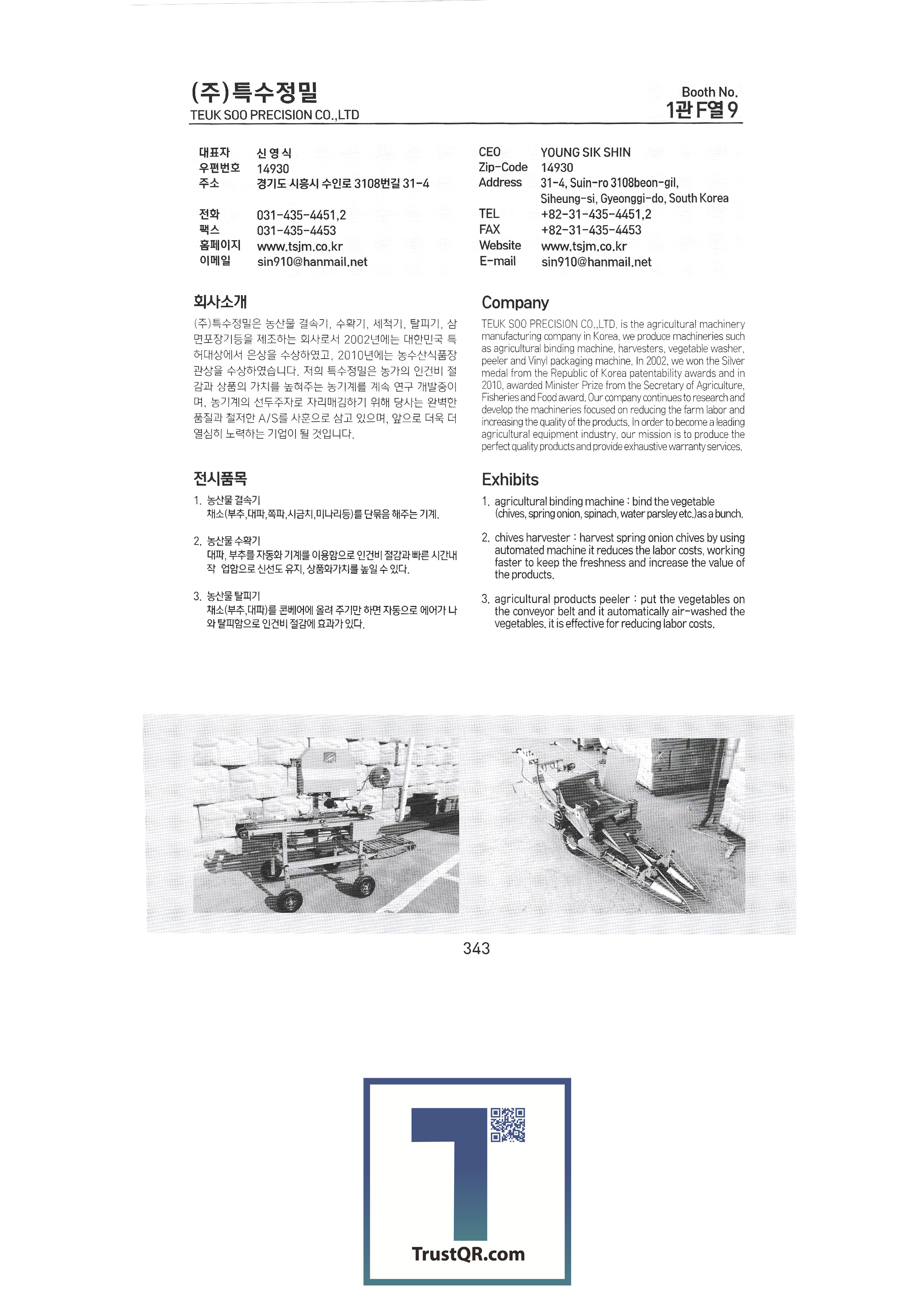 Korea Agricultural Development/Svensson Korea Korea Agro Korea High Farm Korea Fastener Comeron Coco Story, an agricultural corporation Cooltainer Tyas Co., Ltd. Tangent Corporation Taekwang Industrial Co., Ltd. Taekwang Atech Co., Ltd. Taekwang E&B Taekwang General Machinery Taesung Industrial Co., Ltd. Taeyoung Industry Taewoong Agricultural Machinery Taechang Agricultural Machinery Taeheung Yi Processing Company Two-Y Corporation Twin Special Precision Co., Ltd. Thiema Power Lane Pyland Co., Ltd. Farm Hannong Pungjo Agricultural Machinery Prime Korea Peace Co., Ltd. Essential Machine Piltech Industry Co., Ltd. one Hana Co., Ltd. Hada Co., Ltd. Hydrotech Co., Ltd. Hirom Co., Ltd. Heion Co., Ltd. Heion Korea Hangaram Agricultural Development Korea Netafim (Yu) Korea Agriculture and Forestry System Co., Ltd. |