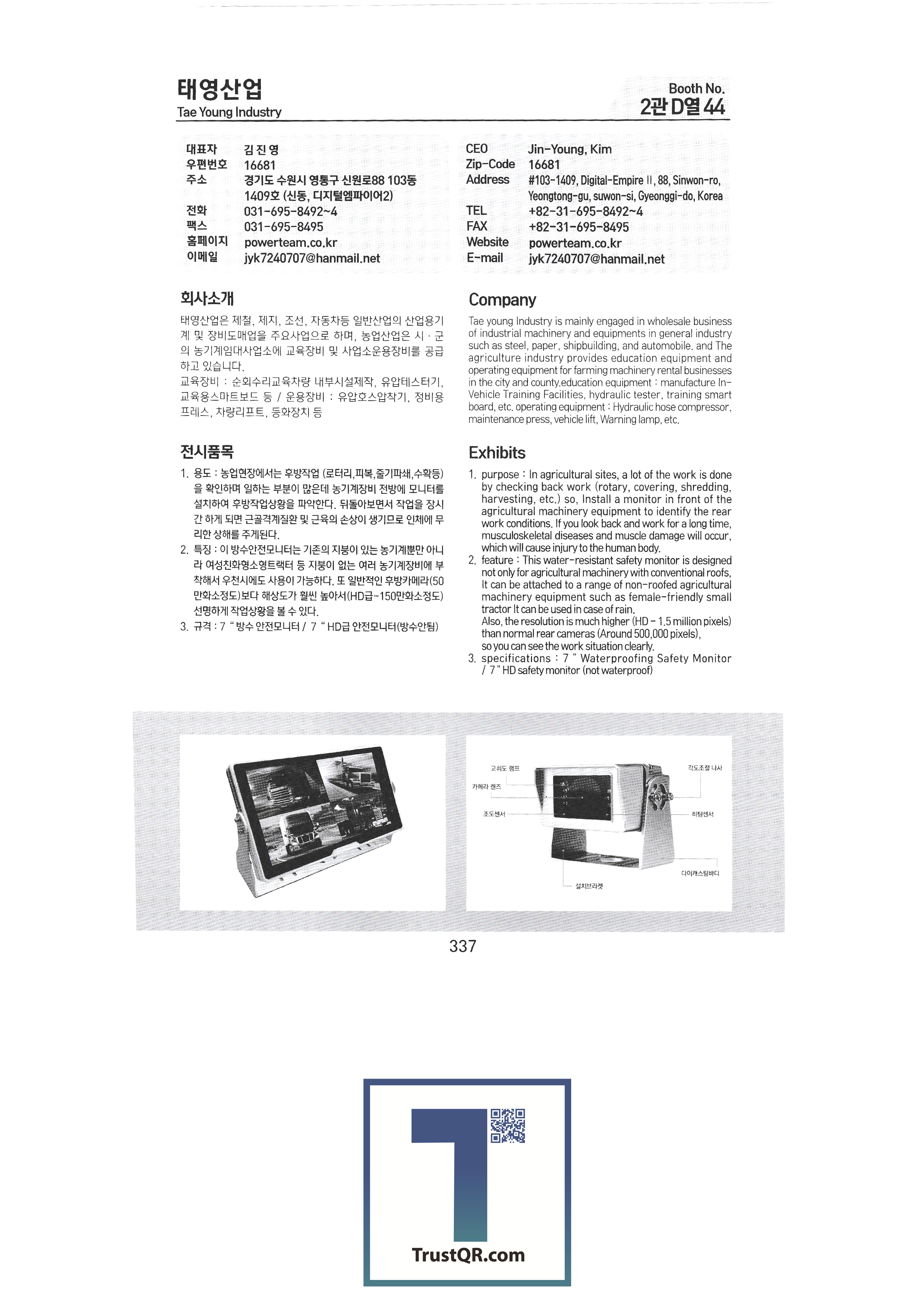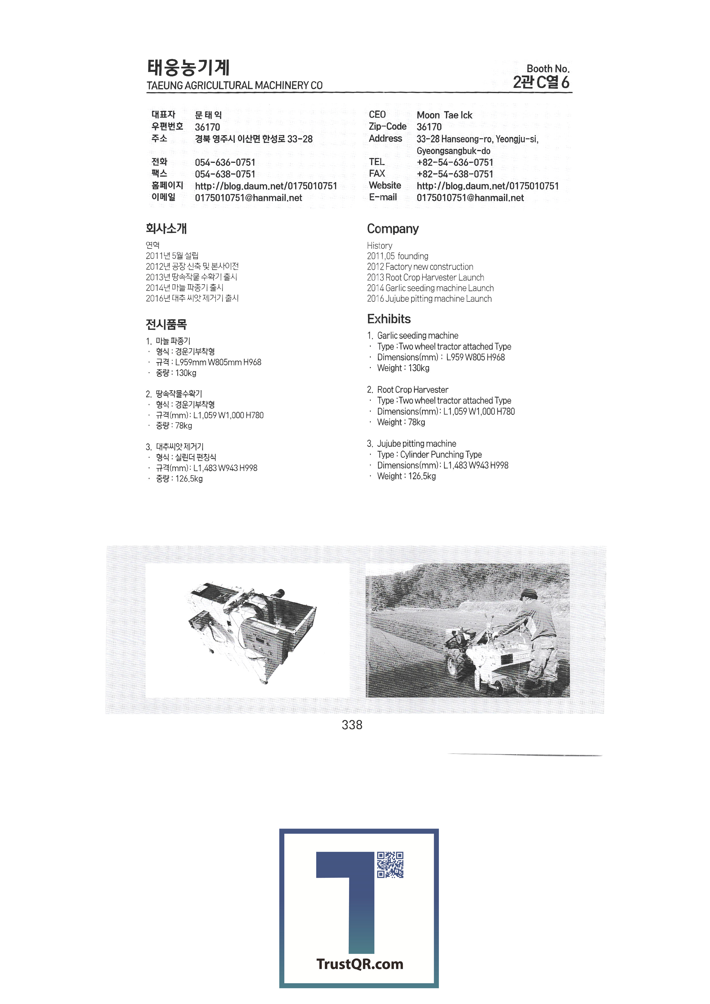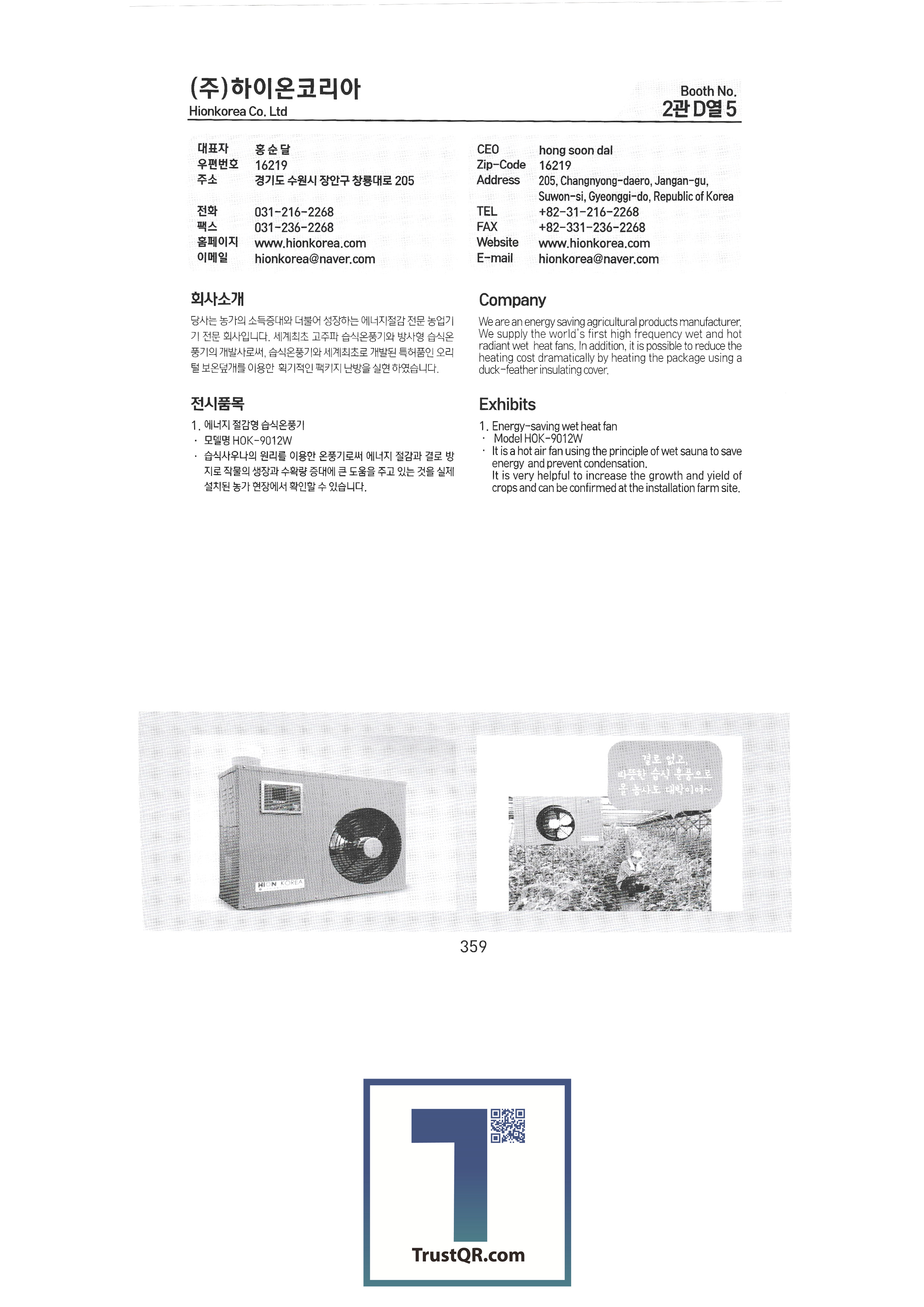 Korea Agricultural Development/Svensson Korea Korea Agro Korea High Farm Korea Fastener Comeron Coco Story, an agricultural corporation Cooltainer Tyas Co., Ltd. Tangent Corporation Taekwang Industrial Co., Ltd. Taekwang Atech Co., Ltd. Taekwang E&B Taekwang General Machinery Taesung Industrial Co., Ltd. Taeyoung Industry Taewoong Agricultural Machinery Taechang Agricultural Machinery Taeheung Yi Processing Company Two-Y Corporation Twin Special Precision Co., Ltd. Thiema Power Lane Pyland Co., Ltd. Farm Hannong Pungjo Agricultural Machinery Prime Korea Peace Co., Ltd. Essential Machine Piltech Industry Co., Ltd. one Hana Co., Ltd. Hada Co., Ltd. Hydrotech Co., Ltd. Hirom Co., Ltd. Heion Co., Ltd. Heion Korea Hangaram Agricultural Development Korea Netafim (Yu) Korea Agriculture and Forestry System Co., Ltd. |