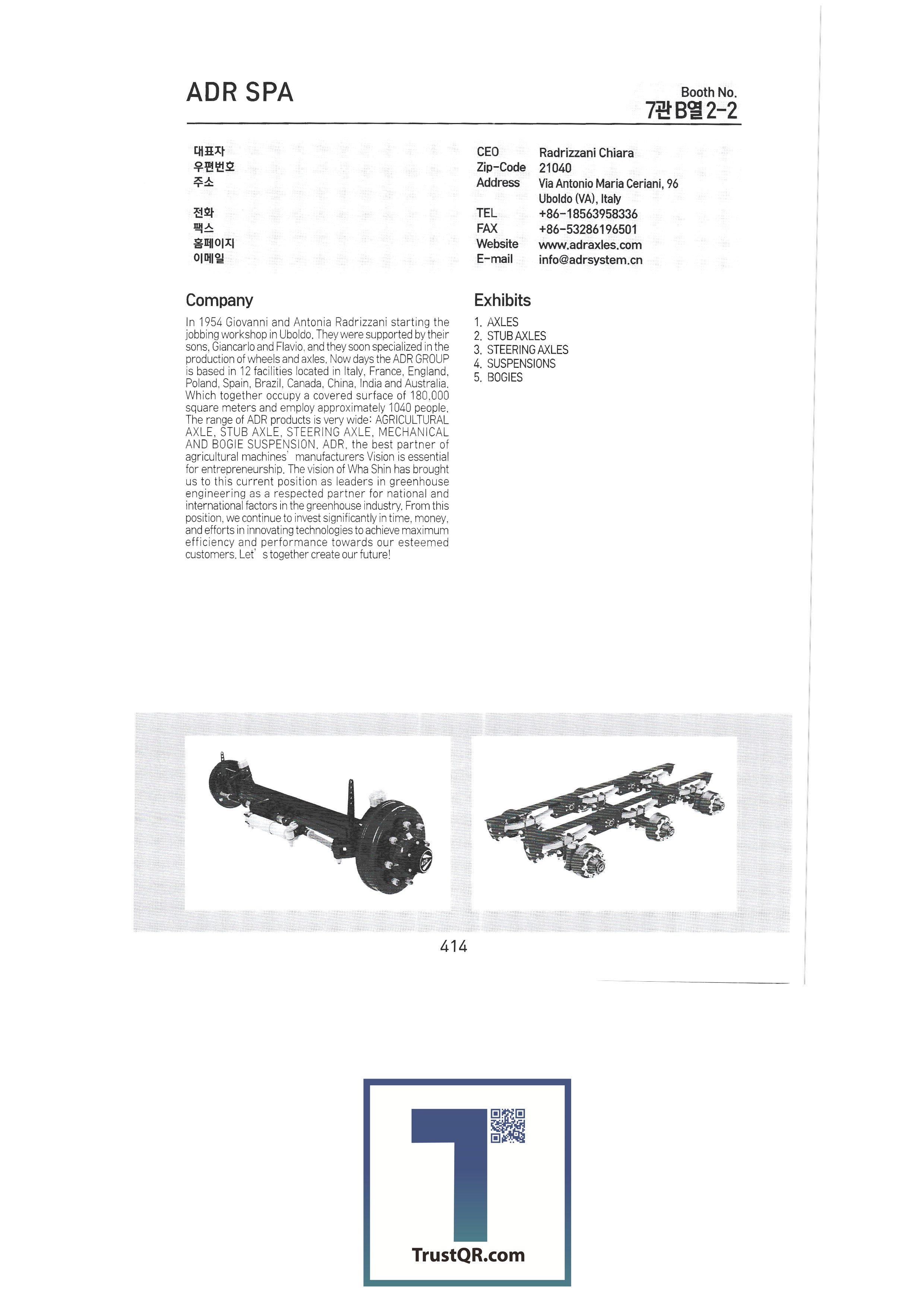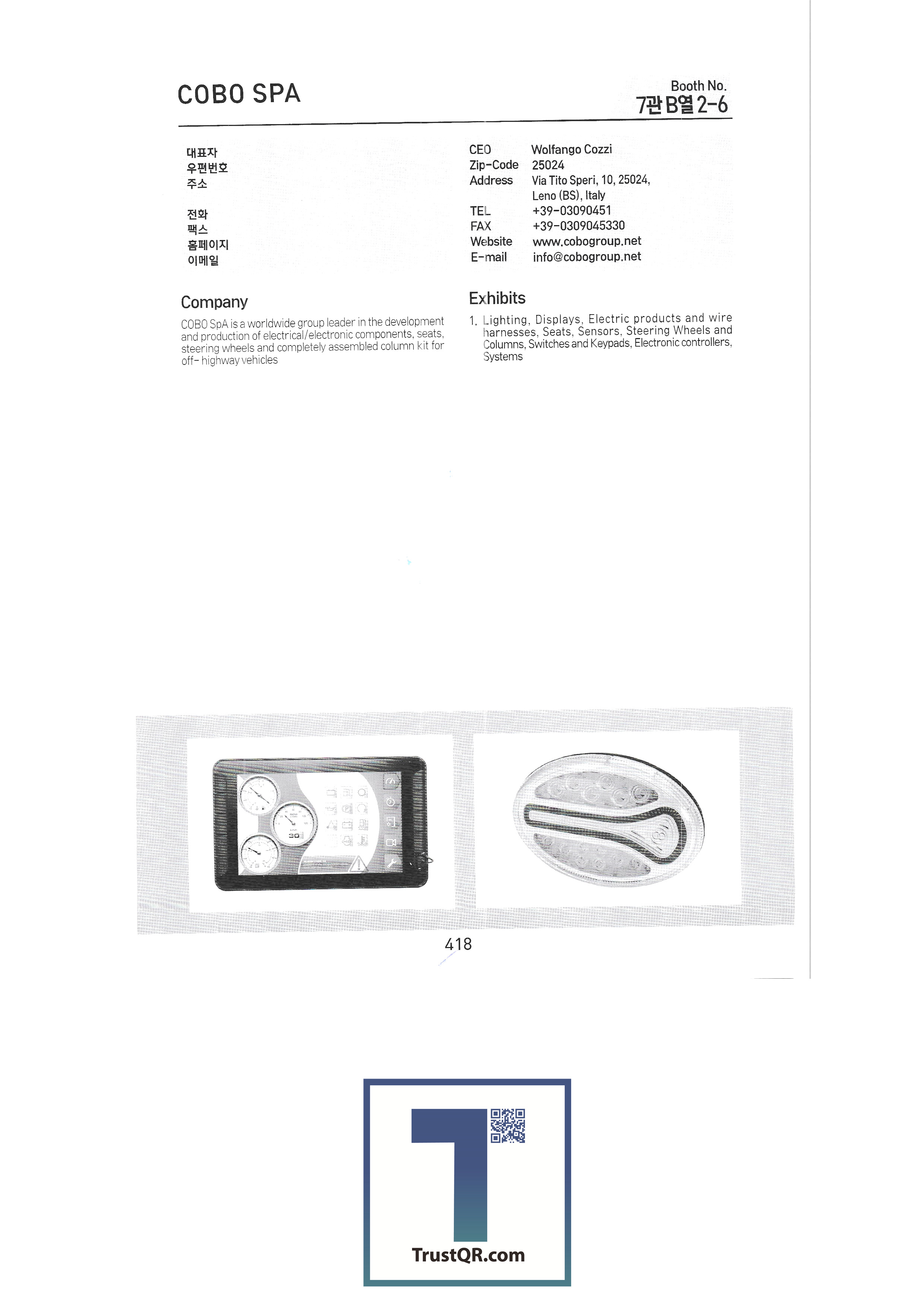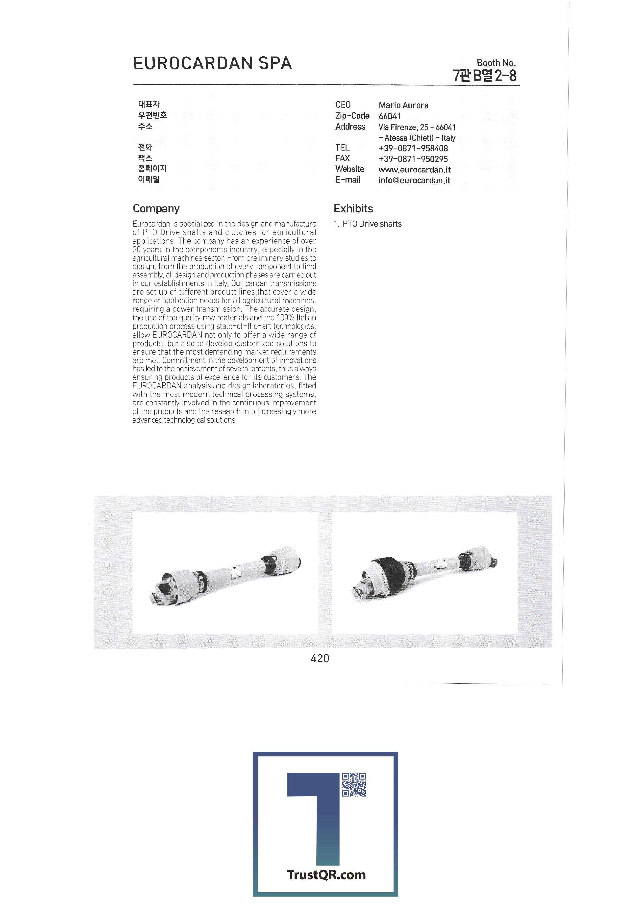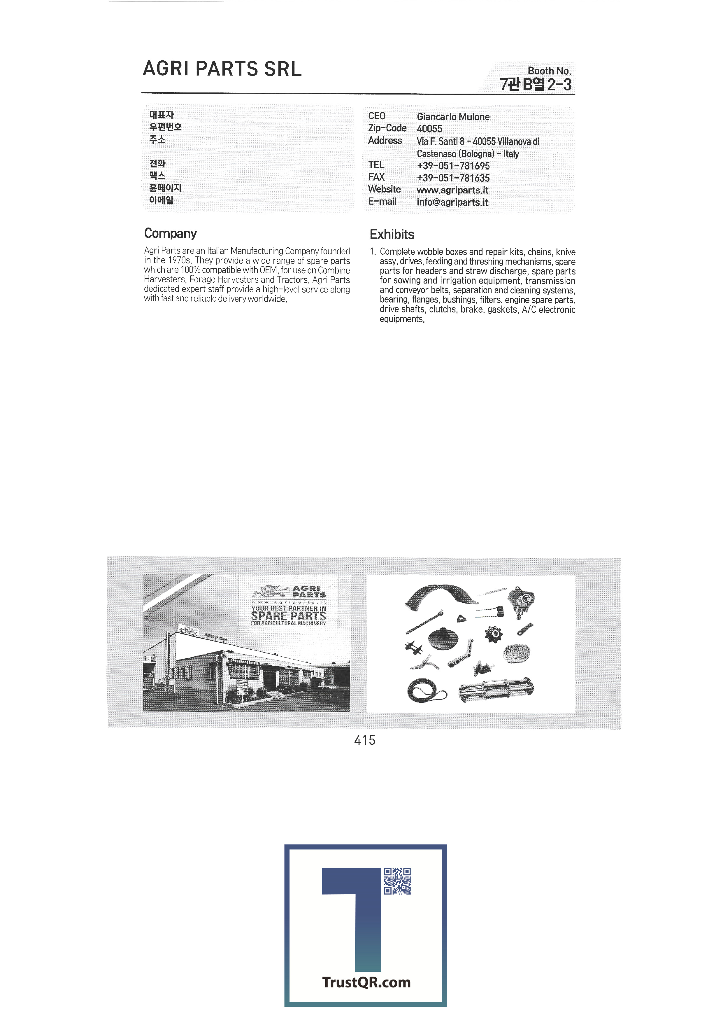 Mifuco / Netherlands Mifuco Seed Co., Ltd. / Netherlands Mifuco Green / Netherlands Certhon / Netherlands Corporation / Netherlands LOGIQS B.V. / Netherlands Delphy BV / Netherlands CogaskoreaB.V / Netherlands Poclain Hydraulics / France ADR SPA / Italy AGRI PARTS SRL / Italy AMA SPA / Italy ANNOVI REVERBERI SPA / Italy COBO SPA / Italy COMET SpA / Italy EUROCARDAN SPA / Italy FEDERUNACOMA / Italy IMOBILLI POMPE SRL / Italy ITALIAN TRADE COMMISSION-Seoul Office / Italy ZAPPETTIFICIO MUZZI SCARL / Italy IE-IE CORPORATION / Taiwan TAIWAN AGRICULTURAL MACHINERY MANUFACTURERS' / Taiwan CHIA WANG OIL HYDRUALIC INDUSTRIAL CO / Taiwan TAIWAN SHENNONG SOCIAL ENTERPRISE CORP., / Taiwan Jyen Herr Enterprise Co. Ltd. / Taiwan SUNCUE COMPANY LTD. / Taiwan MAX CO.,LTD / Japan HANGZHOU XIAOSHAN HONGQI FRICTION MATERIALCO.,LTD / China SHANDONG BOFA POWER MACHINERY CO.,LTD / China Zhejiang Changheng Machinery Co., Ltd. / China Yantai Future Automatic Equipments Co.,Ltd / China TAIZHOU SHENGSHI YUANLIN MECHANICAL AND ELECTRICAL TECHNOLOGY CO.,LTD. / China Eunsung Tech Co., Ltd. Jangshin Industry Co., Ltd. YM International Daegeon Metal Daemyung Korea Daeil Trading Korea Kuboda Co., Ltd. Baekam Corporation |
