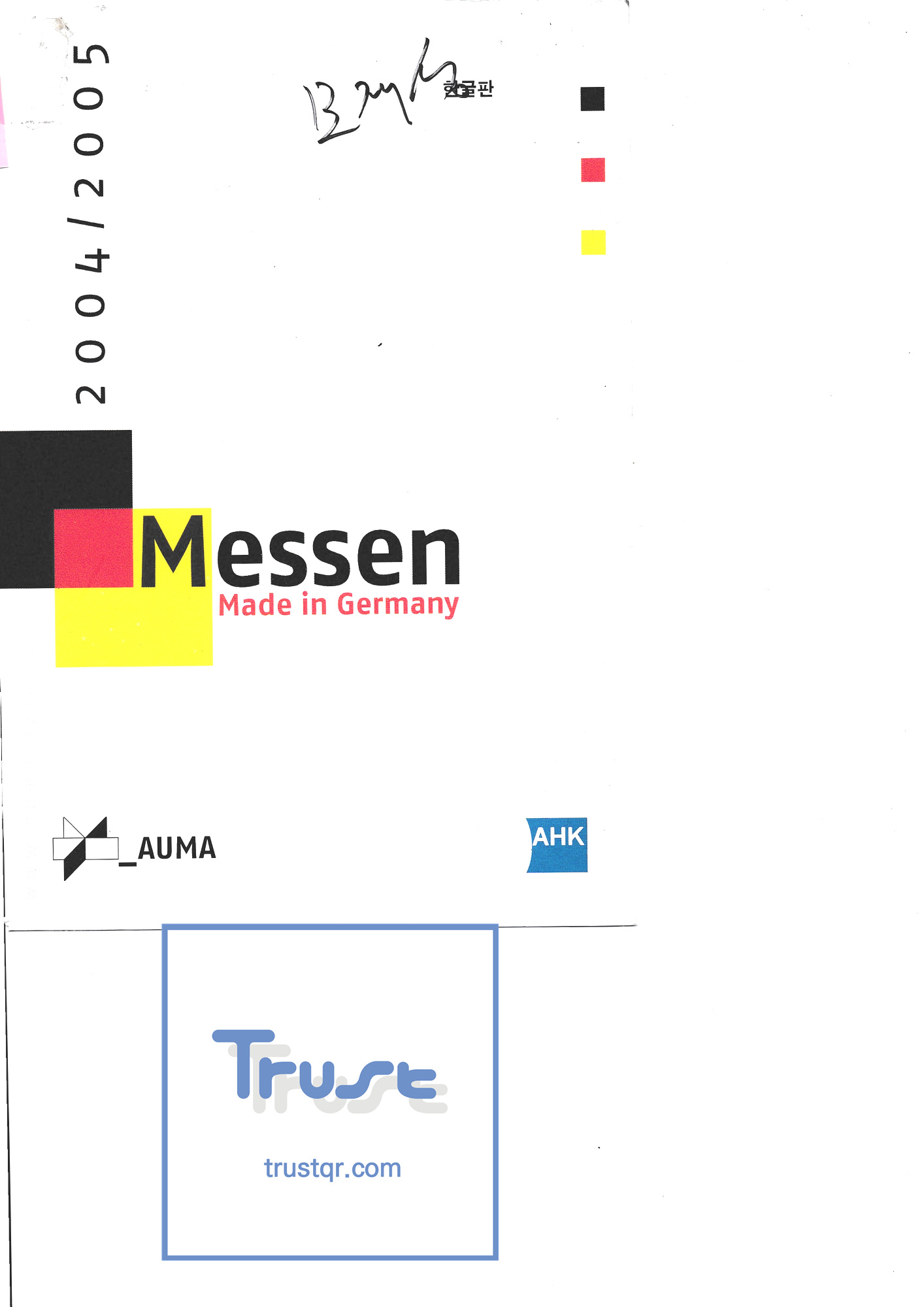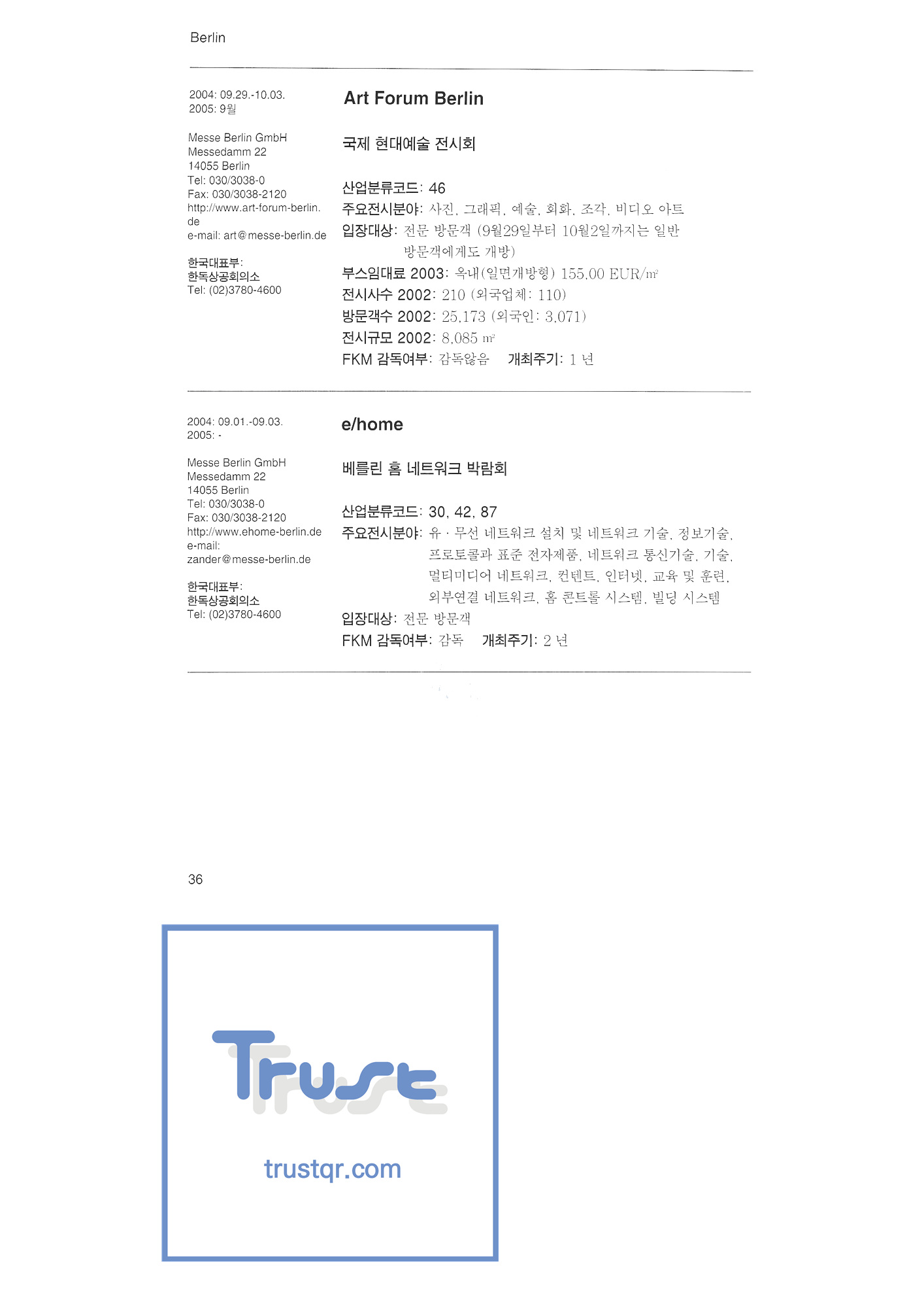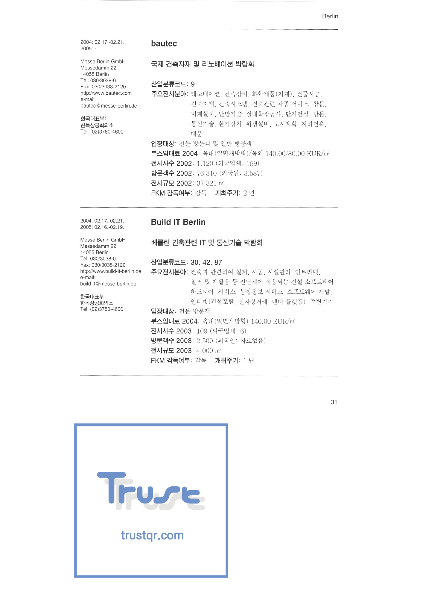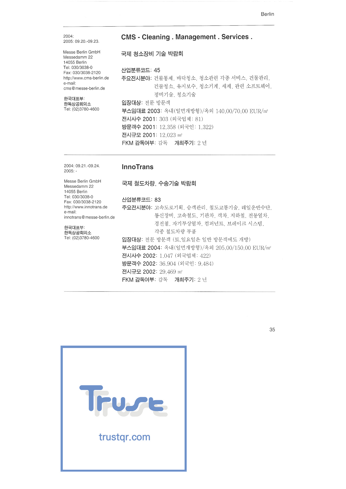 | 독일박람회 2004/2005 국제 분쇄기술 박람회 국제 엘리베이터 박람회 국제 농,수,축산,원예박람회 국제 과일 및 야채 유통 박람회 국제 건축자재 및 리노베이션 박람회 베를린 건축관련 및 리노베이션 박람회 베를린 건축관련 IT 및 통신기술 박람회 국제관광박람회 국제상수공금및물박람회/국제가스공급박람회 국제항공우주및기술박람회 국제공연사업및미디어기술박람회 국제가전및멀티미디어박람회 국제청소장비기술박람회 국제철도차량,수송기술박람회 국제현대기술전시회 베를린홈네트워크박람회 국제해산물및해산식품박람회 국제담배및흡연액세사리박람회 |