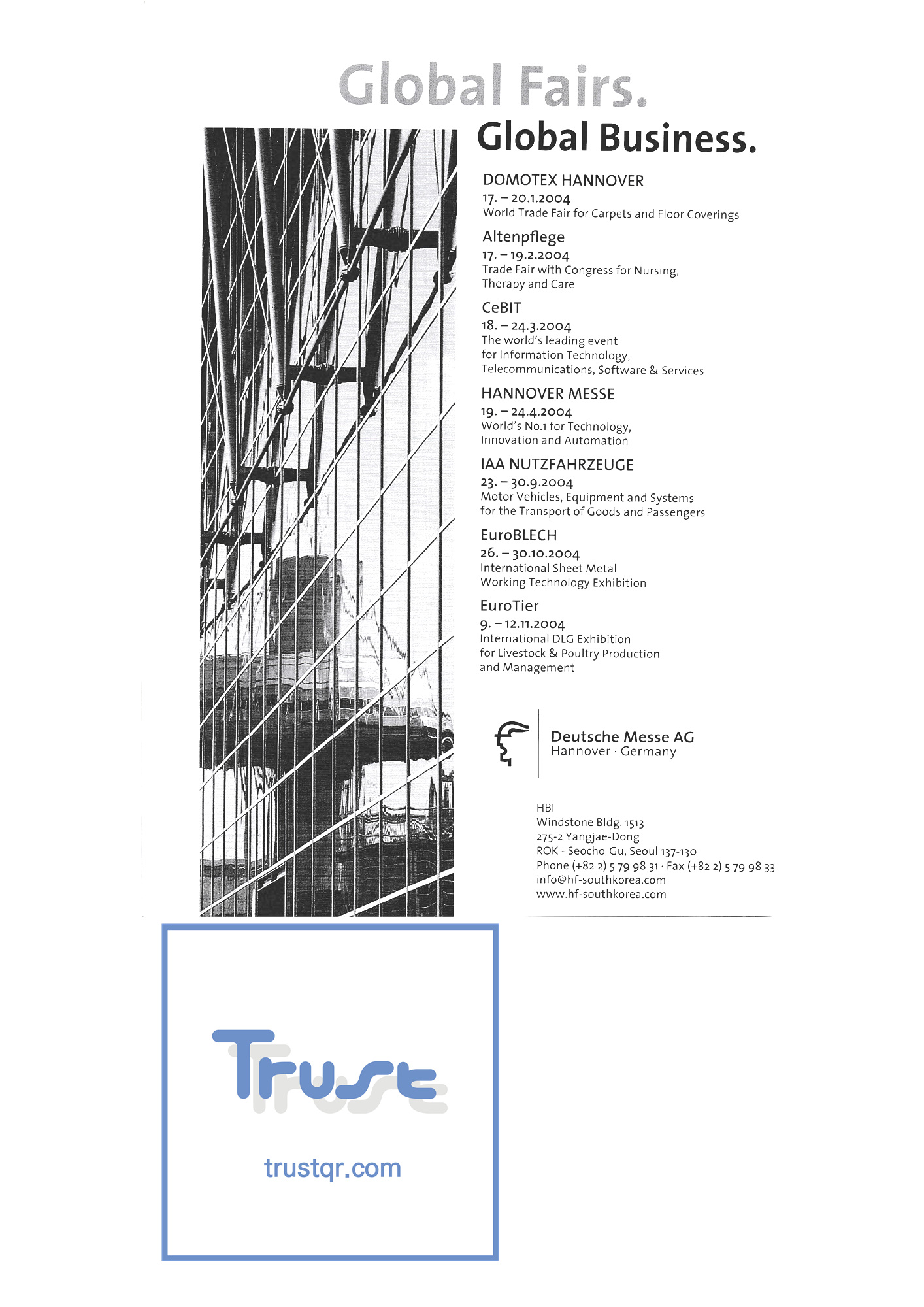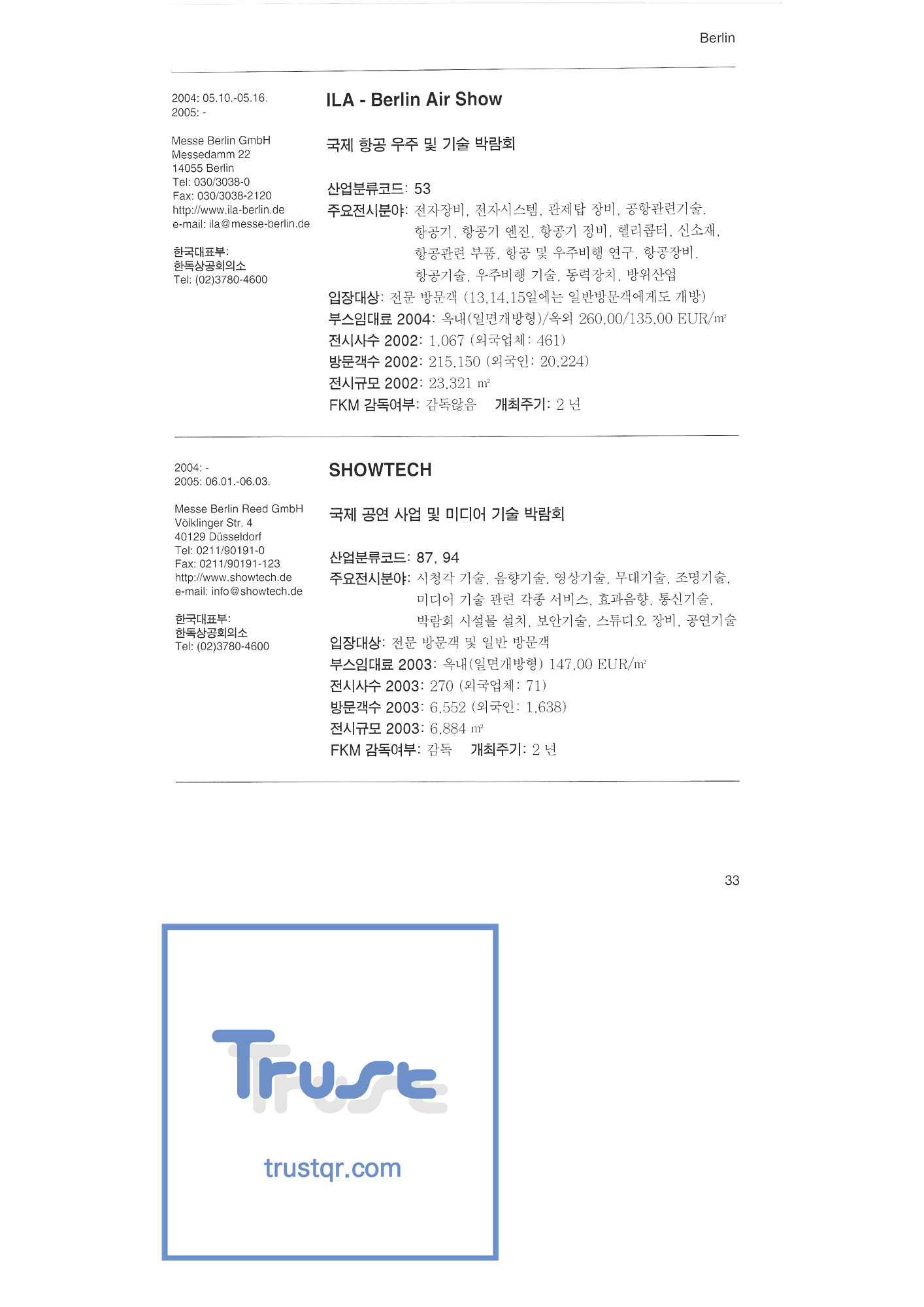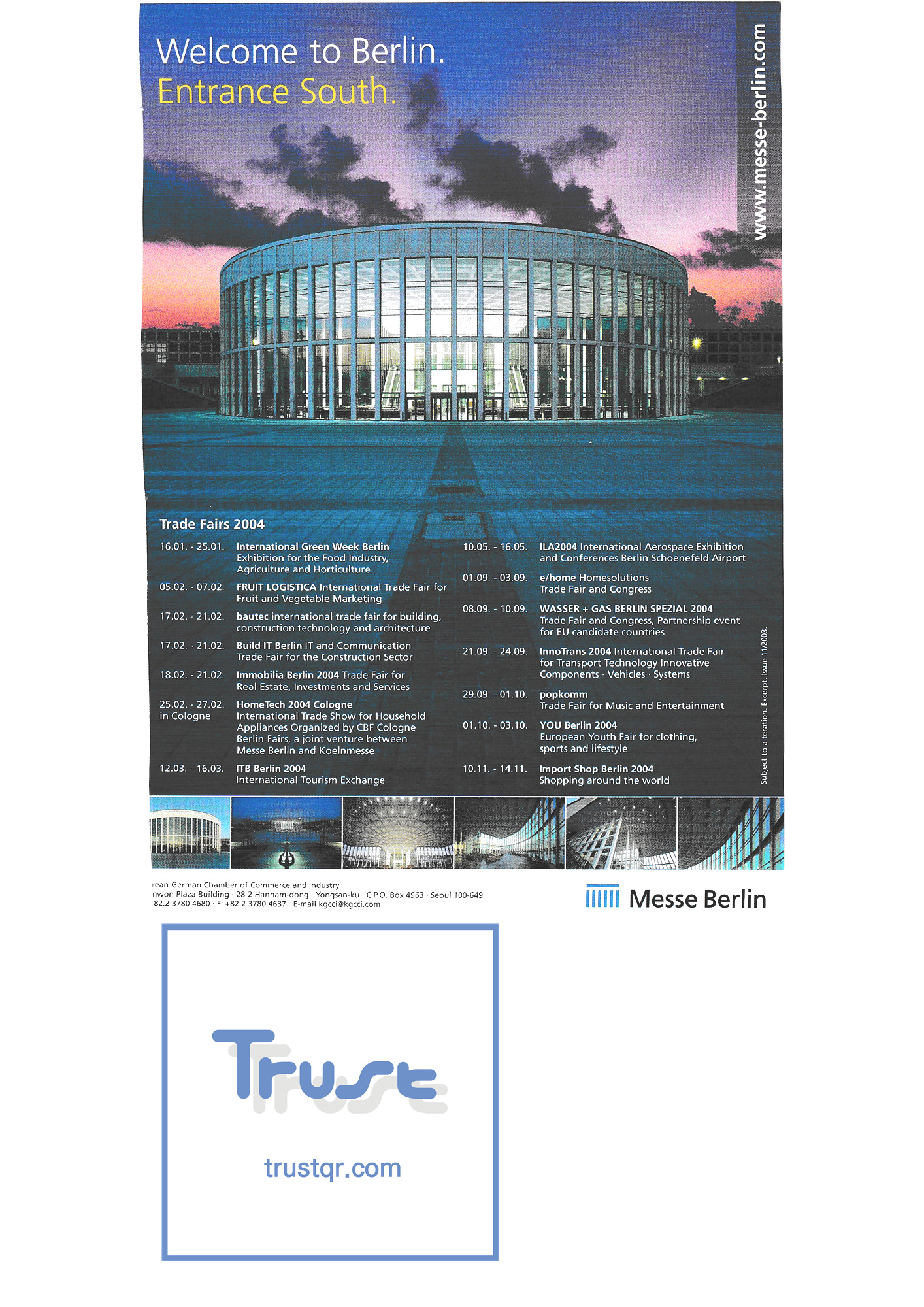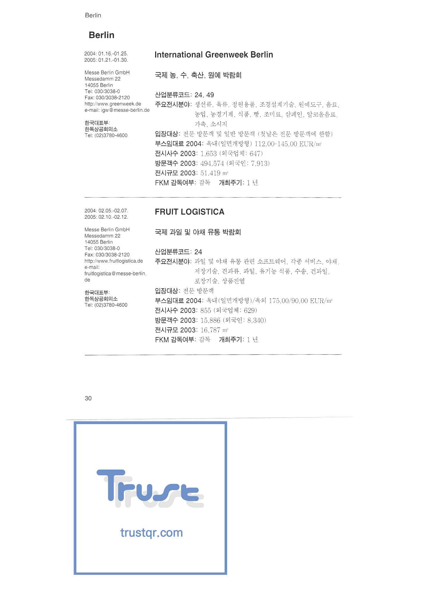 | 독일박람회 2004/2005 국제 분쇄기술 박람회 국제 엘리베이터 박람회 국제 농,수,축산,원예박람회 국제 과일 및 야채 유통 박람회 국제 건축자재 및 리노베이션 박람회 베를린 건축관련 및 리노베이션 박람회 베를린 건축관련 IT 및 통신기술 박람회 국제관광박람회 국제상수공금및물박람회/국제가스공급박람회 국제항공우주및기술박람회 국제공연사업및미디어기술박람회 국제가전및멀티미디어박람회 국제청소장비기술박람회 국제철도차량,수송기술박람회 국제현대기술전시회 베를린홈네트워크박람회 국제해산물및해산식품박람회 국제담배및흡연액세사리박람회 |