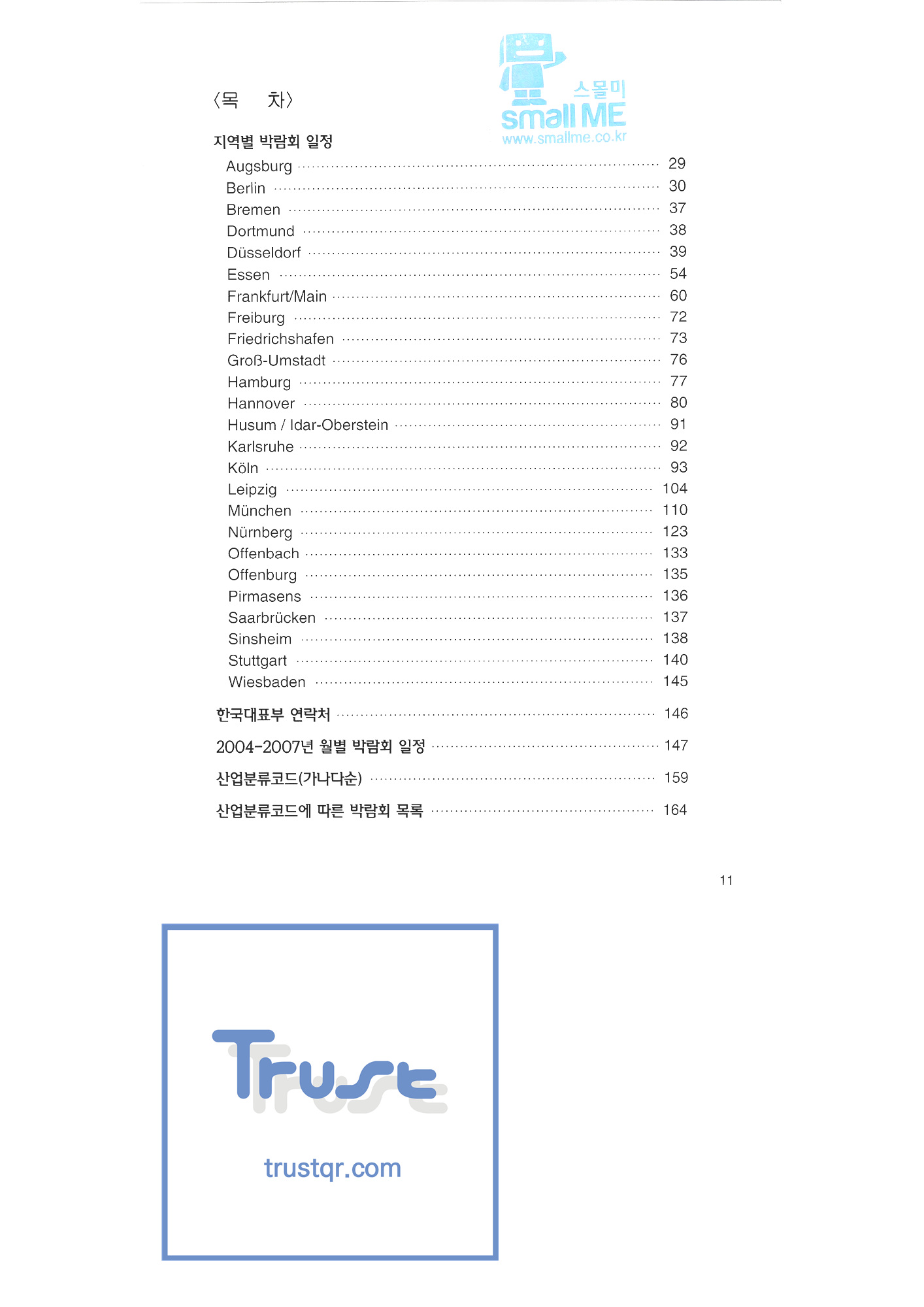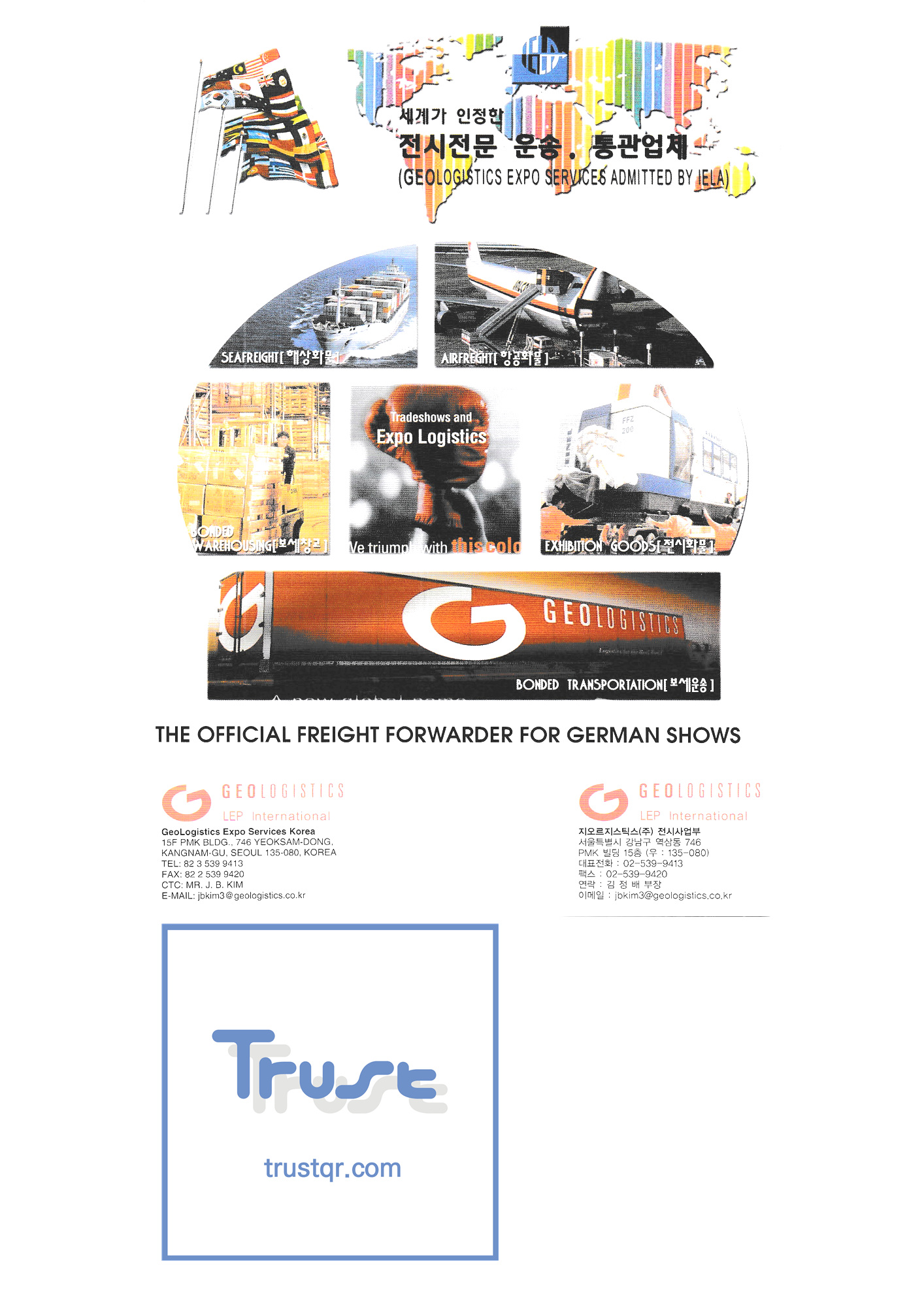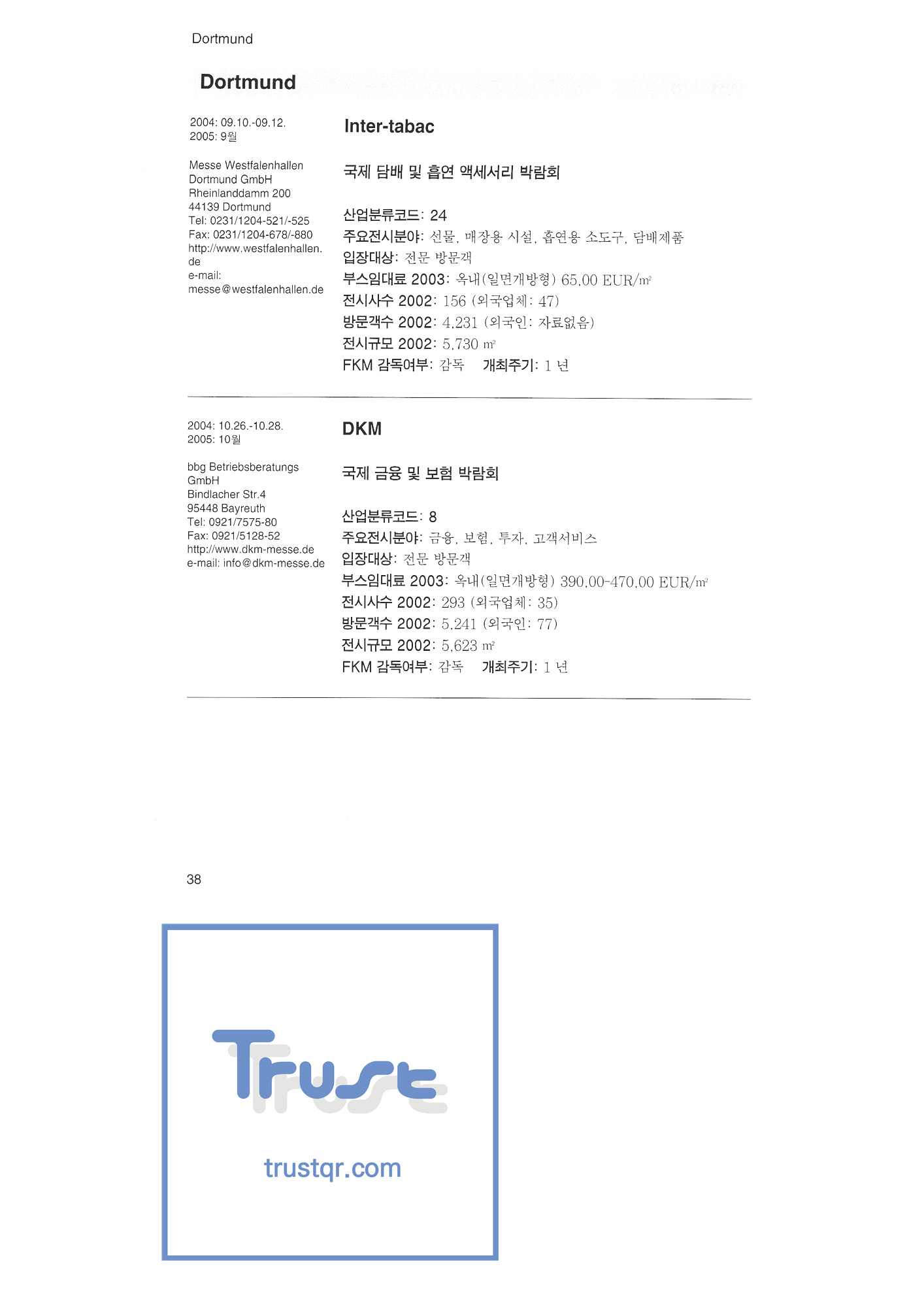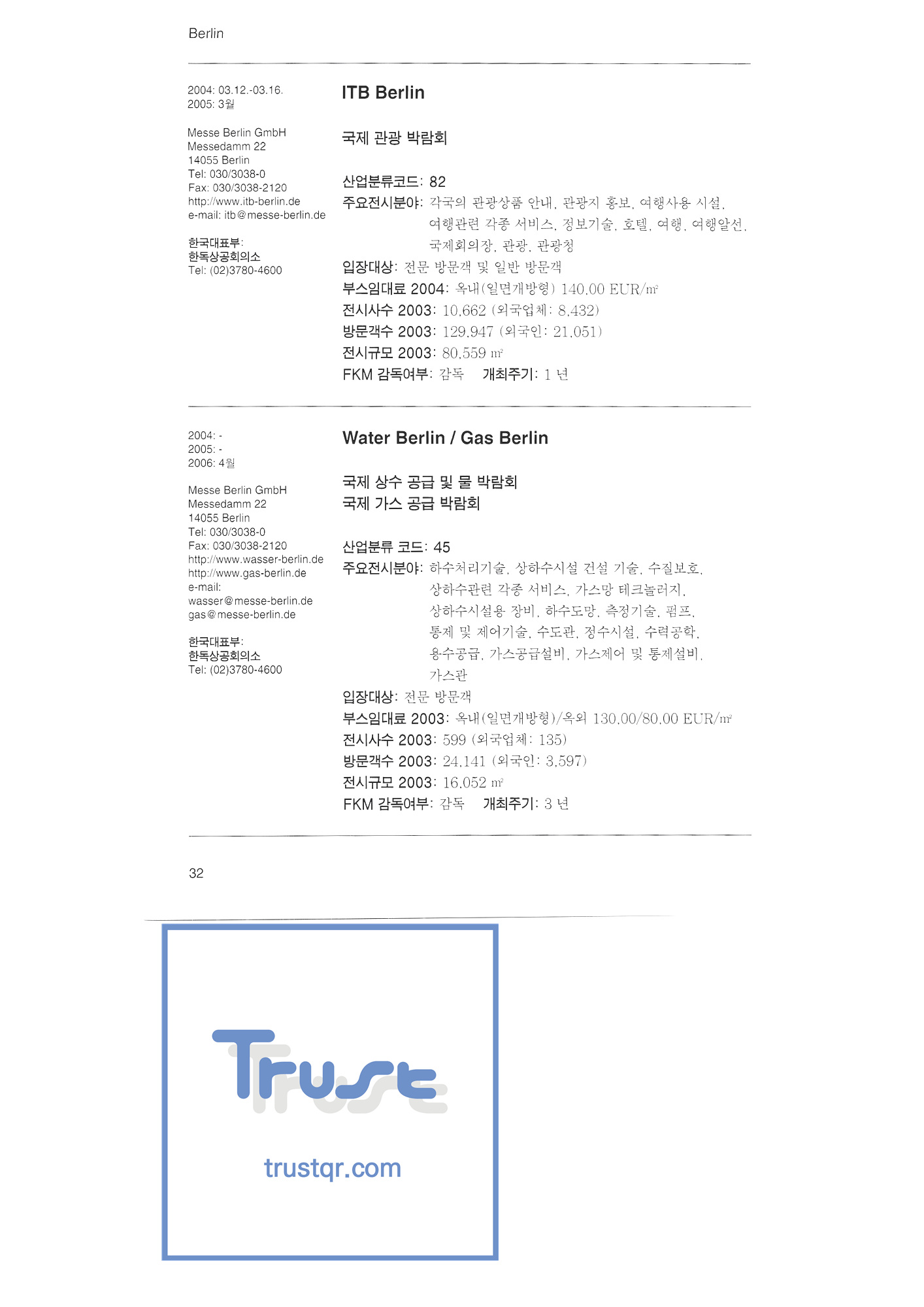 | 독일박람회 2004/2005 국제 분쇄기술 박람회 국제 엘리베이터 박람회 국제 농,수,축산,원예박람회 국제 과일 및 야채 유통 박람회 국제 건축자재 및 리노베이션 박람회 베를린 건축관련 및 리노베이션 박람회 베를린 건축관련 IT 및 통신기술 박람회 국제관광박람회 국제상수공금및물박람회/국제가스공급박람회 국제항공우주및기술박람회 국제공연사업및미디어기술박람회 국제가전및멀티미디어박람회 국제청소장비기술박람회 국제철도차량,수송기술박람회 국제현대기술전시회 베를린홈네트워크박람회 국제해산물및해산식품박람회 국제담배및흡연액세사리박람회 |