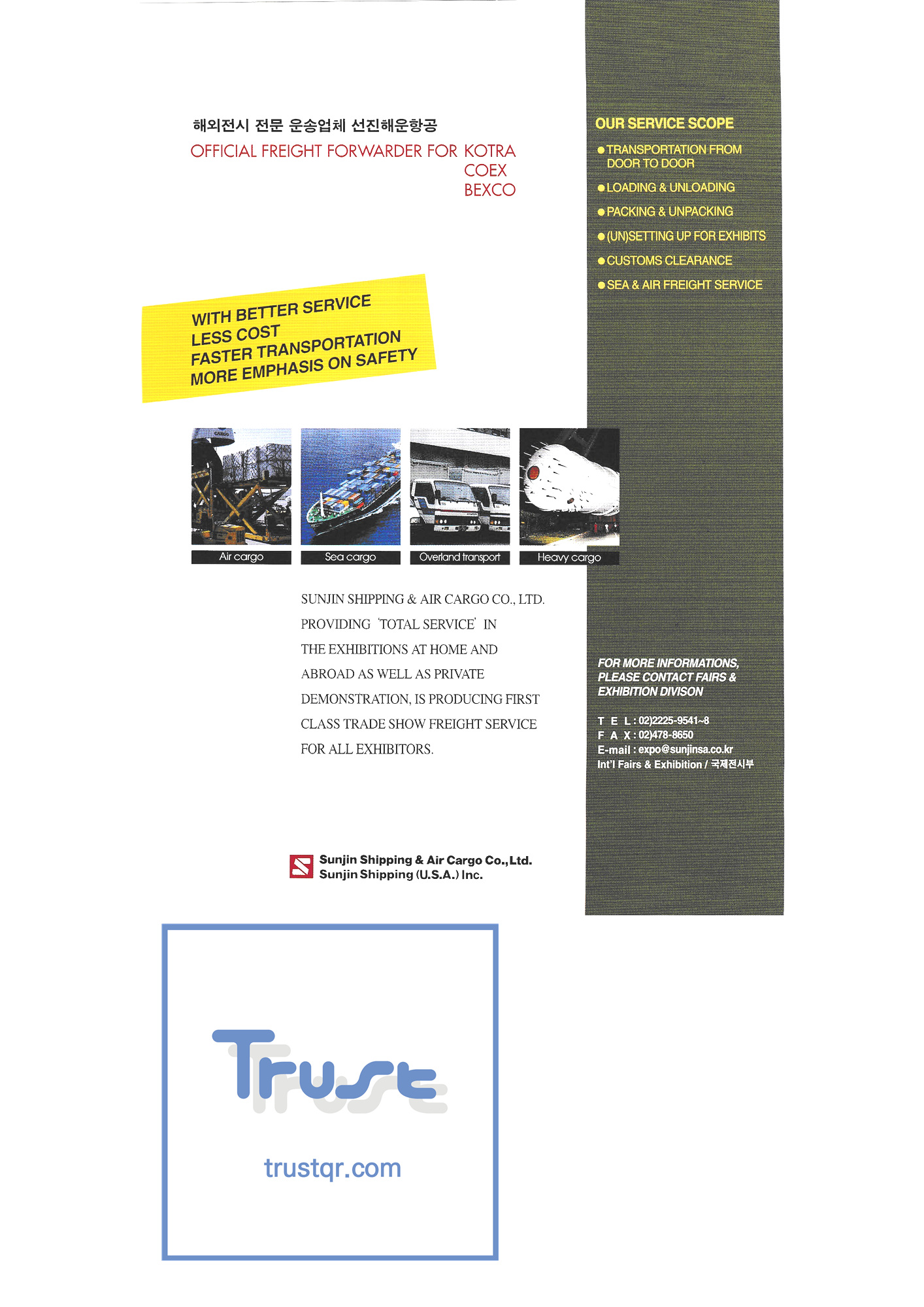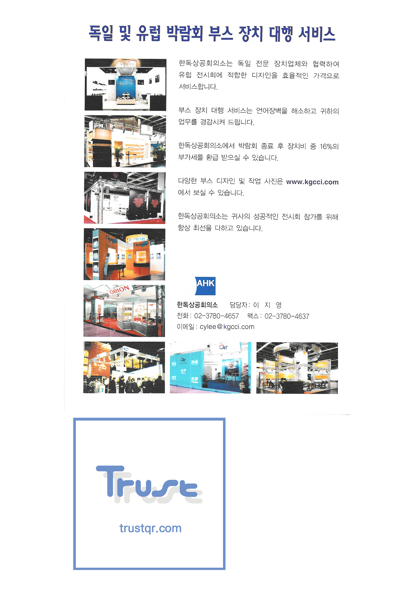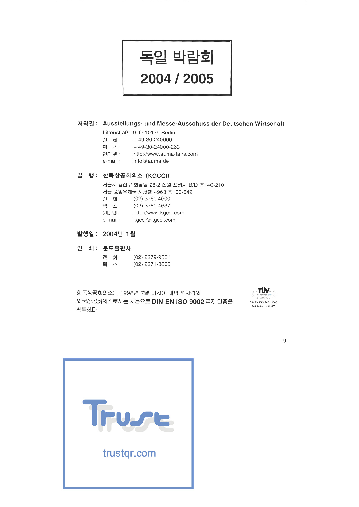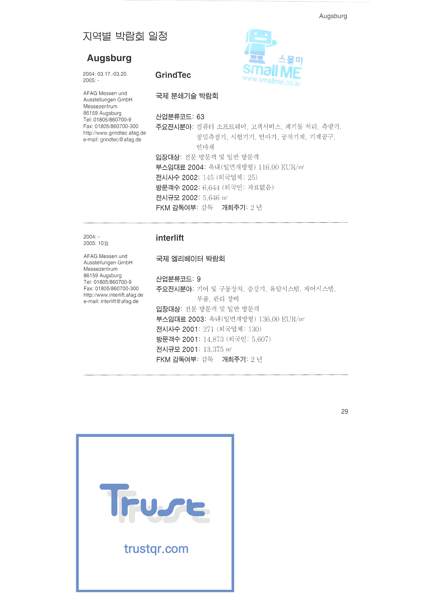 | 독일박람회 2004/2005 국제 분쇄기술 박람회 국제 엘리베이터 박람회 국제 농,수,축산,원예박람회 국제 과일 및 야채 유통 박람회 국제 건축자재 및 리노베이션 박람회 베를린 건축관련 및 리노베이션 박람회 베를린 건축관련 IT 및 통신기술 박람회 국제관광박람회 국제상수공금및물박람회/국제가스공급박람회 국제항공우주및기술박람회 국제공연사업및미디어기술박람회 국제가전및멀티미디어박람회 국제청소장비기술박람회 국제철도차량,수송기술박람회 국제현대기술전시회 베를린홈네트워크박람회 국제해산물및해산식품박람회 국제담배및흡연액세사리박람회 |