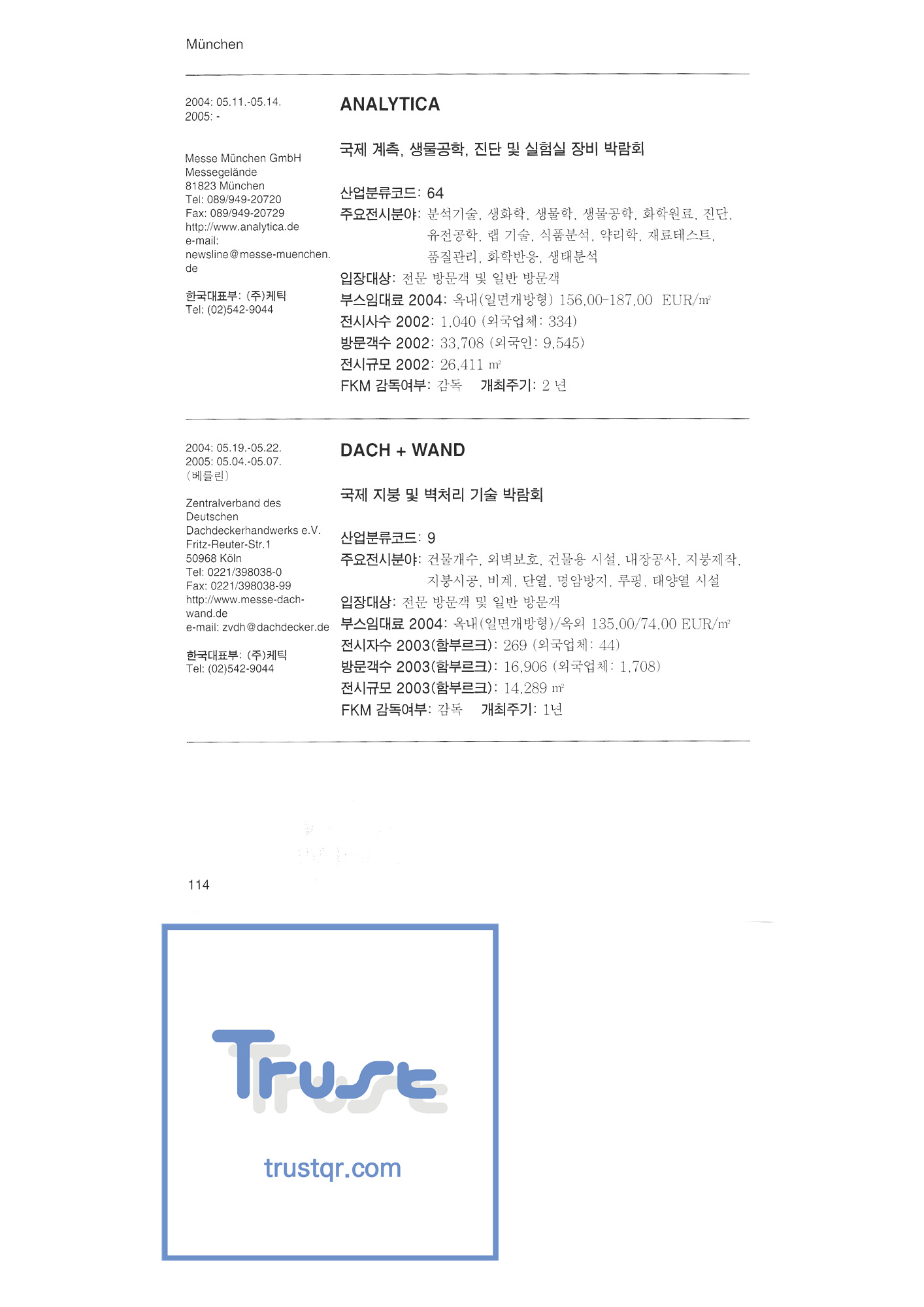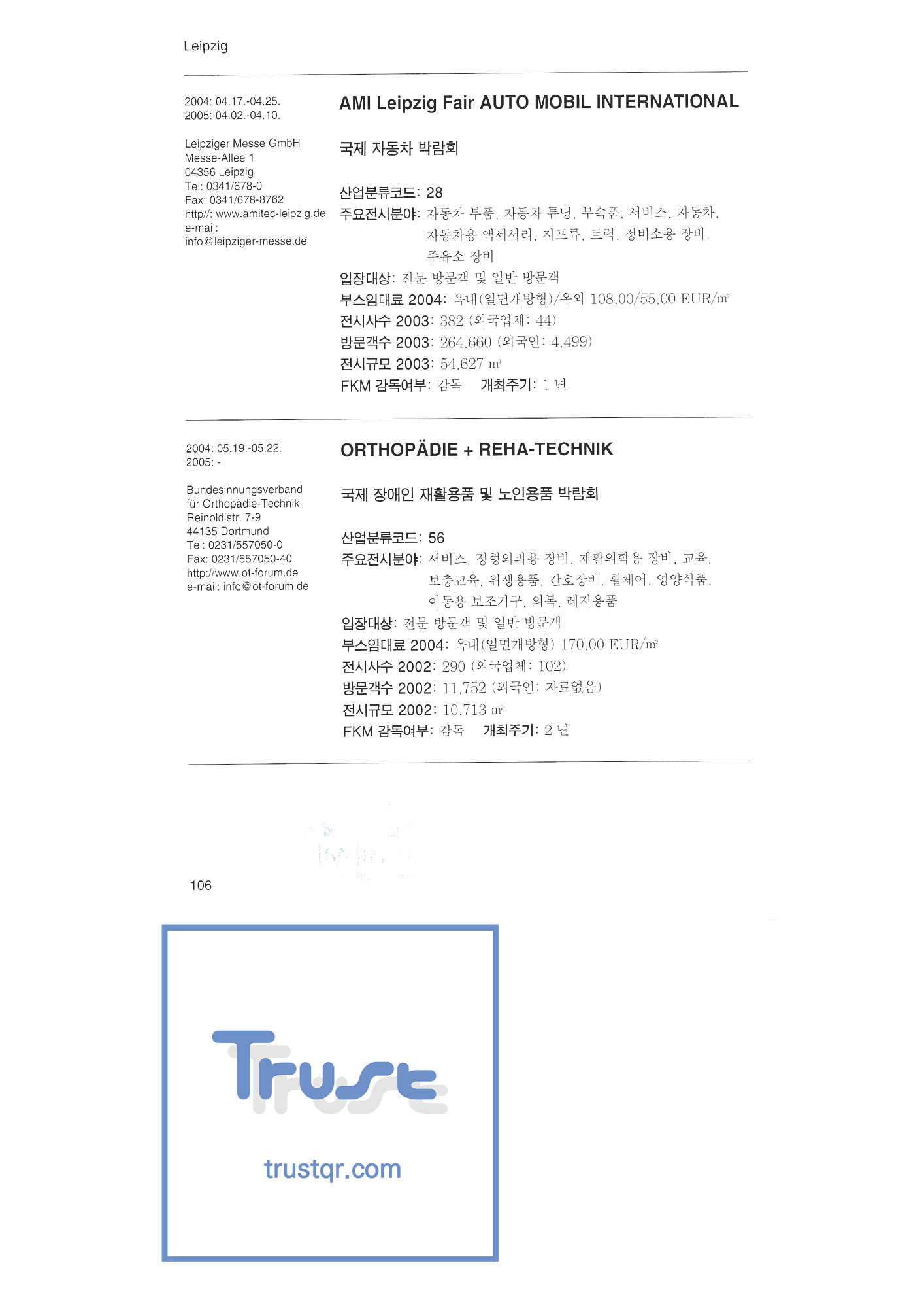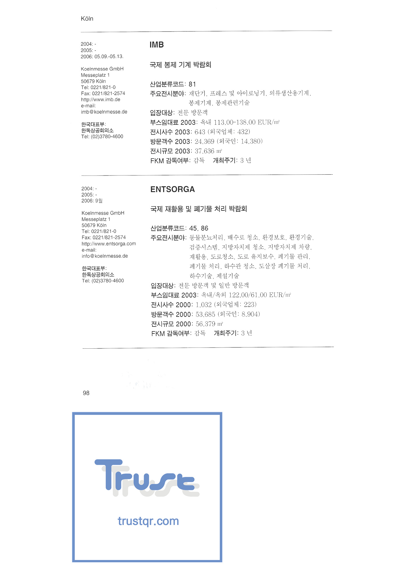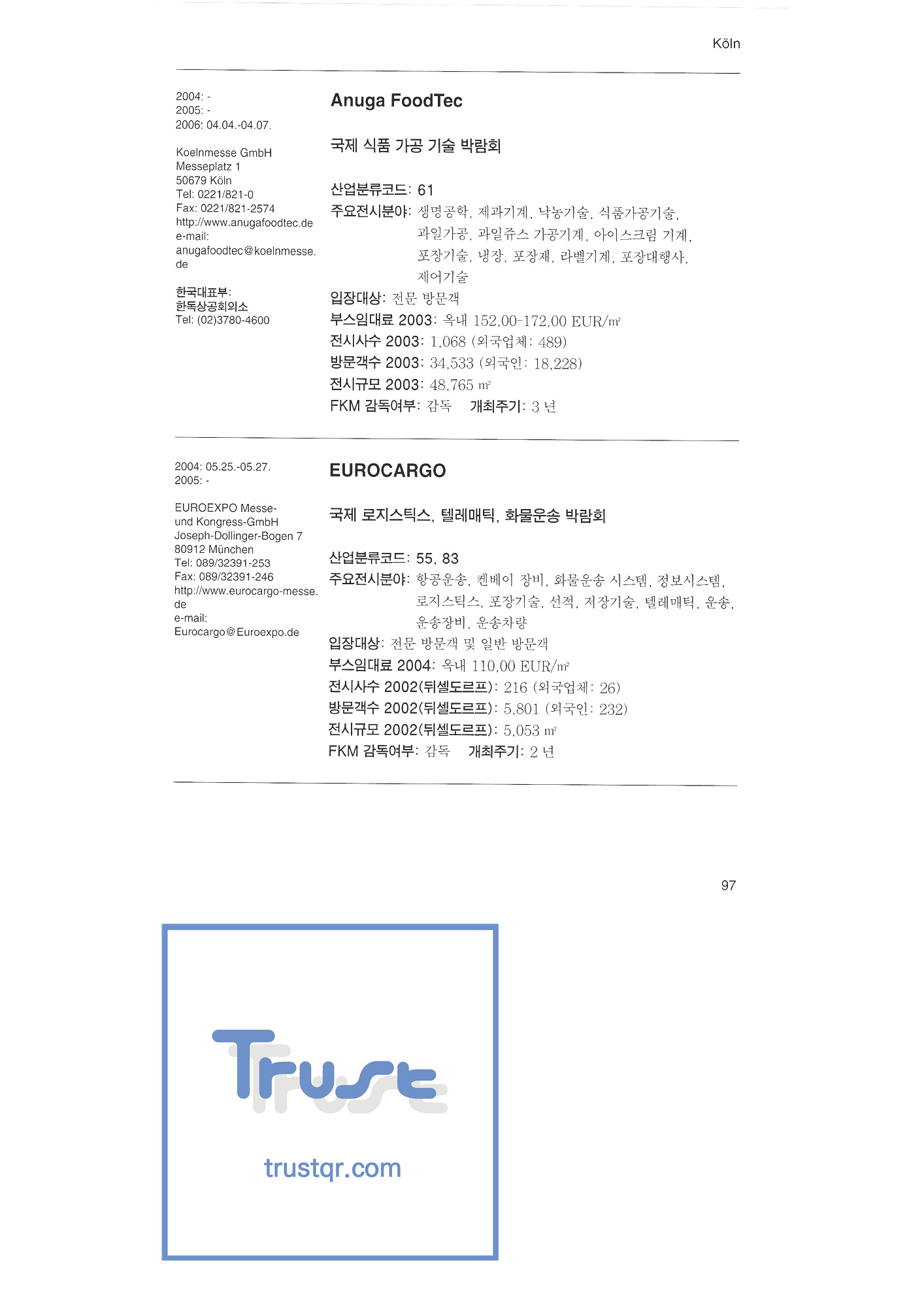 | 독일박람회 2004/2005 - 3 국제조선,기계및해양기술박람회 국제보트박람회 국제카페트및바닥재박람회 국제실버용품및서비스박람회 국제사무기기및정보통신박람회 하노버산업박람회 국제계측및자동화전/하노버산업박람회 마이크로기술전/하노버산업박람회 연구및신기술전/하노버산업박람회 도장기술전/하노버산업박람회 부품하도급전/하노버산업박람회 공장자동회전/하노버산업박람회 에너지전/하노버산업박람회 동력전달및제어전/하노버산업박람회 공기압기술전/하노버산업박람회 국제목공기기박람회 국제소방기기박람회 국제공작기계박람회 국제상용자동차박람회 국제물류박람회 국제생명공학박람회 국제판금속가공기술박람회 국제축산박람회 국제농업기기박람회 국제풍력에너지박람회 국제보석박람회 국제중고기계및장비박람회 국제원예박람회 국제가구박람회 국제제과/당과박람회 국제교육박람회 국제가전및관련부품박람회 국제하드웨어박람회 국제페인트및건물보호박람회 국제치과기자재박람회 국제가구제조및목재인테리어박람회 국제식품가공기술박람회 국제로지스틱스,텔레매틱,화물운송박람회 국제봉제기계박람회 국제재활용및폐기물처리박람회 국제스포츠및등산용품박람회 국제자전거박람회 국제유아용품박람회 국제사진및영상박람회 국제사무기구및사무자동화박람회 국제예술전시회 국제식품종합박람회 국제위락시설,운동장,수영장건설및유지보수박람회 국제썬텐용품및썬텐기기박람회 국제팬션박람회(봄) 국제서적박람회 국제에너지박람회 국제환경및에너지기술박람회 국제자동차박람회 국제장애인재활용품및노인용품박람회 국제부품,모듈및기술박람회 국제패션박람회(가을) 국제시계및보석박람회 국제건축박람회 국제문화유산유지보수박람회 국제호텔,요식업박람회 국제건축자재,빌딩시스템,리노베이션박람회 국제스포츠용품및패션박람회(동계) 국제시계,보석,귀금속,은세공및관련기술박람회 국제골프코스시공박람회 국제중소기업박람회 국제건설기계,건축자재기계,건설중장비박람회 국제호텔및케이터링박람회 국제환경박람회:수자원,하수,폐기물,재활용 국제계측,생물공학,진단및실험실장비박람회 국제지붕및벽처리기술박람회 국제로지스틱스,텔레매틱,화물및여객수송박람회 국제스포츠용품및패션박람회(하계) 국제레이저및광전자박람회 국제임업기술박람회 국제모터사이클및스쿠터박람회 국제재료응용,표면기술및제품엔지니어링박람회 국제제약박람회 국제음료기술및생산박람회 |