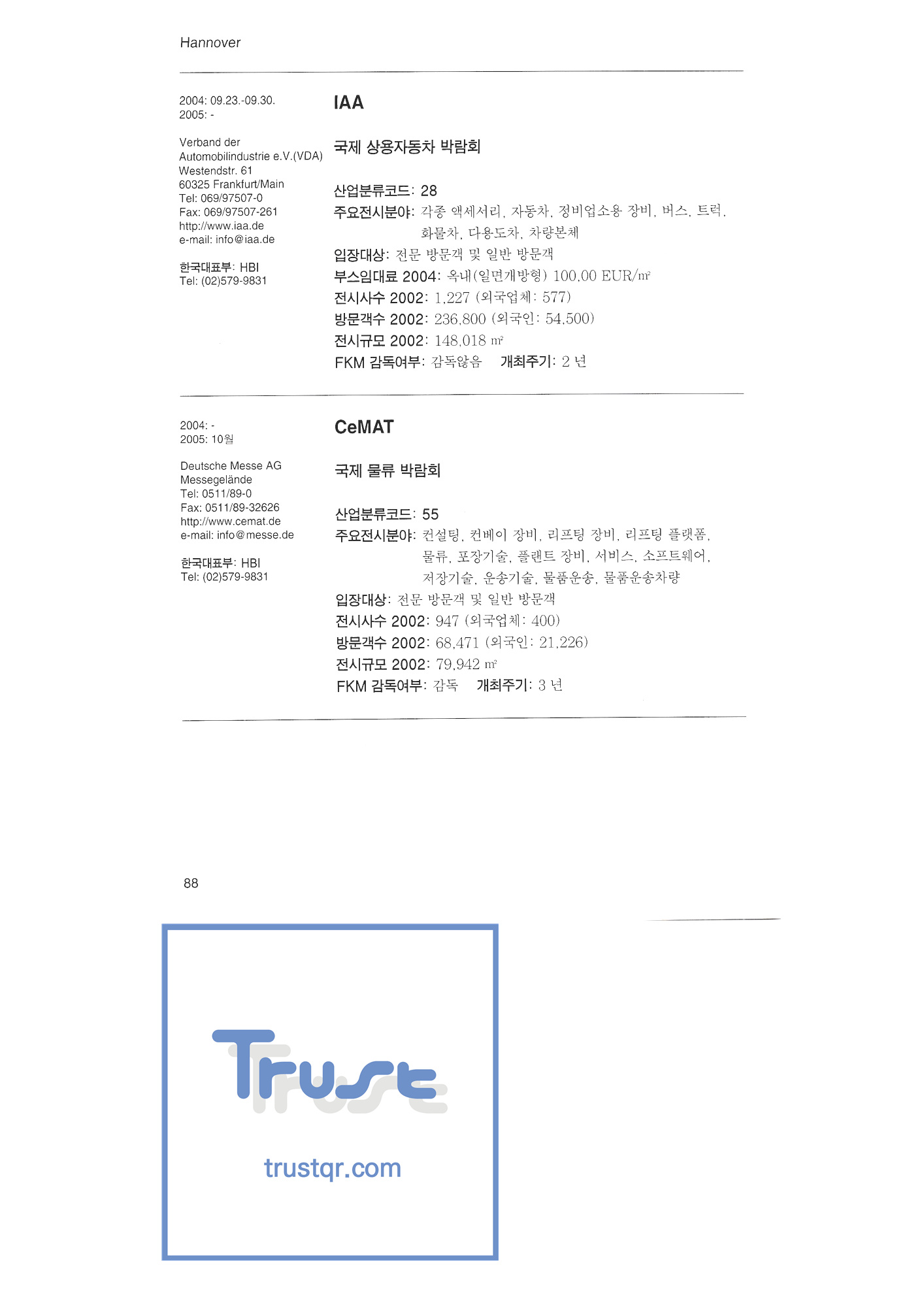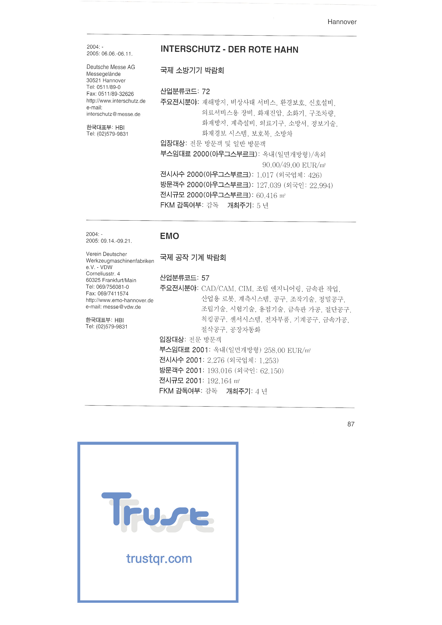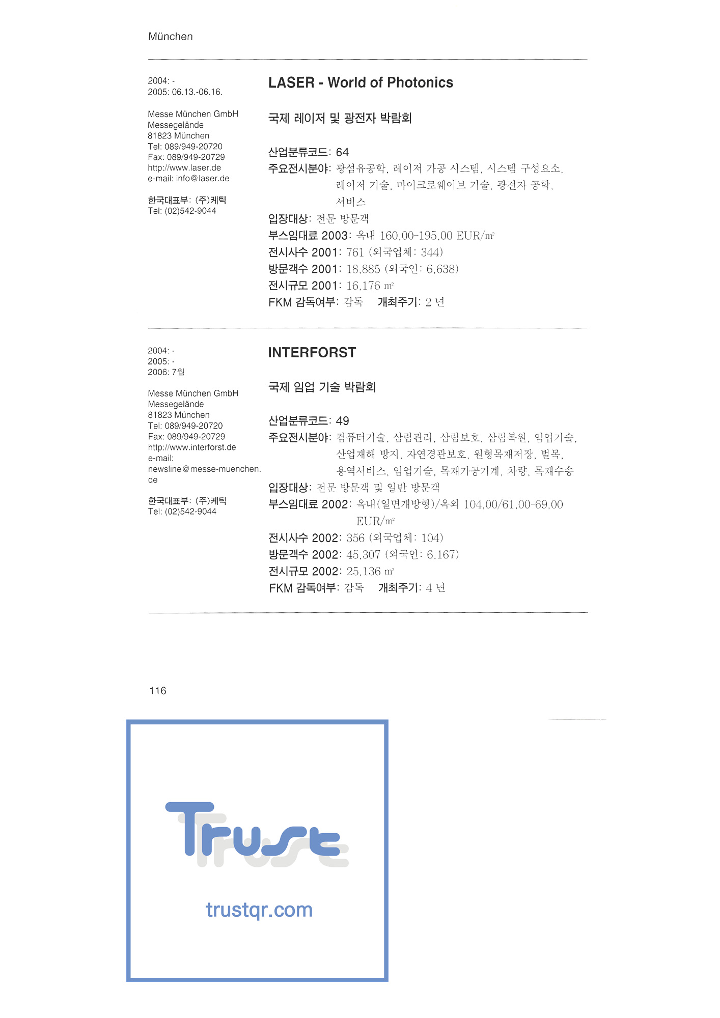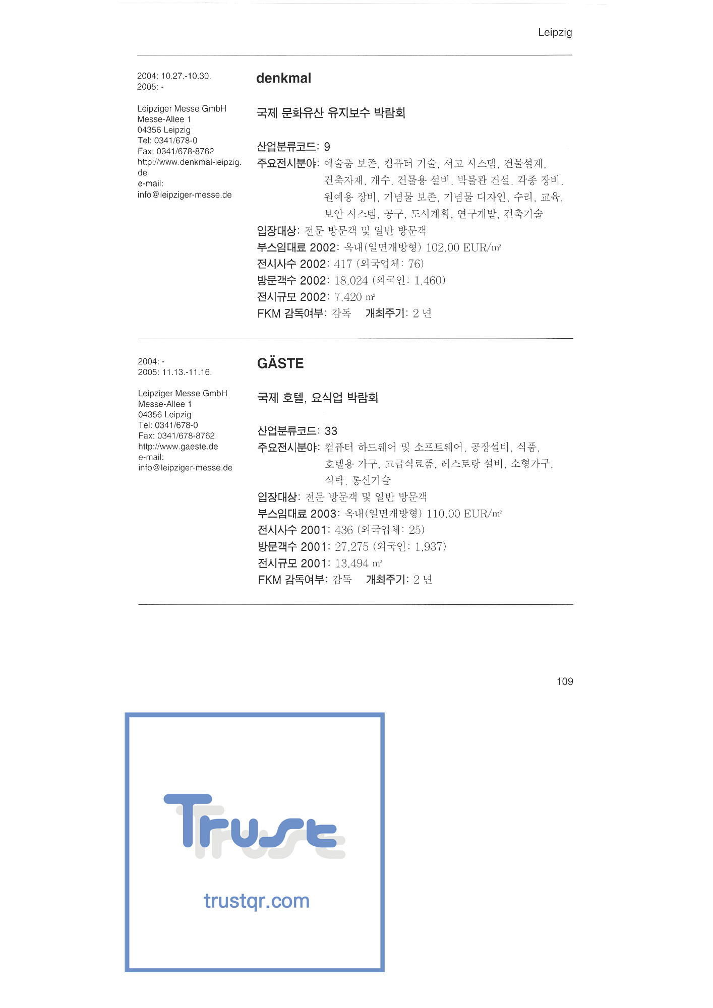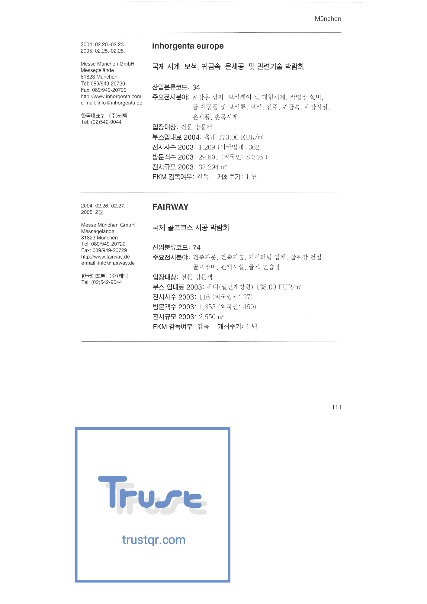 | 독일박람회 2004/2005 - 3 국제조선,기계및해양기술박람회 국제보트박람회 국제카페트및바닥재박람회 국제실버용품및서비스박람회 국제사무기기및정보통신박람회 하노버산업박람회 국제계측및자동화전/하노버산업박람회 마이크로기술전/하노버산업박람회 연구및신기술전/하노버산업박람회 도장기술전/하노버산업박람회 부품하도급전/하노버산업박람회 공장자동회전/하노버산업박람회 에너지전/하노버산업박람회 동력전달및제어전/하노버산업박람회 공기압기술전/하노버산업박람회 국제목공기기박람회 국제소방기기박람회 국제공작기계박람회 국제상용자동차박람회 국제물류박람회 국제생명공학박람회 국제판금속가공기술박람회 국제축산박람회 국제농업기기박람회 국제풍력에너지박람회 국제보석박람회 국제중고기계및장비박람회 국제원예박람회 국제가구박람회 국제제과/당과박람회 국제교육박람회 국제가전및관련부품박람회 국제하드웨어박람회 국제페인트및건물보호박람회 국제치과기자재박람회 국제가구제조및목재인테리어박람회 국제식품가공기술박람회 국제로지스틱스,텔레매틱,화물운송박람회 국제봉제기계박람회 국제재활용및폐기물처리박람회 국제스포츠및등산용품박람회 국제자전거박람회 국제유아용품박람회 국제사진및영상박람회 국제사무기구및사무자동화박람회 국제예술전시회 국제식품종합박람회 국제위락시설,운동장,수영장건설및유지보수박람회 국제썬텐용품및썬텐기기박람회 국제팬션박람회(봄) 국제서적박람회 국제에너지박람회 국제환경및에너지기술박람회 국제자동차박람회 국제장애인재활용품및노인용품박람회 국제부품,모듈및기술박람회 국제패션박람회(가을) 국제시계및보석박람회 국제건축박람회 국제문화유산유지보수박람회 국제호텔,요식업박람회 국제건축자재,빌딩시스템,리노베이션박람회 국제스포츠용품및패션박람회(동계) 국제시계,보석,귀금속,은세공및관련기술박람회 국제골프코스시공박람회 국제중소기업박람회 국제건설기계,건축자재기계,건설중장비박람회 국제호텔및케이터링박람회 국제환경박람회:수자원,하수,폐기물,재활용 국제계측,생물공학,진단및실험실장비박람회 국제지붕및벽처리기술박람회 국제로지스틱스,텔레매틱,화물및여객수송박람회 국제스포츠용품및패션박람회(하계) 국제레이저및광전자박람회 국제임업기술박람회 국제모터사이클및스쿠터박람회 국제재료응용,표면기술및제품엔지니어링박람회 국제제약박람회 국제음료기술및생산박람회 |