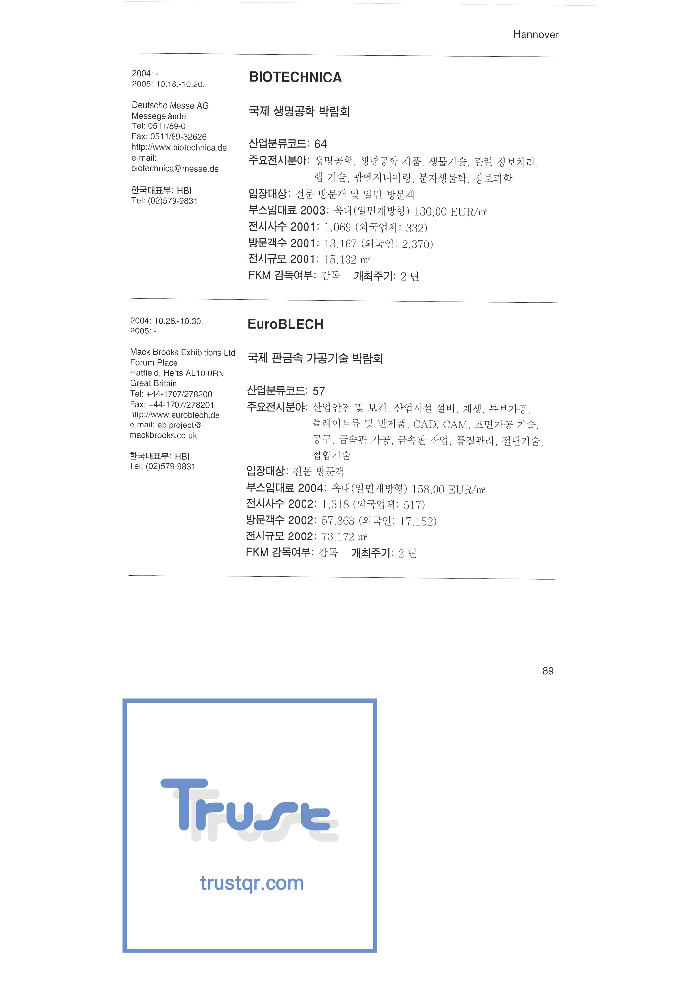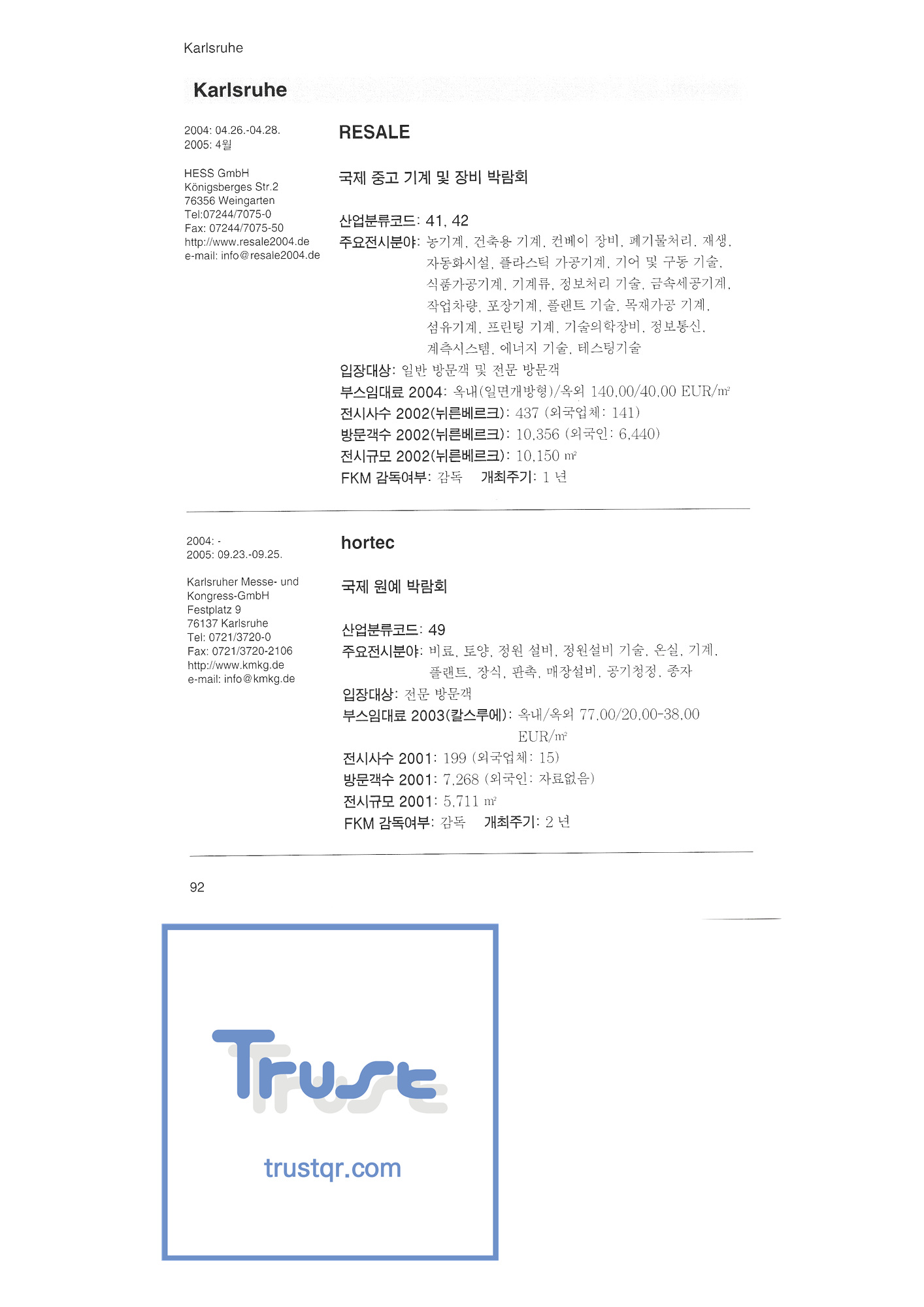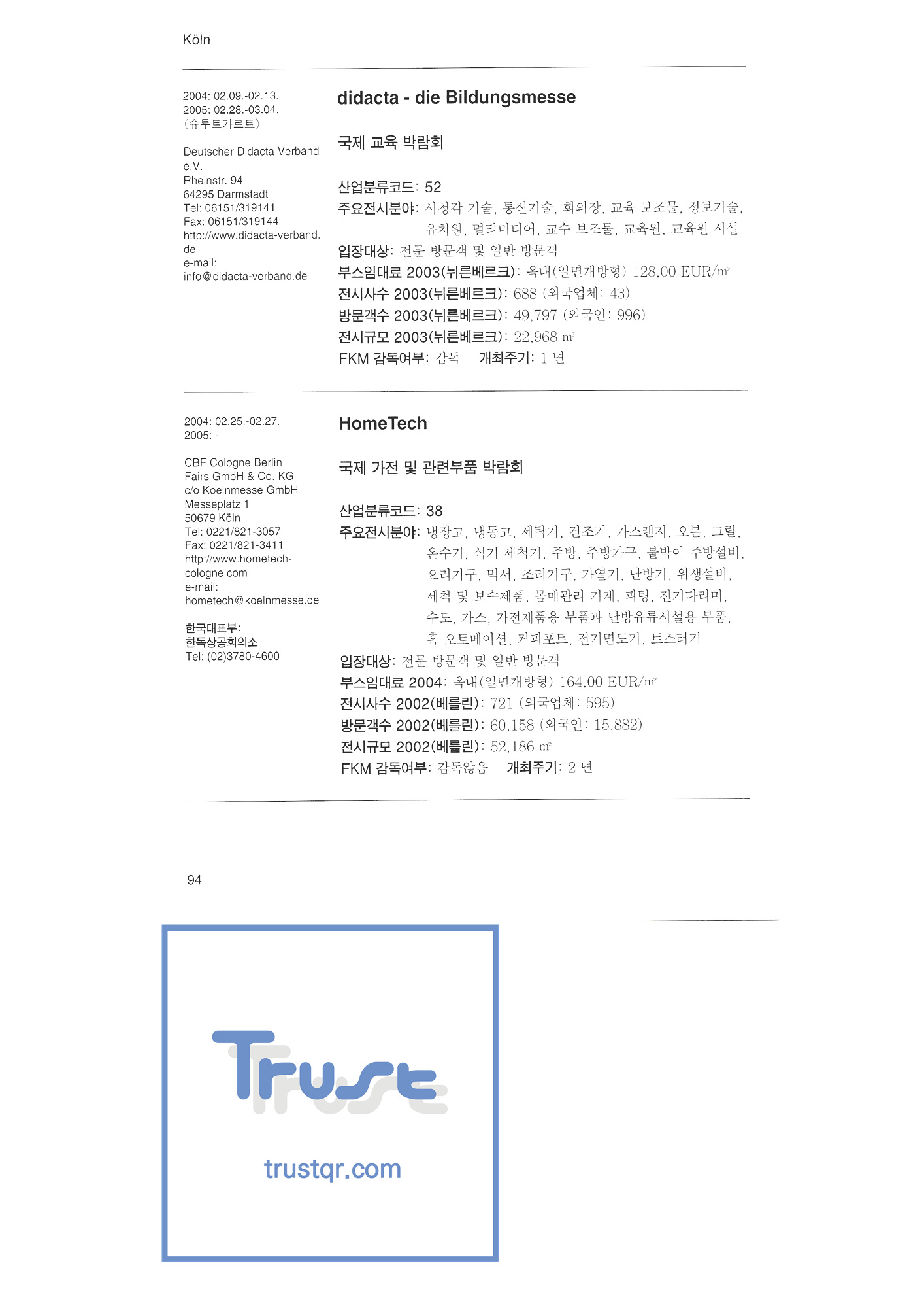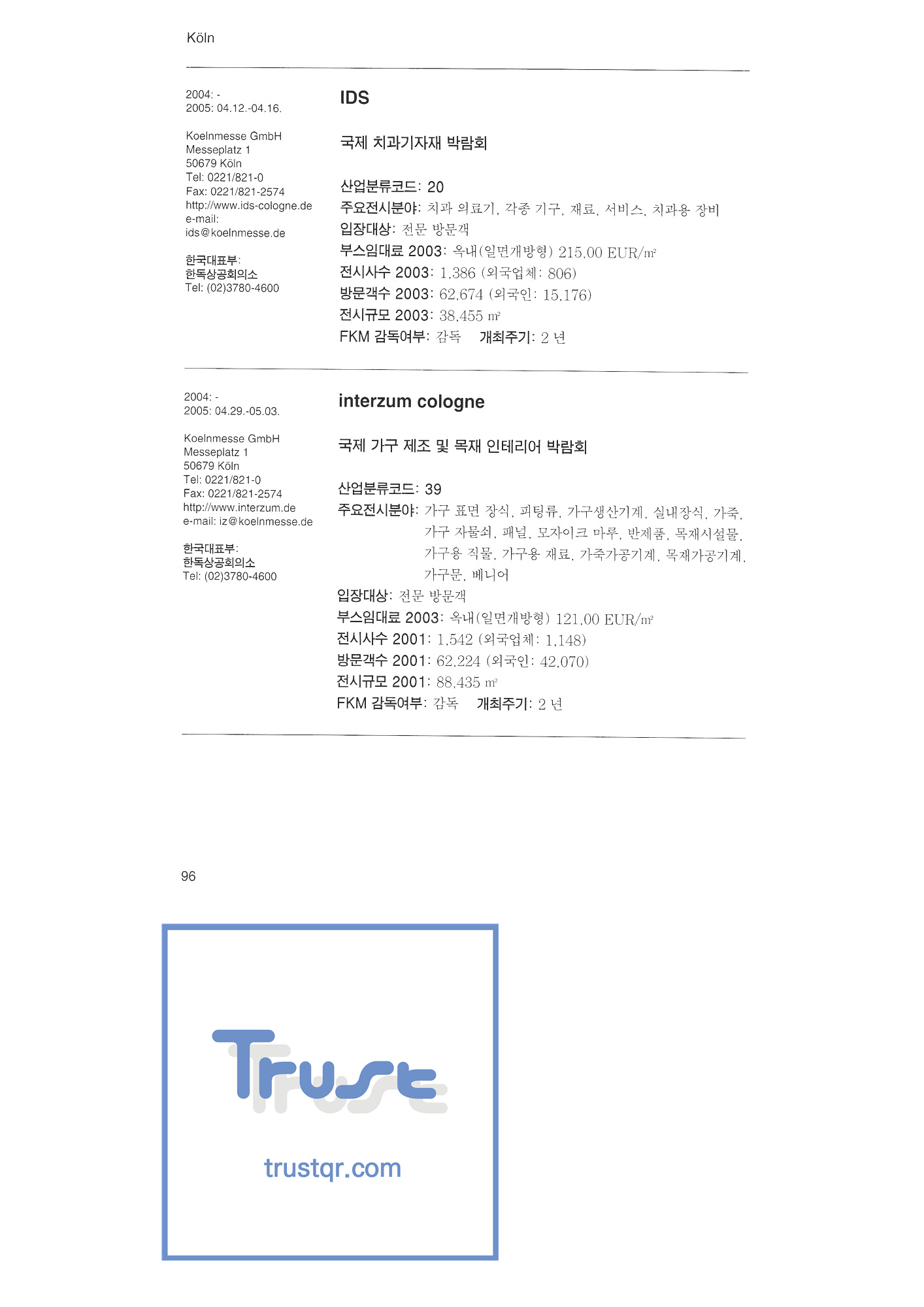 | 독일박람회 2004/2005 - 3 국제조선,기계및해양기술박람회 국제보트박람회 국제카페트및바닥재박람회 국제실버용품및서비스박람회 국제사무기기및정보통신박람회 하노버산업박람회 국제계측및자동화전/하노버산업박람회 마이크로기술전/하노버산업박람회 연구및신기술전/하노버산업박람회 도장기술전/하노버산업박람회 부품하도급전/하노버산업박람회 공장자동회전/하노버산업박람회 에너지전/하노버산업박람회 동력전달및제어전/하노버산업박람회 공기압기술전/하노버산업박람회 국제목공기기박람회 국제소방기기박람회 국제공작기계박람회 국제상용자동차박람회 국제물류박람회 국제생명공학박람회 국제판금속가공기술박람회 국제축산박람회 국제농업기기박람회 국제풍력에너지박람회 국제보석박람회 국제중고기계및장비박람회 국제원예박람회 국제가구박람회 국제제과/당과박람회 국제교육박람회 국제가전및관련부품박람회 국제하드웨어박람회 국제페인트및건물보호박람회 국제치과기자재박람회 국제가구제조및목재인테리어박람회 국제식품가공기술박람회 국제로지스틱스,텔레매틱,화물운송박람회 국제봉제기계박람회 국제재활용및폐기물처리박람회 국제스포츠및등산용품박람회 국제자전거박람회 국제유아용품박람회 국제사진및영상박람회 국제사무기구및사무자동화박람회 국제예술전시회 국제식품종합박람회 국제위락시설,운동장,수영장건설및유지보수박람회 국제썬텐용품및썬텐기기박람회 국제팬션박람회(봄) 국제서적박람회 국제에너지박람회 국제환경및에너지기술박람회 국제자동차박람회 국제장애인재활용품및노인용품박람회 국제부품,모듈및기술박람회 국제패션박람회(가을) 국제시계및보석박람회 국제건축박람회 국제문화유산유지보수박람회 국제호텔,요식업박람회 국제건축자재,빌딩시스템,리노베이션박람회 국제스포츠용품및패션박람회(동계) 국제시계,보석,귀금속,은세공및관련기술박람회 국제골프코스시공박람회 국제중소기업박람회 국제건설기계,건축자재기계,건설중장비박람회 국제호텔및케이터링박람회 국제환경박람회:수자원,하수,폐기물,재활용 국제계측,생물공학,진단및실험실장비박람회 국제지붕및벽처리기술박람회 국제로지스틱스,텔레매틱,화물및여객수송박람회 국제스포츠용품및패션박람회(하계) 국제레이저및광전자박람회 국제임업기술박람회 국제모터사이클및스쿠터박람회 국제재료응용,표면기술및제품엔지니어링박람회 국제제약박람회 국제음료기술및생산박람회 |