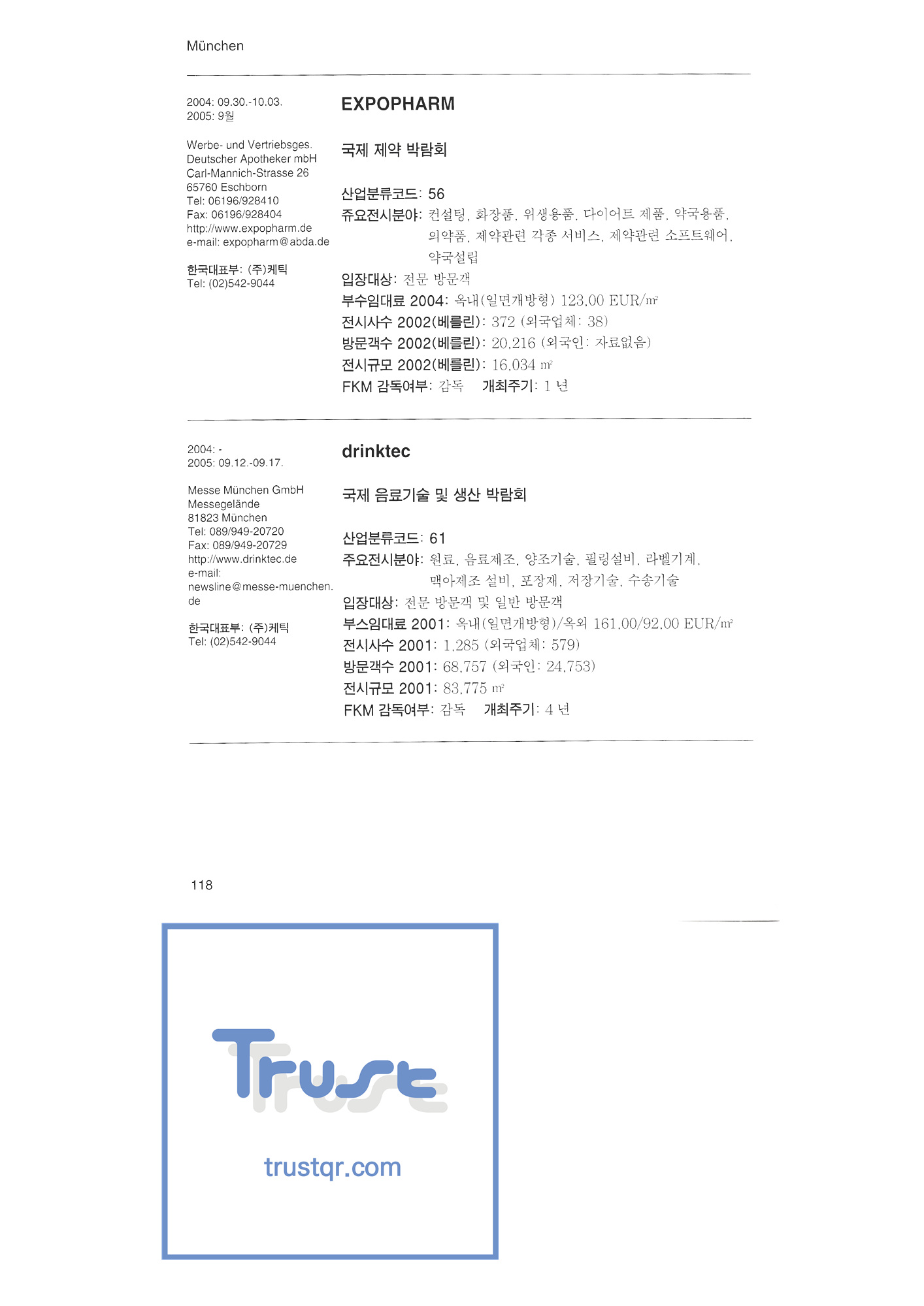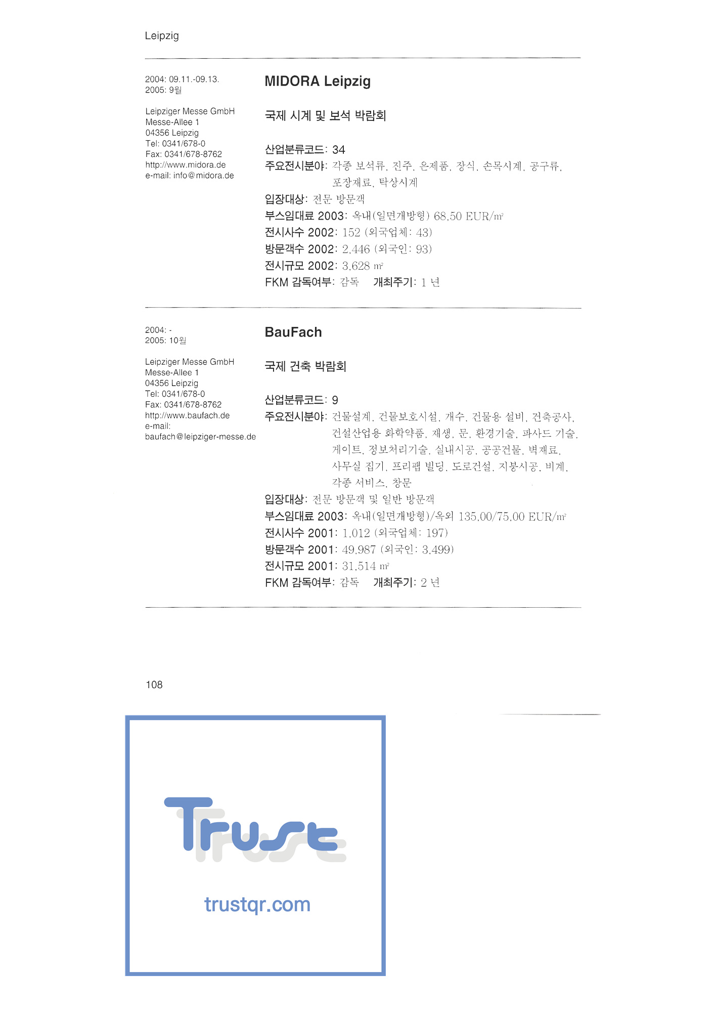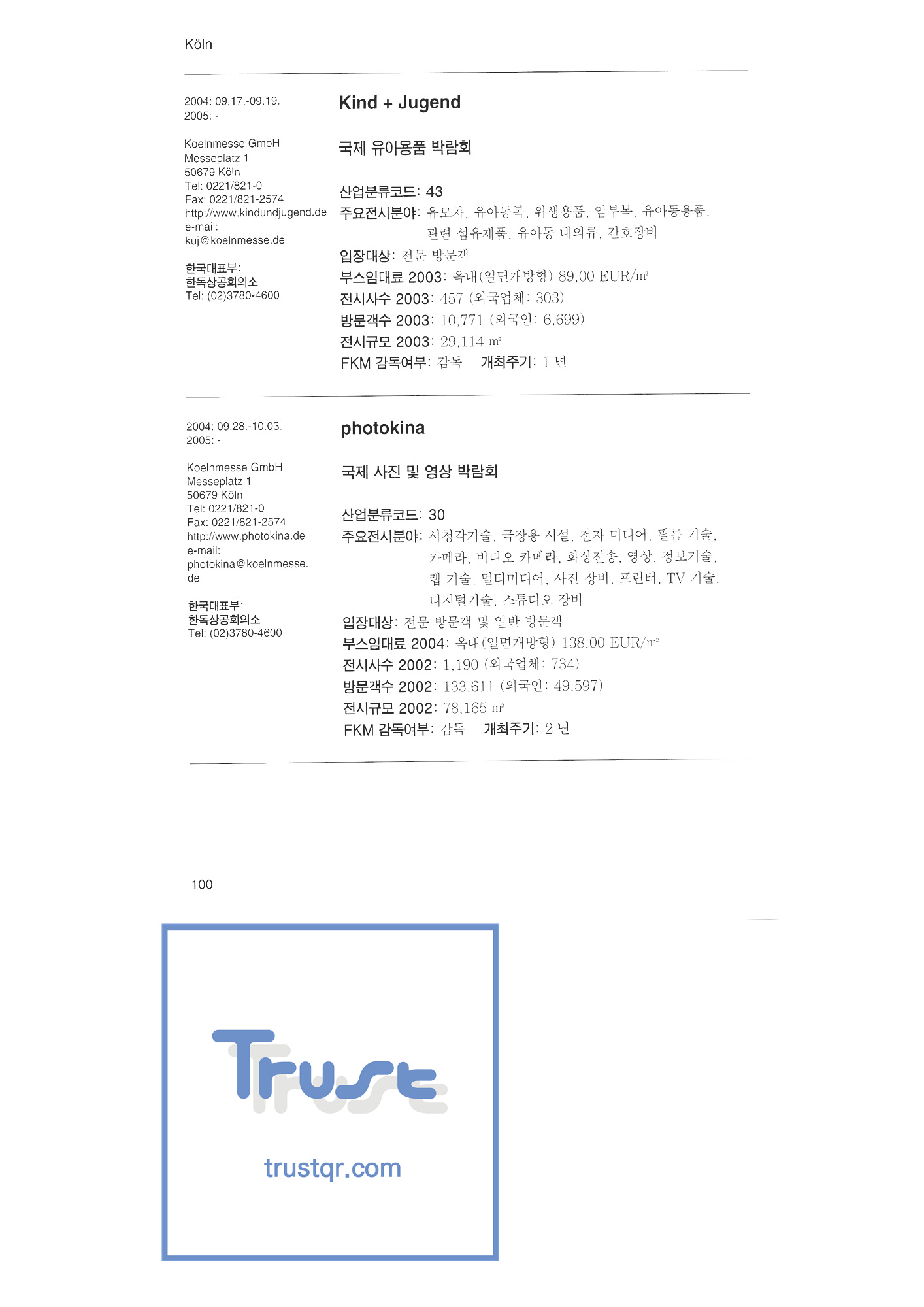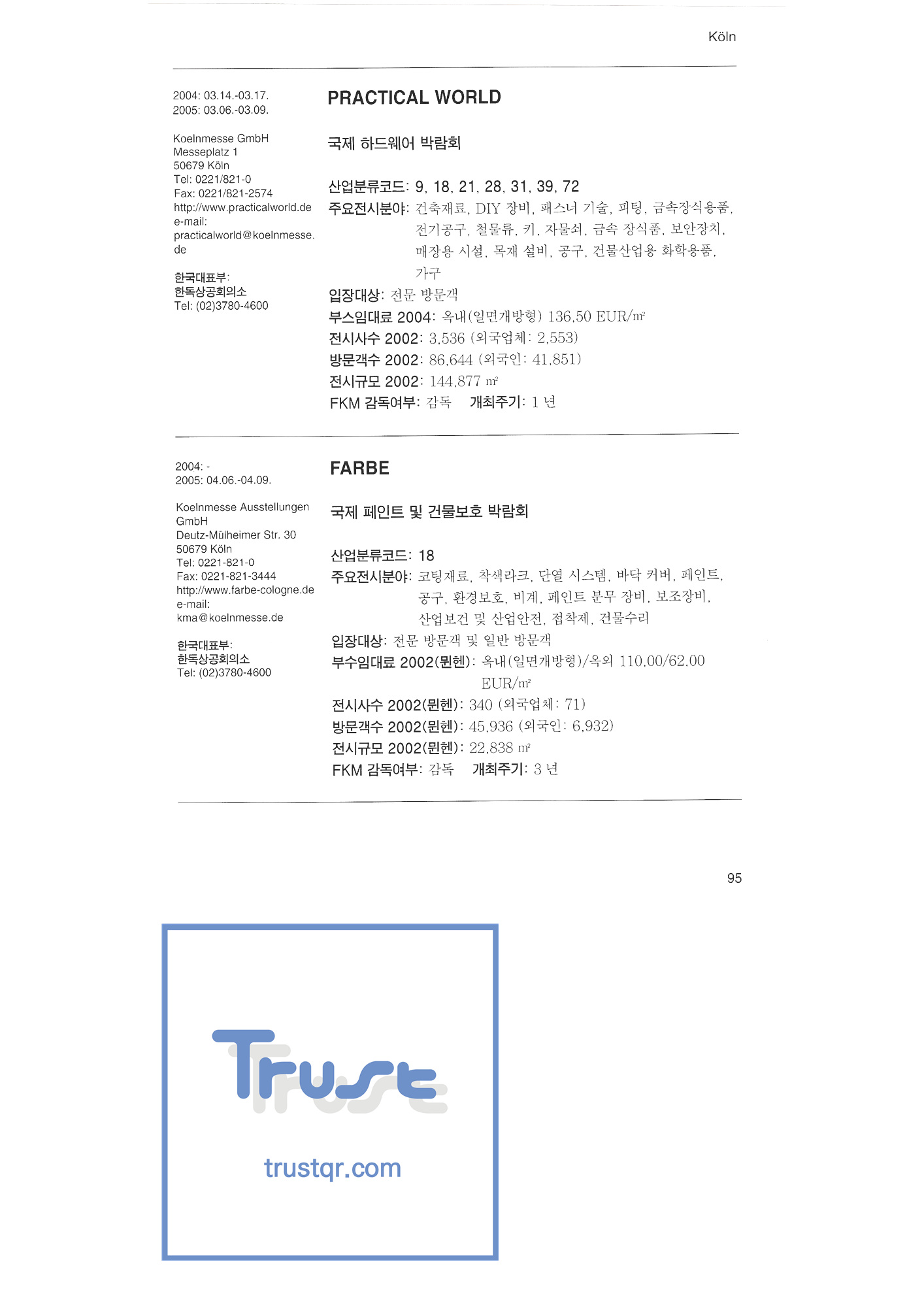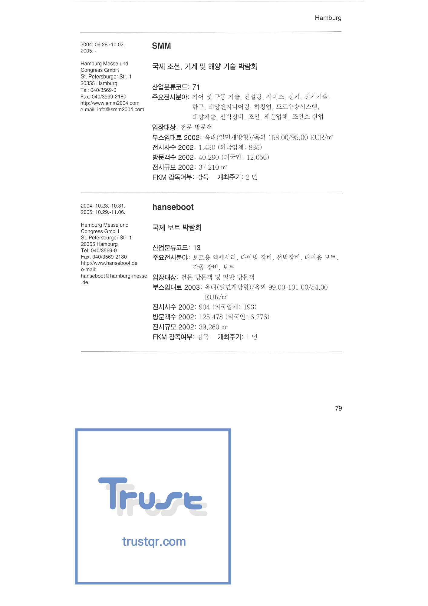 | 독일박람회 2004/2005 - 3 국제조선,기계및해양기술박람회 국제보트박람회 국제카페트및바닥재박람회 국제실버용품및서비스박람회 국제사무기기및정보통신박람회 하노버산업박람회 국제계측및자동화전/하노버산업박람회 마이크로기술전/하노버산업박람회 연구및신기술전/하노버산업박람회 도장기술전/하노버산업박람회 부품하도급전/하노버산업박람회 공장자동회전/하노버산업박람회 에너지전/하노버산업박람회 동력전달및제어전/하노버산업박람회 공기압기술전/하노버산업박람회 국제목공기기박람회 국제소방기기박람회 국제공작기계박람회 국제상용자동차박람회 국제물류박람회 국제생명공학박람회 국제판금속가공기술박람회 국제축산박람회 국제농업기기박람회 국제풍력에너지박람회 국제보석박람회 국제중고기계및장비박람회 국제원예박람회 국제가구박람회 국제제과/당과박람회 국제교육박람회 국제가전및관련부품박람회 국제하드웨어박람회 국제페인트및건물보호박람회 국제치과기자재박람회 국제가구제조및목재인테리어박람회 국제식품가공기술박람회 국제로지스틱스,텔레매틱,화물운송박람회 국제봉제기계박람회 국제재활용및폐기물처리박람회 국제스포츠및등산용품박람회 국제자전거박람회 국제유아용품박람회 국제사진및영상박람회 국제사무기구및사무자동화박람회 국제예술전시회 국제식품종합박람회 국제위락시설,운동장,수영장건설및유지보수박람회 국제썬텐용품및썬텐기기박람회 국제팬션박람회(봄) 국제서적박람회 국제에너지박람회 국제환경및에너지기술박람회 국제자동차박람회 국제장애인재활용품및노인용품박람회 국제부품,모듈및기술박람회 국제패션박람회(가을) 국제시계및보석박람회 국제건축박람회 국제문화유산유지보수박람회 국제호텔,요식업박람회 국제건축자재,빌딩시스템,리노베이션박람회 국제스포츠용품및패션박람회(동계) 국제시계,보석,귀금속,은세공및관련기술박람회 국제골프코스시공박람회 국제중소기업박람회 국제건설기계,건축자재기계,건설중장비박람회 국제호텔및케이터링박람회 국제환경박람회:수자원,하수,폐기물,재활용 국제계측,생물공학,진단및실험실장비박람회 국제지붕및벽처리기술박람회 국제로지스틱스,텔레매틱,화물및여객수송박람회 국제스포츠용품및패션박람회(하계) 국제레이저및광전자박람회 국제임업기술박람회 국제모터사이클및스쿠터박람회 국제재료응용,표면기술및제품엔지니어링박람회 국제제약박람회 국제음료기술및생산박람회 |