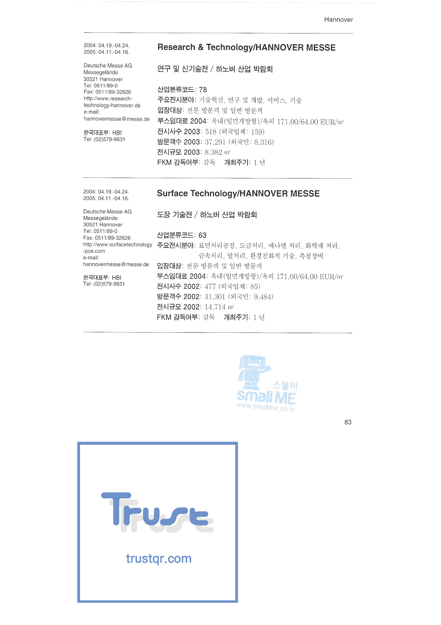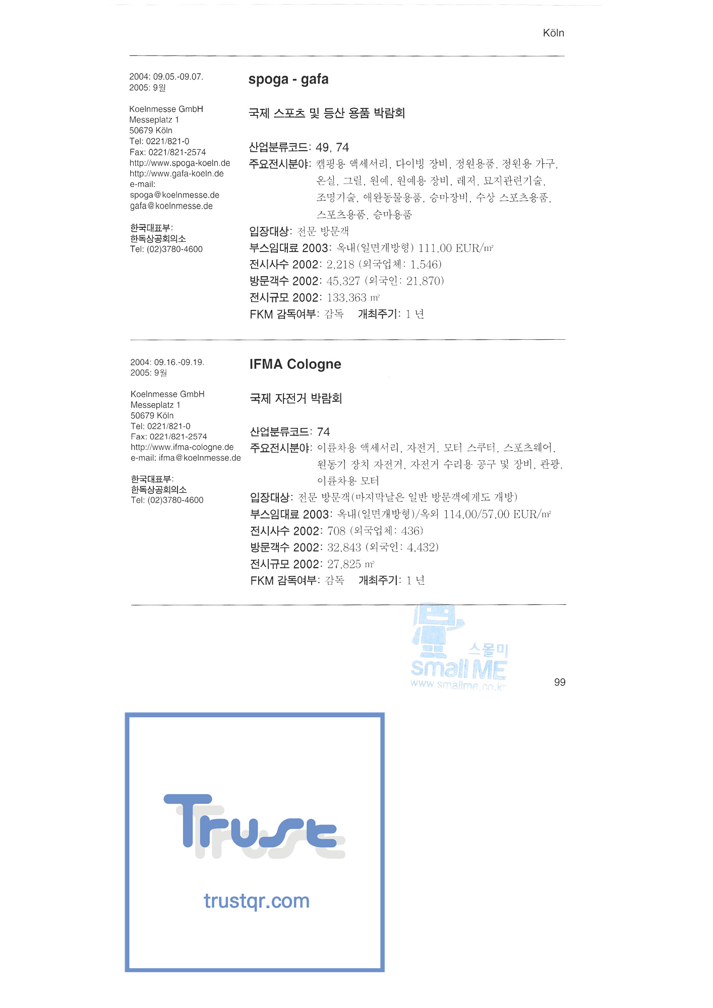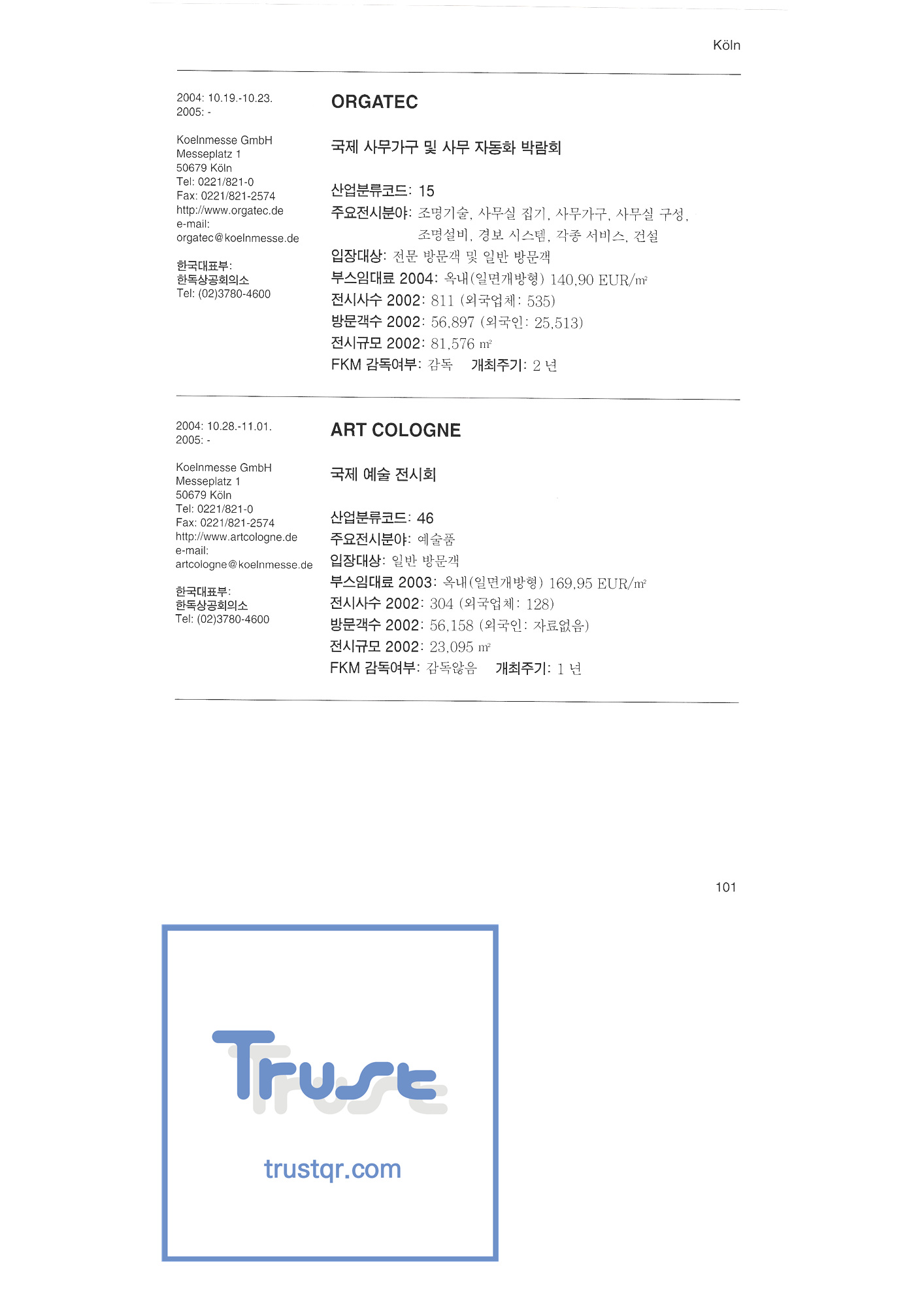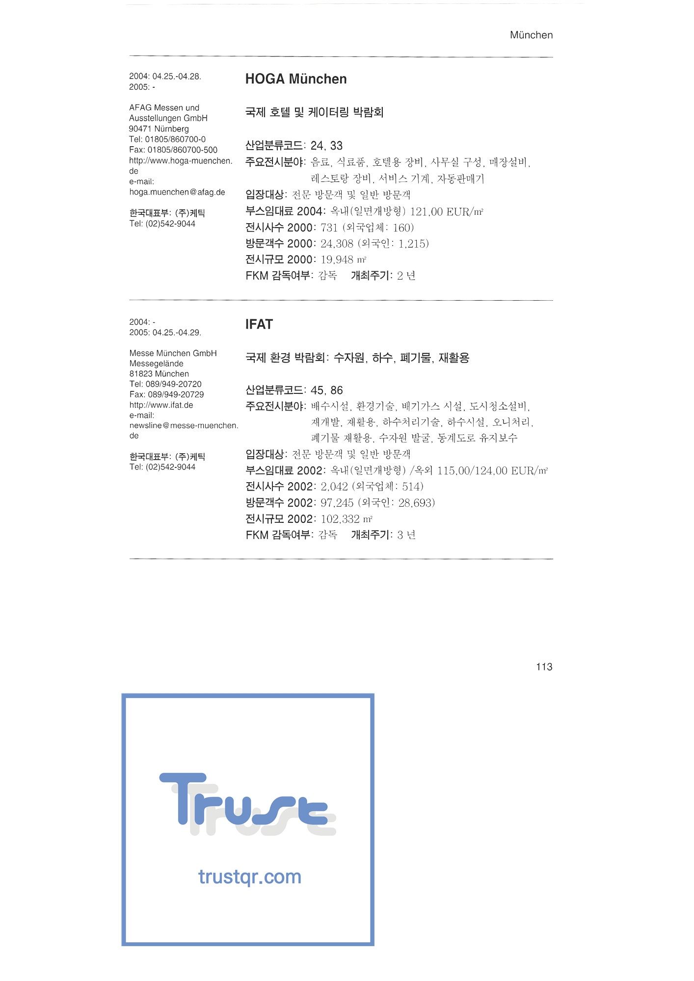 | 독일박람회 2004/2005 - 3 국제조선,기계및해양기술박람회 국제보트박람회 국제카페트및바닥재박람회 국제실버용품및서비스박람회 국제사무기기및정보통신박람회 하노버산업박람회 국제계측및자동화전/하노버산업박람회 마이크로기술전/하노버산업박람회 연구및신기술전/하노버산업박람회 도장기술전/하노버산업박람회 부품하도급전/하노버산업박람회 공장자동회전/하노버산업박람회 에너지전/하노버산업박람회 동력전달및제어전/하노버산업박람회 공기압기술전/하노버산업박람회 국제목공기기박람회 국제소방기기박람회 국제공작기계박람회 국제상용자동차박람회 국제물류박람회 국제생명공학박람회 국제판금속가공기술박람회 국제축산박람회 국제농업기기박람회 국제풍력에너지박람회 국제보석박람회 국제중고기계및장비박람회 국제원예박람회 국제가구박람회 국제제과/당과박람회 국제교육박람회 국제가전및관련부품박람회 국제하드웨어박람회 국제페인트및건물보호박람회 국제치과기자재박람회 국제가구제조및목재인테리어박람회 국제식품가공기술박람회 국제로지스틱스,텔레매틱,화물운송박람회 국제봉제기계박람회 국제재활용및폐기물처리박람회 국제스포츠및등산용품박람회 국제자전거박람회 국제유아용품박람회 국제사진및영상박람회 국제사무기구및사무자동화박람회 국제예술전시회 국제식품종합박람회 국제위락시설,운동장,수영장건설및유지보수박람회 국제썬텐용품및썬텐기기박람회 국제팬션박람회(봄) 국제서적박람회 국제에너지박람회 국제환경및에너지기술박람회 국제자동차박람회 국제장애인재활용품및노인용품박람회 국제부품,모듈및기술박람회 국제패션박람회(가을) 국제시계및보석박람회 국제건축박람회 국제문화유산유지보수박람회 국제호텔,요식업박람회 국제건축자재,빌딩시스템,리노베이션박람회 국제스포츠용품및패션박람회(동계) 국제시계,보석,귀금속,은세공및관련기술박람회 국제골프코스시공박람회 국제중소기업박람회 국제건설기계,건축자재기계,건설중장비박람회 국제호텔및케이터링박람회 국제환경박람회:수자원,하수,폐기물,재활용 국제계측,생물공학,진단및실험실장비박람회 국제지붕및벽처리기술박람회 국제로지스틱스,텔레매틱,화물및여객수송박람회 국제스포츠용품및패션박람회(하계) 국제레이저및광전자박람회 국제임업기술박람회 국제모터사이클및스쿠터박람회 국제재료응용,표면기술및제품엔지니어링박람회 국제제약박람회 국제음료기술및생산박람회 |