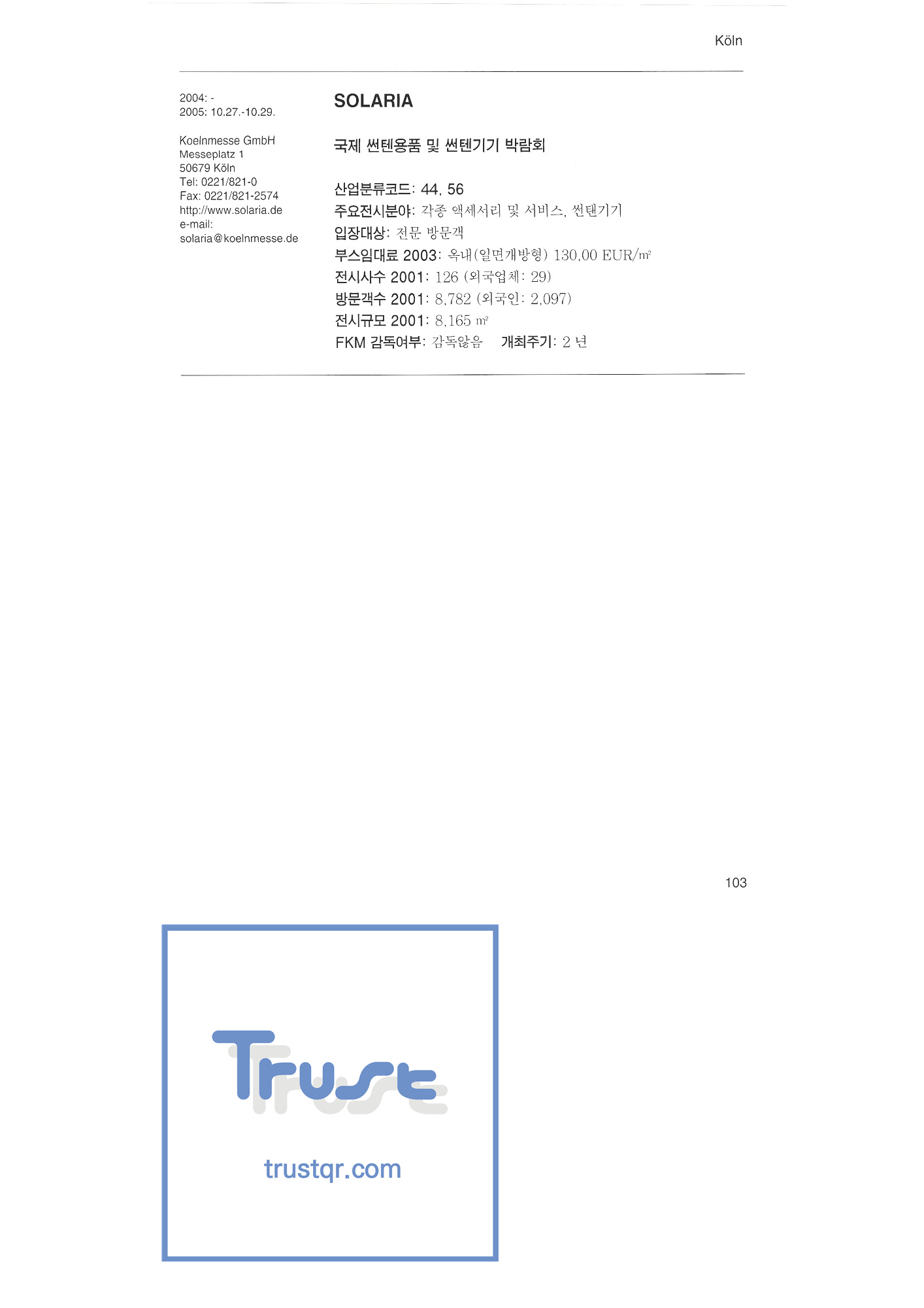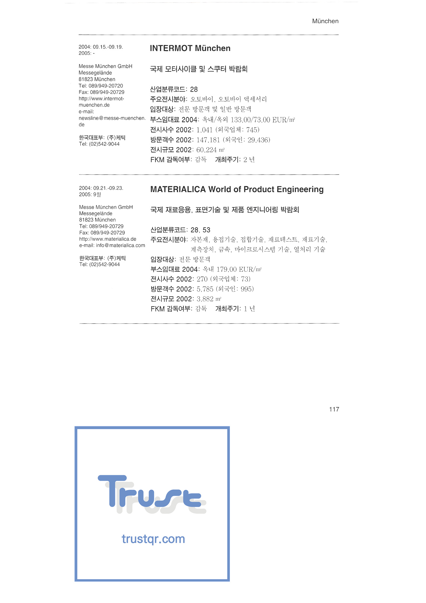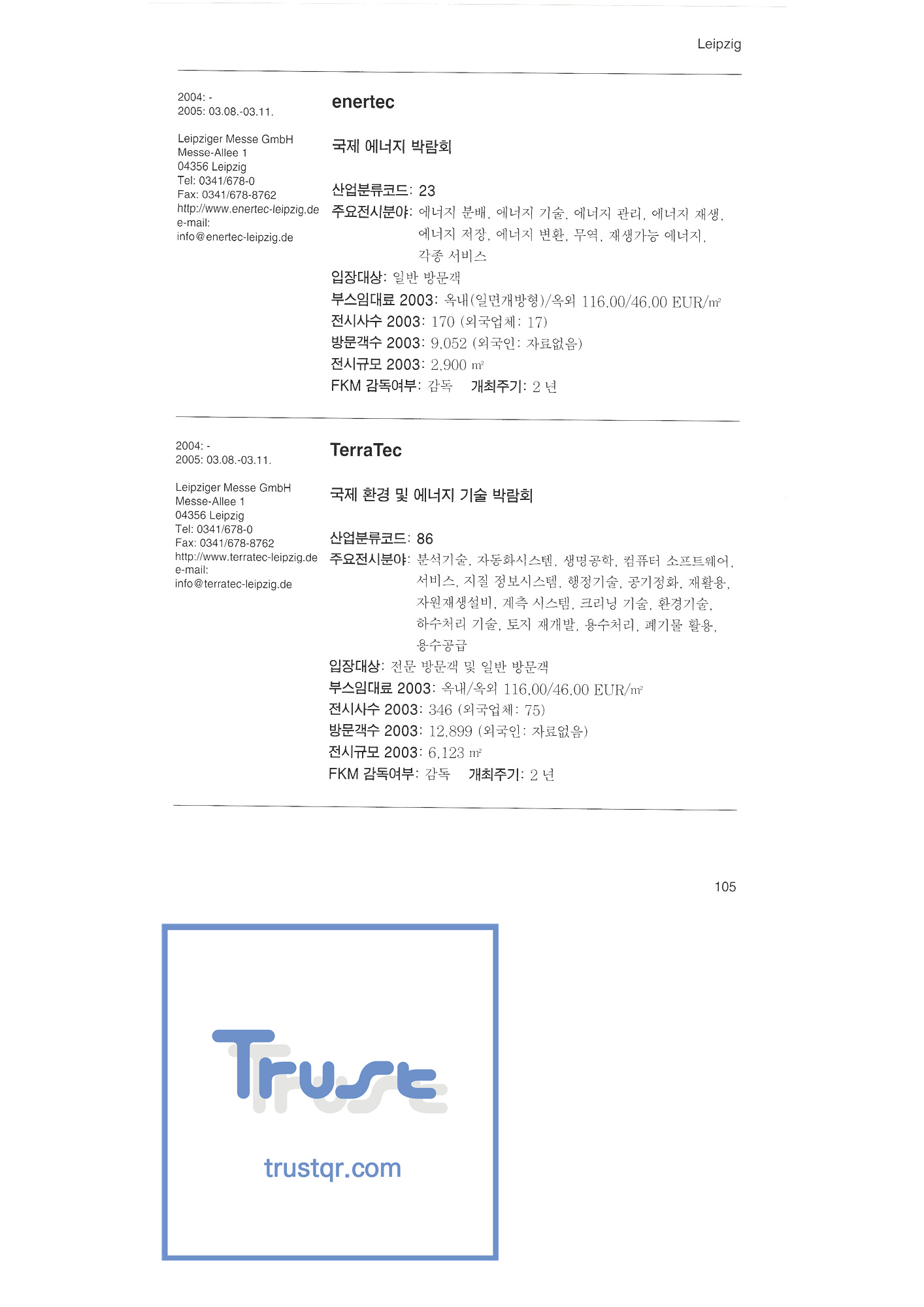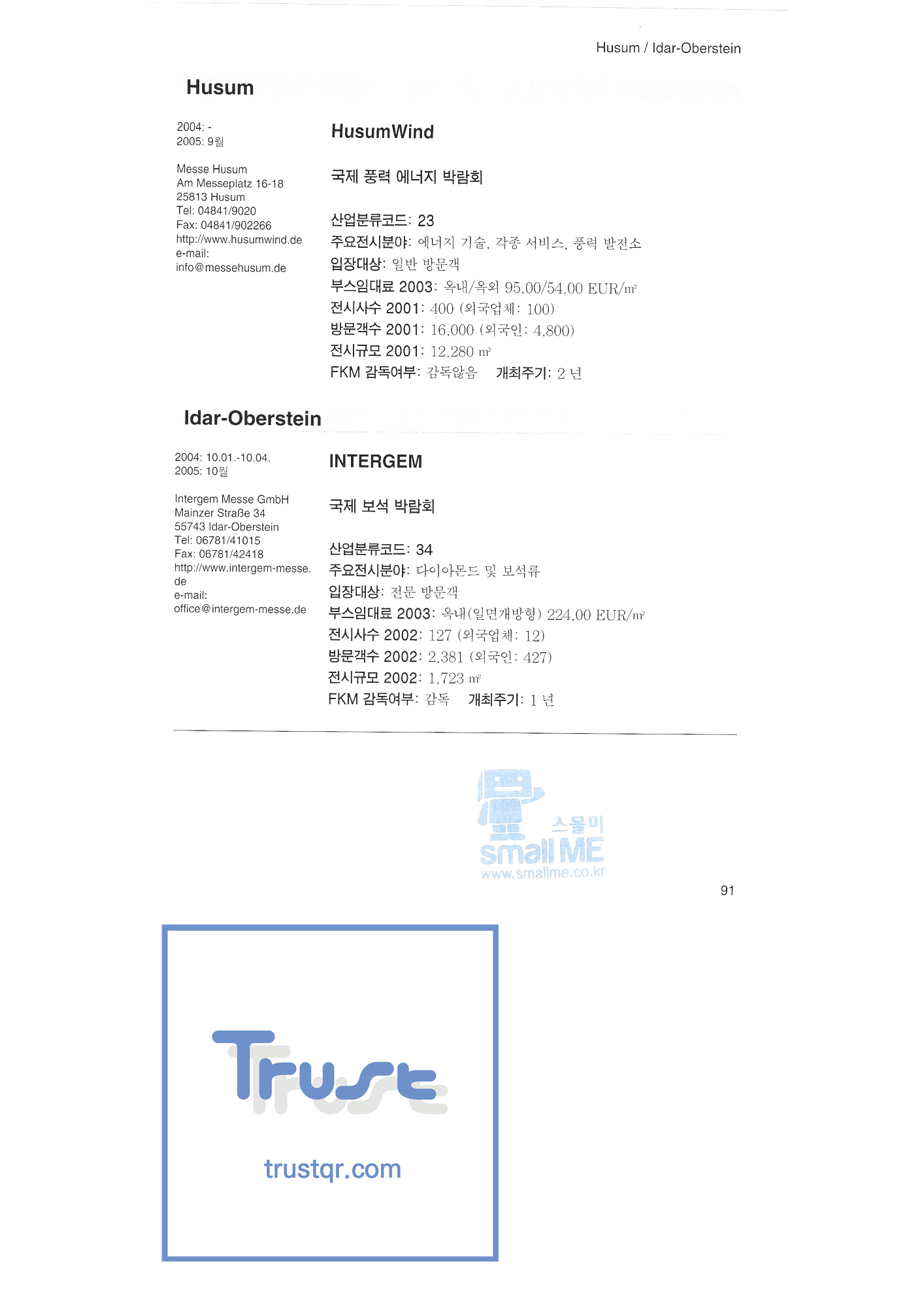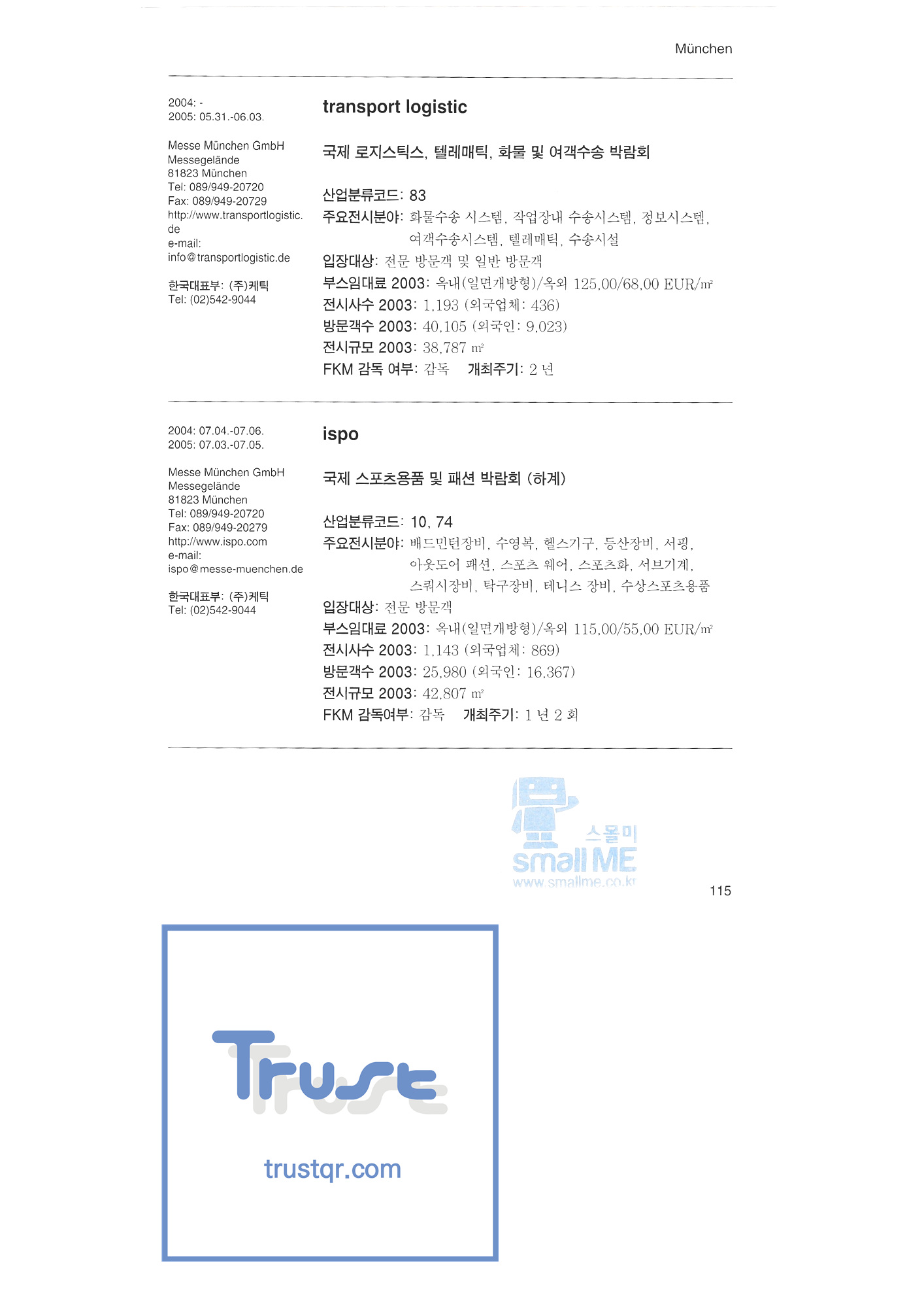 | 독일박람회 2004/2005 - 3 국제조선,기계및해양기술박람회 국제보트박람회 국제카페트및바닥재박람회 국제실버용품및서비스박람회 국제사무기기및정보통신박람회 하노버산업박람회 국제계측및자동화전/하노버산업박람회 마이크로기술전/하노버산업박람회 연구및신기술전/하노버산업박람회 도장기술전/하노버산업박람회 부품하도급전/하노버산업박람회 공장자동회전/하노버산업박람회 에너지전/하노버산업박람회 동력전달및제어전/하노버산업박람회 공기압기술전/하노버산업박람회 국제목공기기박람회 국제소방기기박람회 국제공작기계박람회 국제상용자동차박람회 국제물류박람회 국제생명공학박람회 국제판금속가공기술박람회 국제축산박람회 국제농업기기박람회 국제풍력에너지박람회 국제보석박람회 국제중고기계및장비박람회 국제원예박람회 국제가구박람회 국제제과/당과박람회 국제교육박람회 국제가전및관련부품박람회 국제하드웨어박람회 국제페인트및건물보호박람회 국제치과기자재박람회 국제가구제조및목재인테리어박람회 국제식품가공기술박람회 국제로지스틱스,텔레매틱,화물운송박람회 국제봉제기계박람회 국제재활용및폐기물처리박람회 국제스포츠및등산용품박람회 국제자전거박람회 국제유아용품박람회 국제사진및영상박람회 국제사무기구및사무자동화박람회 국제예술전시회 국제식품종합박람회 국제위락시설,운동장,수영장건설및유지보수박람회 국제썬텐용품및썬텐기기박람회 국제팬션박람회(봄) 국제서적박람회 국제에너지박람회 국제환경및에너지기술박람회 국제자동차박람회 국제장애인재활용품및노인용품박람회 국제부품,모듈및기술박람회 국제패션박람회(가을) 국제시계및보석박람회 국제건축박람회 국제문화유산유지보수박람회 국제호텔,요식업박람회 국제건축자재,빌딩시스템,리노베이션박람회 국제스포츠용품및패션박람회(동계) 국제시계,보석,귀금속,은세공및관련기술박람회 국제골프코스시공박람회 국제중소기업박람회 국제건설기계,건축자재기계,건설중장비박람회 국제호텔및케이터링박람회 국제환경박람회:수자원,하수,폐기물,재활용 국제계측,생물공학,진단및실험실장비박람회 국제지붕및벽처리기술박람회 국제로지스틱스,텔레매틱,화물및여객수송박람회 국제스포츠용품및패션박람회(하계) 국제레이저및광전자박람회 국제임업기술박람회 국제모터사이클및스쿠터박람회 국제재료응용,표면기술및제품엔지니어링박람회 국제제약박람회 국제음료기술및생산박람회 |