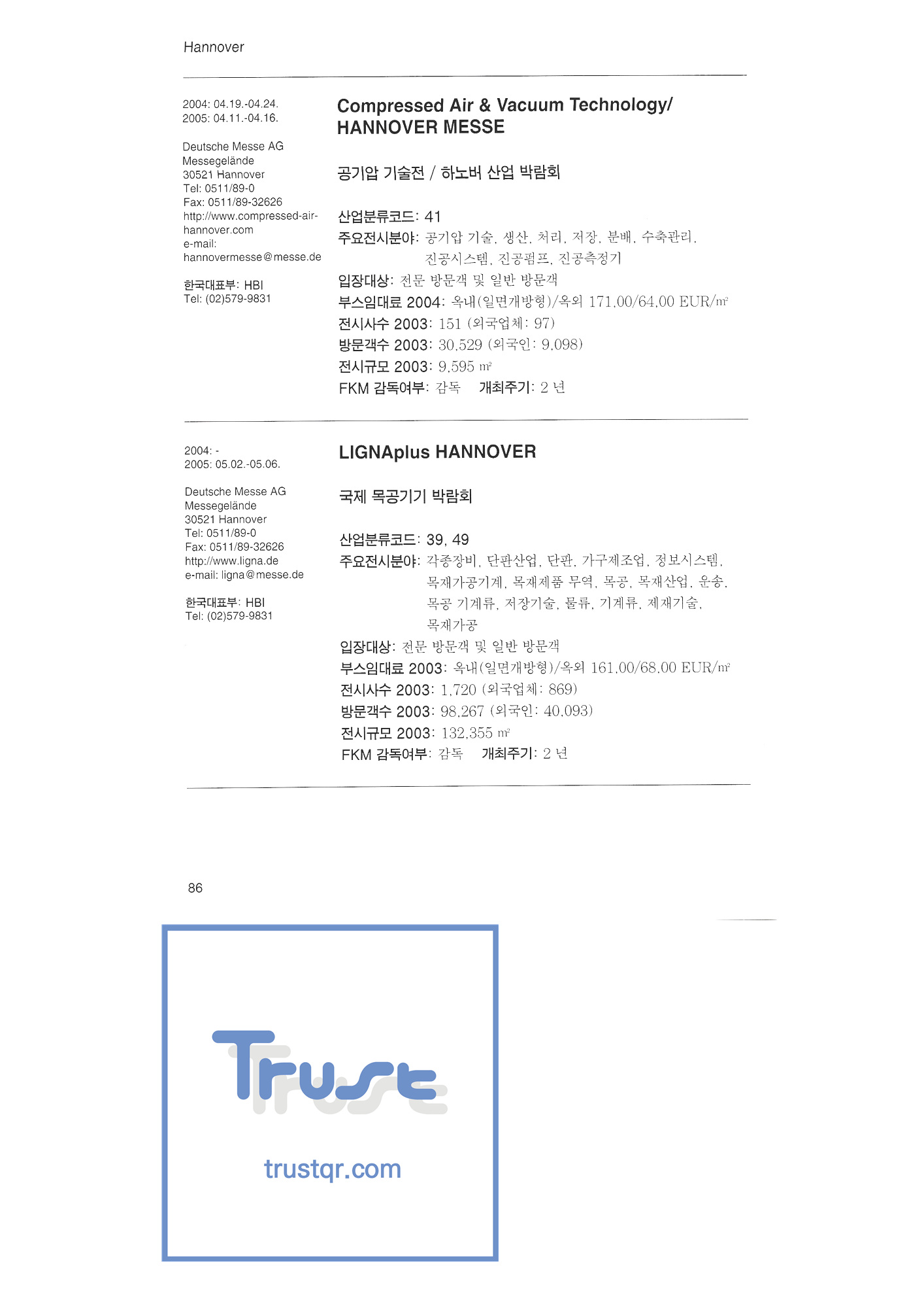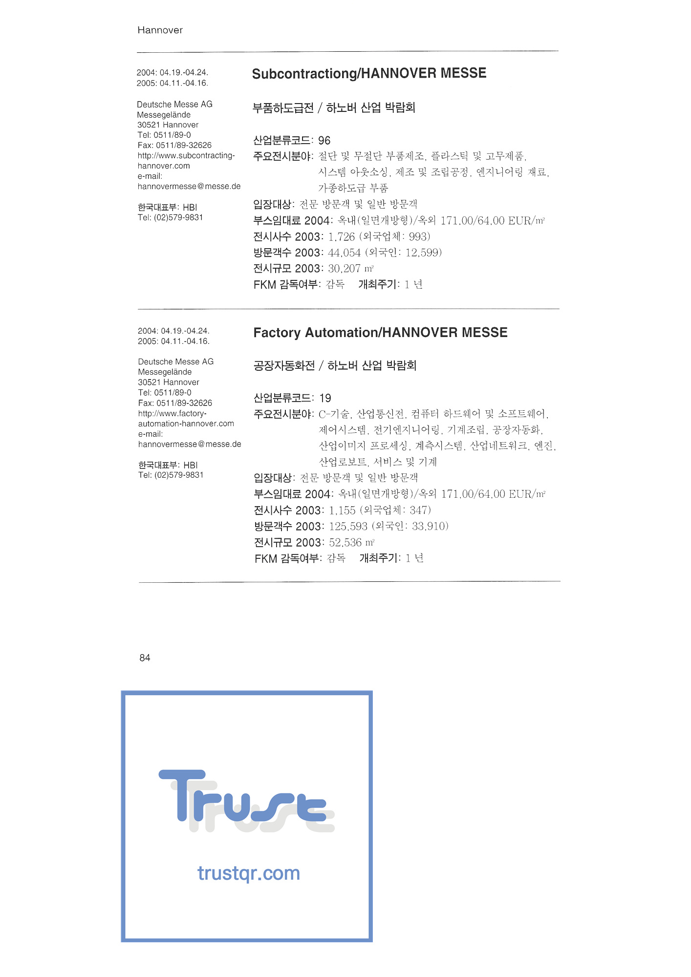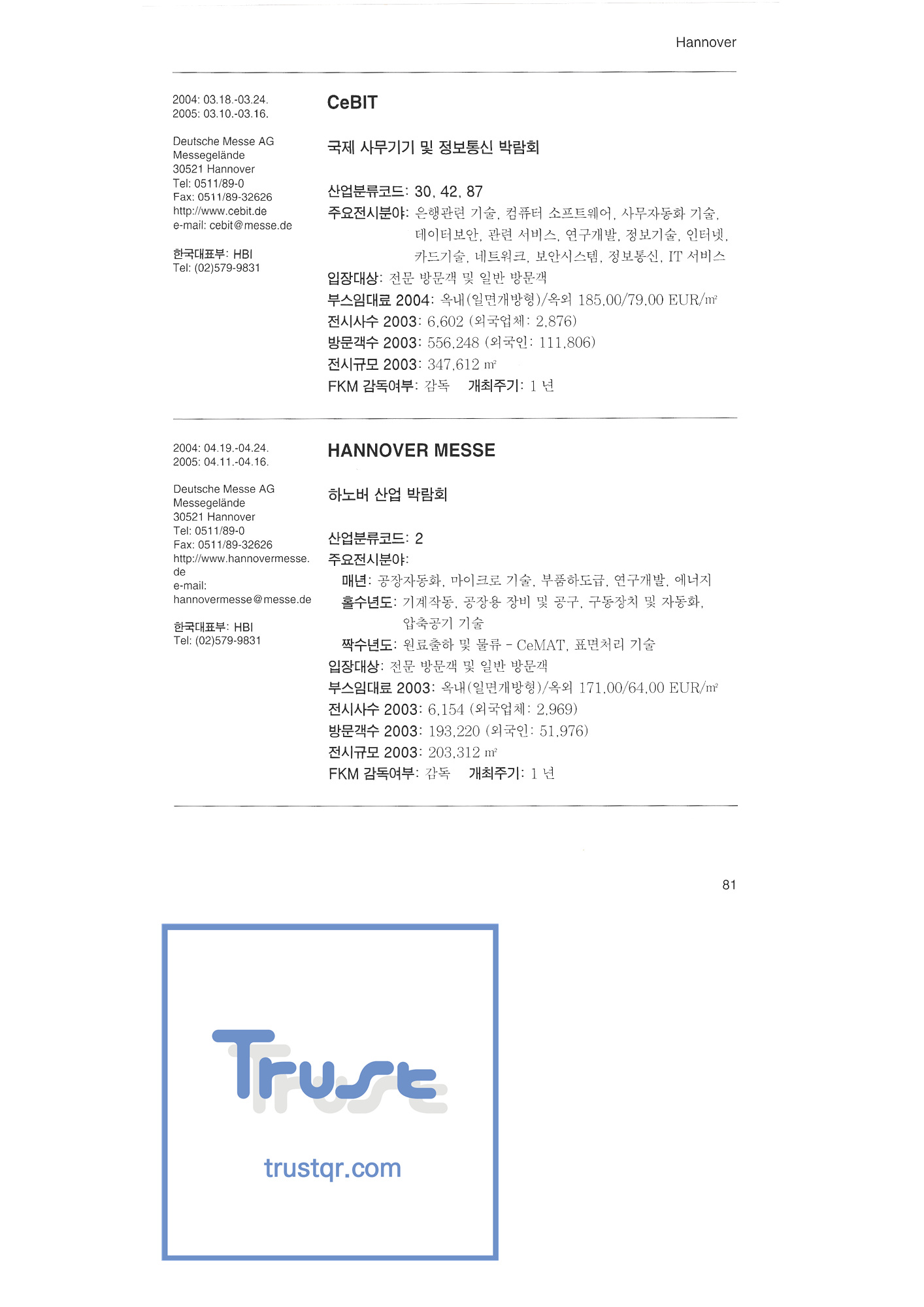 Germany Fair 2004/2005-3 International Shipbuilding, Machinery and Offshore Technology Expo International Boat Fair International Carpet & Flooring Fair International Silver Goods and Service Fair International Office Equipment and Information and Communication Fair Hannover Industry Fair International Measurement and Automation Exhibition/Hannover Industry Fair Micro Technology Exhibition/Hannover Industry Fair Research and New Technology Exhibition/Hannover Industry Fair Painting Technology Exhibition/Hannover Industry Fair Parts subcontracting/Hannover Industry Fair Factory automatic rotation/Hannover Industry Fair Energy Exhibition/Hannover Industry Fair Power Transmission and Control Exhibition/Hannover Industry Fair Pneumatic Technology Exhibition/Hannover Industry Fair International Woodworking Equipment Fair International Fire Fighting Equipment Fair International Machine Tool Fair International Commercial Vehicle Fair International Logistics Fair International Biotechnology Fair International Sheet Metal Processing Technology Fair International Livestock Fair International Agricultural Equipment Fair International Wind Energy Expo International Jewelery Fair International Used Machinery and Equipment Fair International Horticultural Expo International Furniture Fair International Confectionery/Confectionery Fair International Education Fair International home appliance and related parts exhibition International Hardware Fair International Paint & Building Protection Fair International Dental Equipment Fair International Furniture Manufacturing and Wood Interior Fair International Food Processing Technology Expo International Logistics, Telematics, Freight Transportation Fair International Sewing Machine Fair International Recycling and Waste Treatment Fair International Sports and Climbing Supplies Fair International Bicycle Fair International Baby Products Fair International Photo and Video Fair International Office Organization and Office Automation Expo International Art Exhibition International Food Fair International amusement facility, playground, swimming pool construction and maintenance exhibition International Sunten Supplies and Sunten Equipment Fair International Pension Fair (Spring) International Book Fair International Energy Expo International Environment and Energy Technology Fair International Automobile Expo International Handicapped Recycling Supplies and Elderly Products Fair International Parts, Modules and Technology Fair International Fashion Fair (Autumn) International Watch and Jewelery Fair International Architecture Fair International Cultural Heritage Maintenance Fair International Hotel and Food Service Fair International Building Materials, Building System, Renovation Fair International Sports Goods and Fashion Fair (Winter) International Watch, Jewelry, Precious Metals, Silver Crafting and Related Technology Fair International Golf Course Construction Fair International Small and Medium Business Fair International Construction Machinery, Construction Materials Machinery, Heavy Construction Equipment Fair International Hotel and Catering Fair International environmental fair: water resources, sewage, waste, recycling International Measurement, Biotechnology, Diagnosis and Laboratory Equipment Fair International Roof and Wall Treatment Technology Expo International Logistics, Telematics, Cargo and Passenger Transportation Fair International Sports Goods and Fashion Fair (Summer) International Laser and Optoelectronic Expo International Forestry Technology Fair International Motorcycle and Scooter Fair International Material Application, Surface Technology and Product Engineering Fair International Pharmaceutical Fair International Beverage Technology and Production Fair |