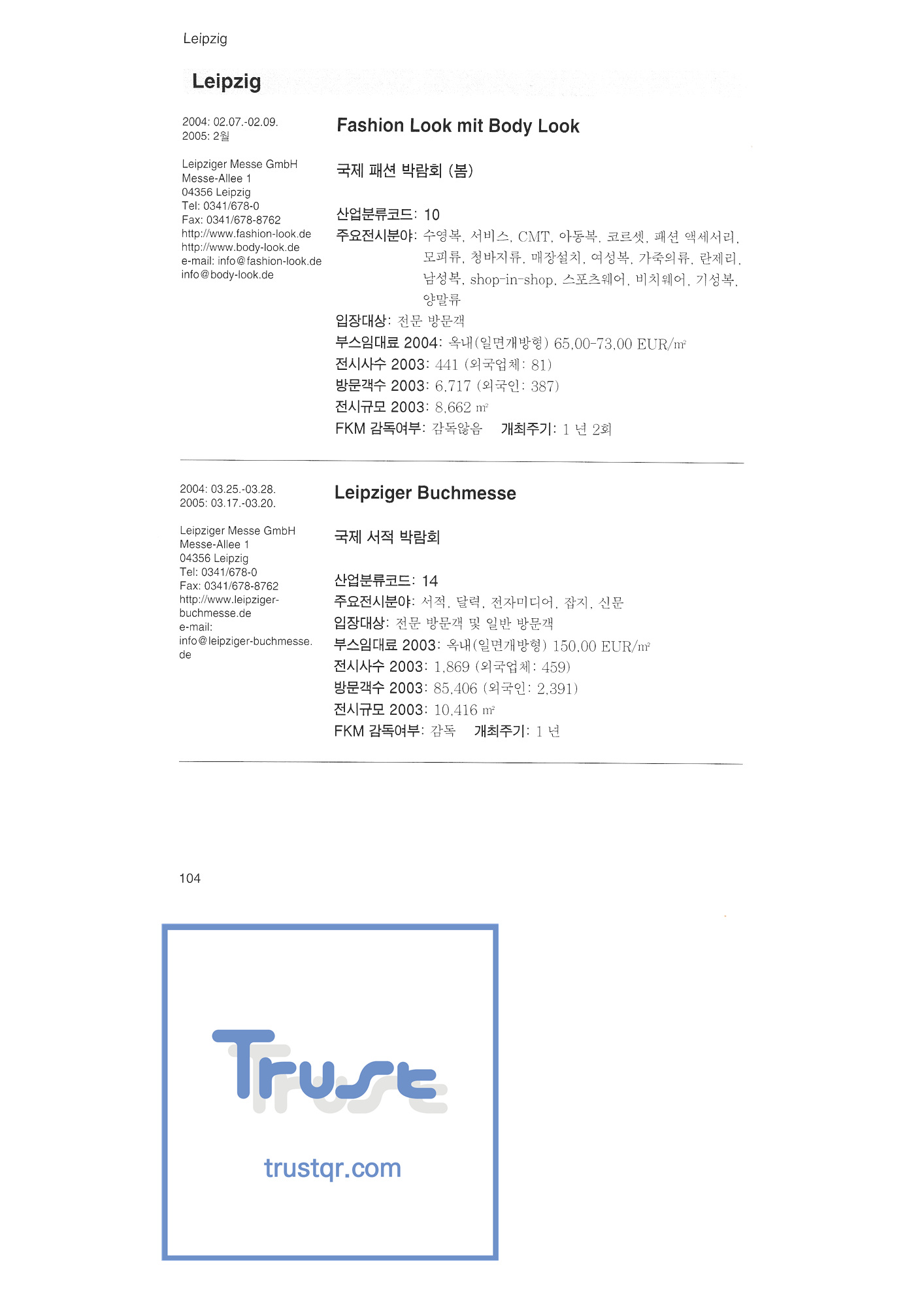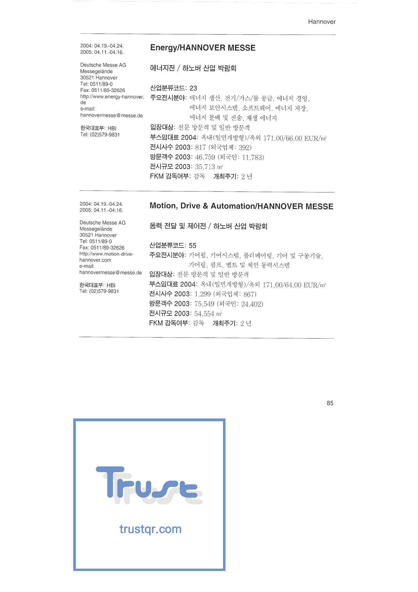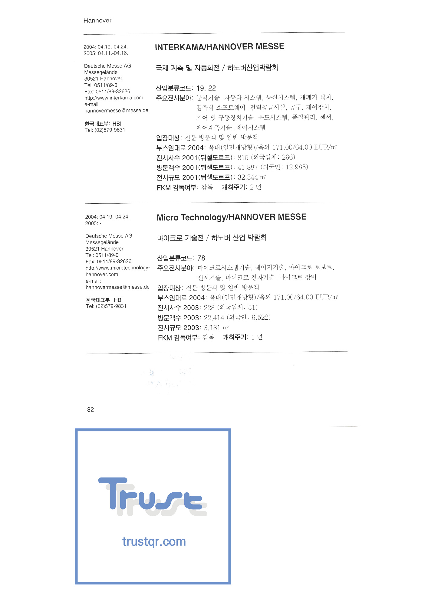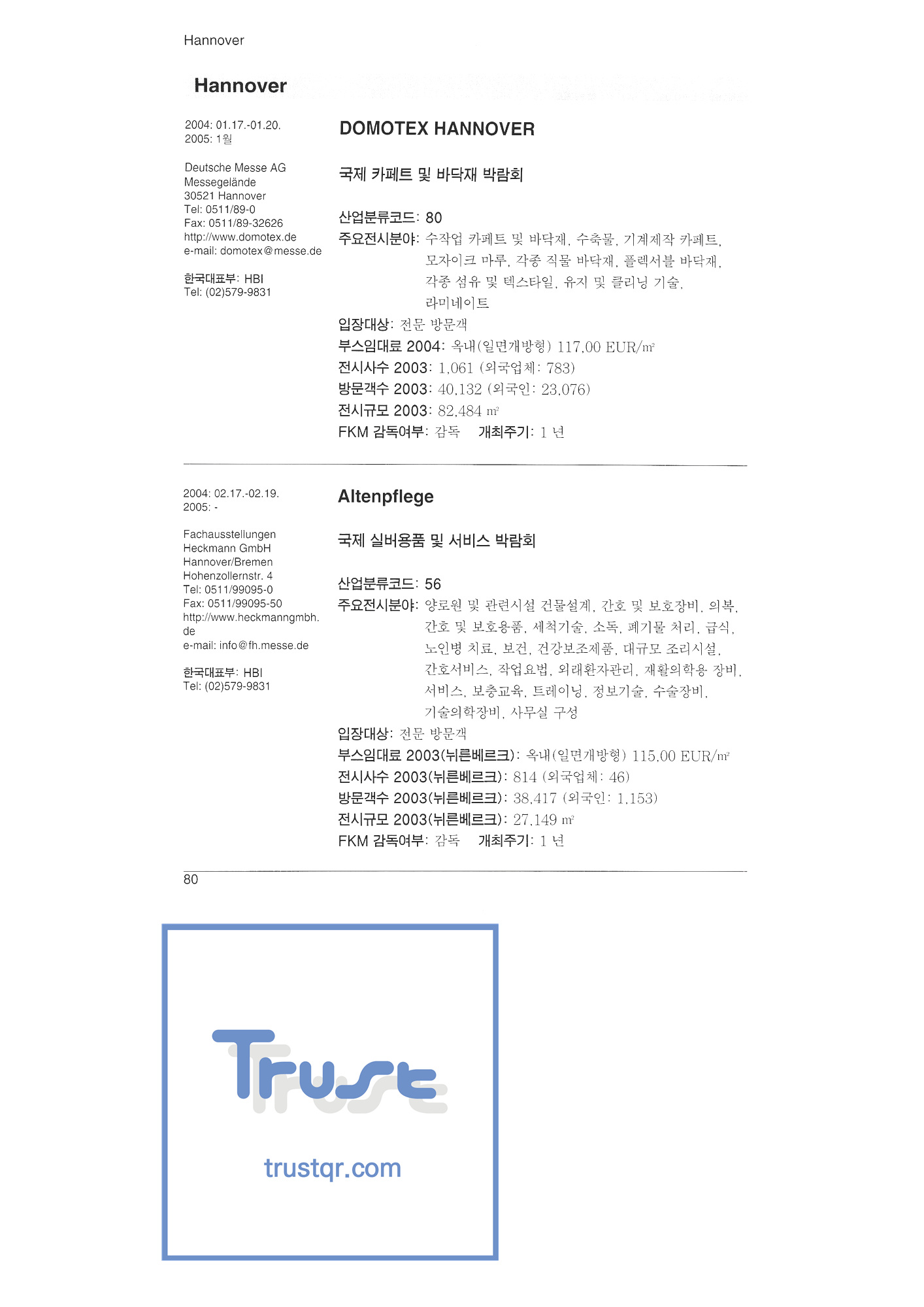 Germany Fair 2004/2005-3 International Shipbuilding, Machinery and Offshore Technology Expo International Boat Fair International Carpet & Flooring Fair International Silver Goods and Service Fair International Office Equipment and Information and Communication Fair Hannover Industry Fair International Measurement and Automation Exhibition/Hannover Industry Fair Micro Technology Exhibition/Hannover Industry Fair Research and New Technology Exhibition/Hannover Industry Fair Painting Technology Exhibition/Hannover Industry Fair Parts subcontracting/Hannover Industry Fair Factory automatic rotation/Hannover Industry Fair Energy Exhibition/Hannover Industry Fair Power Transmission and Control Exhibition/Hannover Industry Fair Pneumatic Technology Exhibition/Hannover Industry Fair International Woodworking Equipment Fair International Fire Fighting Equipment Fair International Machine Tool Fair International Commercial Vehicle Fair International Logistics Fair International Biotechnology Fair International Sheet Metal Processing Technology Fair International Livestock Fair International Agricultural Equipment Fair International Wind Energy Expo International Jewelery Fair International Used Machinery and Equipment Fair International Horticultural Expo International Furniture Fair International Confectionery/Confectionery Fair International Education Fair International home appliance and related parts exhibition International Hardware Fair International Paint & Building Protection Fair International Dental Equipment Fair International Furniture Manufacturing and Wood Interior Fair International Food Processing Technology Expo International Logistics, Telematics, Freight Transportation Fair International Sewing Machine Fair International Recycling and Waste Treatment Fair International Sports and Climbing Supplies Fair International Bicycle Fair International Baby Products Fair International Photo and Video Fair International Office Organization and Office Automation Expo International Art Exhibition International Food Fair International amusement facility, playground, swimming pool construction and maintenance exhibition International Sunten Supplies and Sunten Equipment Fair International Pension Fair (Spring) International Book Fair International Energy Expo International Environment and Energy Technology Fair International Automobile Expo International Handicapped Recycling Supplies and Elderly Products Fair International Parts, Modules and Technology Fair International Fashion Fair (Autumn) International Watch and Jewelery Fair International Architecture Fair International Cultural Heritage Maintenance Fair International Hotel and Food Service Fair International Building Materials, Building System, Renovation Fair International Sports Goods and Fashion Fair (Winter) International Watch, Jewelry, Precious Metals, Silver Crafting and Related Technology Fair International Golf Course Construction Fair International Small and Medium Business Fair International Construction Machinery, Construction Materials Machinery, Heavy Construction Equipment Fair International Hotel and Catering Fair International environmental fair: water resources, sewage, waste, recycling International Measurement, Biotechnology, Diagnosis and Laboratory Equipment Fair International Roof and Wall Treatment Technology Expo International Logistics, Telematics, Cargo and Passenger Transportation Fair International Sports Goods and Fashion Fair (Summer) International Laser and Optoelectronic Expo International Forestry Technology Fair International Motorcycle and Scooter Fair International Material Application, Surface Technology and Product Engineering Fair International Pharmaceutical Fair International Beverage Technology and Production Fair |