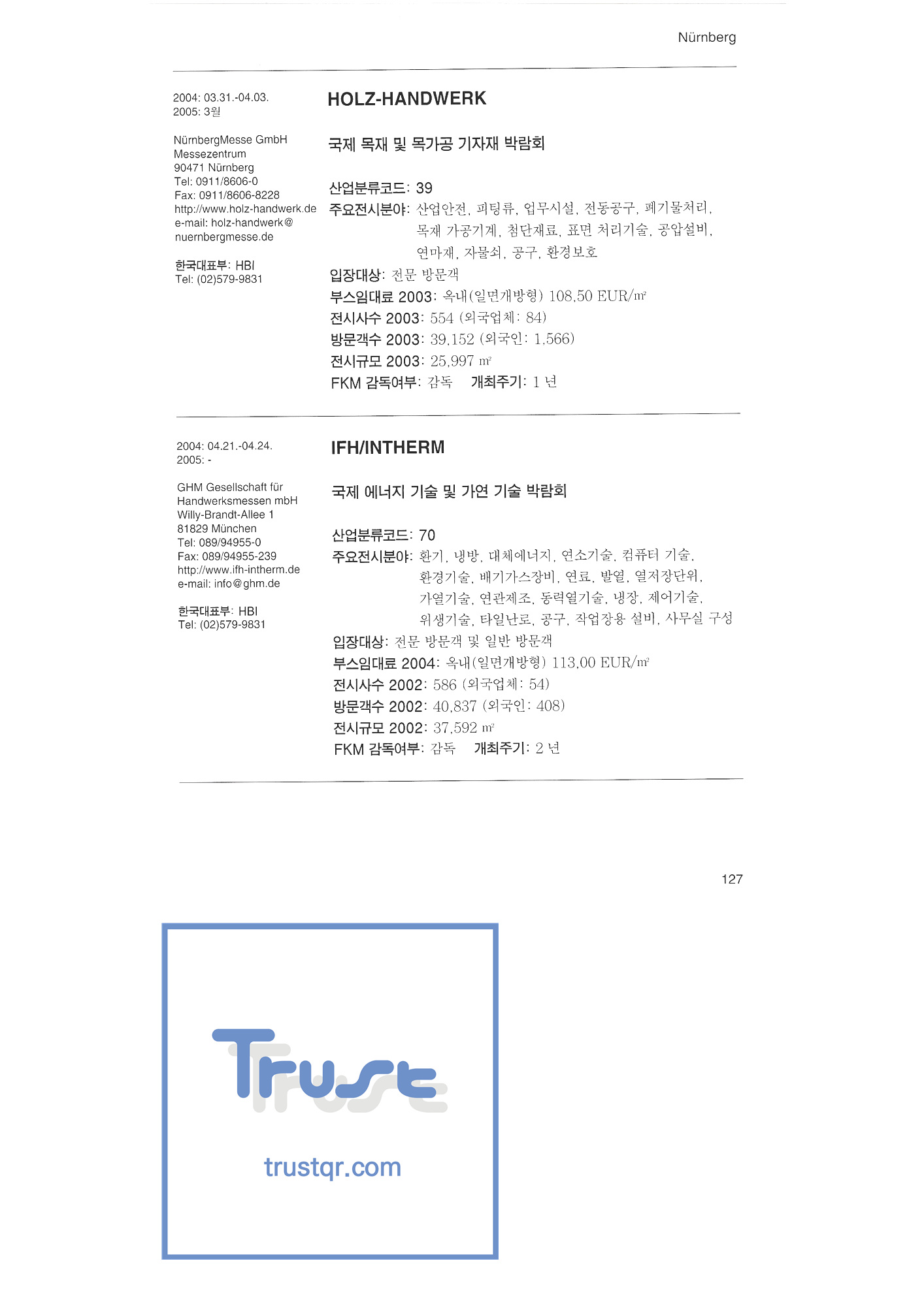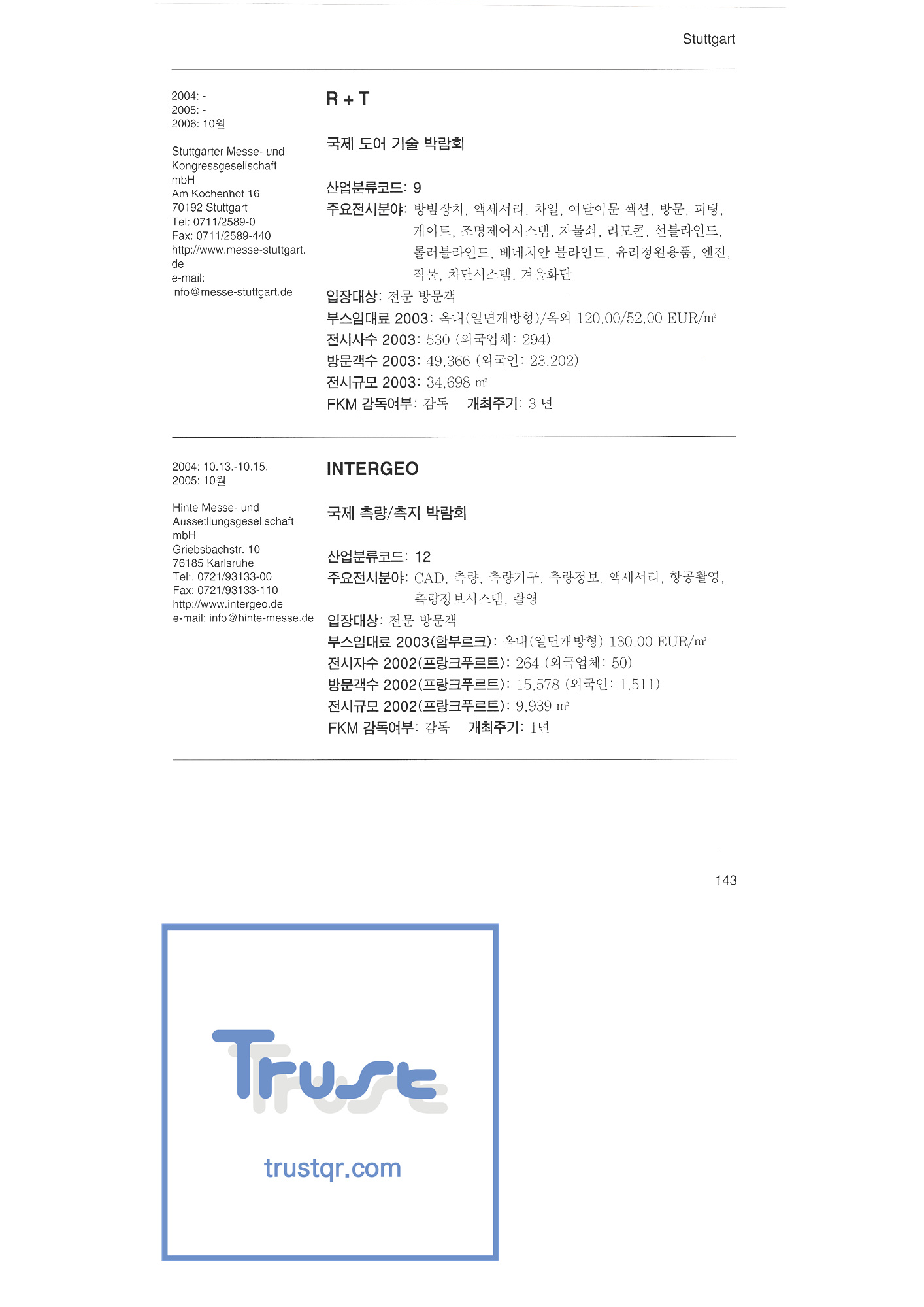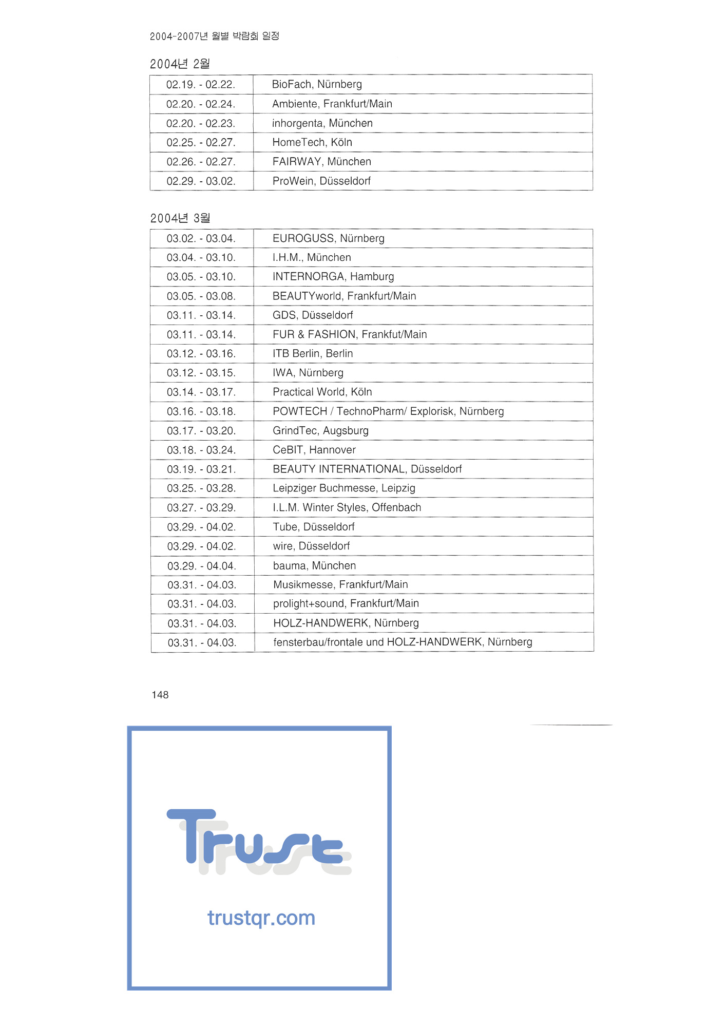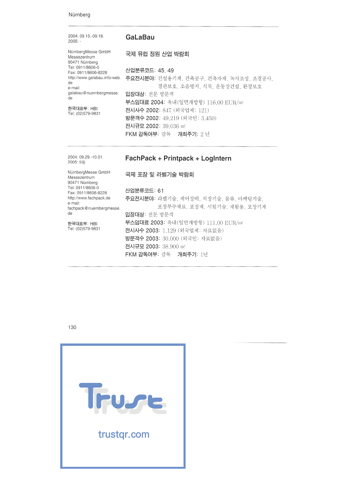 Germany Fair 2004/2005-4 International Airport Facility and Technology Fair International Golf Fair International Corporate Real Estate Fair International Information Technology, Telecommunication and New Media Expo International Bakery Technology Fair International Ceramic and Powder Metallurgy Fair International Electronic Components Fair International Electronic Production Equipment Fair International Game Machine and Vending Machine Fair Nuremberg International Hotel and Catering Fair International Toy Fair International Organic and Health Food Expo International Casting Fair International Guns Fair International Machine Processing Technology and Equipment Fair International Title Fair International Wood and Wood Processing Equipment Expo International Energy Technology and Combustible Technology Expo International Surface Treatment Technology Fair International Pet Supplies Fair International Natural Stone and Stone Processing Technology Fair International Microelectronics Integrated System Expo International European Garden Industry Fair International Packaging and Labeling Technology Fair Air Conditioning and Refrigeration Equipment Fair International Food and Beverage Industry Expo International Automation System and Parts Fair International Leather Products Fair International Leather Products Fair (Winter Products) International Leather Products Fair (Summer Products) European Horseback Riding Fair International Leather Shoes Parts Fair (Spring) International Footwear Manufacturing Fair (Autumn) Saarland International Exhibition Mobile Communication Product and Technology Fair International Quality Management Fair International Assembly Technology Fair International Hotel, Catering & Confectionery Fair International Grape and Fruit Cultivation, Wine Production and Fruit Juice Fair International Window Expo International Metal Processing Fair International swimming pool, bath, sauna fair International Industrial Image Processing and Recognition Technology Expo International Door Technology Fair International Surveying / Geodetic Fair International CAT Technology Fair International Bakery and Catering Fair International Industrial Safety Fair Korean-German Chamber of Commerce HBI Messe Frankfurt Korea Ketic Co., Ltd. IoConvex Co., Ltd. |