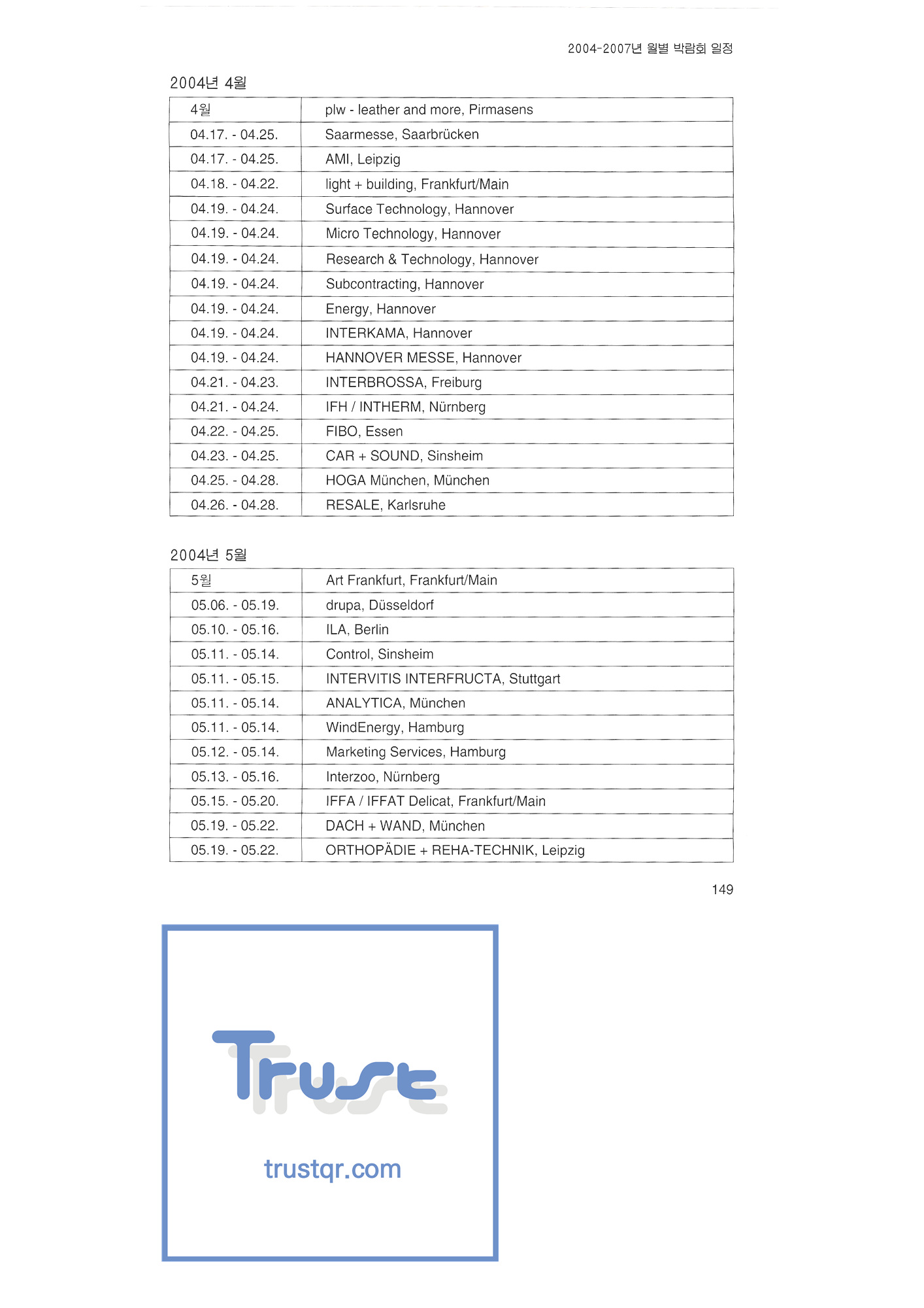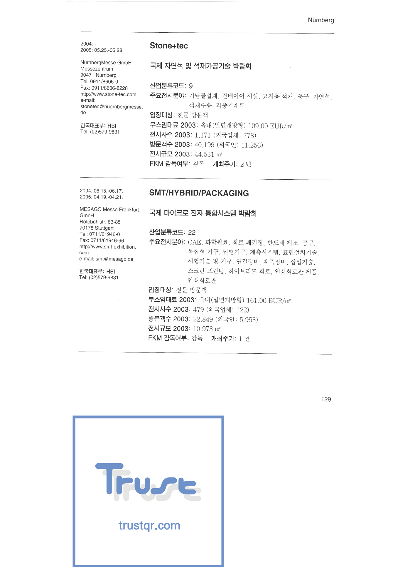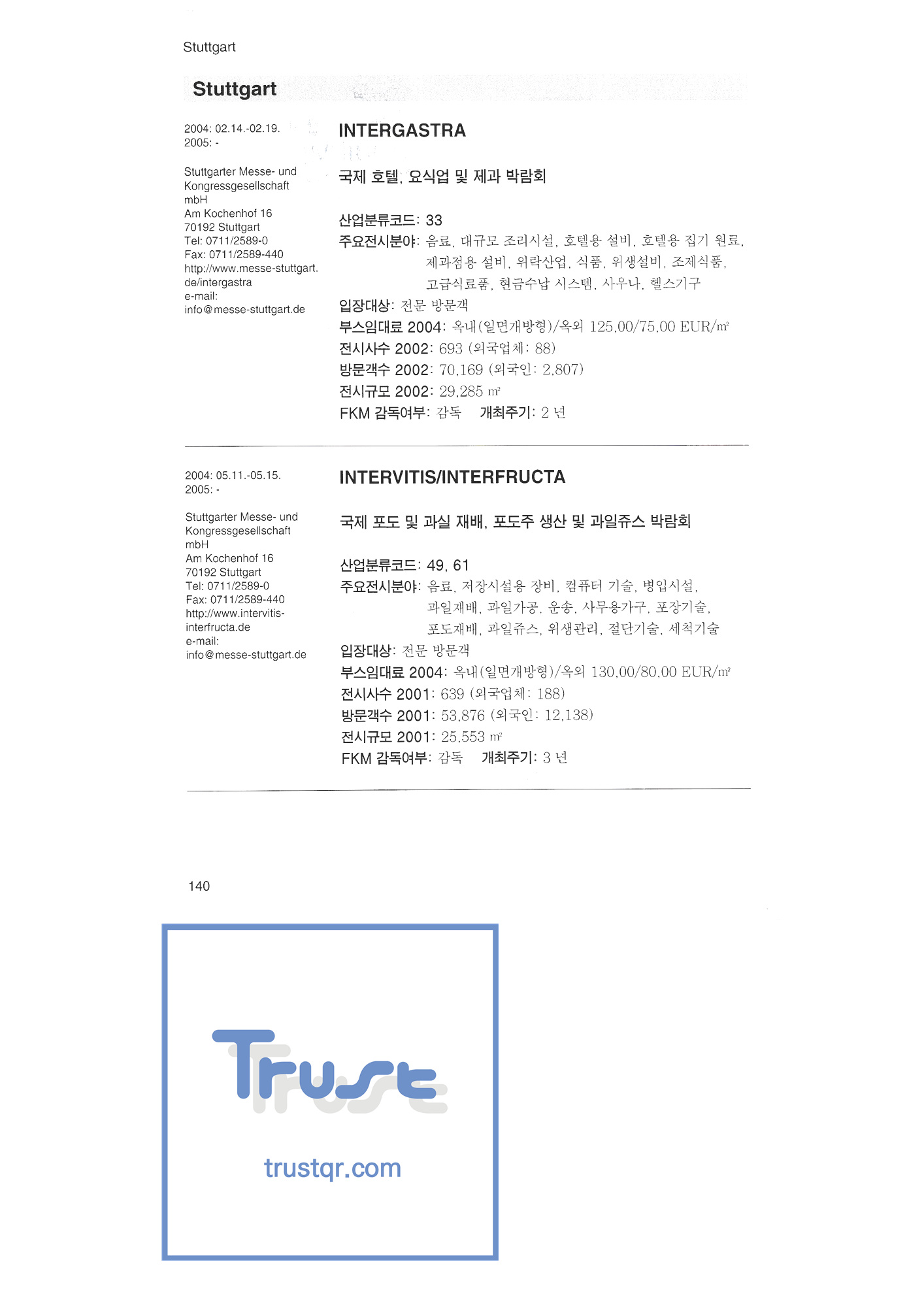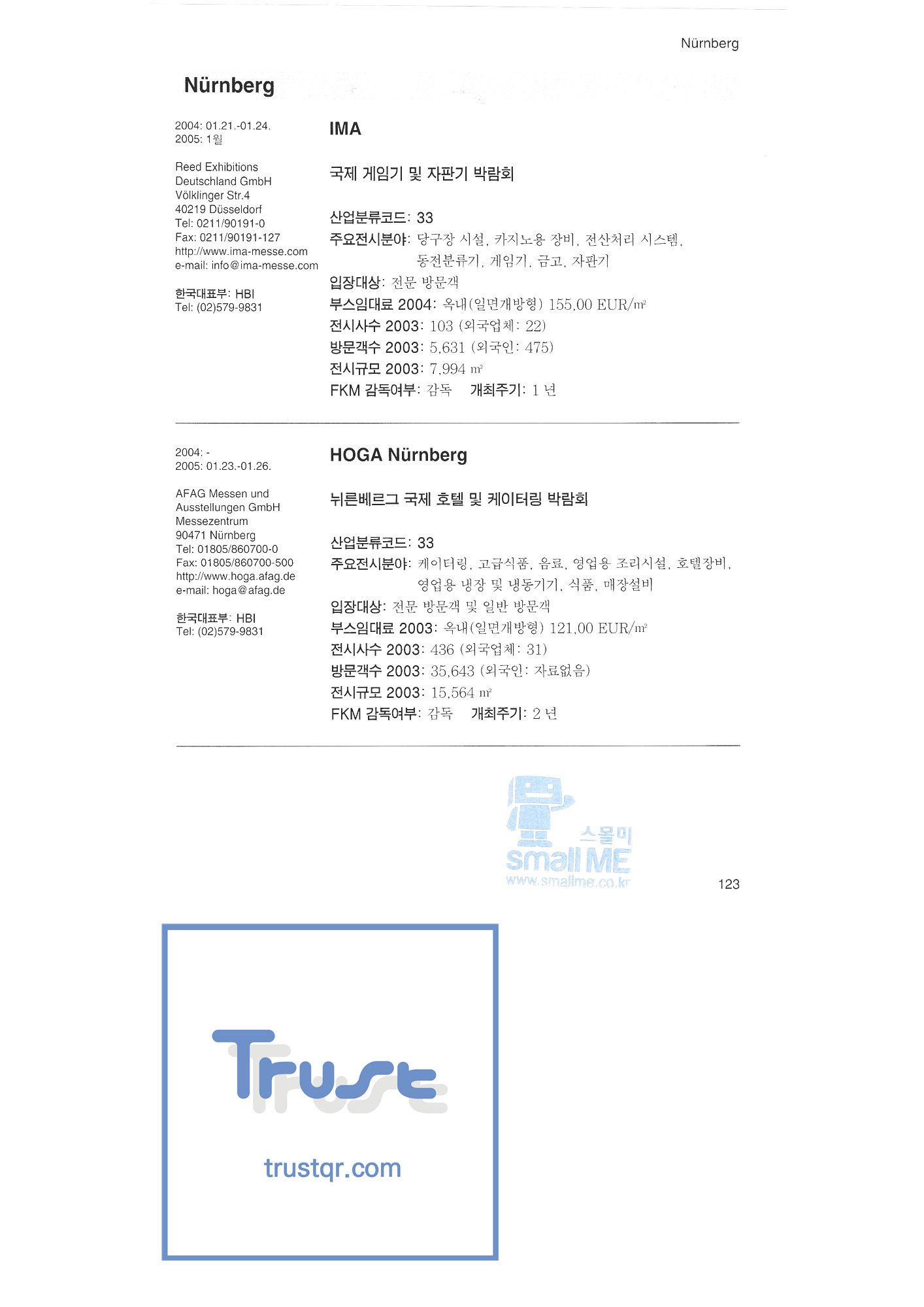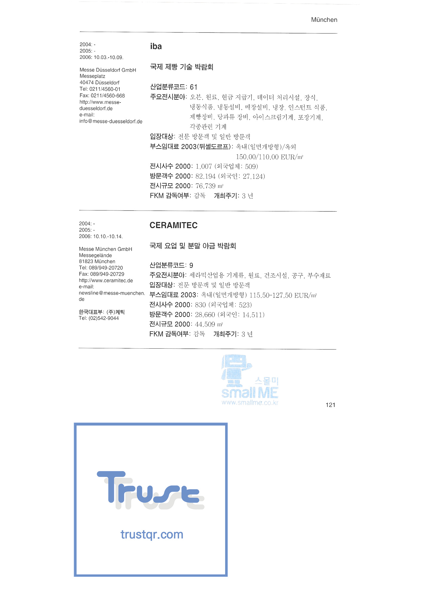 Germany Fair 2004/2005-4 International Airport Facility and Technology Fair International Golf Fair International Corporate Real Estate Fair International Information Technology, Telecommunication and New Media Expo International Bakery Technology Fair International Ceramic and Powder Metallurgy Fair International Electronic Components Fair International Electronic Production Equipment Fair International Game Machine and Vending Machine Fair Nuremberg International Hotel and Catering Fair International Toy Fair International Organic and Health Food Expo International Casting Fair International Guns Fair International Machine Processing Technology and Equipment Fair International Title Fair International Wood and Wood Processing Equipment Expo International Energy Technology and Combustible Technology Expo International Surface Treatment Technology Fair International Pet Supplies Fair International Natural Stone and Stone Processing Technology Fair International Microelectronics Integrated System Expo International European Garden Industry Fair International Packaging and Labeling Technology Fair Air Conditioning and Refrigeration Equipment Fair International Food and Beverage Industry Expo International Automation System and Parts Fair International Leather Products Fair International Leather Products Fair (Winter Products) International Leather Products Fair (Summer Products) European Horseback Riding Fair International Leather Shoes Parts Fair (Spring) International Footwear Manufacturing Fair (Autumn) Saarland International Exhibition Mobile Communication Product and Technology Fair International Quality Management Fair International Assembly Technology Fair International Hotel, Catering & Confectionery Fair International Grape and Fruit Cultivation, Wine Production and Fruit Juice Fair International Window Expo International Metal Processing Fair International swimming pool, bath, sauna fair International Industrial Image Processing and Recognition Technology Expo International Door Technology Fair International Surveying / Geodetic Fair International CAT Technology Fair International Bakery and Catering Fair International Industrial Safety Fair Korean-German Chamber of Commerce HBI Messe Frankfurt Korea Ketic Co., Ltd. IoConvex Co., Ltd. |