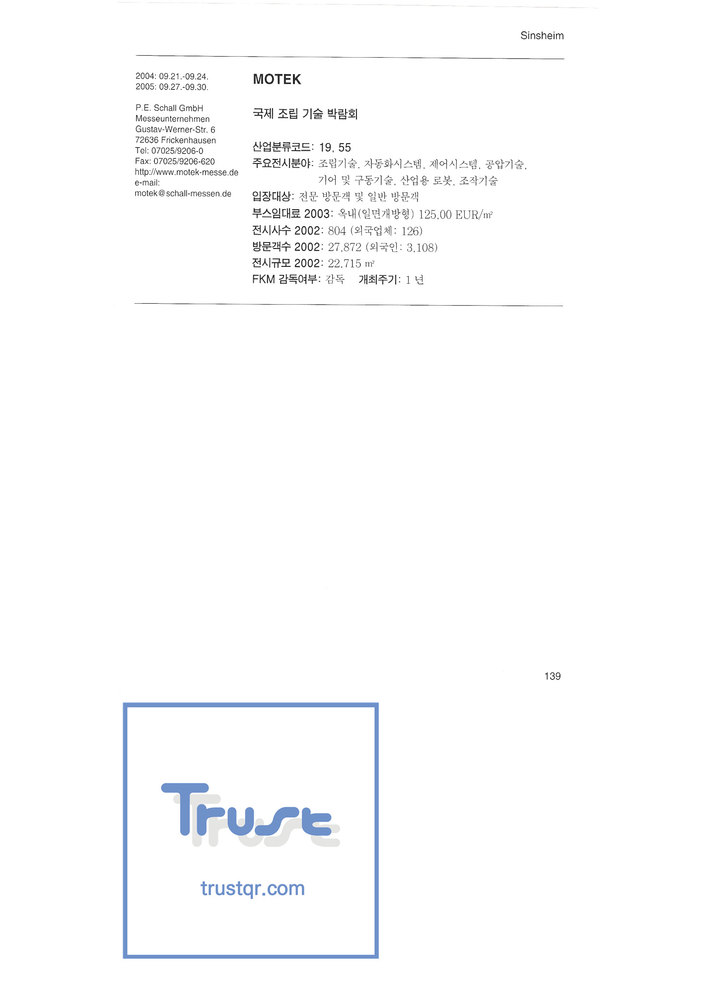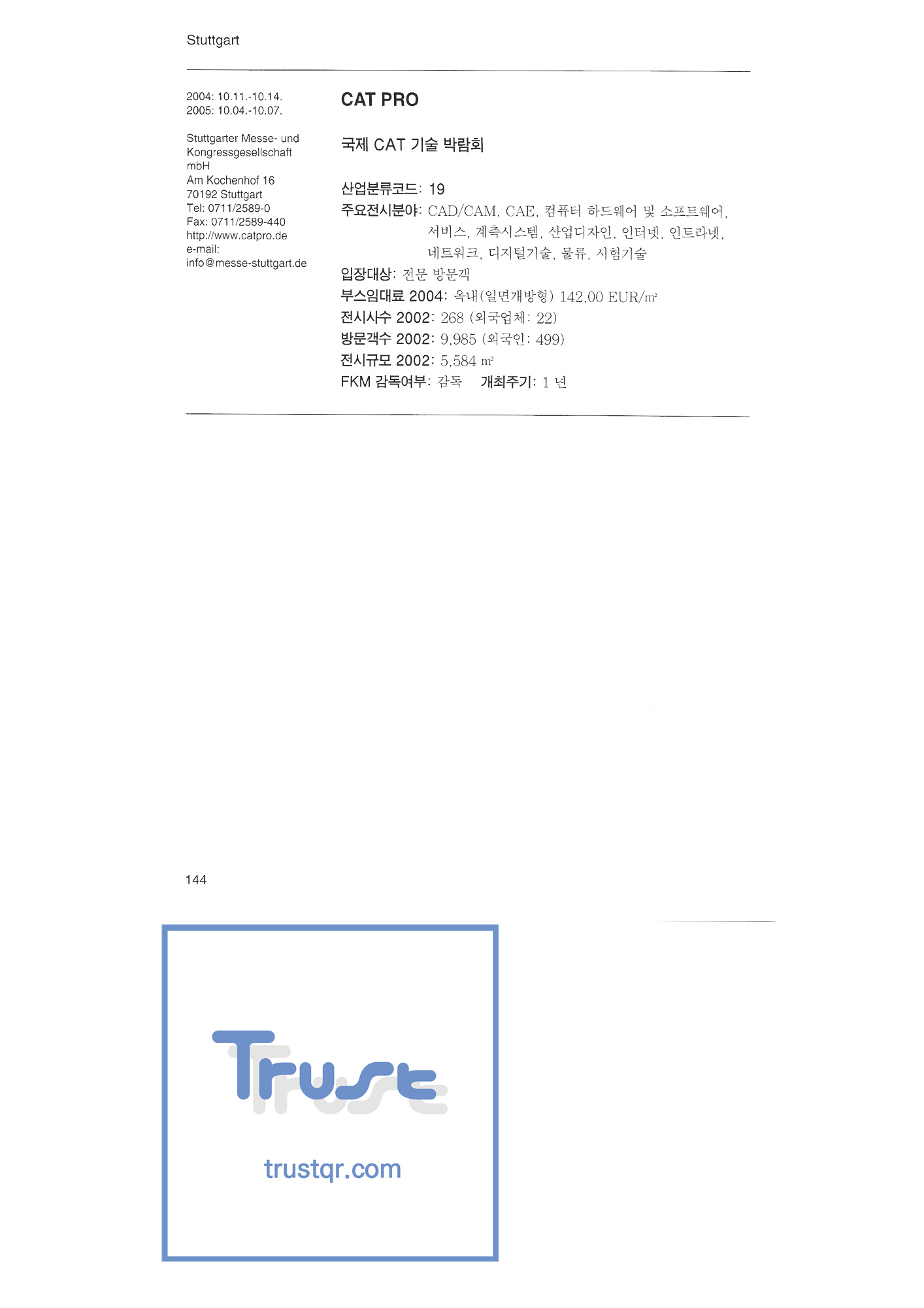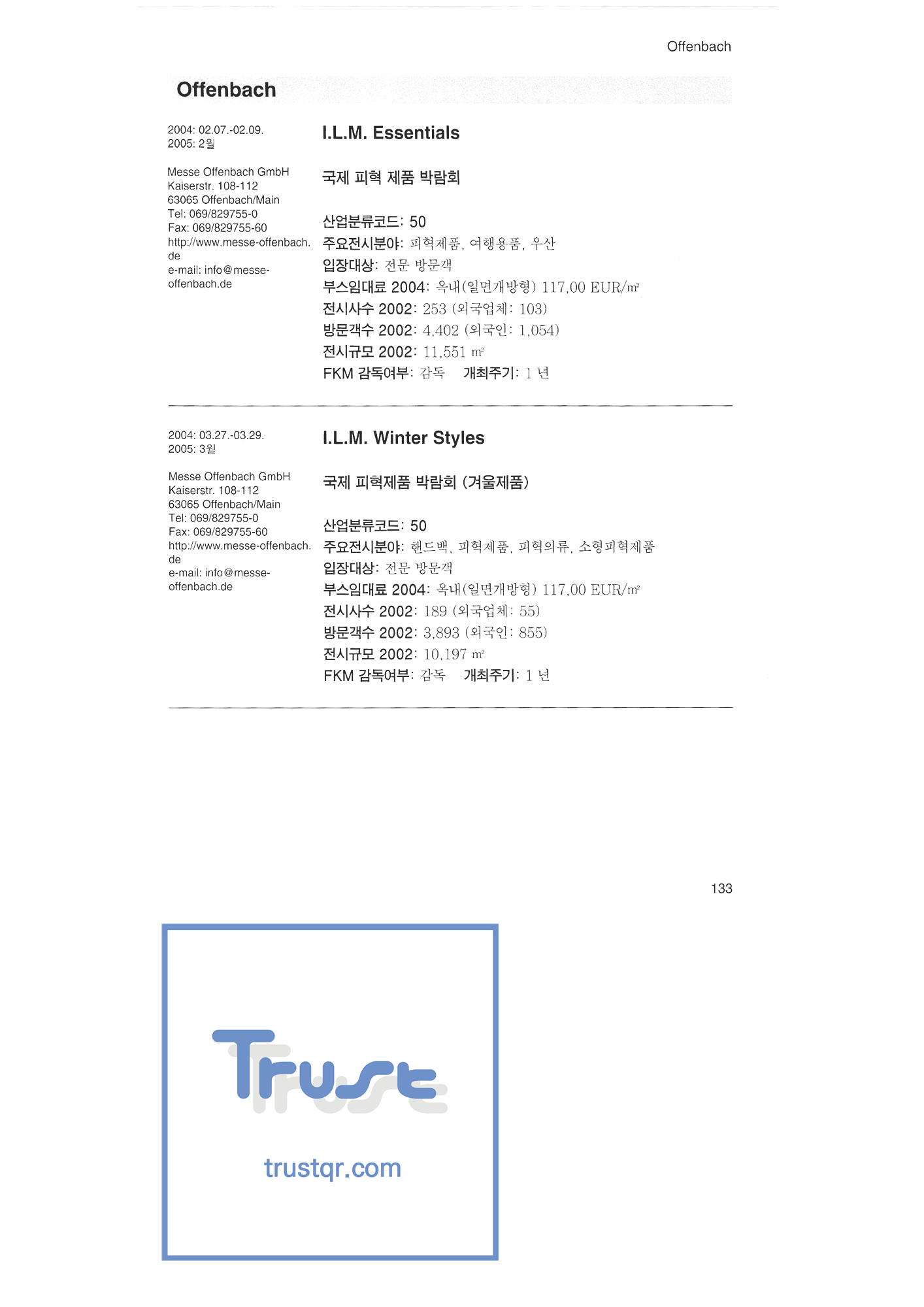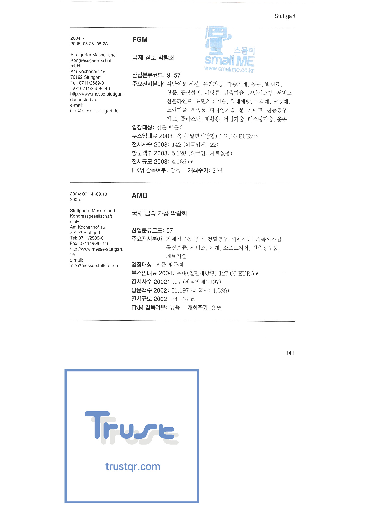 Germany Fair 2004/2005-4 International Airport Facility and Technology Fair International Golf Fair International Corporate Real Estate Fair International Information Technology, Telecommunication and New Media Expo International Bakery Technology Fair International Ceramic and Powder Metallurgy Fair International Electronic Components Fair International Electronic Production Equipment Fair International Game Machine and Vending Machine Fair Nuremberg International Hotel and Catering Fair International Toy Fair International Organic and Health Food Expo International Casting Fair International Guns Fair International Machine Processing Technology and Equipment Fair International Title Fair International Wood and Wood Processing Equipment Expo International Energy Technology and Combustible Technology Expo International Surface Treatment Technology Fair International Pet Supplies Fair International Natural Stone and Stone Processing Technology Fair International Microelectronics Integrated System Expo International European Garden Industry Fair International Packaging and Labeling Technology Fair Air Conditioning and Refrigeration Equipment Fair International Food and Beverage Industry Expo International Automation System and Parts Fair International Leather Products Fair International Leather Products Fair (Winter Products) International Leather Products Fair (Summer Products) European Horseback Riding Fair International Leather Shoes Parts Fair (Spring) International Footwear Manufacturing Fair (Autumn) Saarland International Exhibition Mobile Communication Product and Technology Fair International Quality Management Fair International Assembly Technology Fair International Hotel, Catering & Confectionery Fair International Grape and Fruit Cultivation, Wine Production and Fruit Juice Fair International Window Expo International Metal Processing Fair International swimming pool, bath, sauna fair International Industrial Image Processing and Recognition Technology Expo International Door Technology Fair International Surveying / Geodetic Fair International CAT Technology Fair International Bakery and Catering Fair International Industrial Safety Fair Korean-German Chamber of Commerce HBI Messe Frankfurt Korea Ketic Co., Ltd. IoConvex Co., Ltd. |