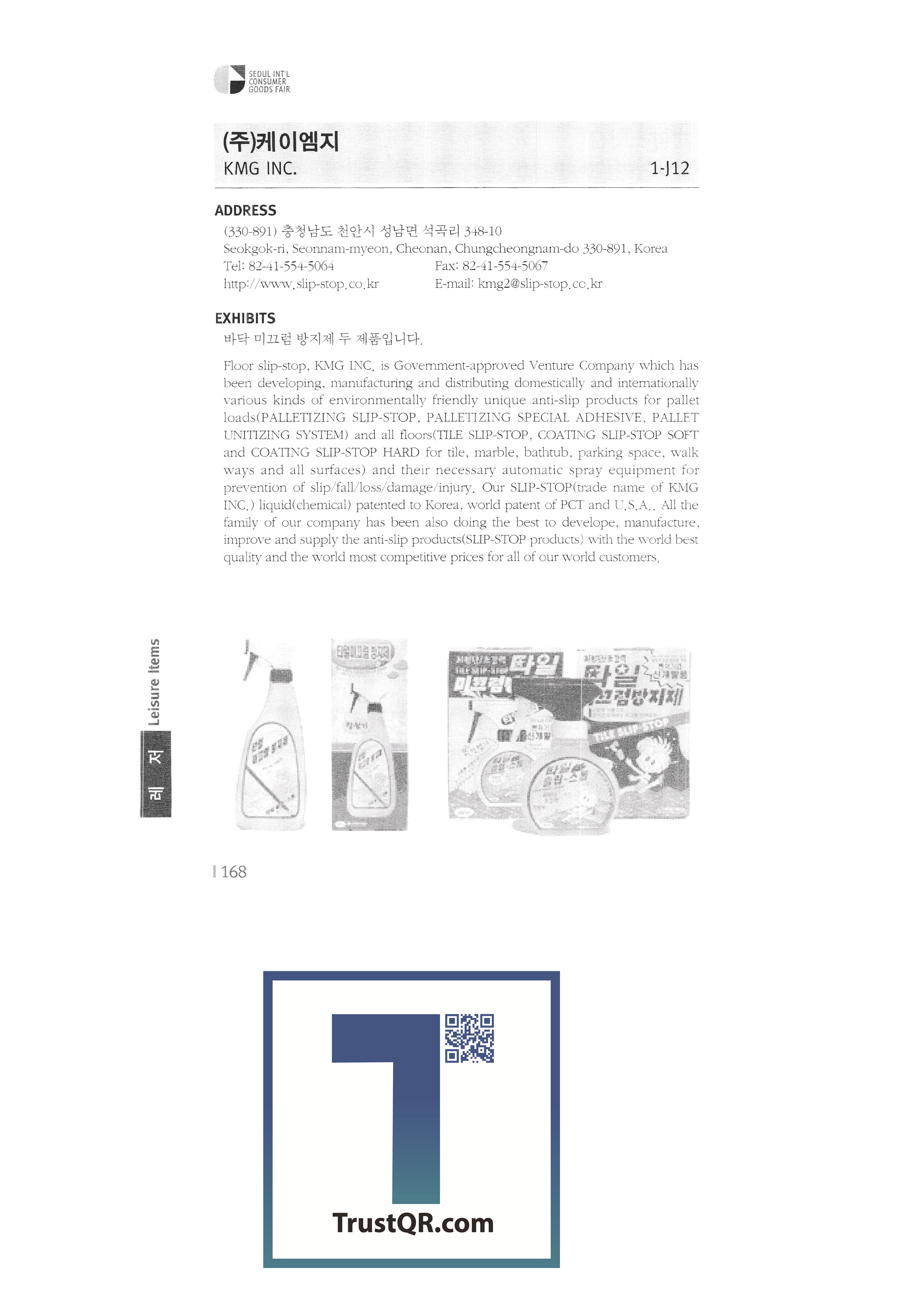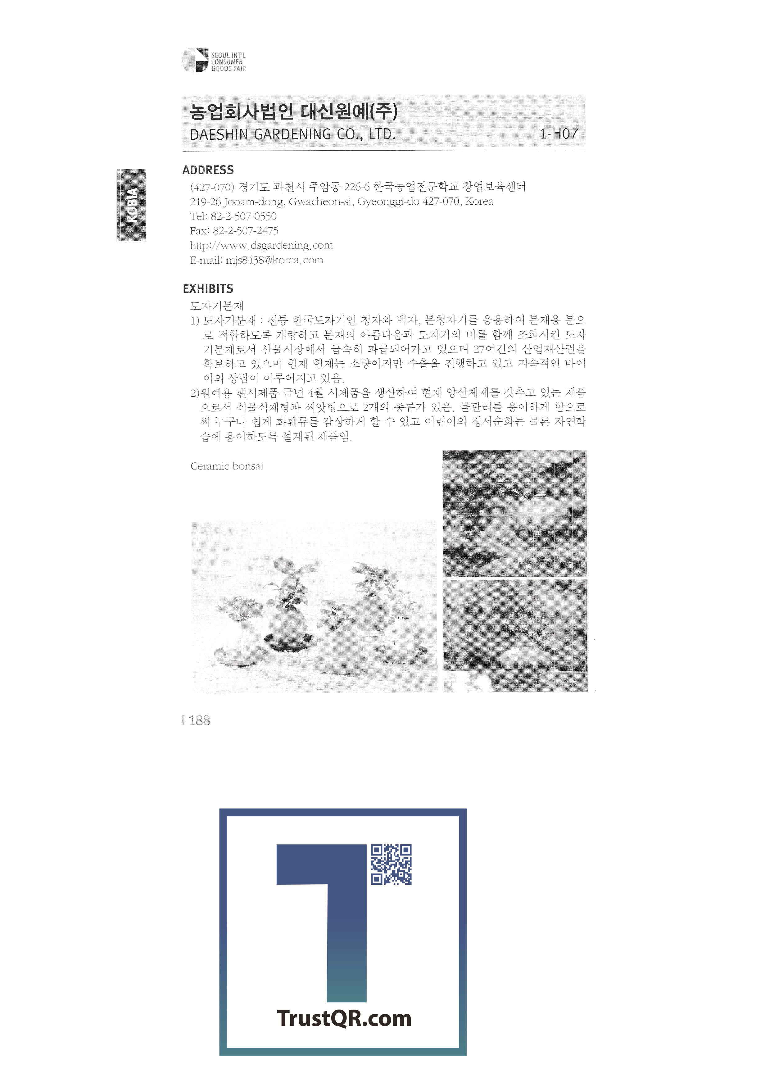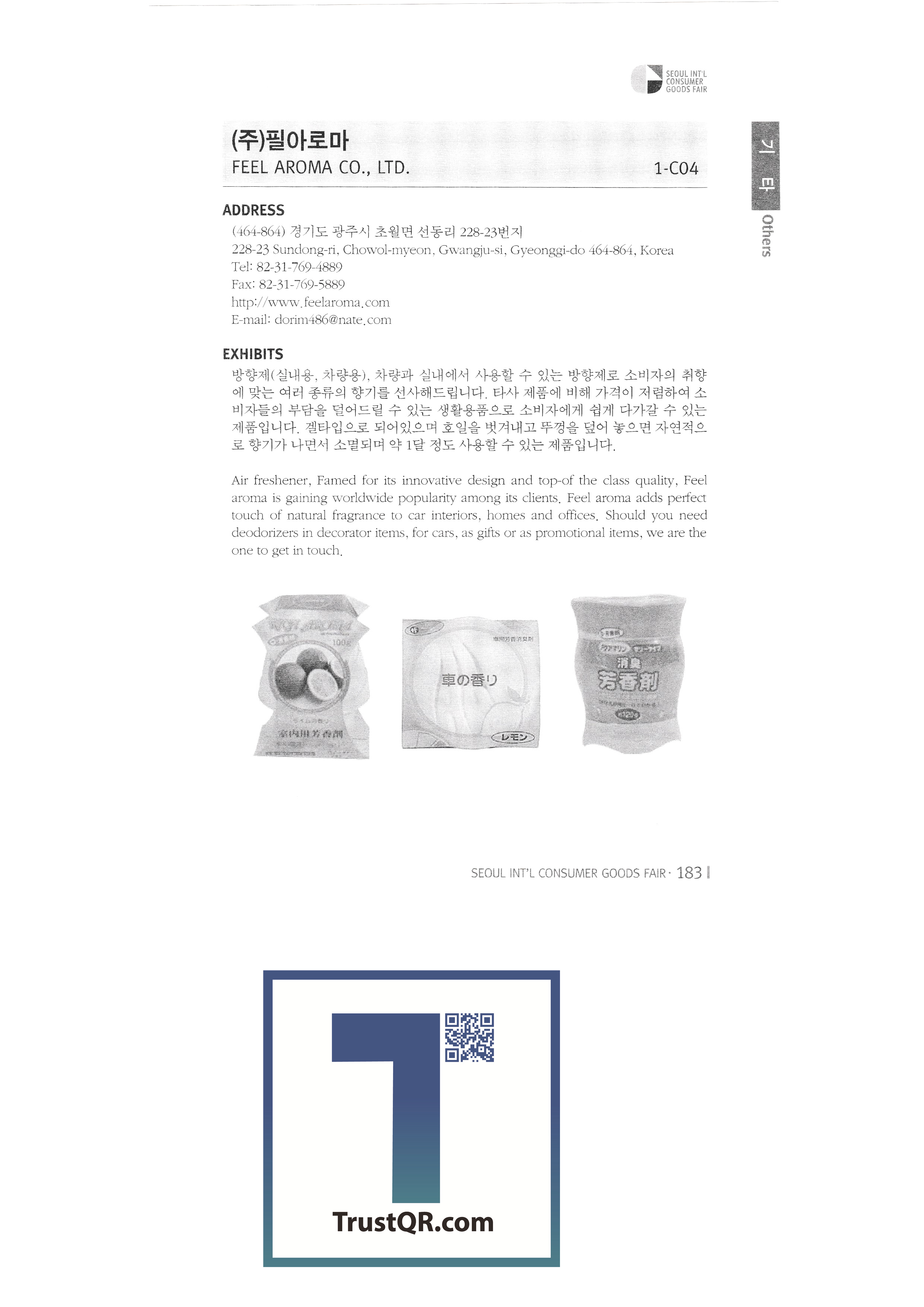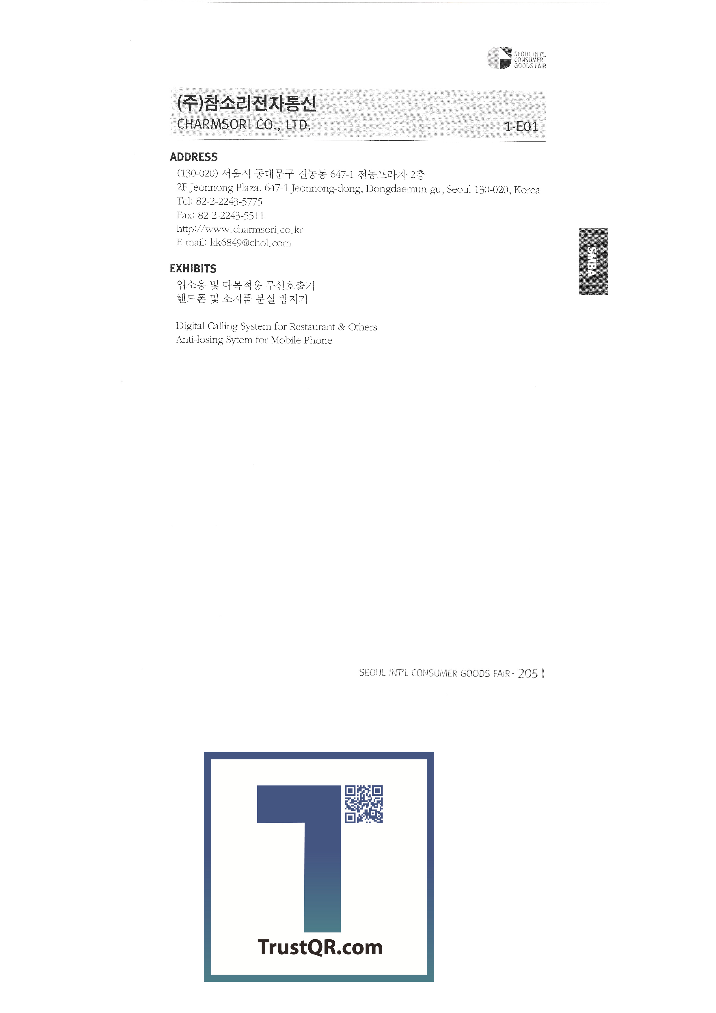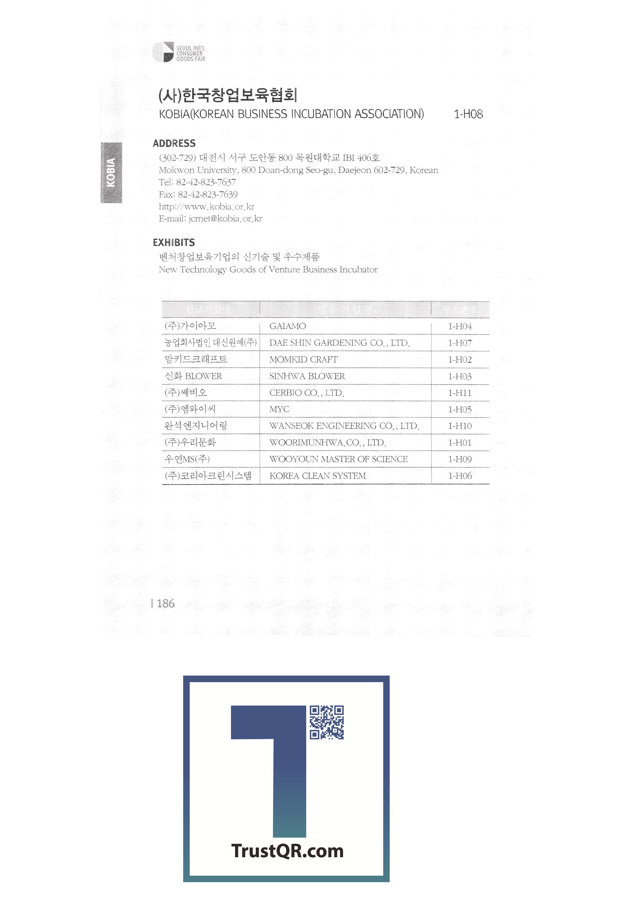 2005, International Consumer Goods Fair, Onebio Co., Ltd. James Vision KMG Co., Ltd. Tech Worm Geoseong Co., Ltd. Geumgye Food Doil Intech Digital sign Richmine Madangsoe Co., Ltd. Maekyung Bias Guide Samjung Clean Master Co., Ltd. Smit Industry A-Tech Co., Ltd. Euphoresis Co., Ltd. Zephyr Industry Co., Ltd. Powerlet Co., Ltd. Phil Aroma Hannaeum Co., Ltd. Hana Tools Co., Ltd. Korea Business Incubation Association Gaiamo Co., Ltd. Daishin Horticultural Corporation Mom Kid Craft Shinhwa BLOWER Sevio Co., Ltd. MWC Wanseok Engineering Woori Culture Wooyeon MS Korea Clean System Seoul Regional Small and Medium Business Administration Dowzone Farm Move Zone J Yushin Hat Yupyeong Technology Co., Ltd. Movens JC Tech Co., Ltd. Jinyang Medical Trade Charmsori Electronic Communication |